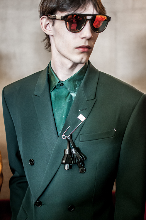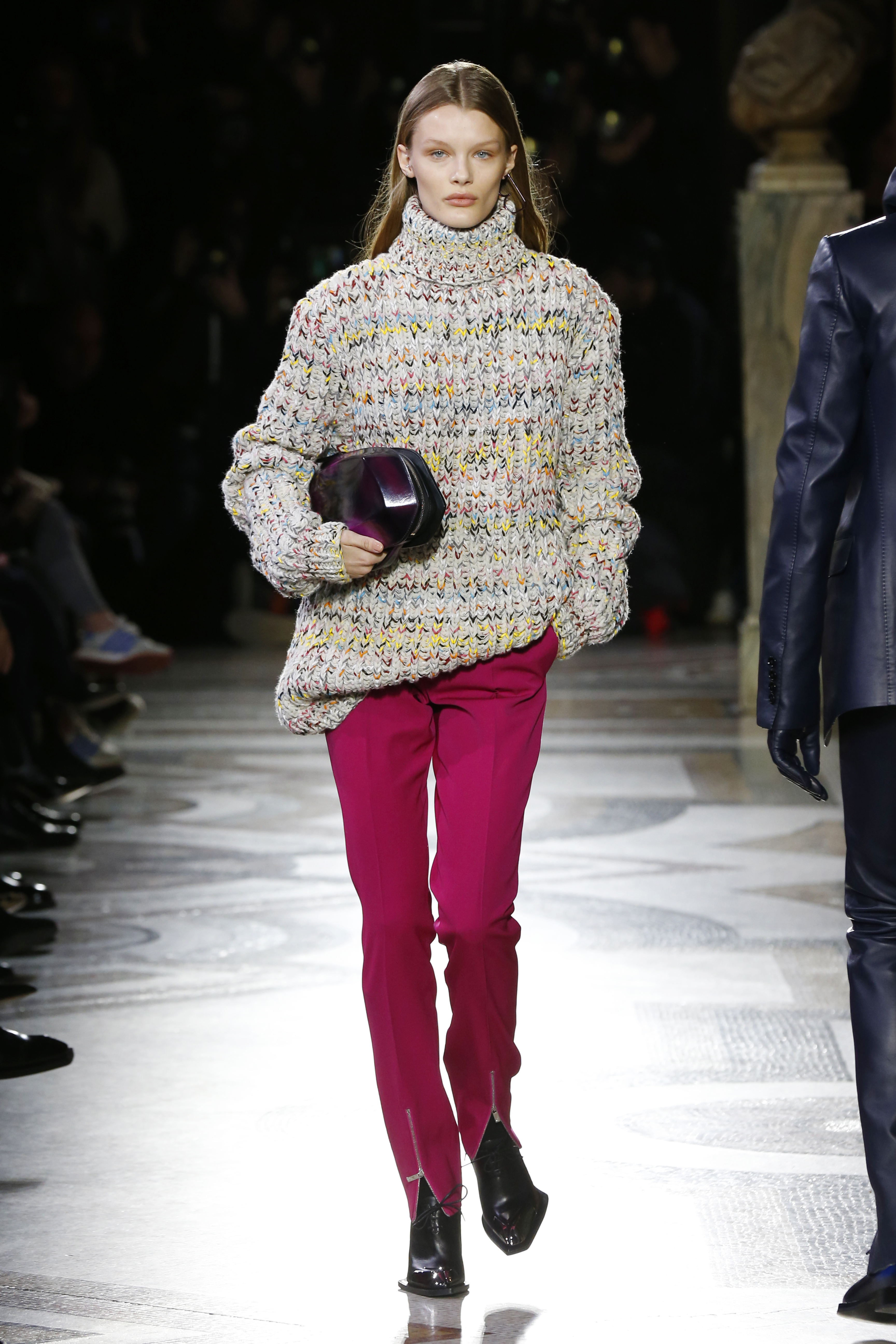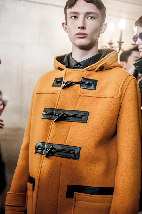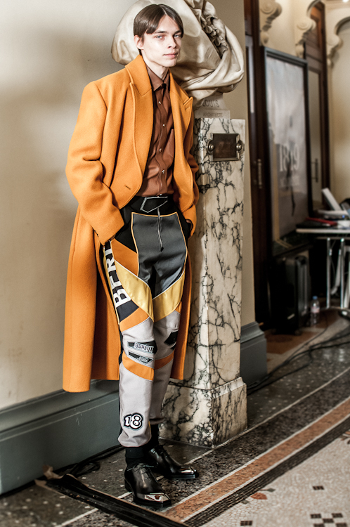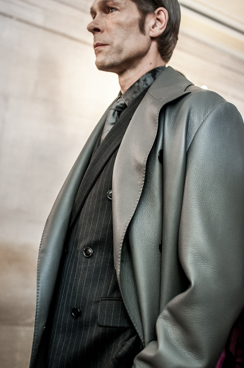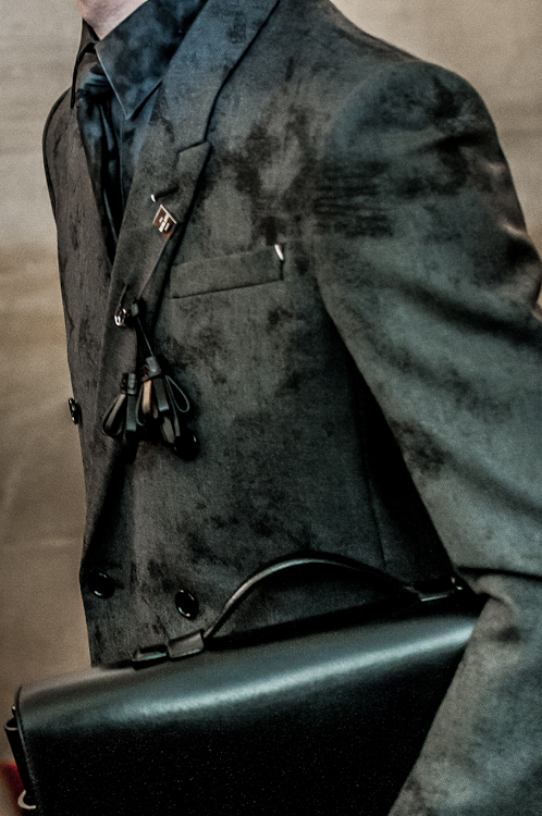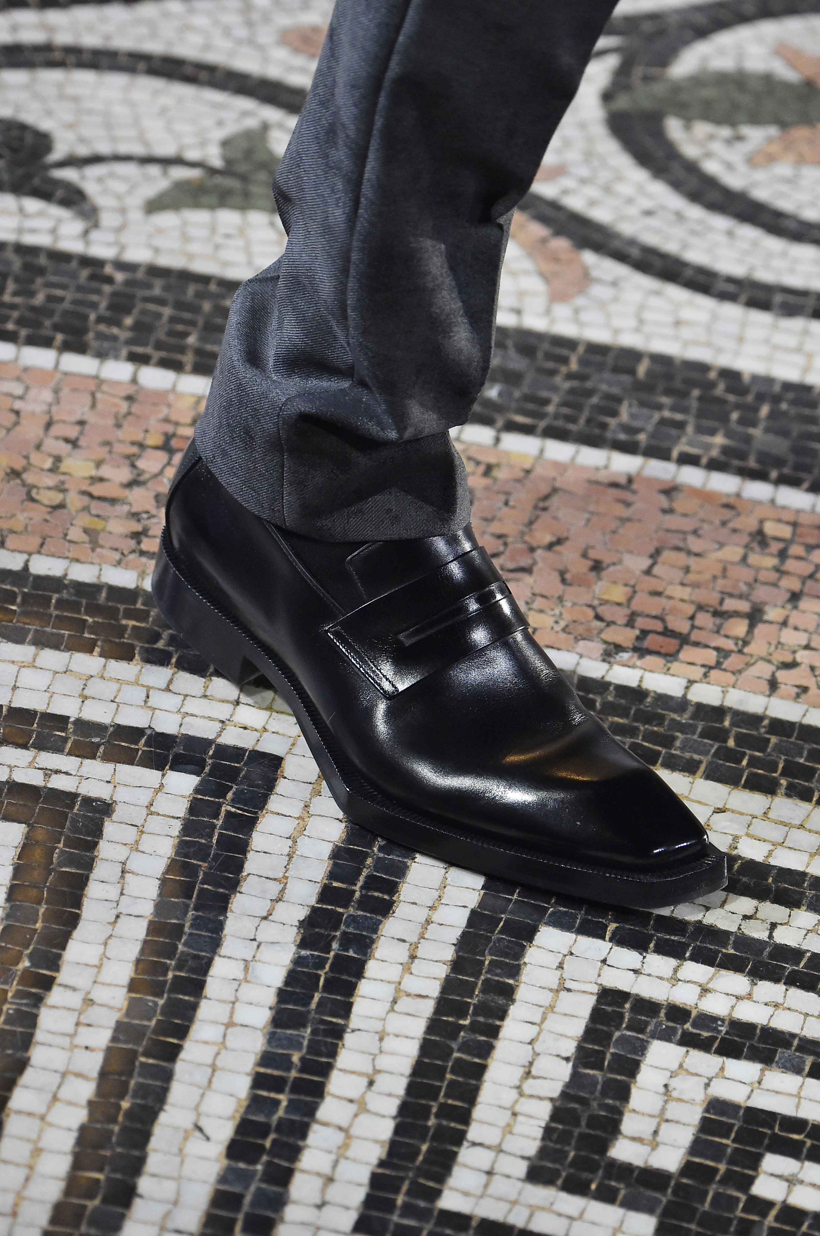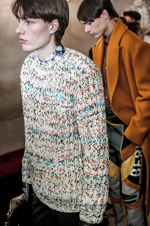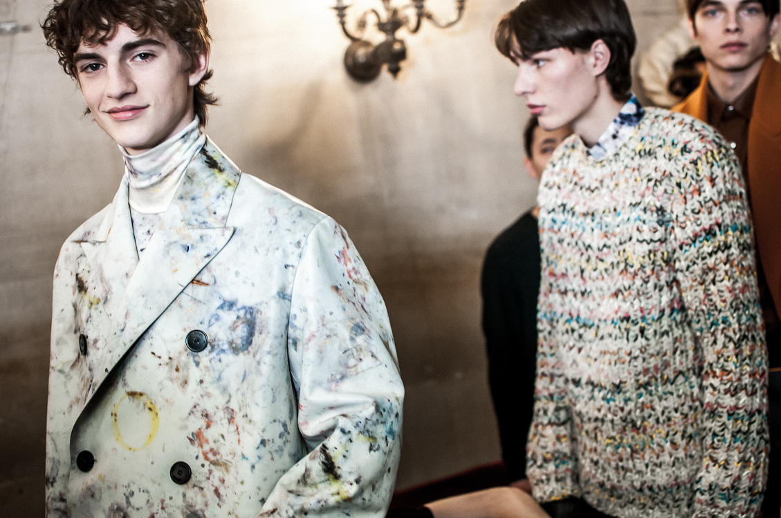 Interpreted in tailoring, the impression of patina is evoked in calfskin and jacquard suiting, expanding the artisanal core of Berluti into a broader identity. The silhouette is defined, the shoulder seater but never too controlled. It paves the way for an exuberant approach to dress where formal tailoring features side-by-side with trousers native to motocross. The idea of recalling patina, a grey shearling coat reminiscent of astrakhan, or a sweater knitted from a thousand metres of multi-coloured leather strings, which reads like yarn.