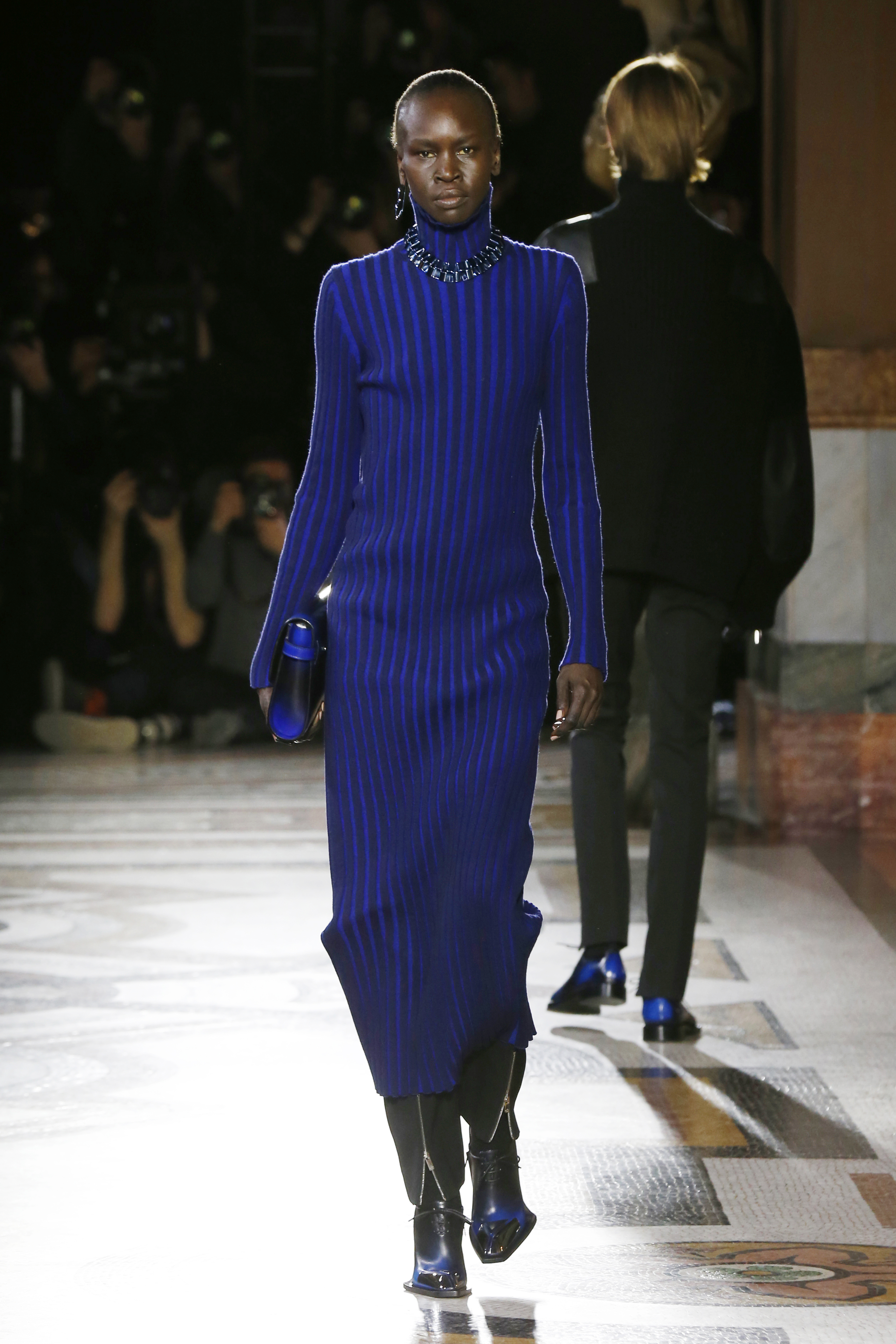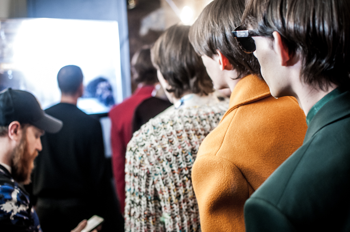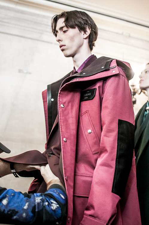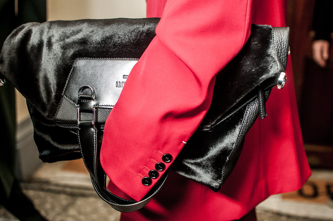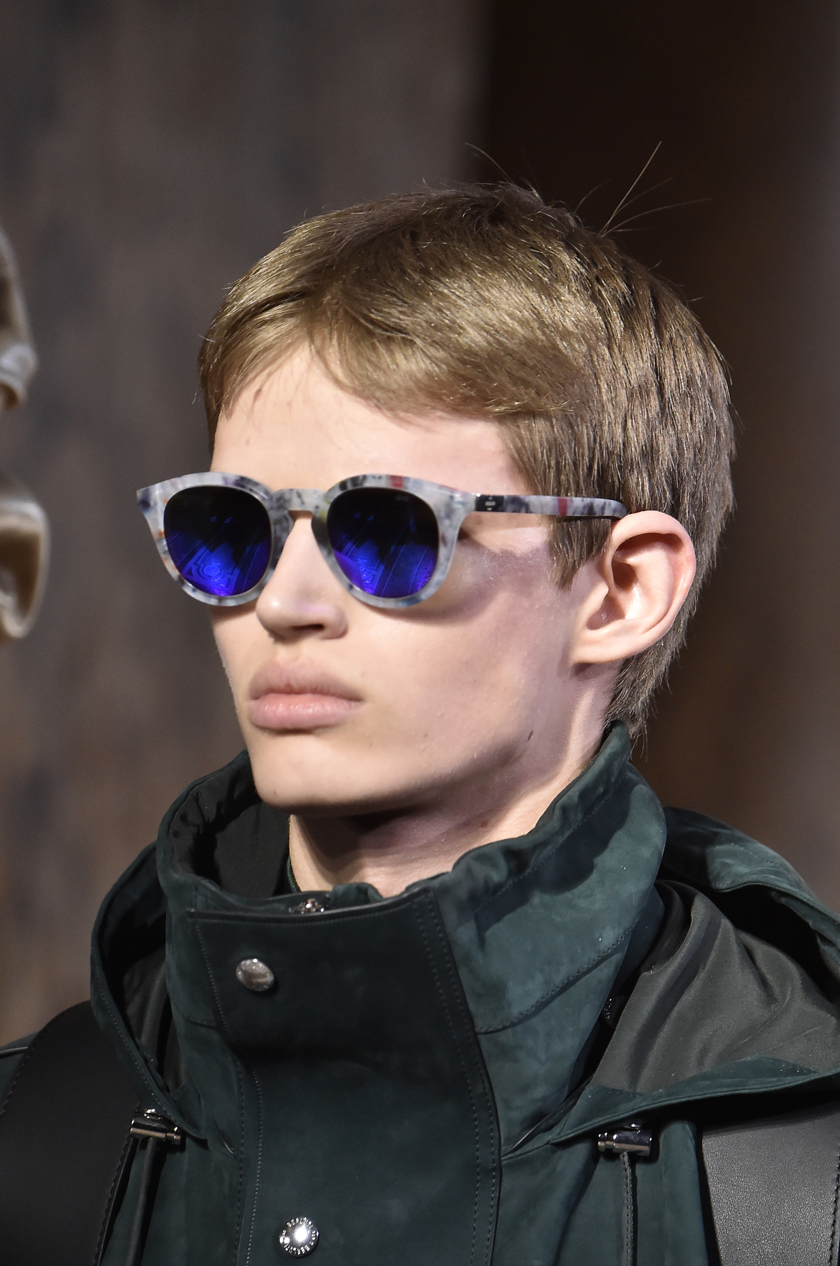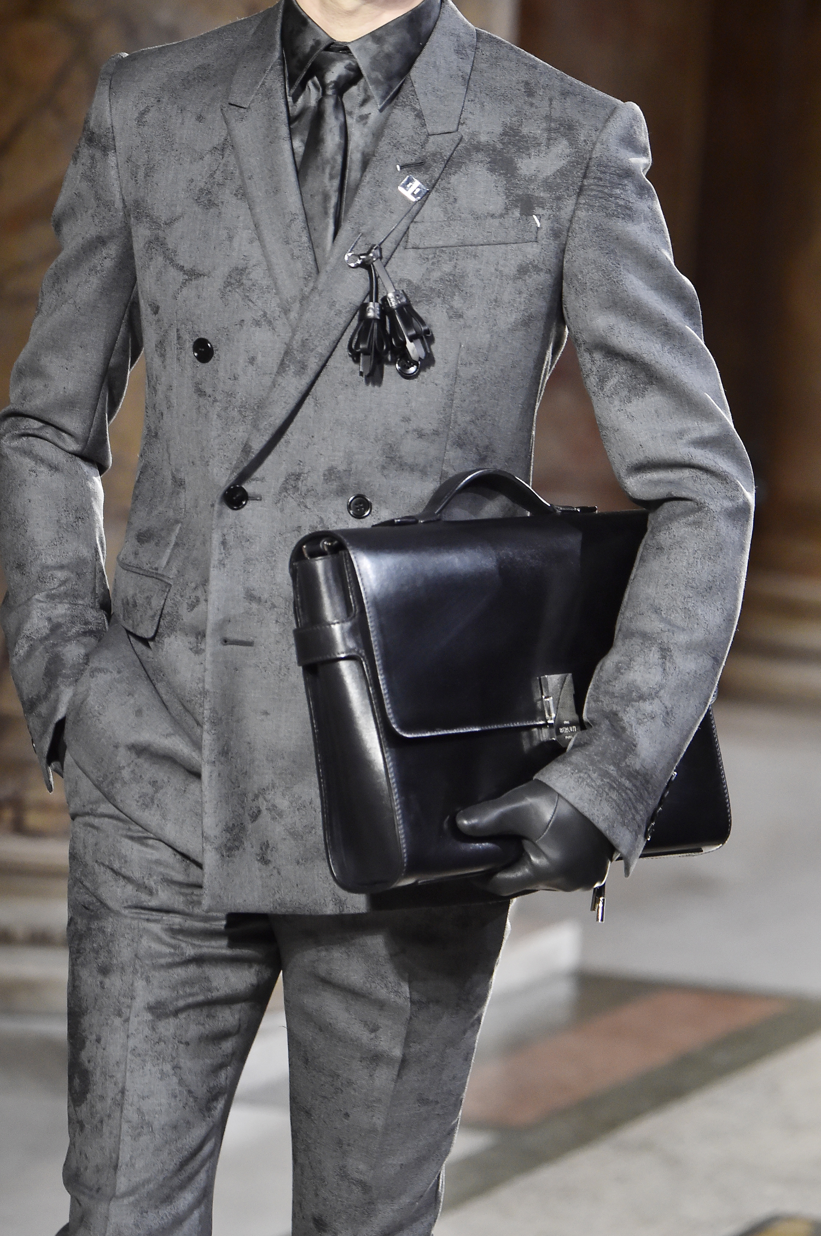 Interpreted in tailoring, the impression of patina is evoked in calfskin and jacquard suiting, expanding the artisanal core of Berluti into a broader identity. The silhouette is defined, the shoulder seater but never too controlled. It paves the way for an exuberant approach to dress where formal tailoring features side-by-side with trousers native to motocross. The idea of recalling patina, a grey shearling coat reminiscent of astrakhan, or a sweater knitted from a thousand metres of multi-coloured leather strings, which reads like yarn.