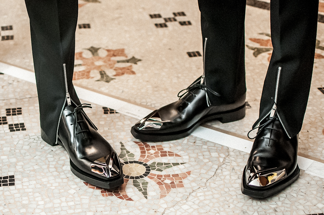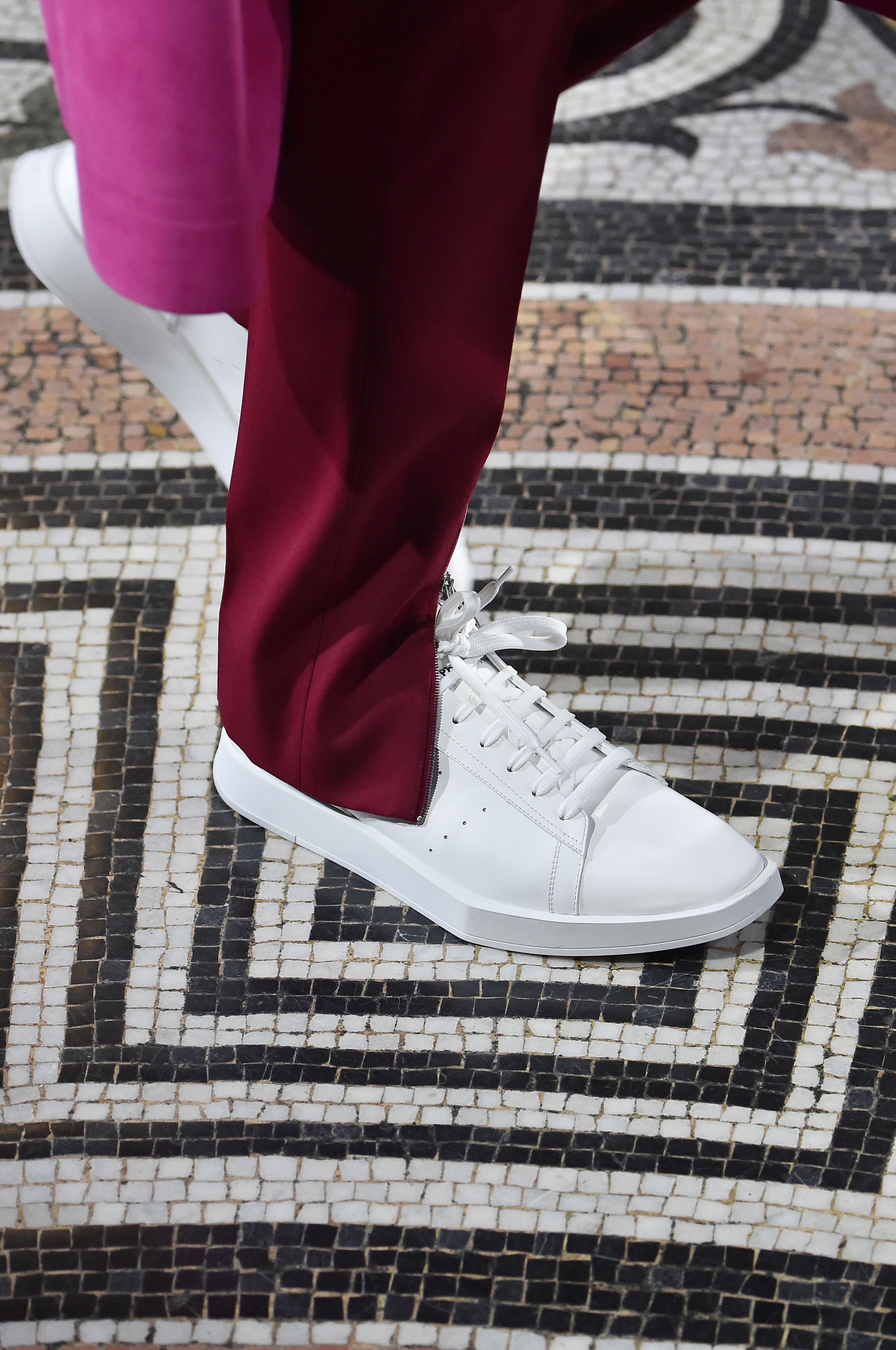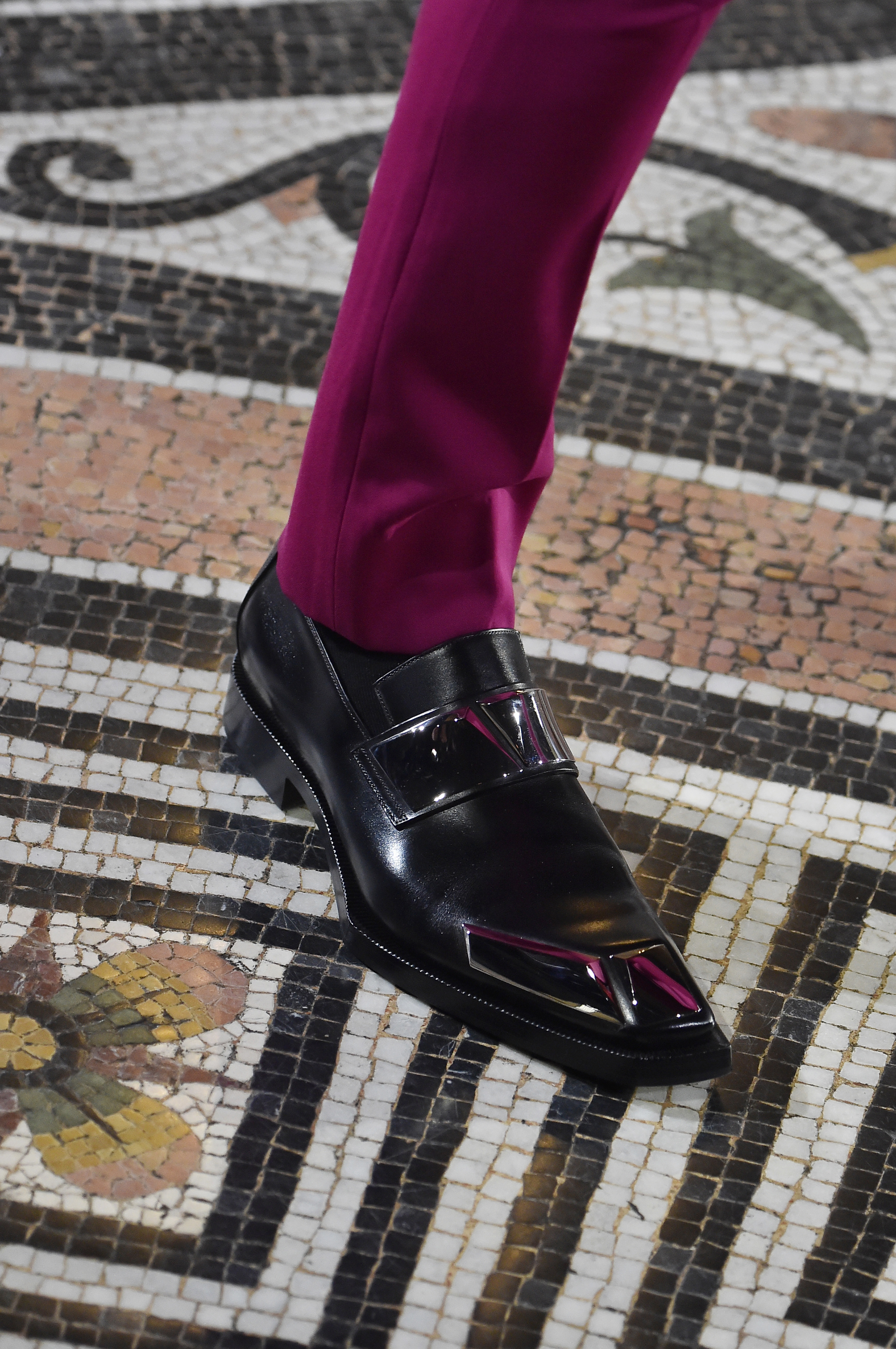 The maison’s emblematic patina shoes hand-crafted from one piece of leather – The Alessandro, after its founder, and the Andy, after Warhol – are reimagined with sculptural caps recalling the faces of diamonds. The construction amplifies the shine of synonymous with the maison, a facet accentuated in another new take on the Alessandro adorned with angular metal plates. The silhouette is transferred to a white trainer executed with the same artisanal principles. A nod to the Berluti’s heritage, shoehorn pendants and miniature shoetree key rings adorn the collection.