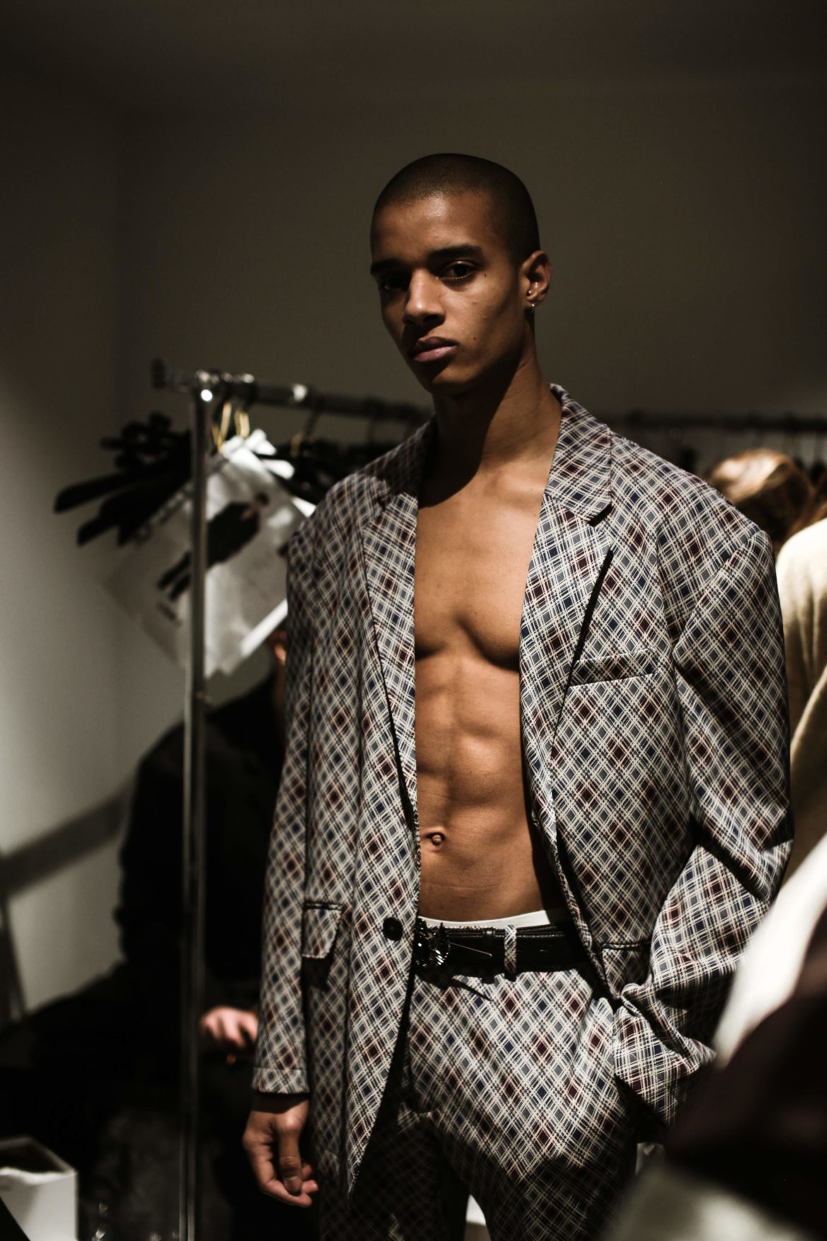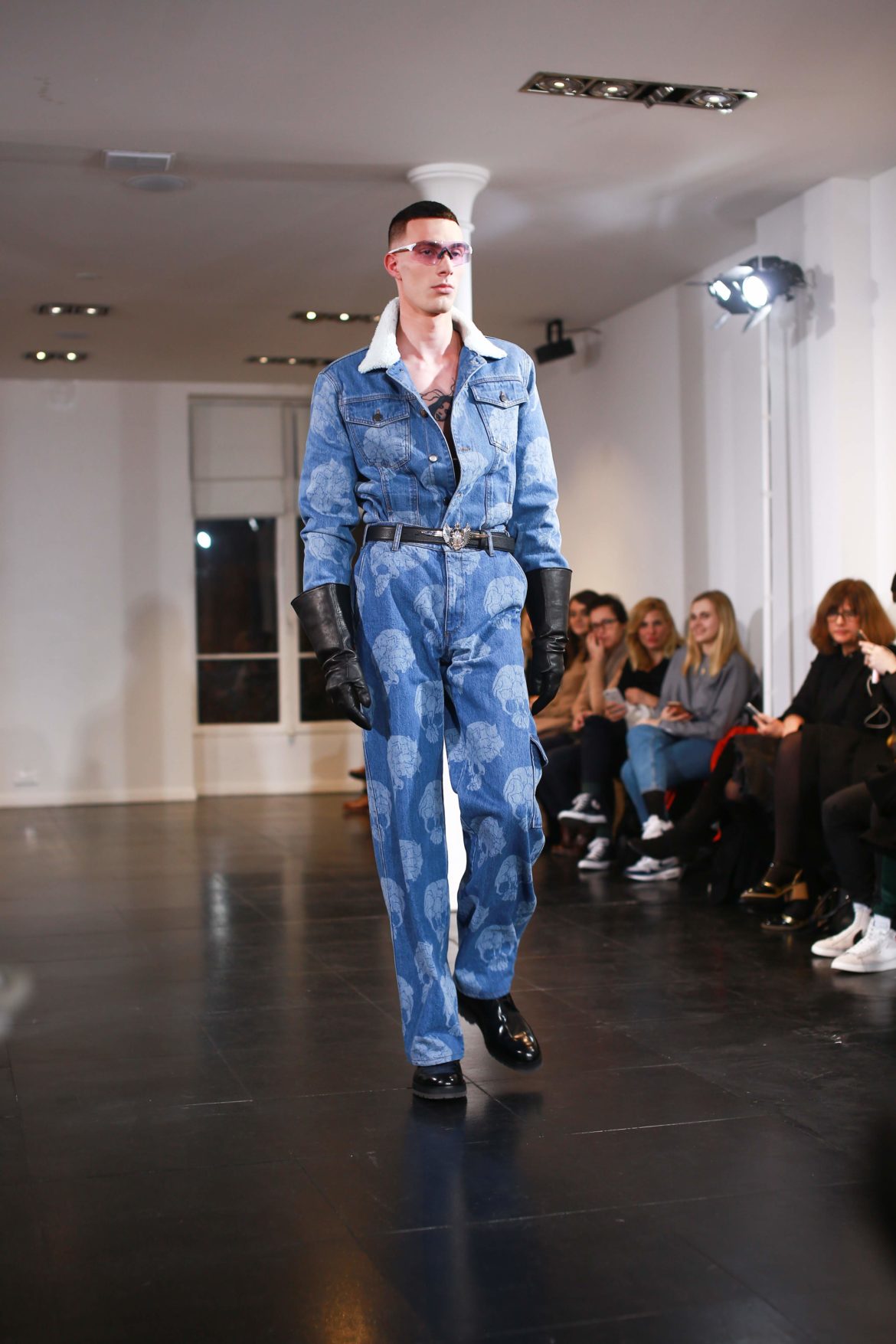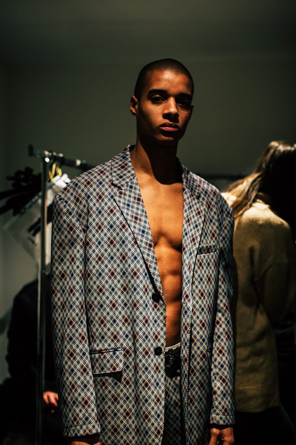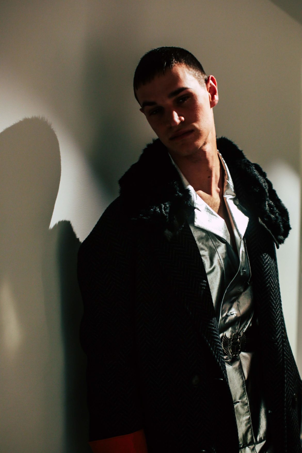 The collection finds itself dissecting the dialogue between classic suits and workwear. The stars dotted throughout the collection echo those which line ancient tombs as well as old car radiators, the modern sarcophagi of our daily vehicles. The prints (leopard, tartan and skull) combined with the precious metal talismans created as accessories, situate the collection between ostentatious opulence, grunge aesthetics and symbols of power.