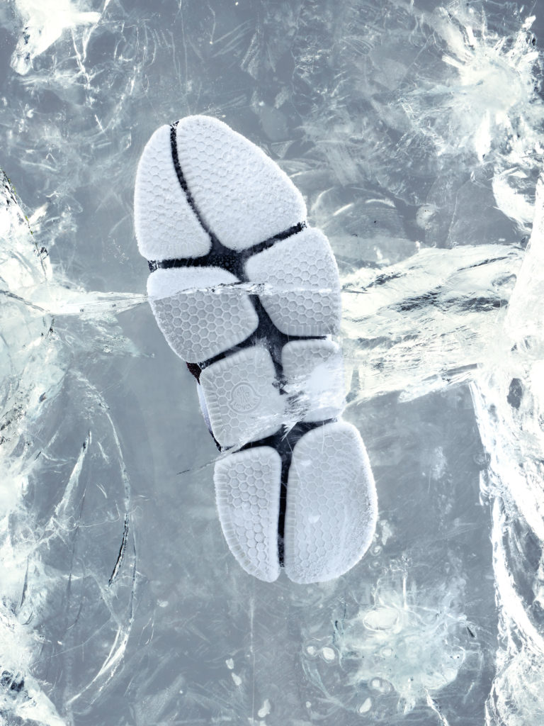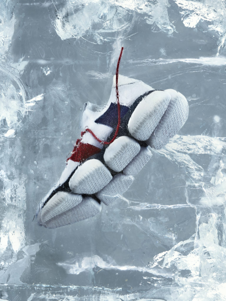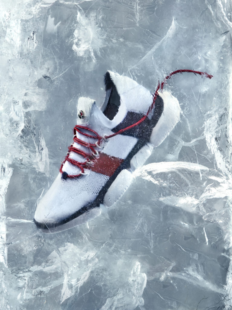 Empeigne formée d’une chaussette en tricot déclinée en trois versions: blanche avec les couleurs du drapeau italien, noire à semelle blanche et bleu marine à semelle turquoise.