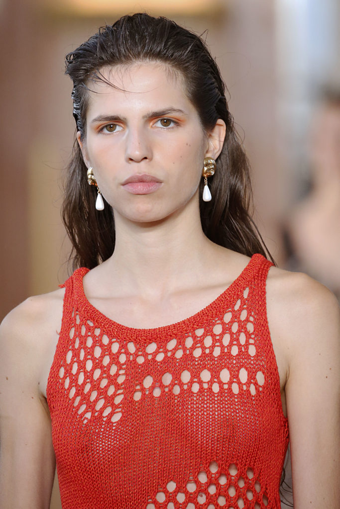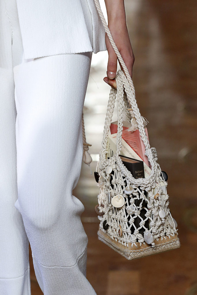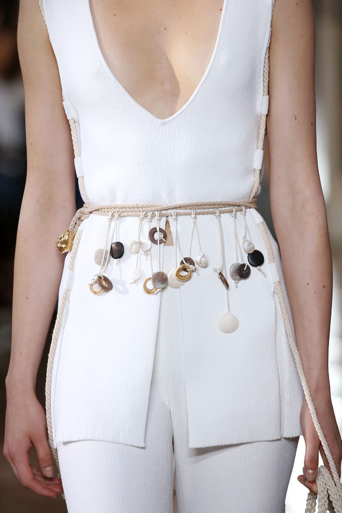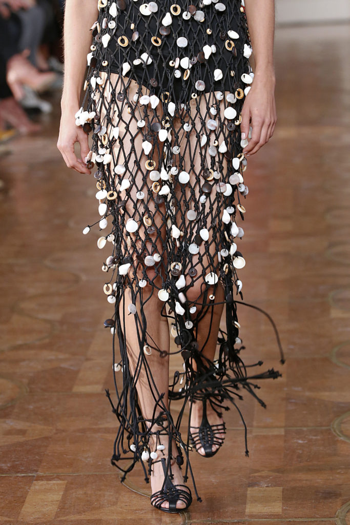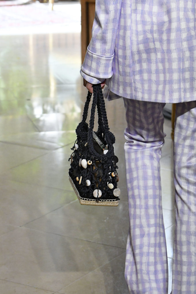 The trio of opening looks sets the tone for a collection imbued with the spirit of summer. Boxy jackets are twisted and distorted by drawstrings, and worn off-the-shoulder as if mid-shrug; shirts are cut to appear warped and shrunken as if nonchalantly left on the sand on a hot July day; dresses and jackets are sliced open at the solar plexus, peeling away layers of fabric, exposing one’s vulnerabilities; suede and leather patches are roughly pieced together, seams laid bare; silk dresses are cut raw, edges frayed, linings left undone; shells are knotted on macramé net bag and shoes, mimicking a fisherman’s net pulled from the sea.