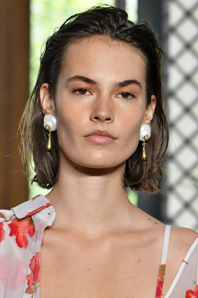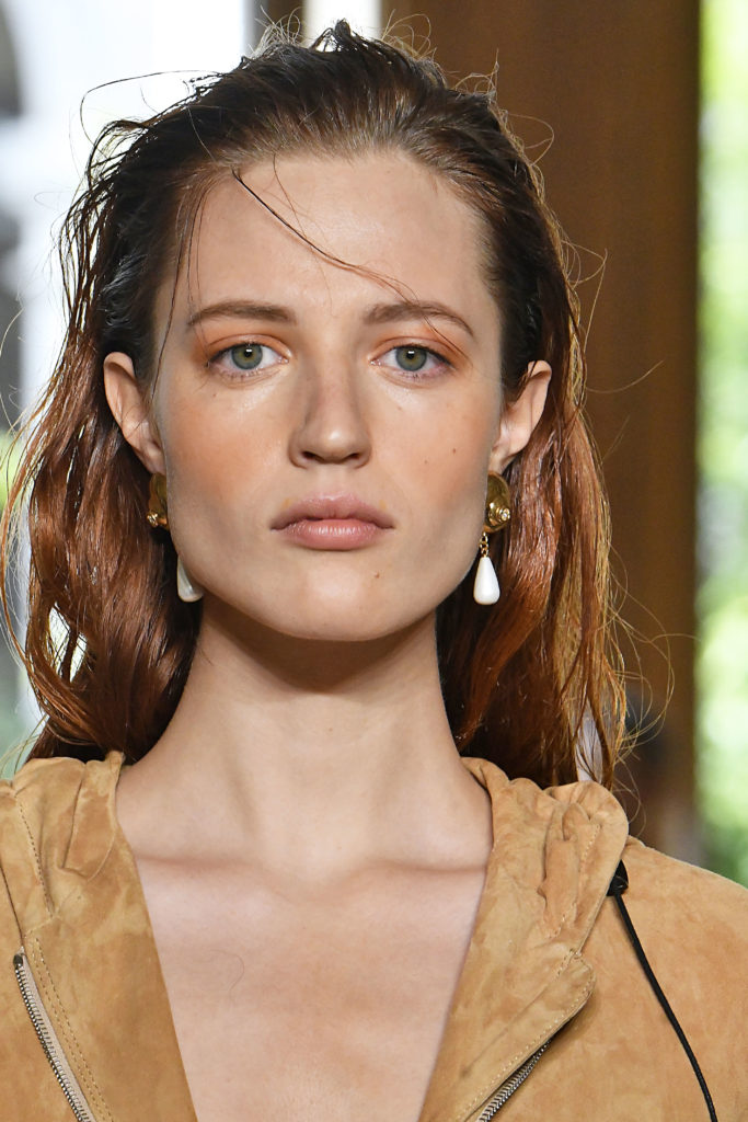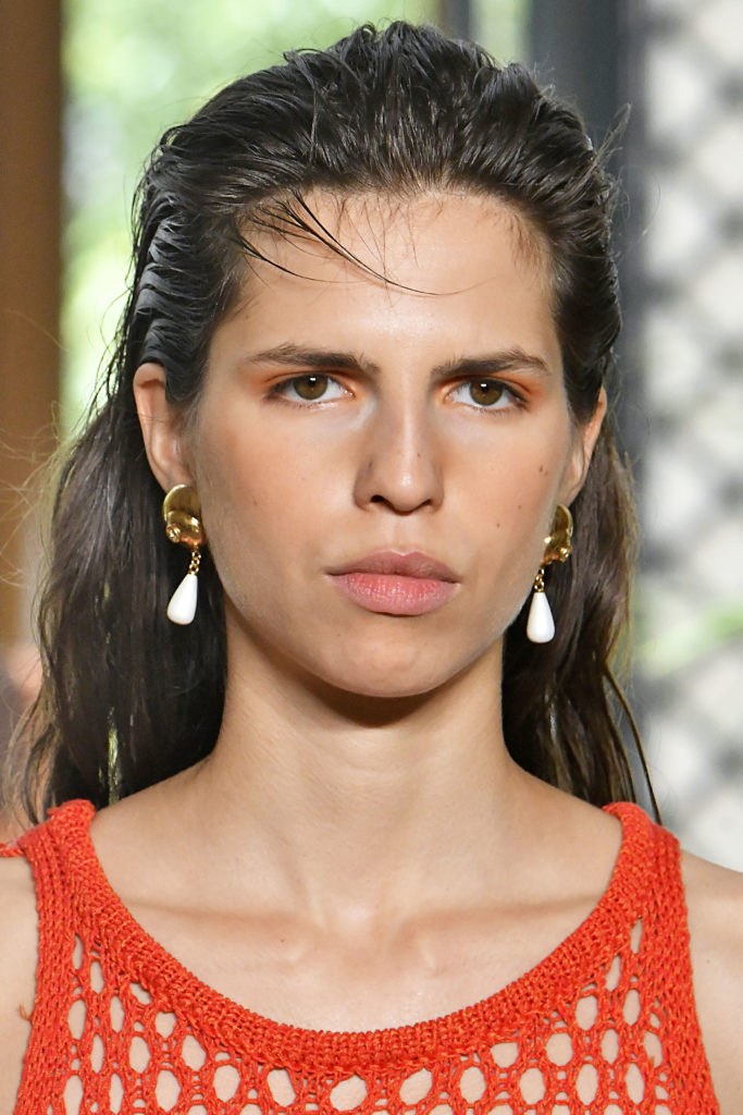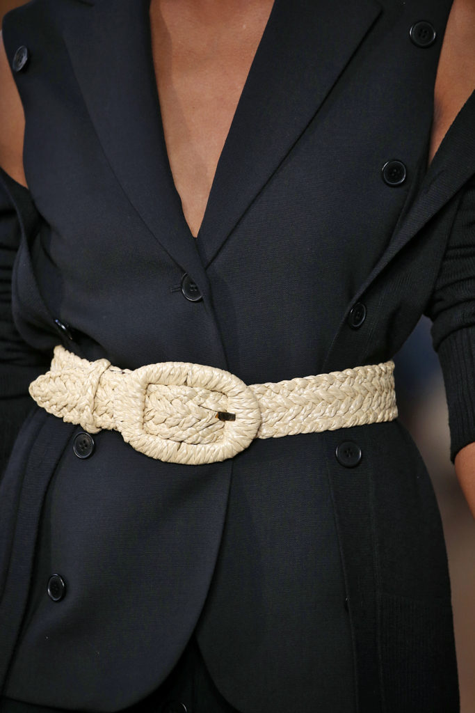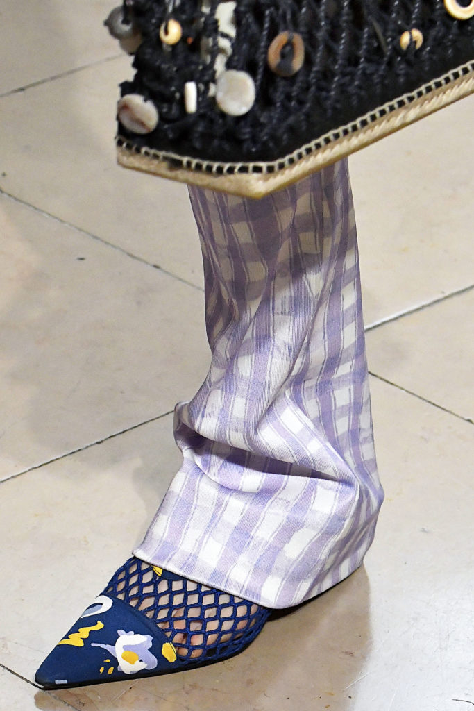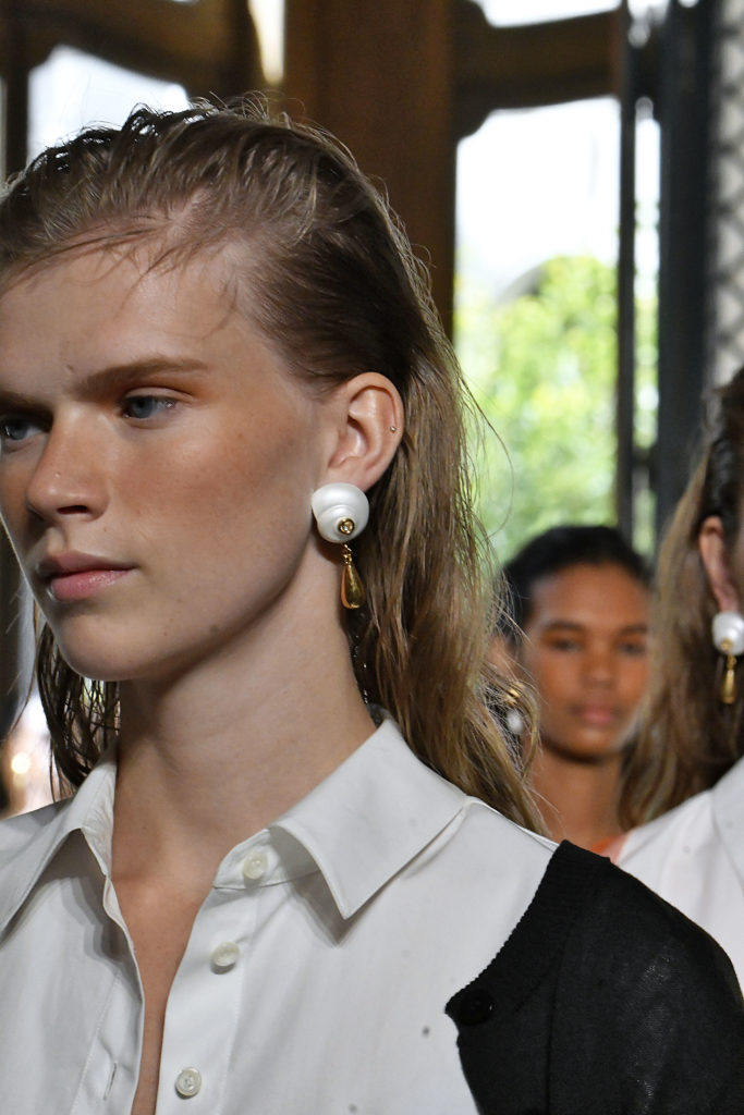 The trio of opening looks sets the tone for a collection imbued with the spirit of summer. Boxy jackets are twisted and distorted by drawstrings, and worn off-the-shoulder as if mid-shrug; shirts are cut to appear warped and shrunken as if nonchalantly left on the sand on a hot July day; dresses and jackets are sliced open at the solar plexus, peeling away layers of fabric, exposing one’s vulnerabilities; suede and leather patches are roughly pieced together, seams laid bare; silk dresses are cut raw, edges frayed, linings left undone; shells are knotted on macramé net bag and shoes, mimicking a fisherman’s net pulled from the sea.