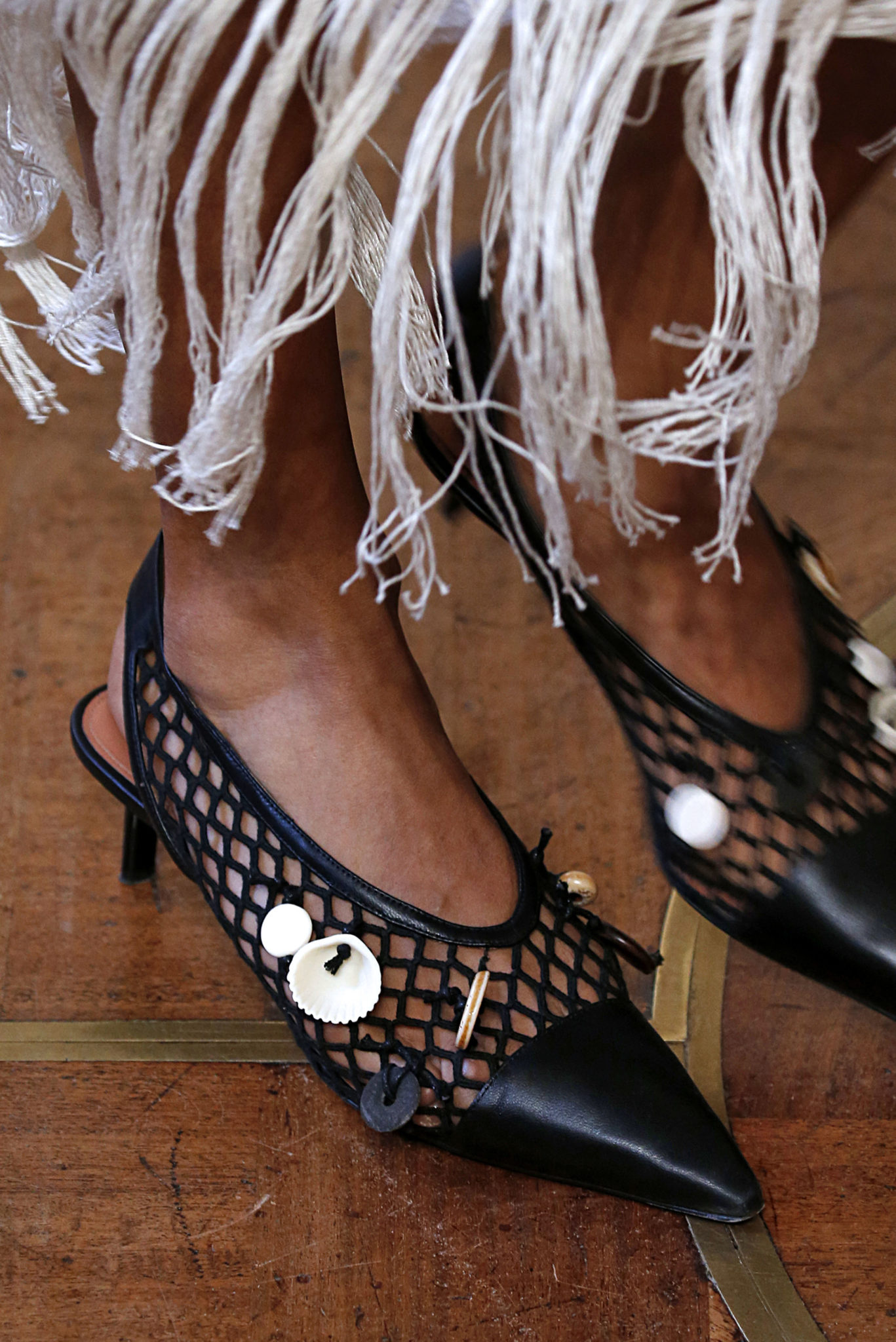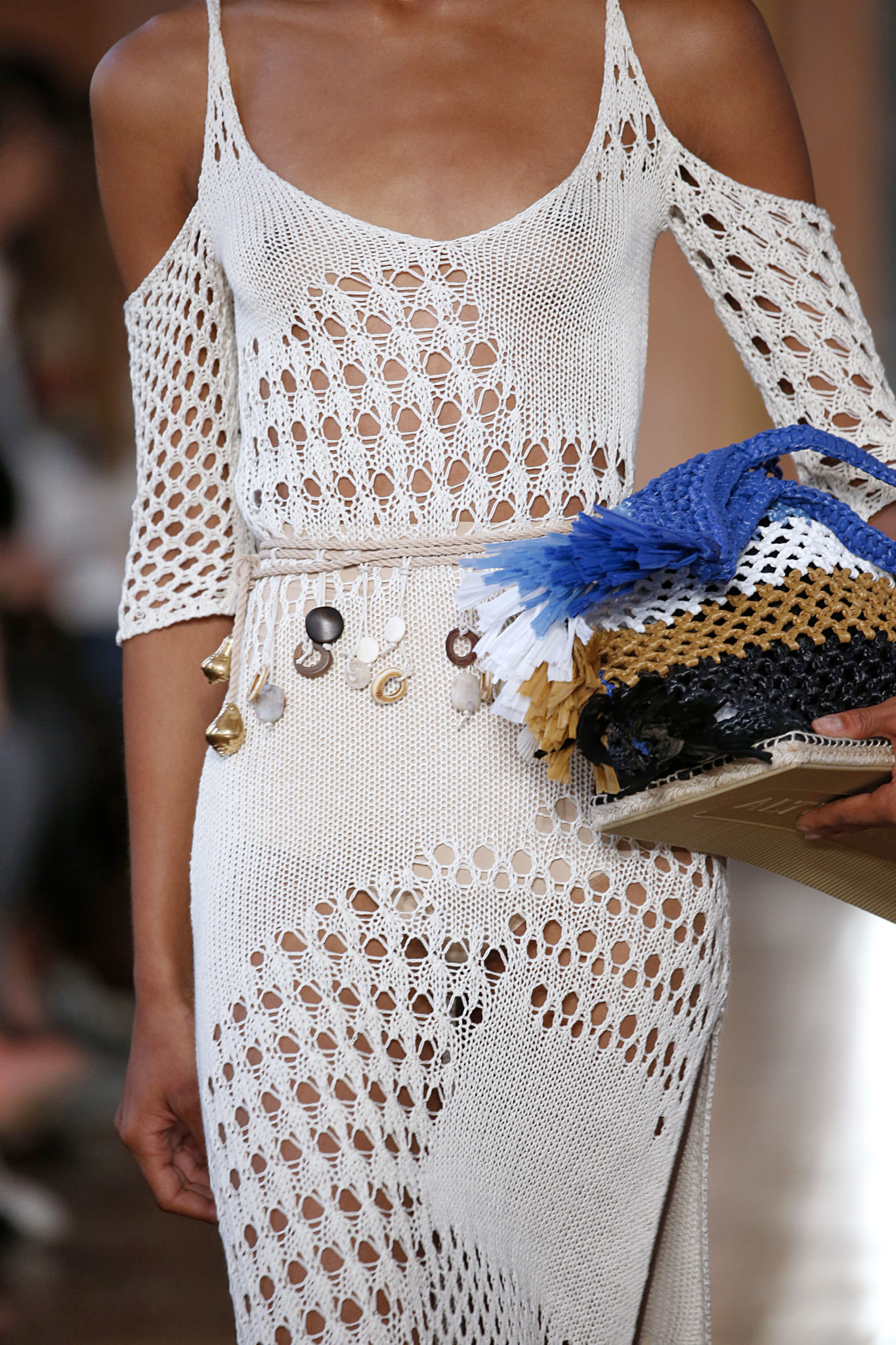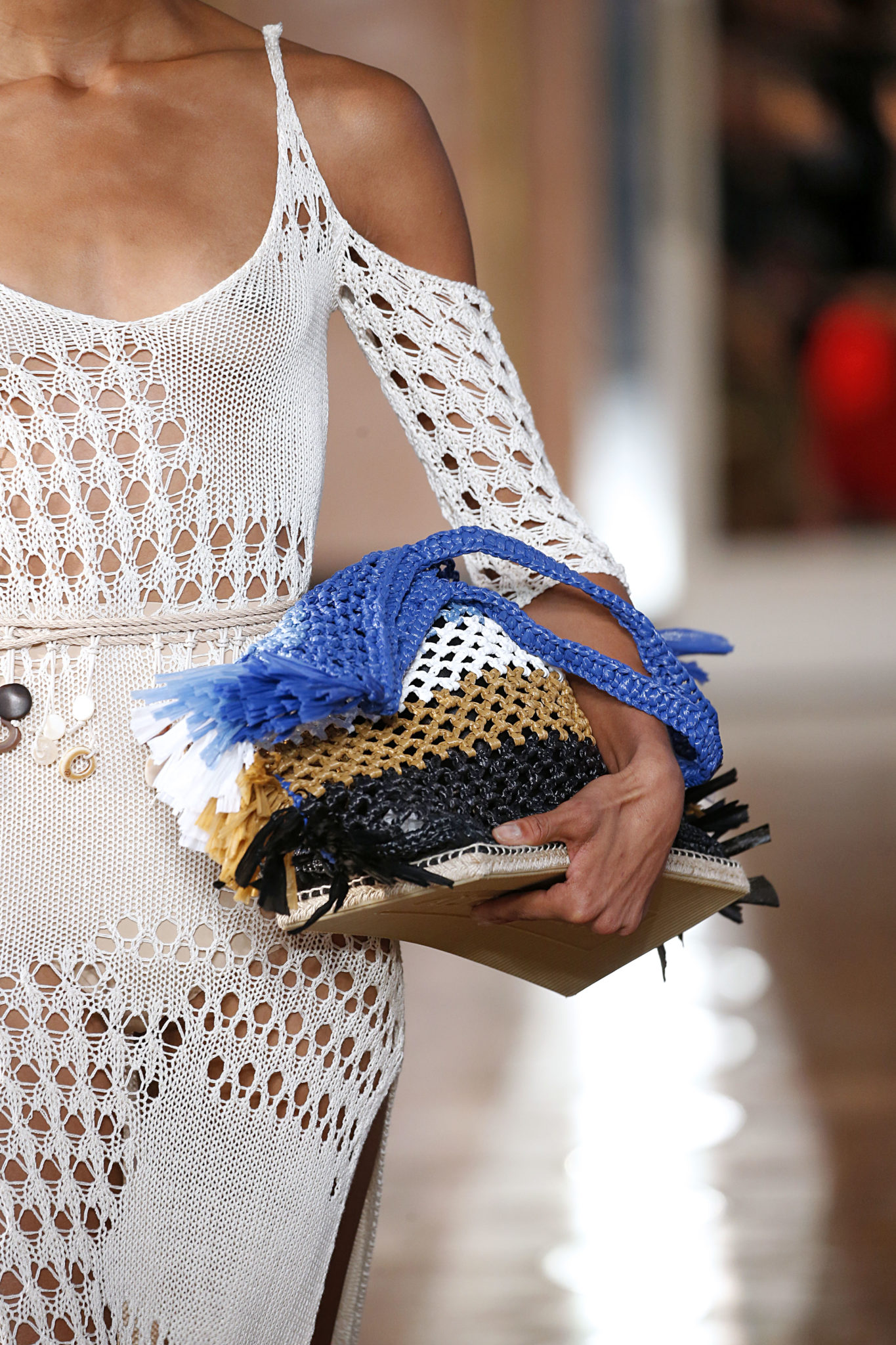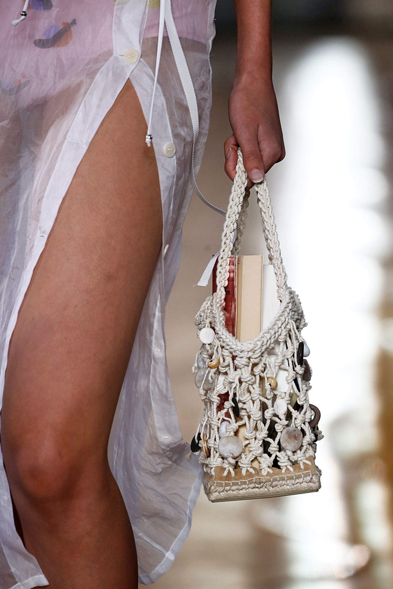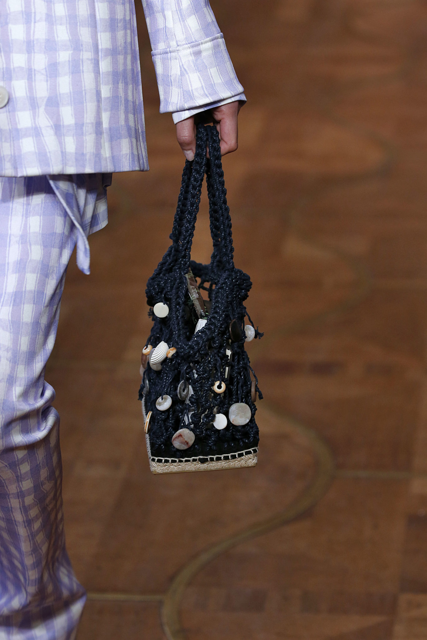 The trio of opening looks sets the tone for a collection imbued with the spirit of summer. Boxy jackets are twisted and distorted by drawstrings, and worn off-the-shoulder as if mid-shrug; shirts are cut to appear warped and shrunken as if nonchalantly left on the sand on a hot July day; dresses and jackets are sliced open at the solar plexus, peeling away layers of fabric, exposing one’s vulnerabilities; suede and leather patches are roughly pieced together, seams laid bare; silk dresses are cut raw, edges frayed, linings left undone; shells are knotted on macramé net bag and shoes, mimicking a fisherman’s net pulled from the sea.
