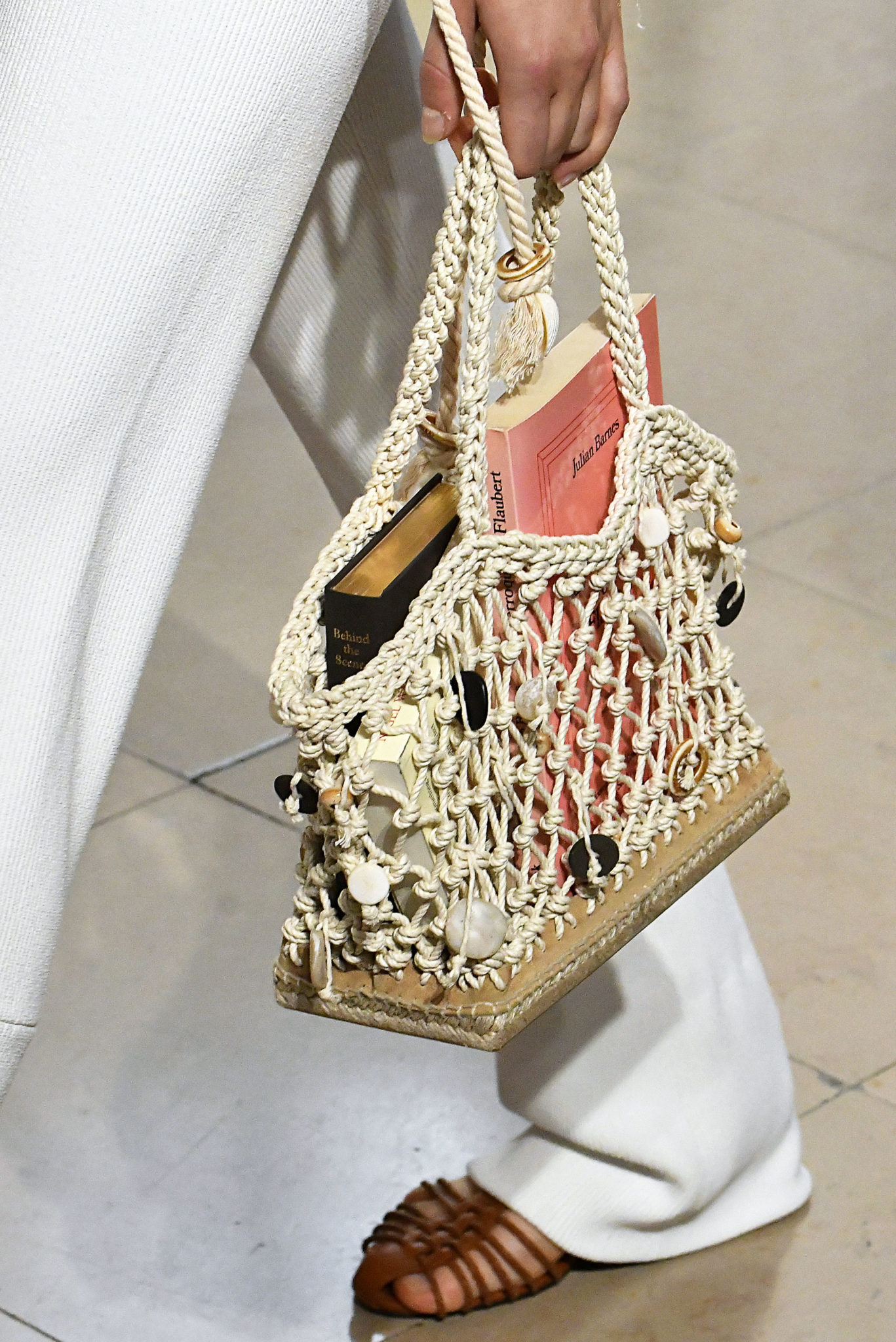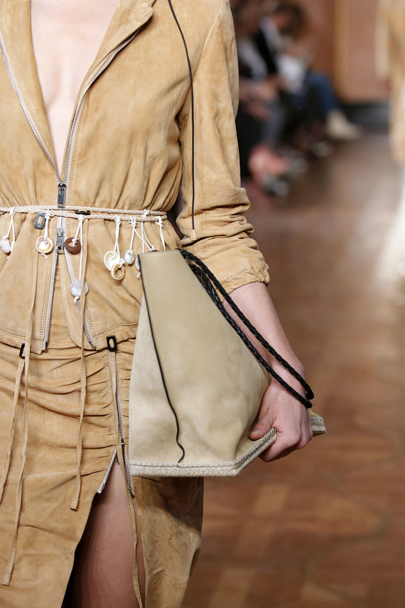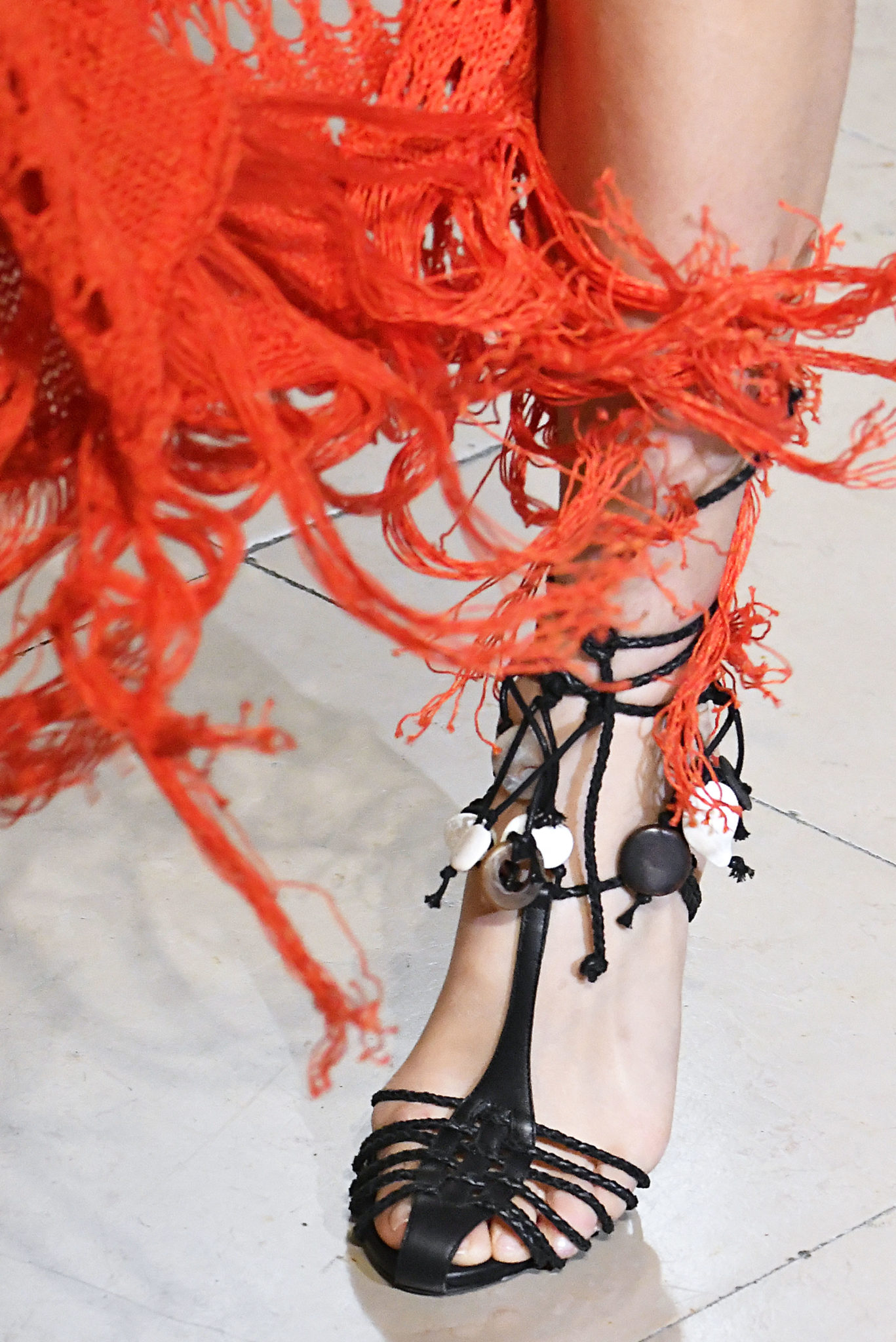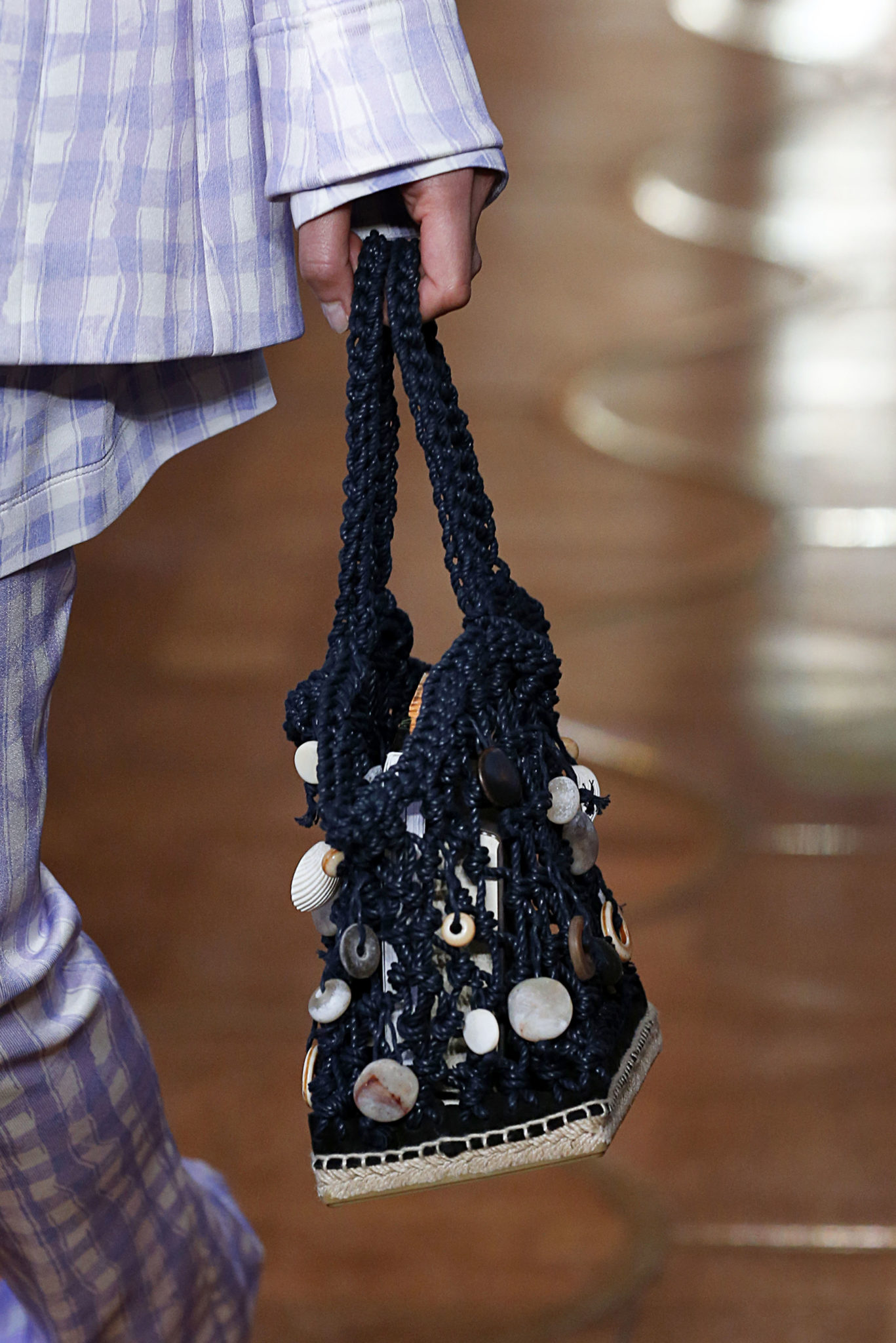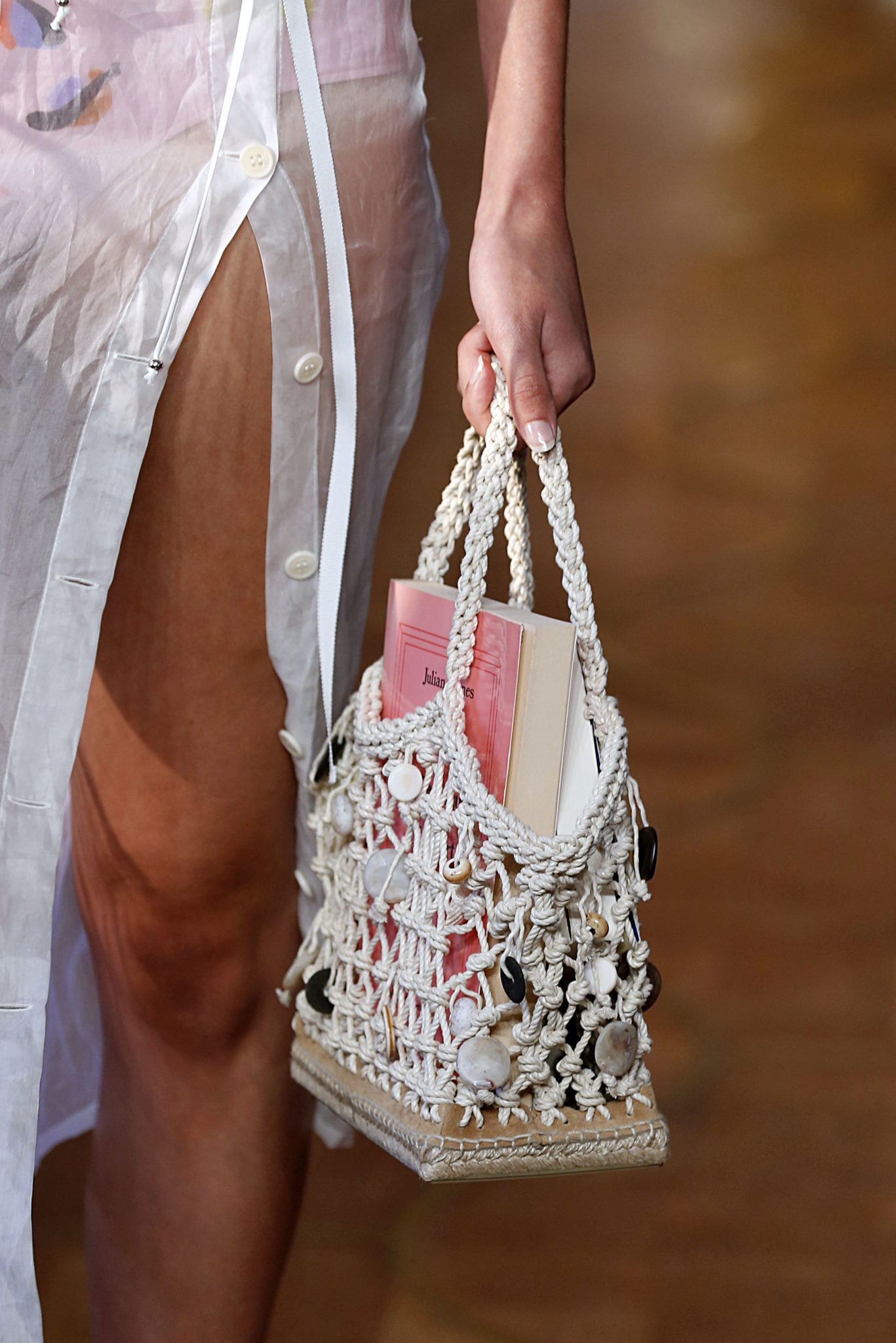 The trio of opening looks sets the tone for a collection imbued with the spirit of summer. Boxy jackets are twisted and distorted by drawstrings, and worn off-the-shoulder as if mid-shrug; shirts are cut to appear warped and shrunken as if nonchalantly left on the sand on a hot July day; dresses and jackets are sliced open at the solar plexus, peeling away layers of fabric, exposing one’s vulnerabilities; suede and leather patches are roughly pieced together, seams laid bare; silk dresses are cut raw, edges frayed, linings left undone; shells are knotted on macramé net bag and shoes, mimicking a fisherman’s net pulled from the sea.