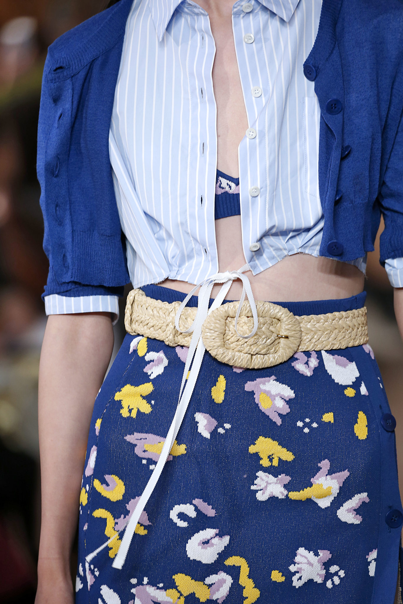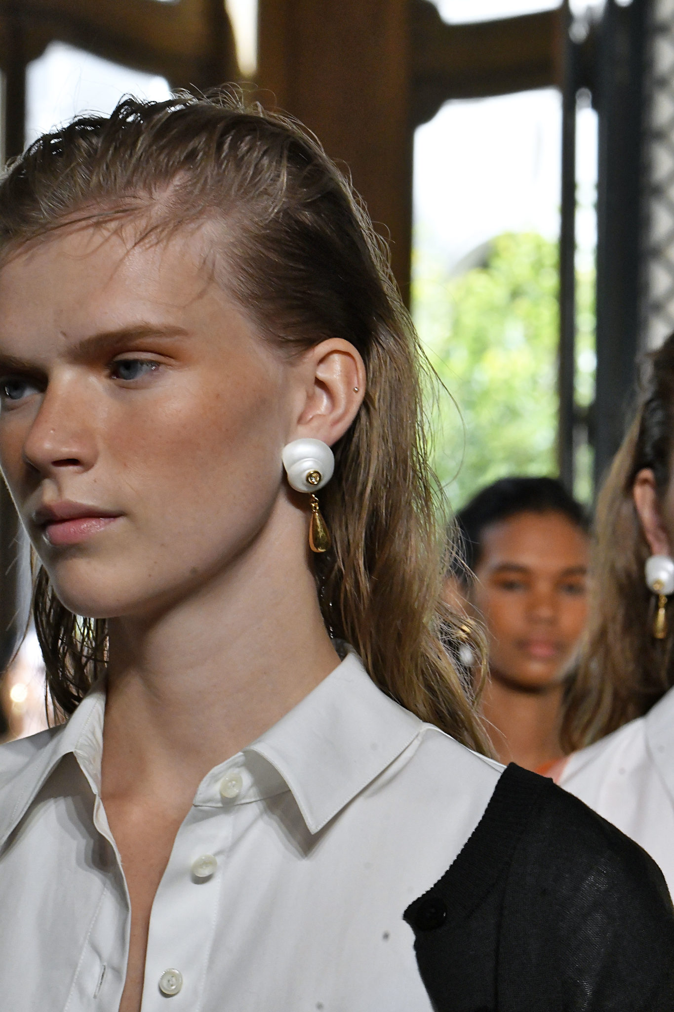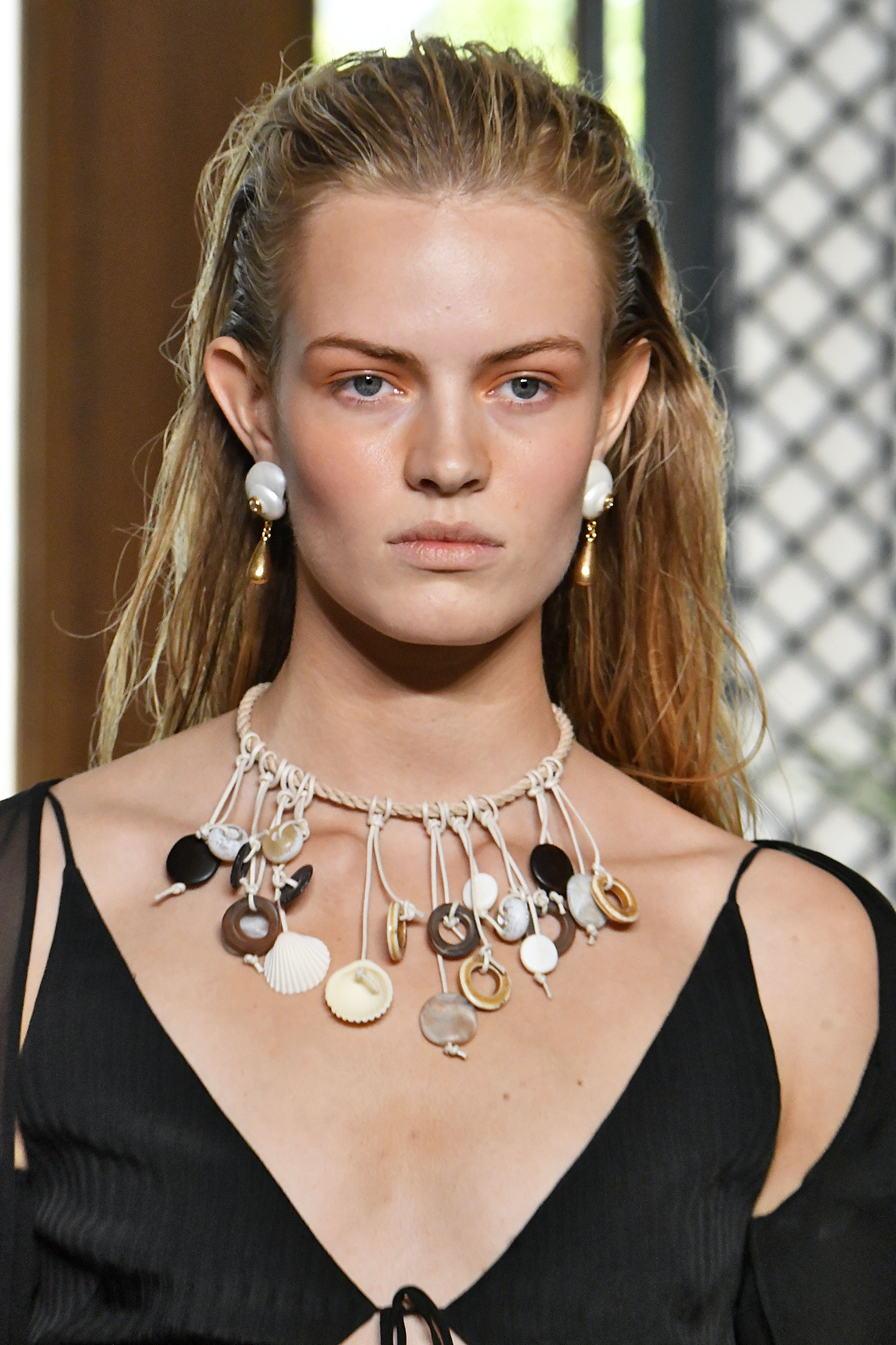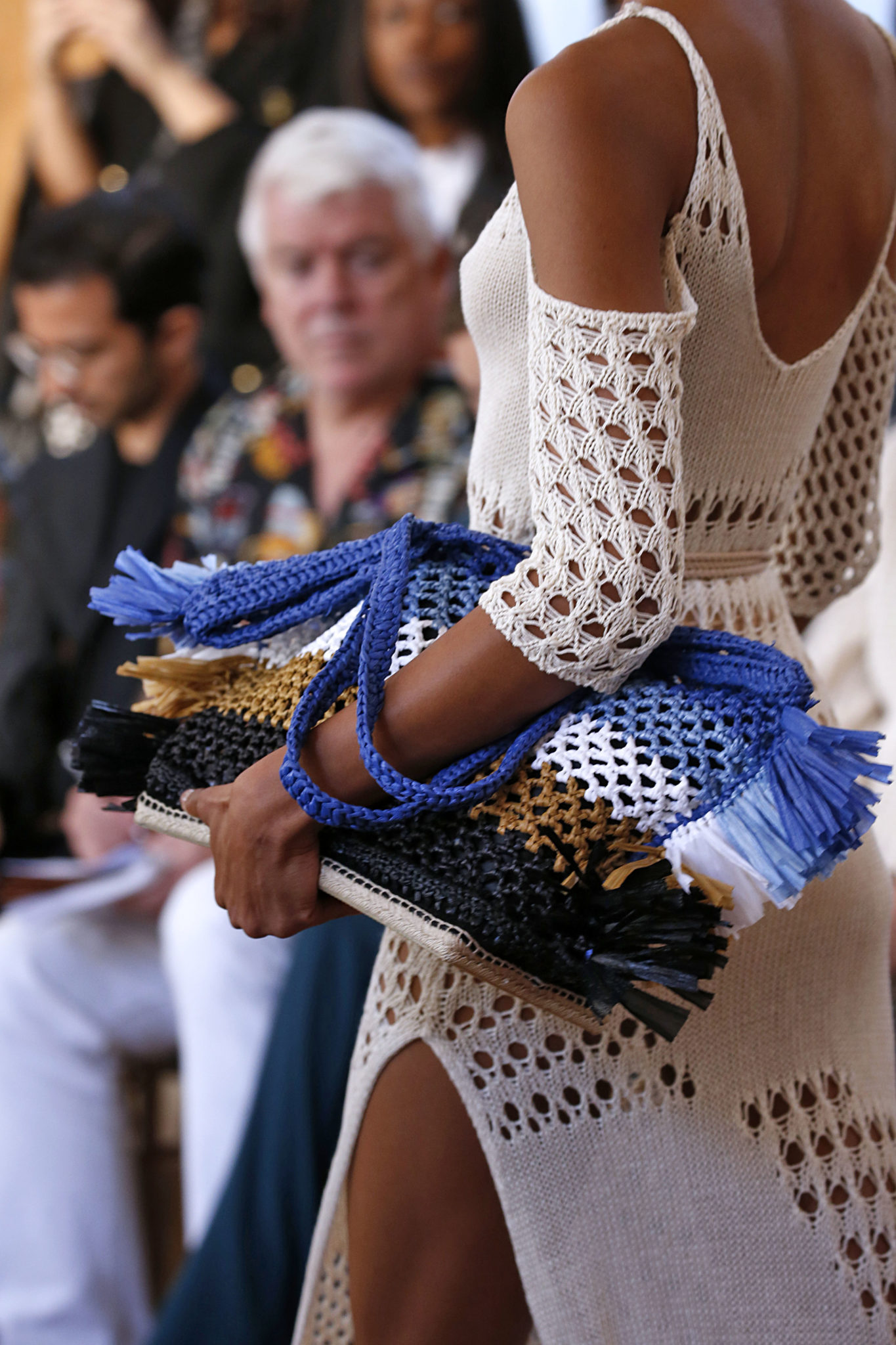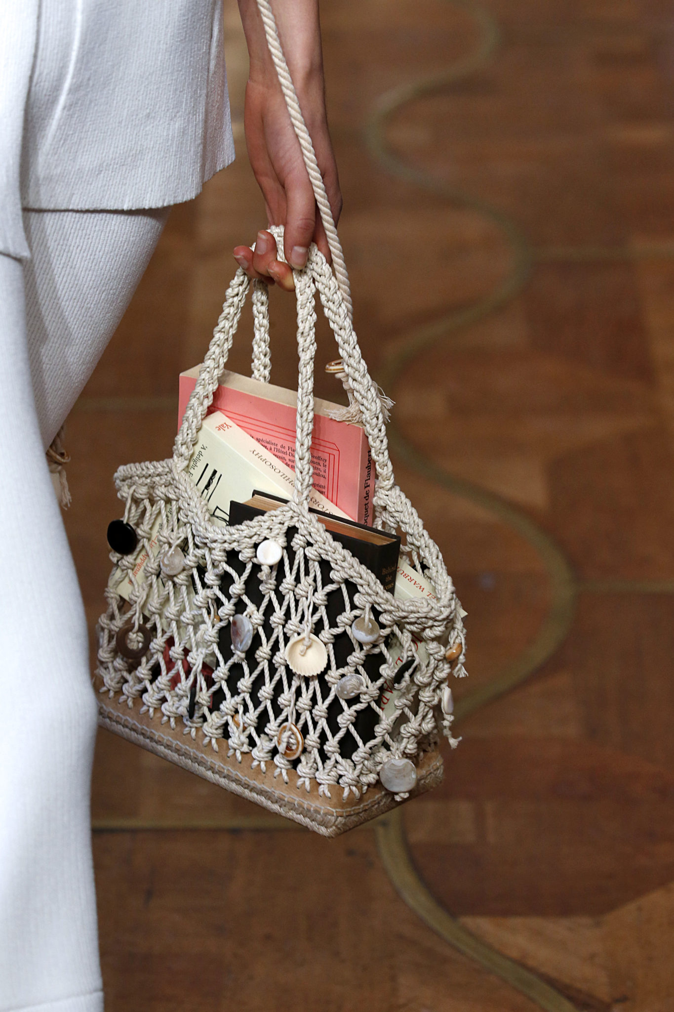 The trio of opening looks sets the tone for a collection imbued with the spirit of summer. Boxy jackets are twisted and distorted by drawstrings, and worn off-the-shoulder as if mid-shrug; shirts are cut to appear warped and shrunken as if nonchalantly left on the sand on a hot July day; dresses and jackets are sliced open at the solar plexus, peeling away layers of fabric, exposing one’s vulnerabilities; suede and leather patches are roughly pieced together, seams laid bare; silk dresses are cut raw, edges frayed, linings left undone; shells are knotted on macramé net bag and shoes, mimicking a fisherman’s net pulled from the sea.