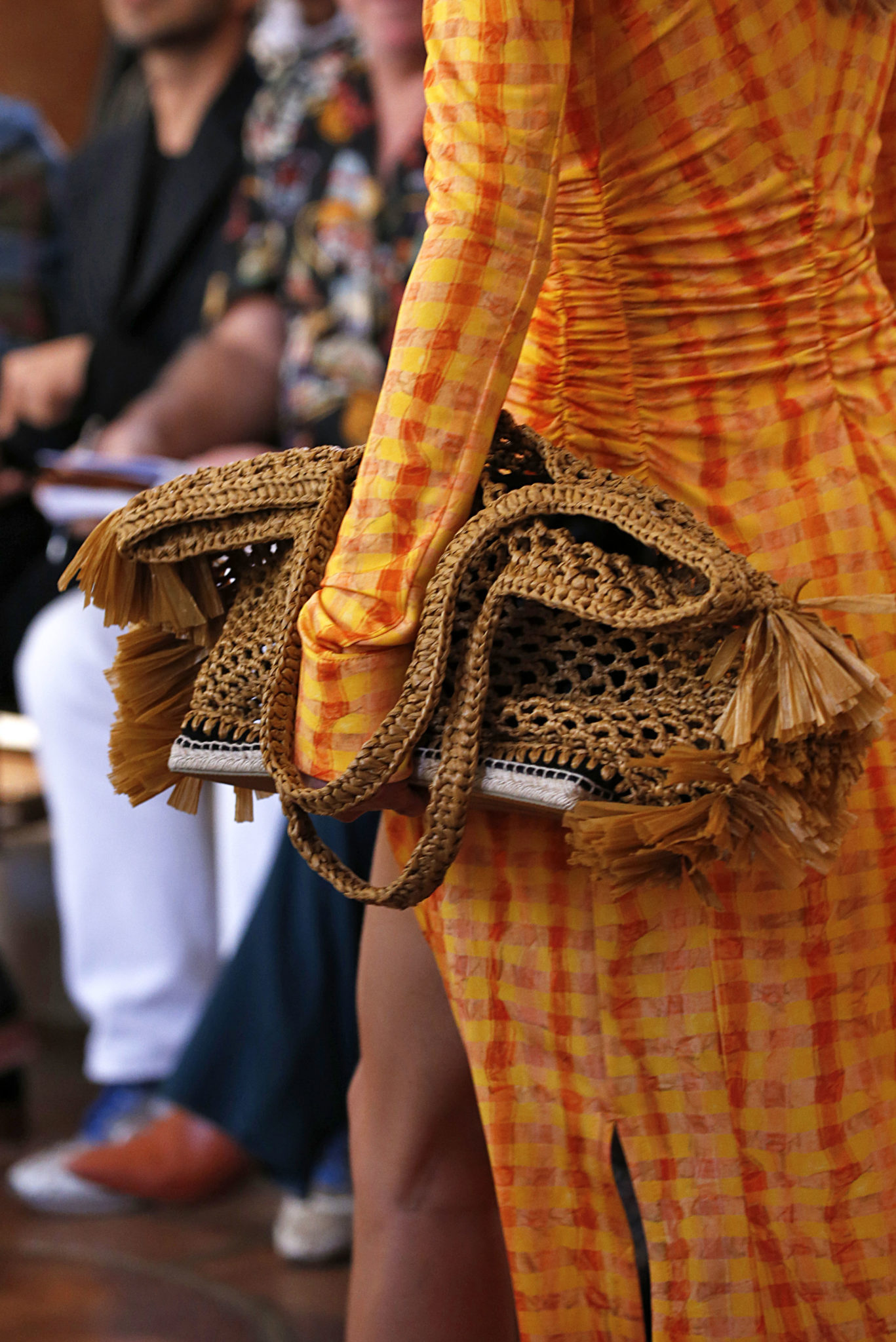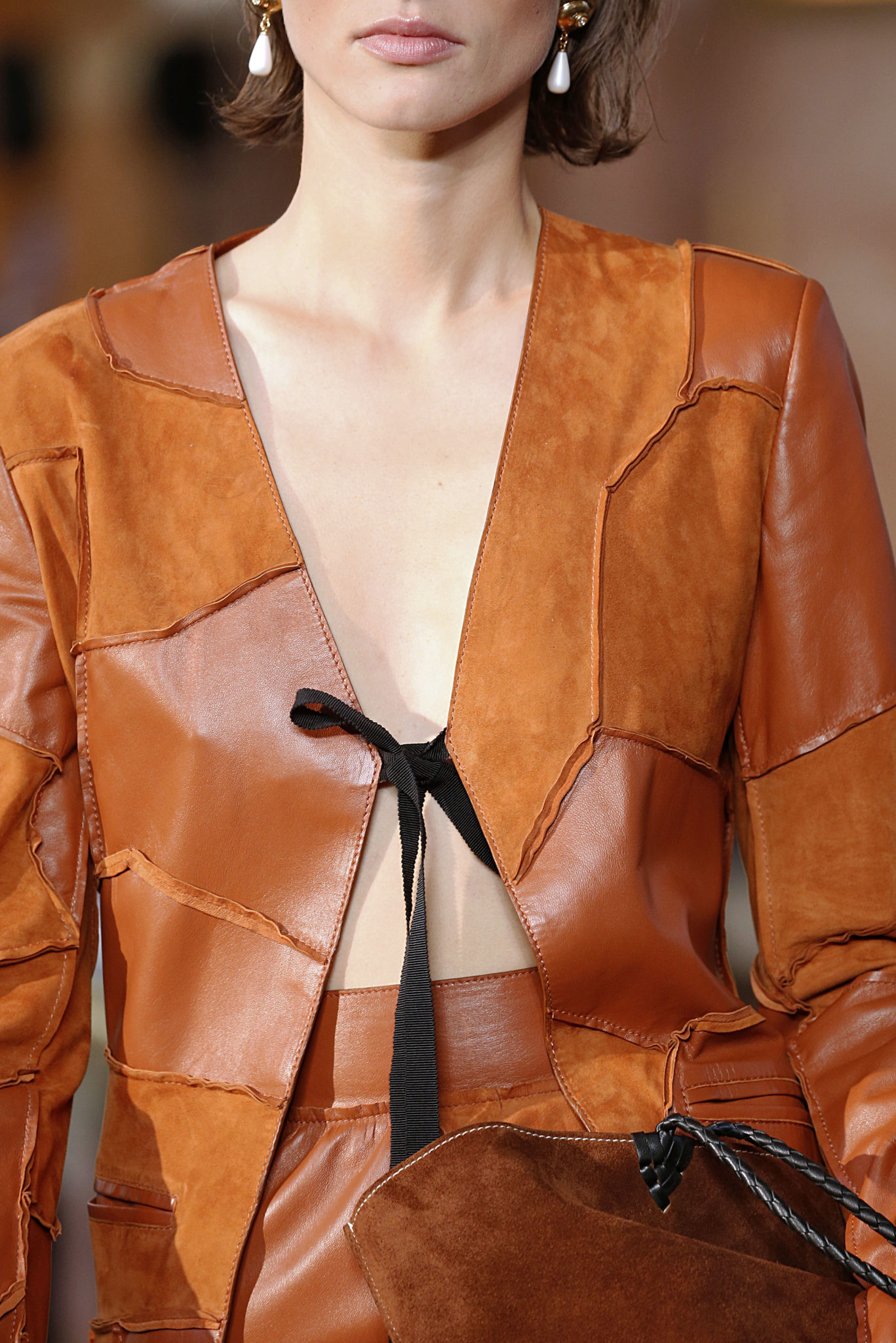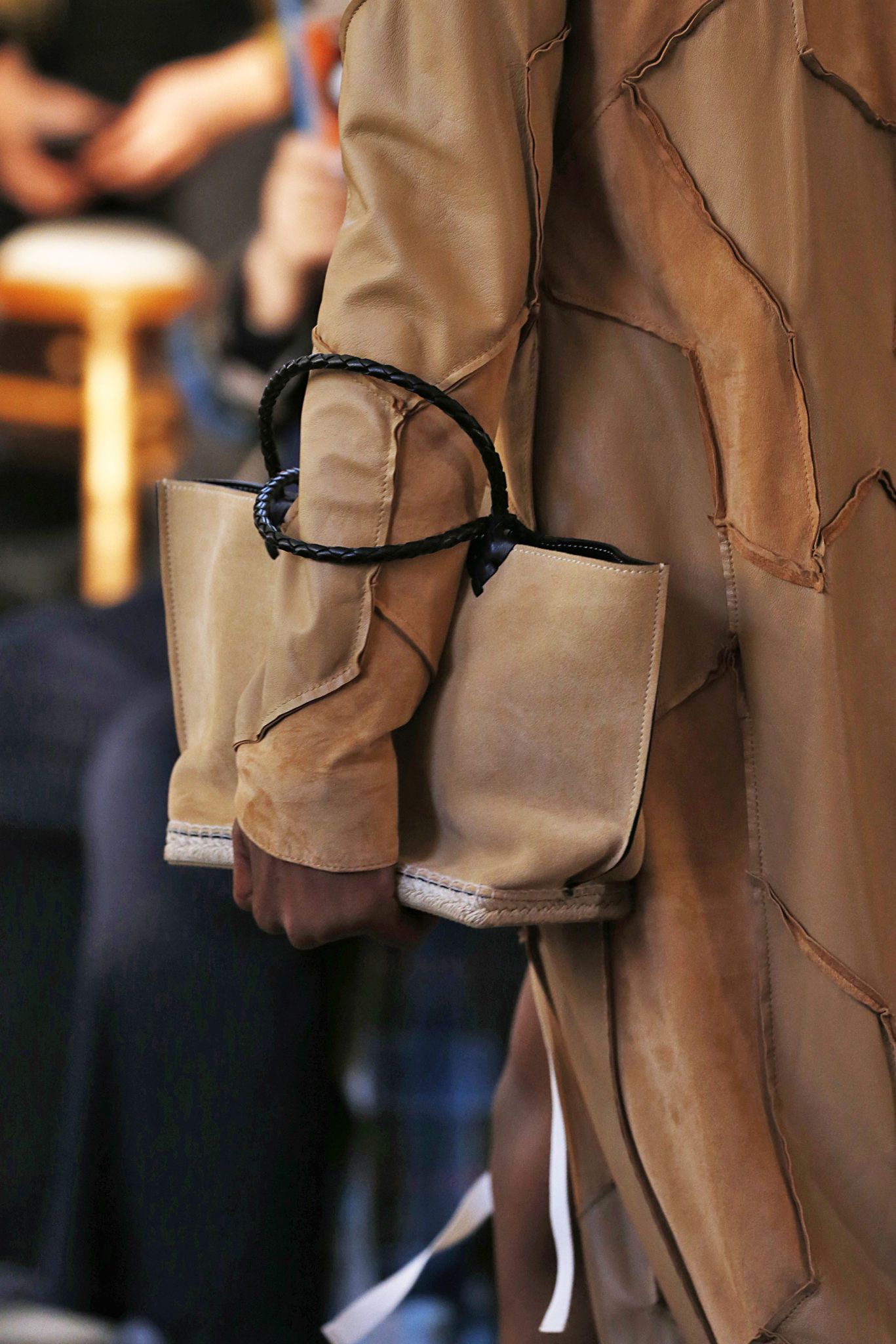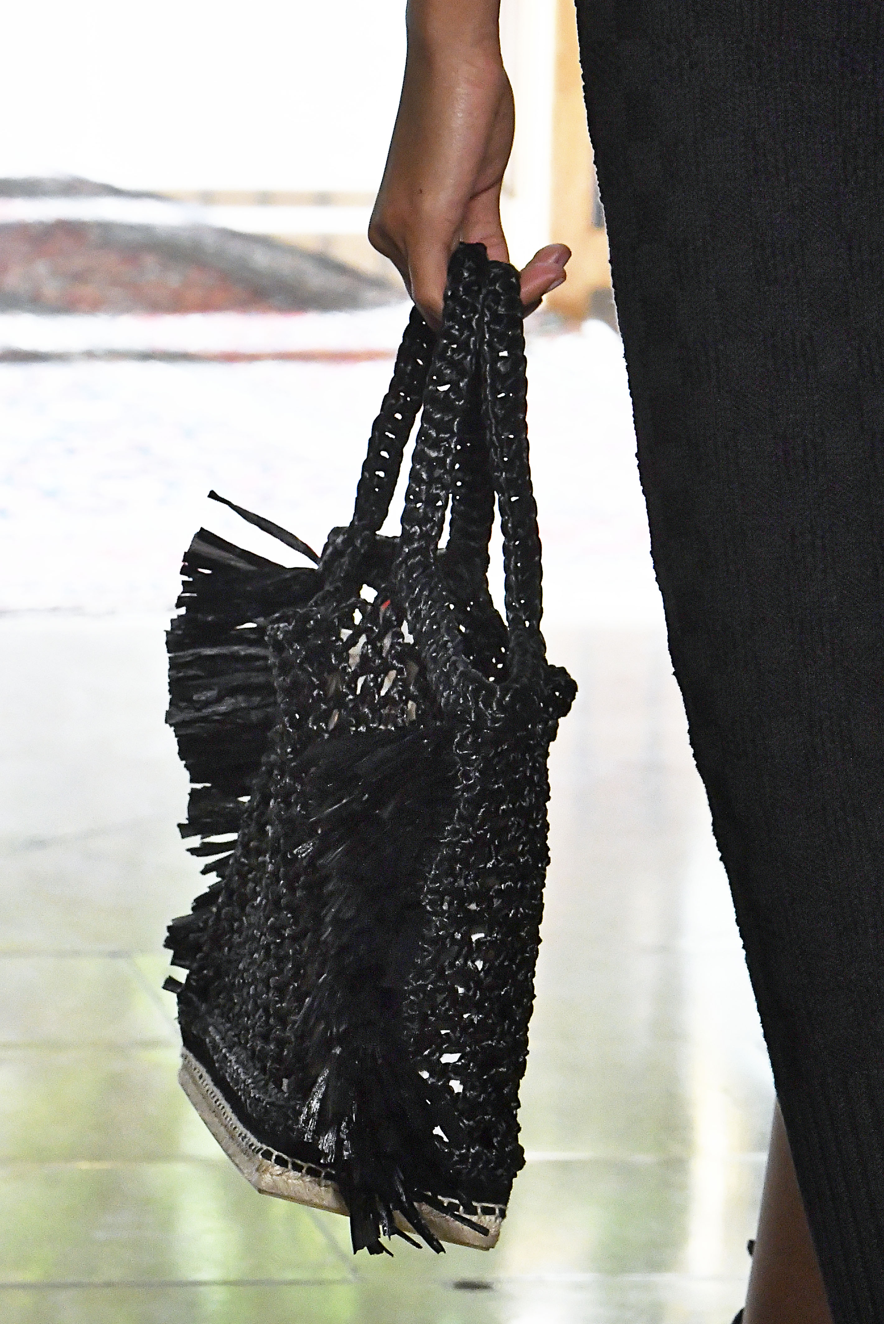 The trio of opening looks sets the tone for a collection imbued with the spirit of summer. Boxy jackets are twisted and distorted by drawstrings, and worn off-the-shoulder as if mid-shrug; shirts are cut to appear warped and shrunken as if nonchalantly left on the sand on a hot July day; dresses and jackets are sliced open at the solar plexus, peeling away layers of fabric, exposing one’s vulnerabilities; suede and leather patches are roughly pieced together, seams laid bare; silk dresses are cut raw, edges frayed, linings left undone; shells are knotted on macramé net bag and shoes, mimicking a fisherman’s net pulled from the sea.