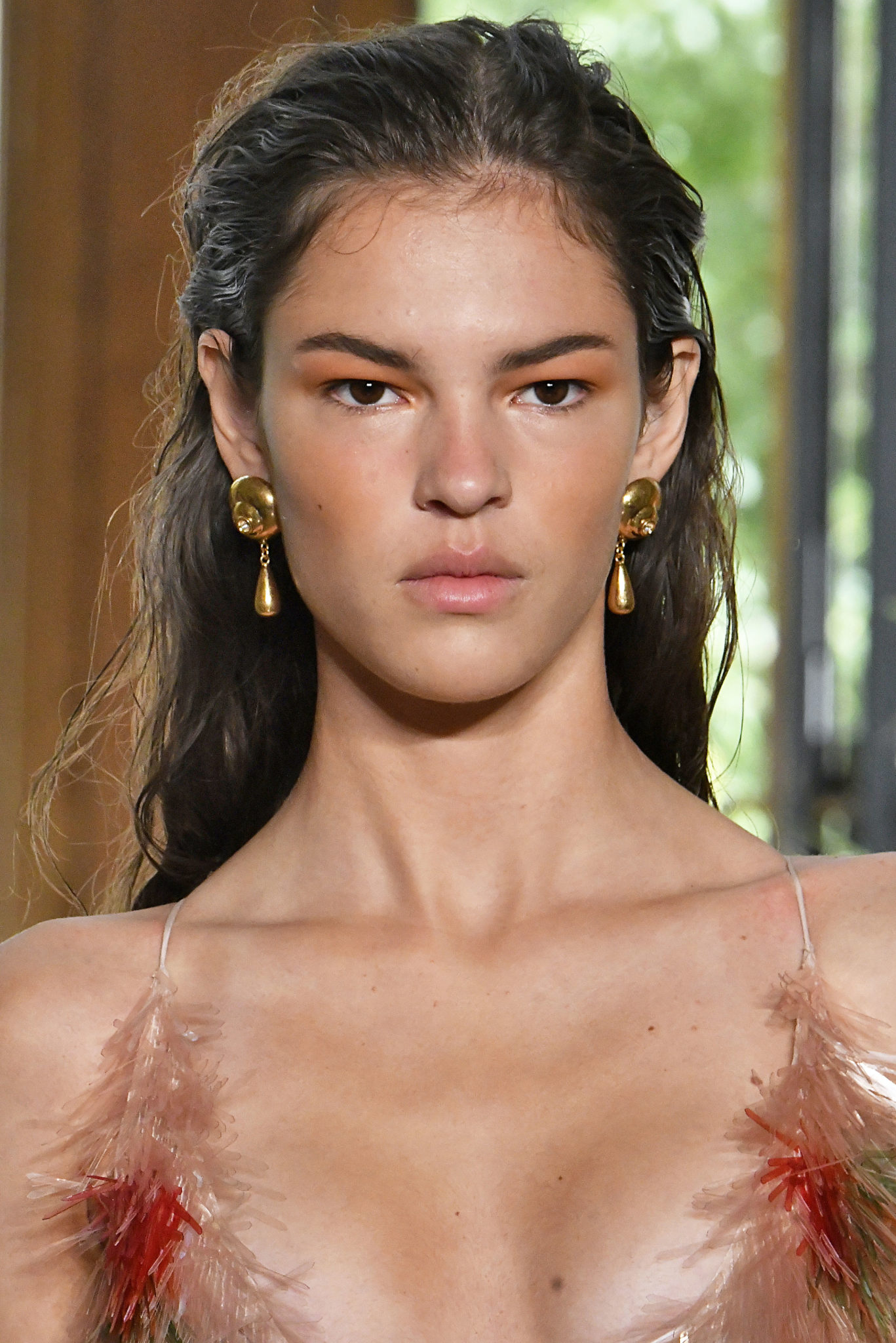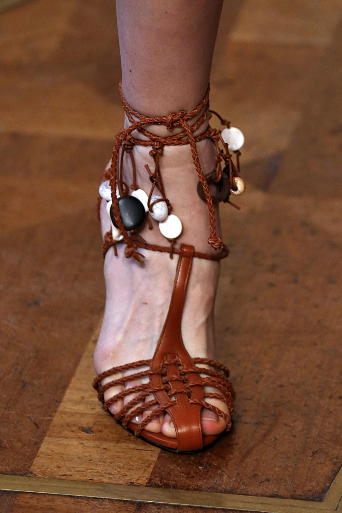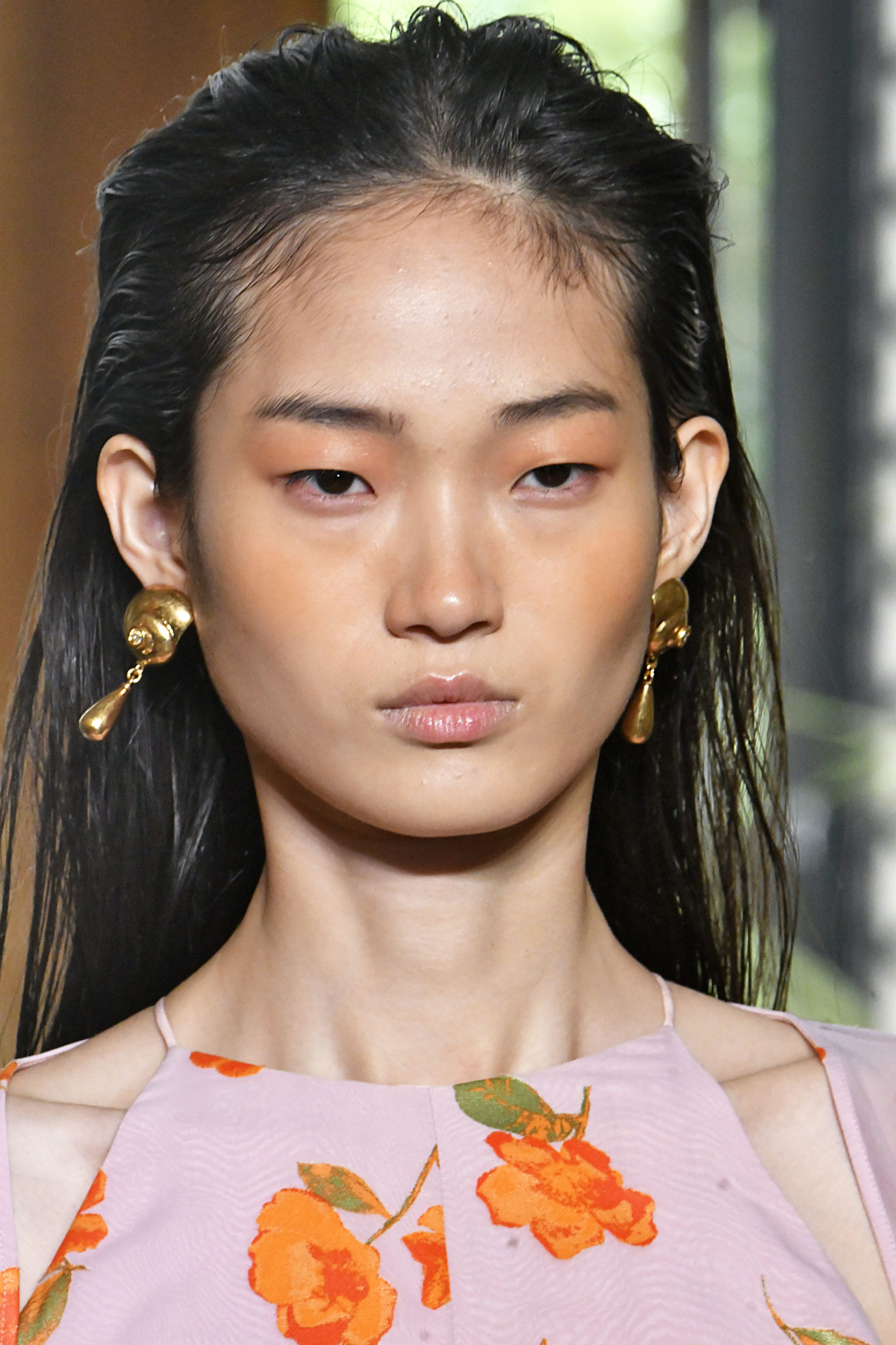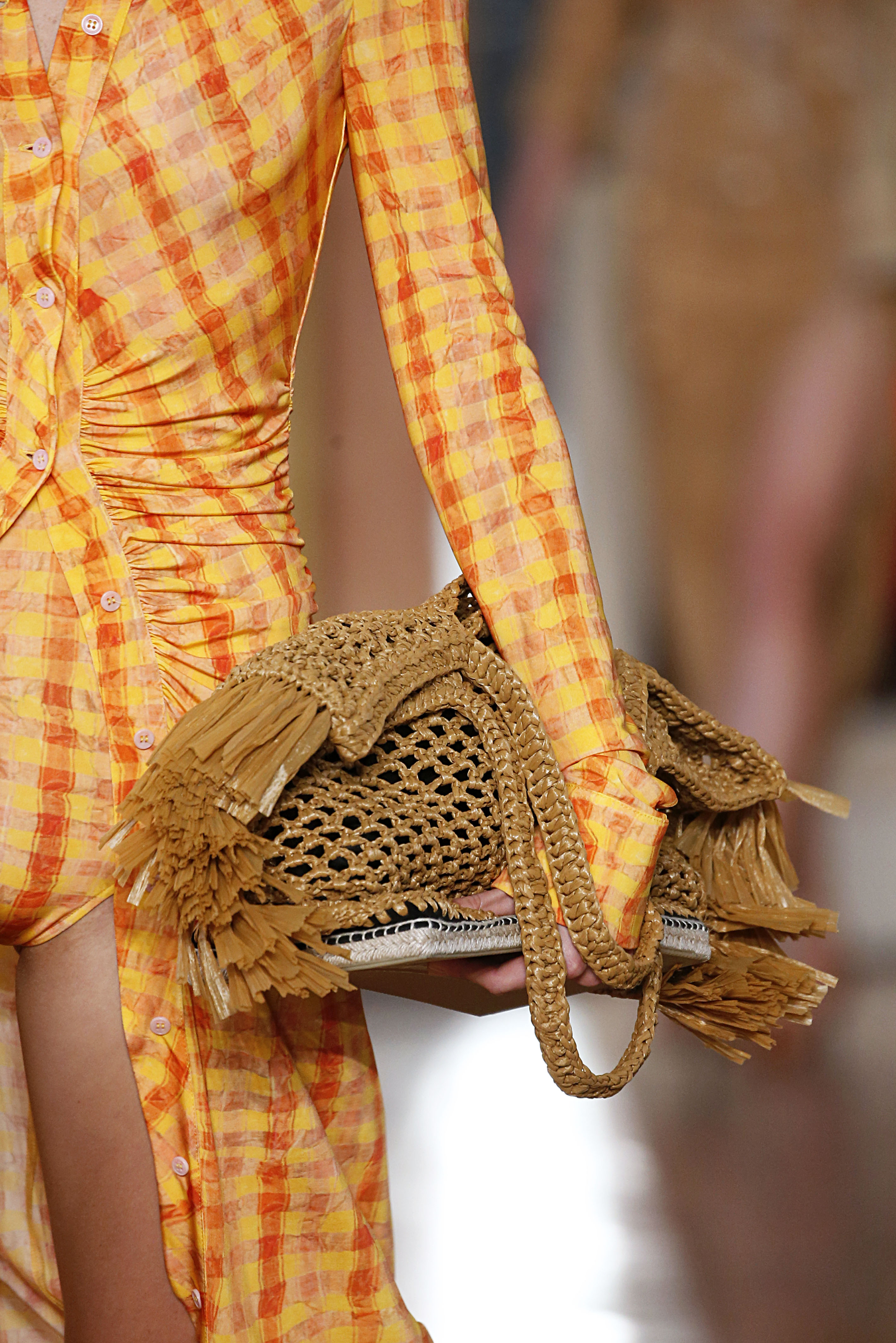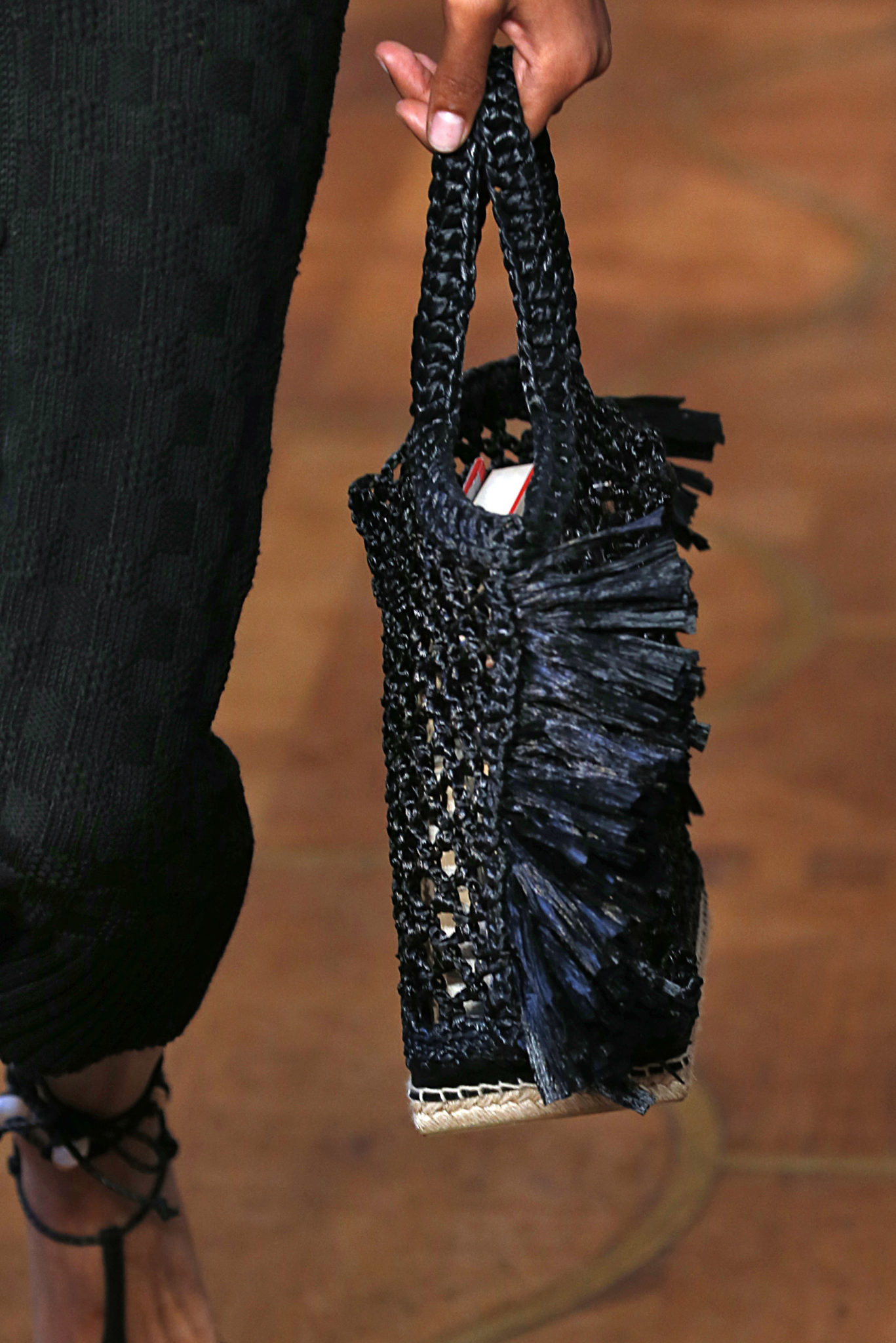 The trio of opening looks sets the tone for a collection imbued with the spirit of summer. Boxy jackets are twisted and distorted by drawstrings, and worn off-the-shoulder as if mid-shrug; shirts are cut to appear warped and shrunken as if nonchalantly left on the sand on a hot July day; dresses and jackets are sliced open at the solar plexus, peeling away layers of fabric, exposing one’s vulnerabilities; suede and leather patches are roughly pieced together, seams laid bare; silk dresses are cut raw, edges frayed, linings left undone; shells are knotted on macramé net bag and shoes, mimicking a fisherman’s net pulled from the sea.