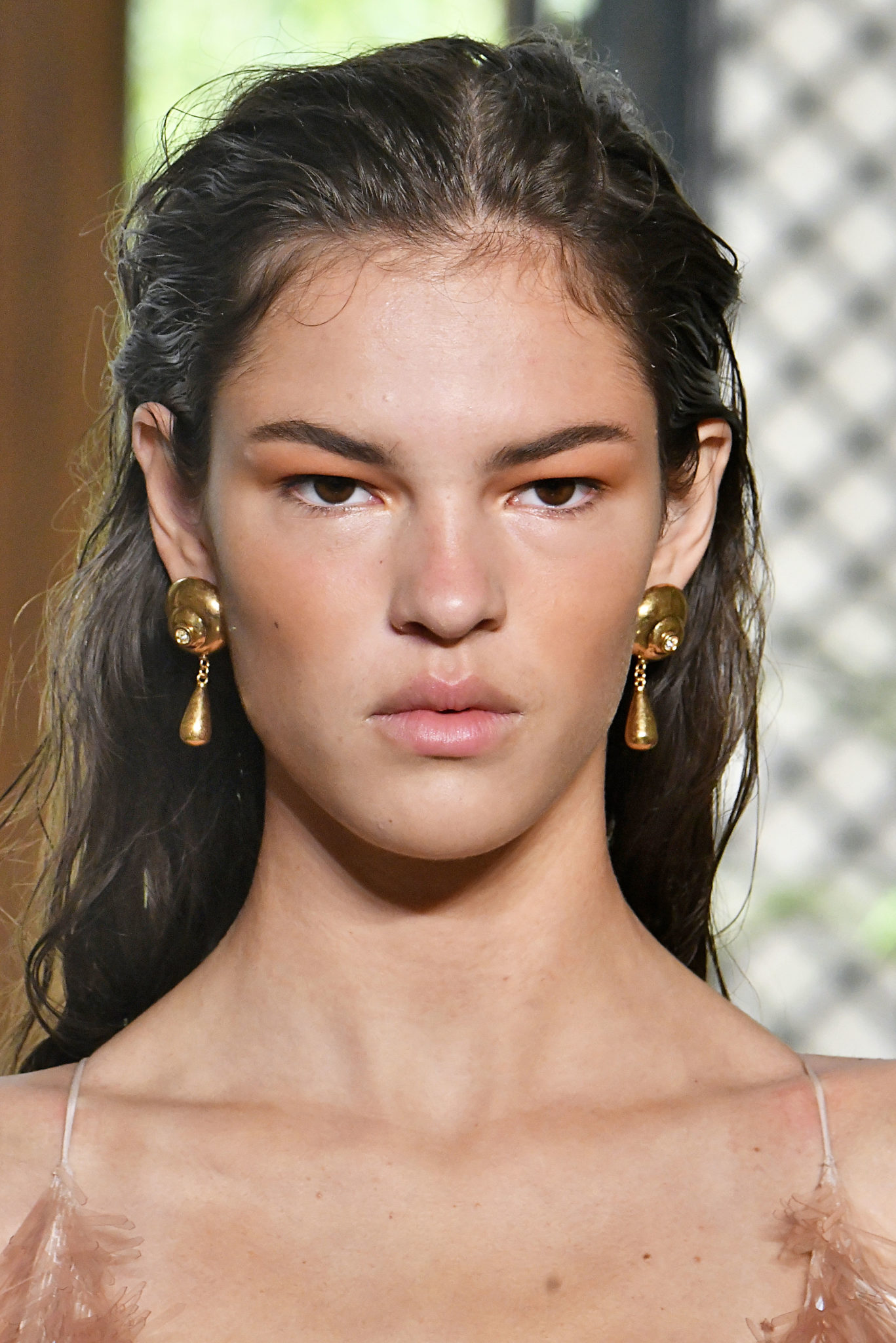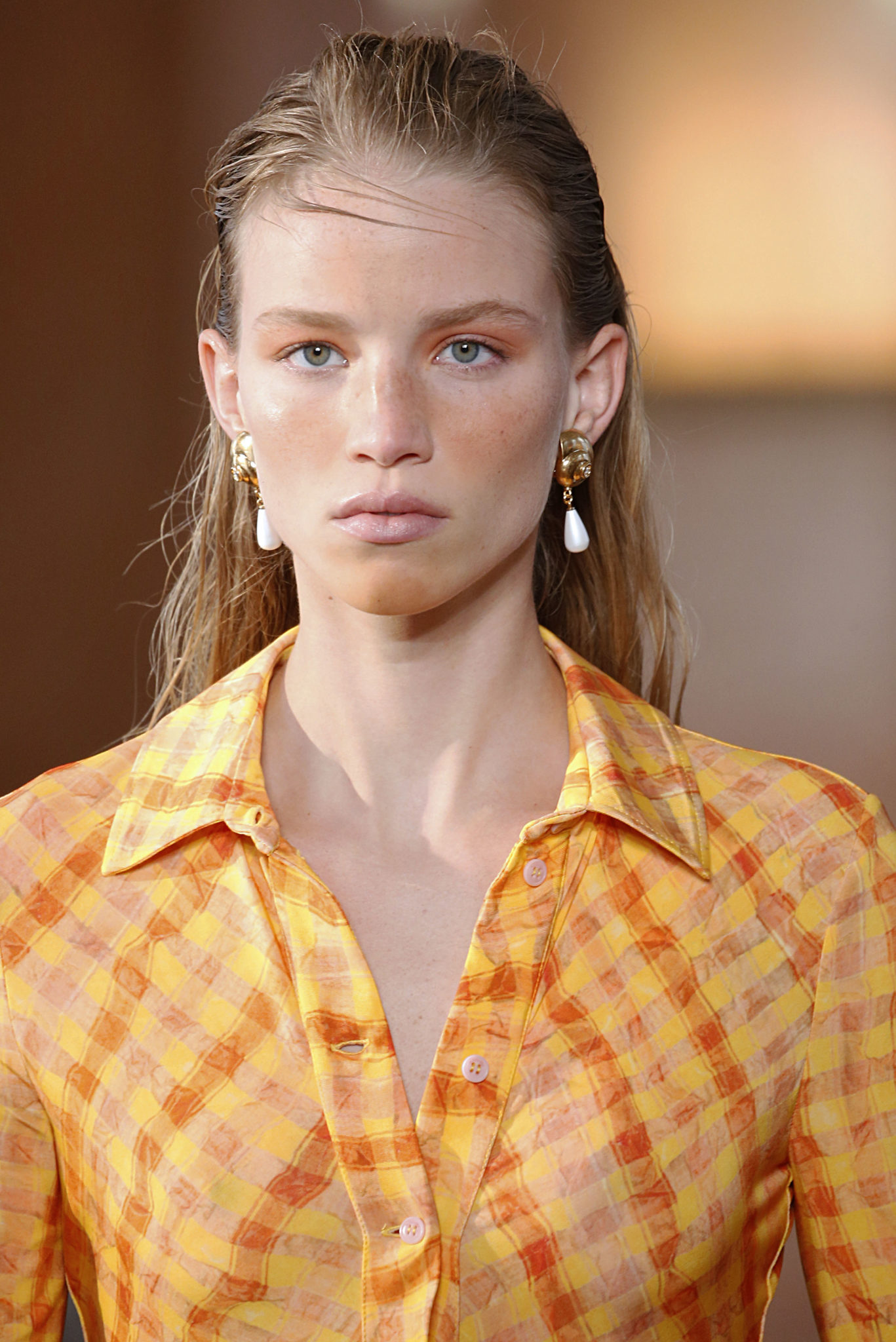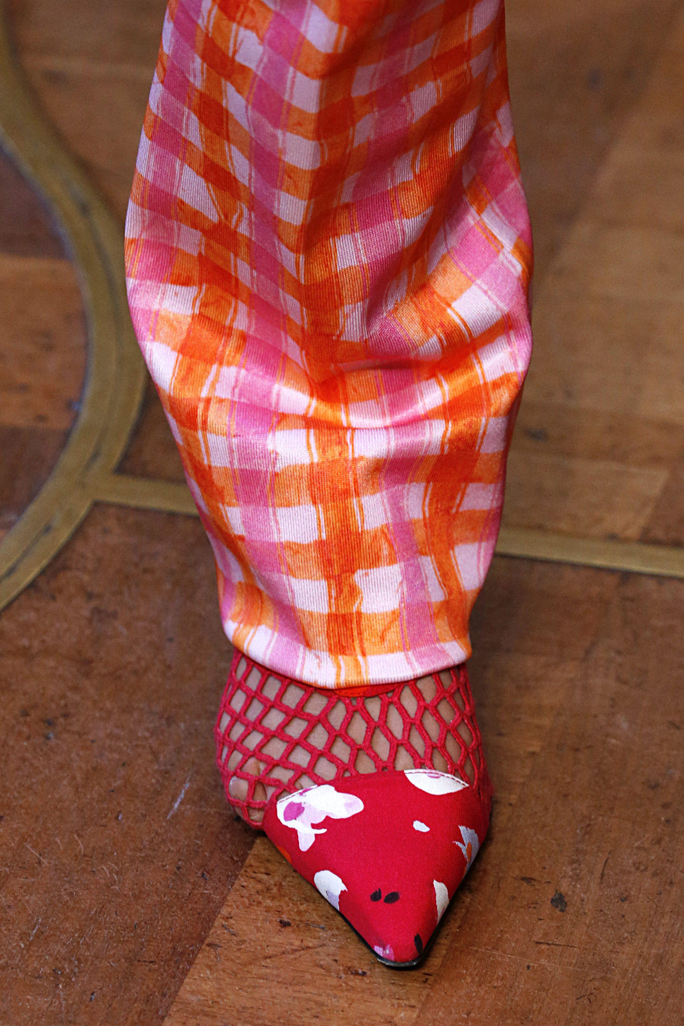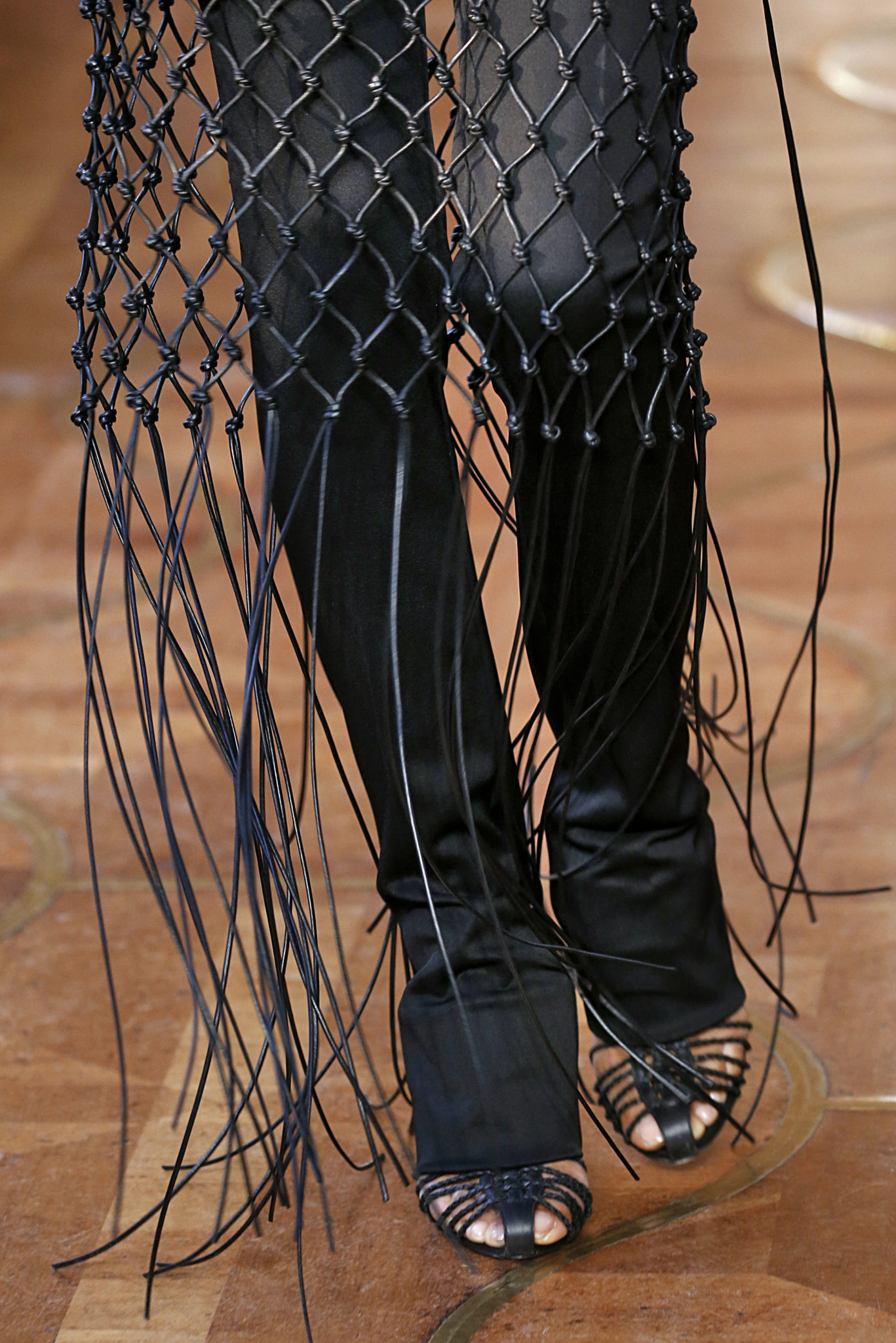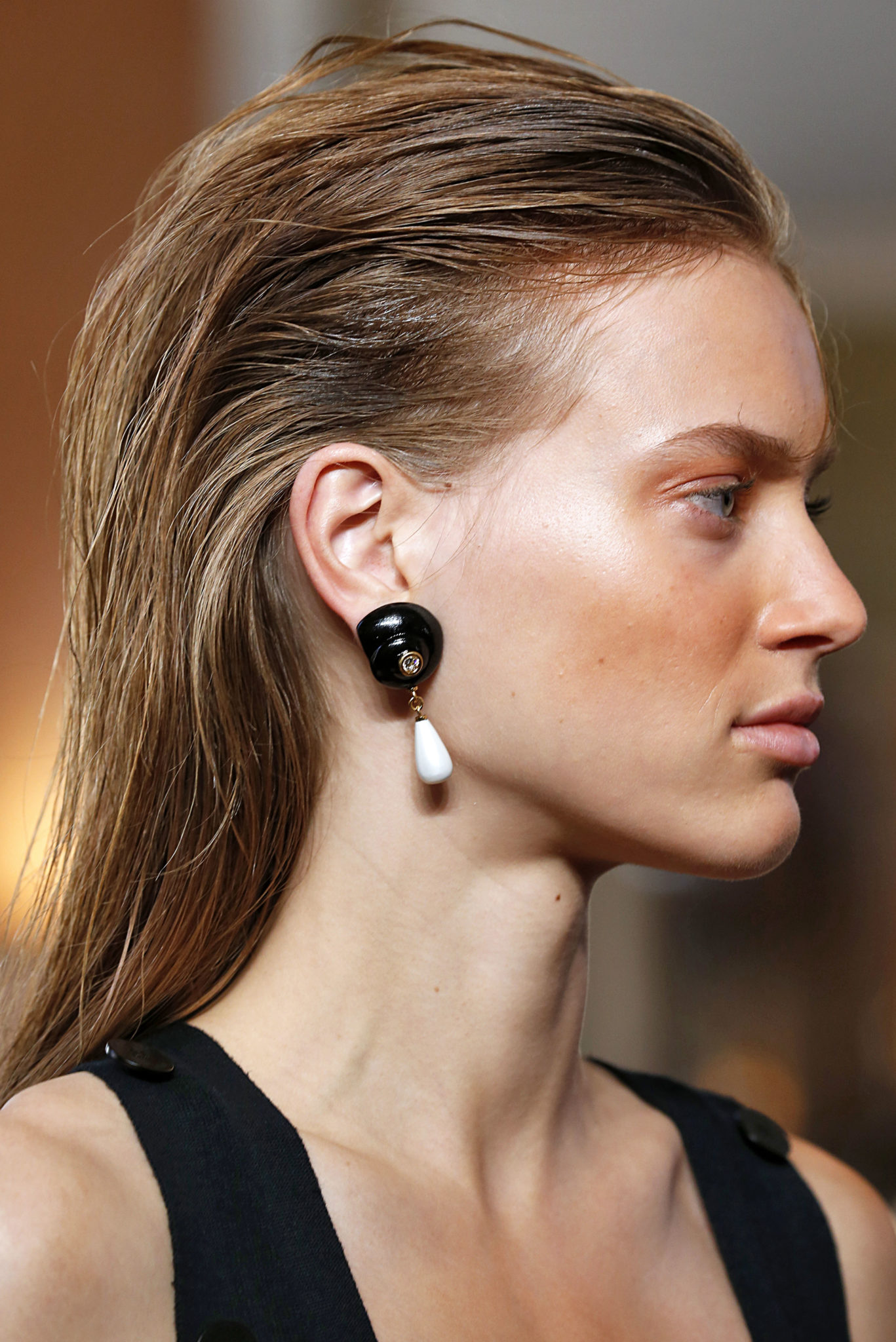 The trio of opening looks sets the tone for a collection imbued with the spirit of summer. Boxy jackets are twisted and distorted by drawstrings, and worn off-the-shoulder as if mid-shrug; shirts are cut to appear warped and shrunken as if nonchalantly left on the sand on a hot July day; dresses and jackets are sliced open at the solar plexus, peeling away layers of fabric, exposing one’s vulnerabilities; suede and leather patches are roughly pieced together, seams laid bare; silk dresses are cut raw, edges frayed, linings left undone; shells are knotted on macramé net bag and shoes, mimicking a fisherman’s net pulled from the sea.