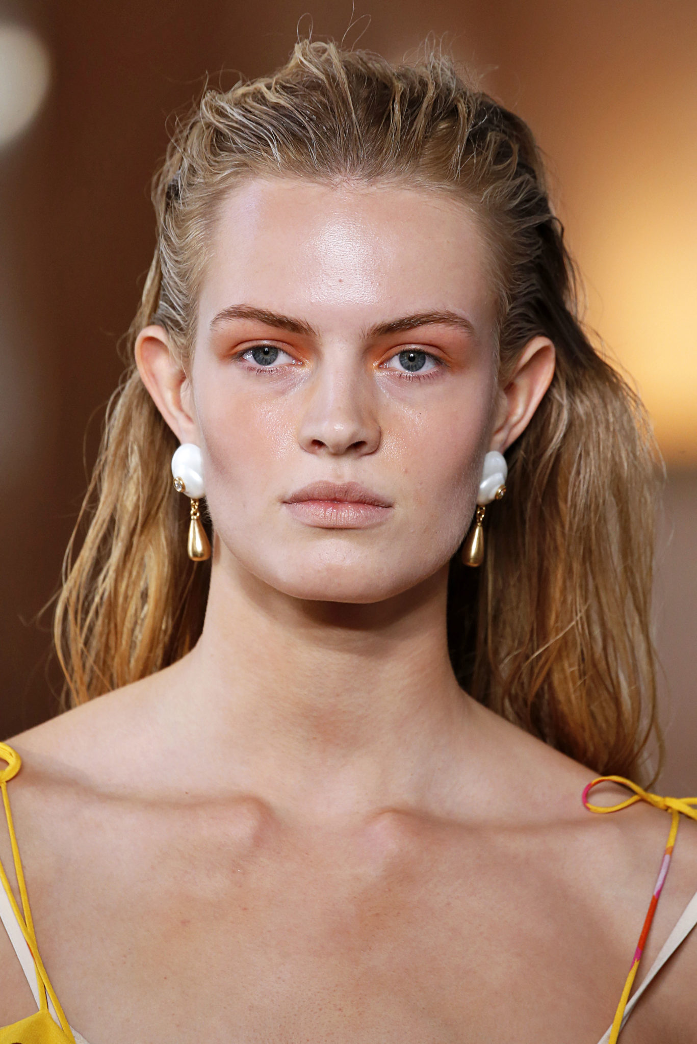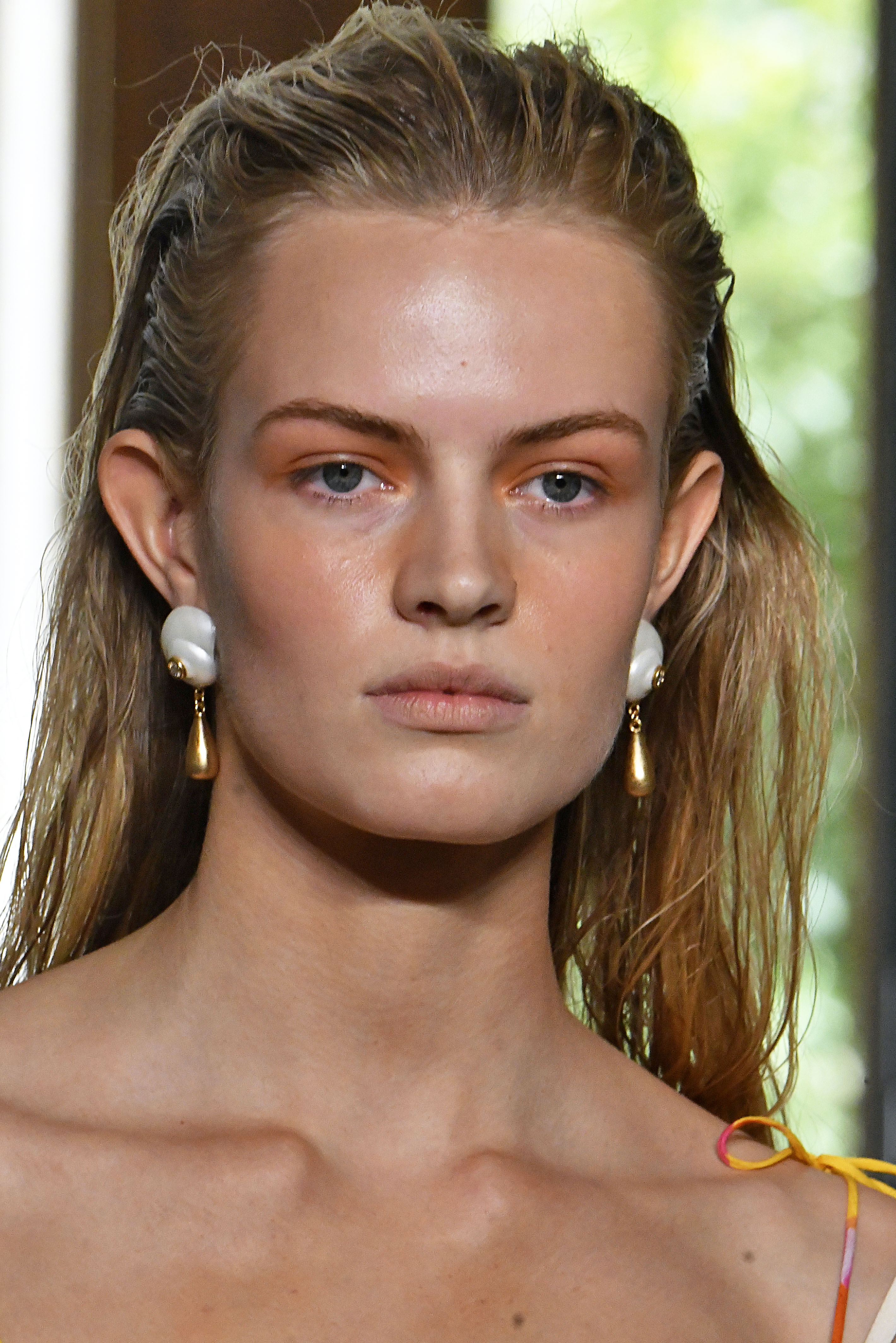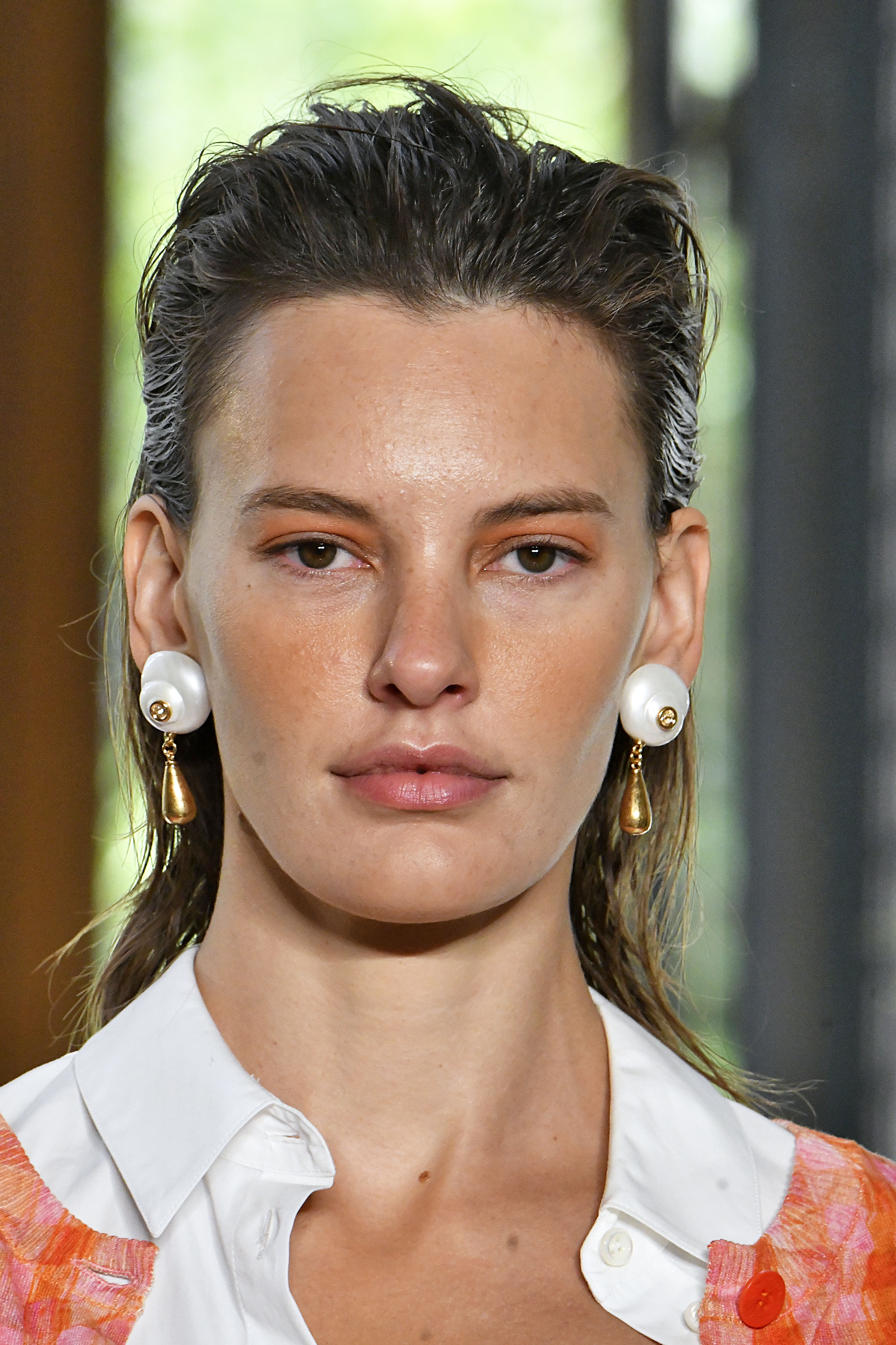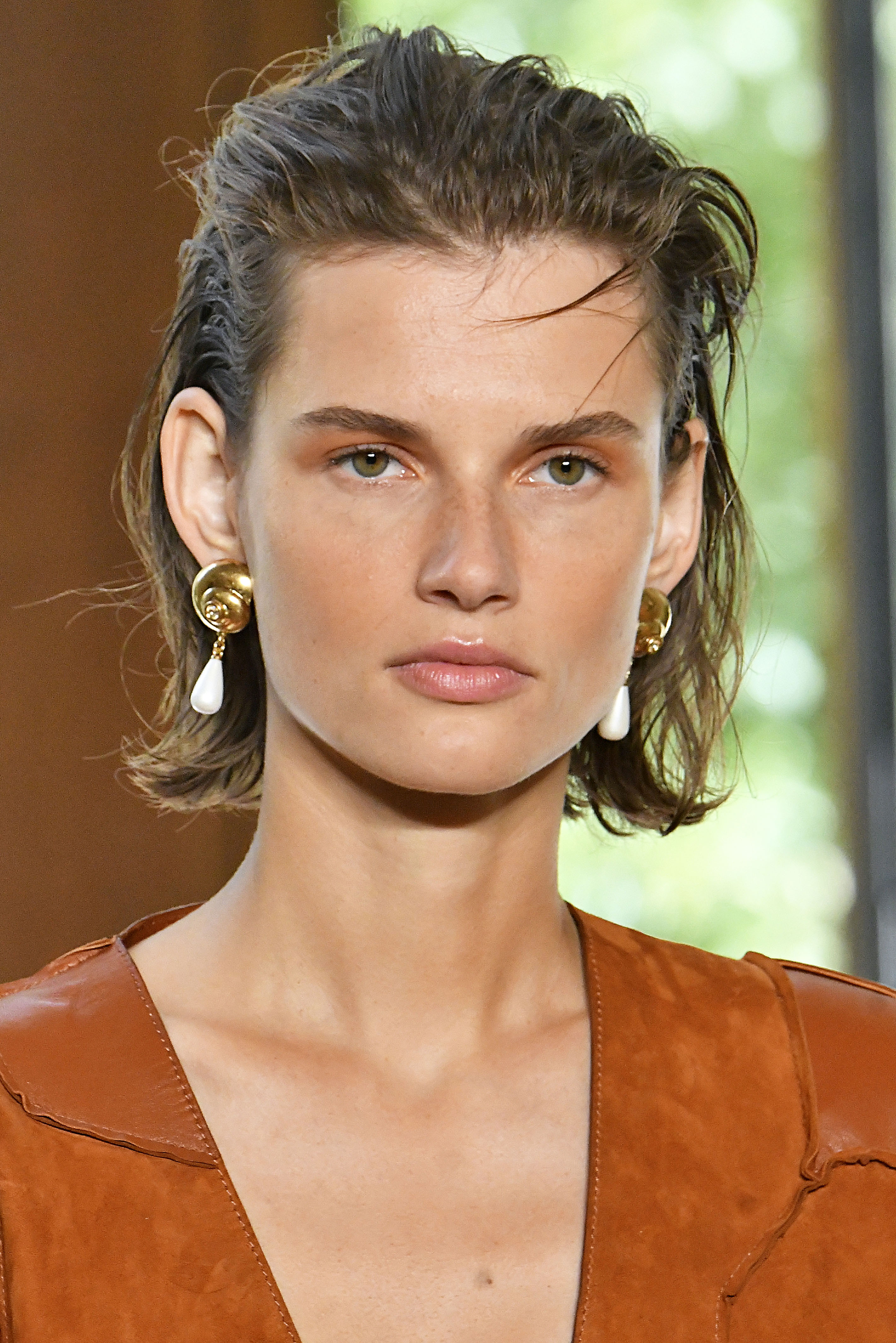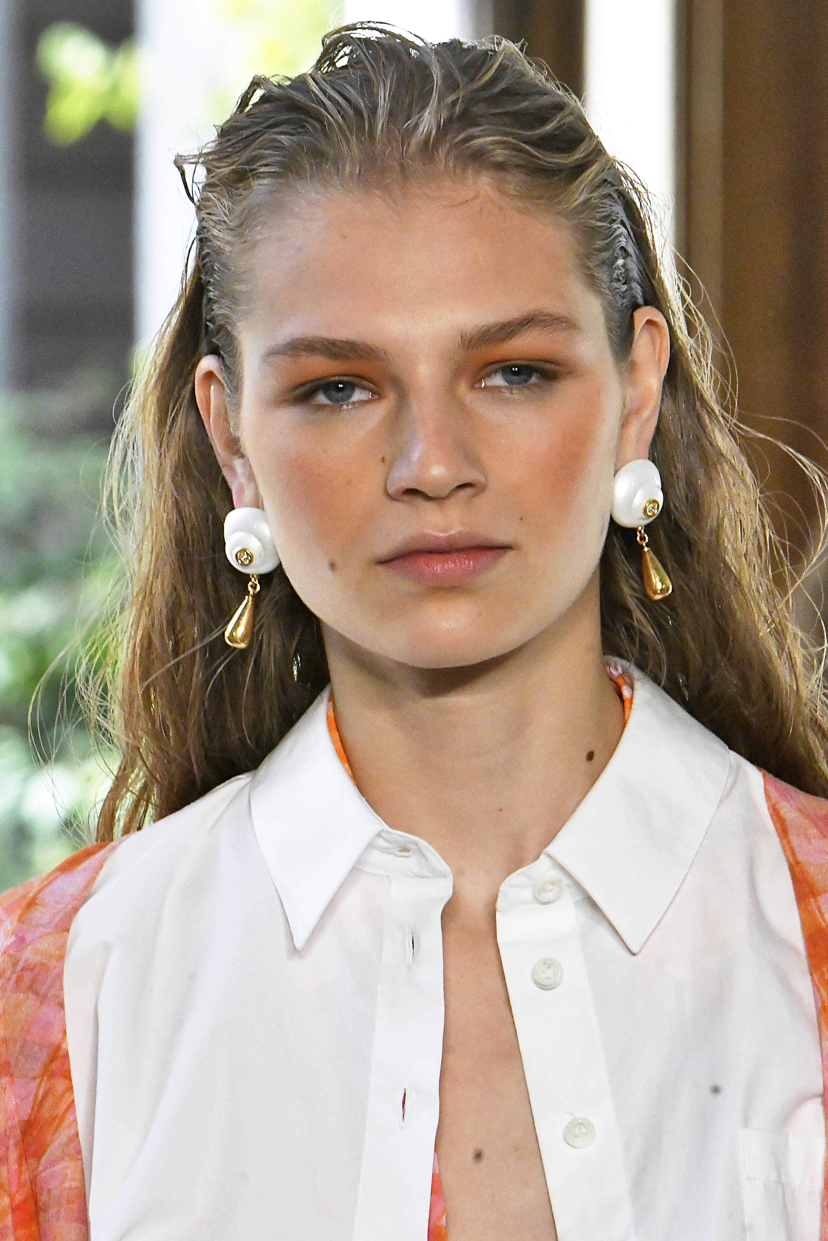 The trio of opening looks sets the tone for a collection imbued with the spirit of summer. Boxy jackets are twisted and distorted by drawstrings, and worn off-the-shoulder as if mid-shrug; shirts are cut to appear warped and shrunken as if nonchalantly left on the sand on a hot July day; dresses and jackets are sliced open at the solar plexus, peeling away layers of fabric, exposing one’s vulnerabilities; suede and leather patches are roughly pieced together, seams laid bare; silk dresses are cut raw, edges frayed, linings left undone; shells are knotted on macramé net bag and shoes, mimicking a fisherman’s net pulled from the sea.