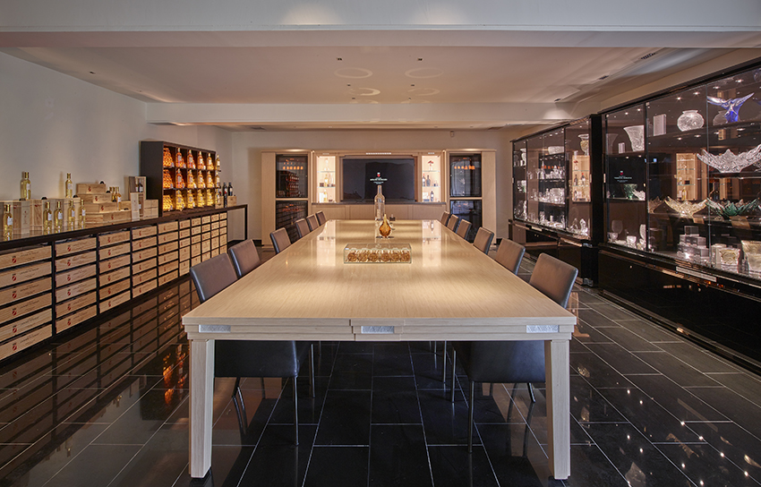 Des lanières de cuir, fixées par des cabochons en cristal, ont été ajoutées afin de rappeler les cerceaux en métal autour de la barrique. La bonde en cristal est quant à elle une réplique exacte des bondes en verre toujours utilisées aujourd’hui.