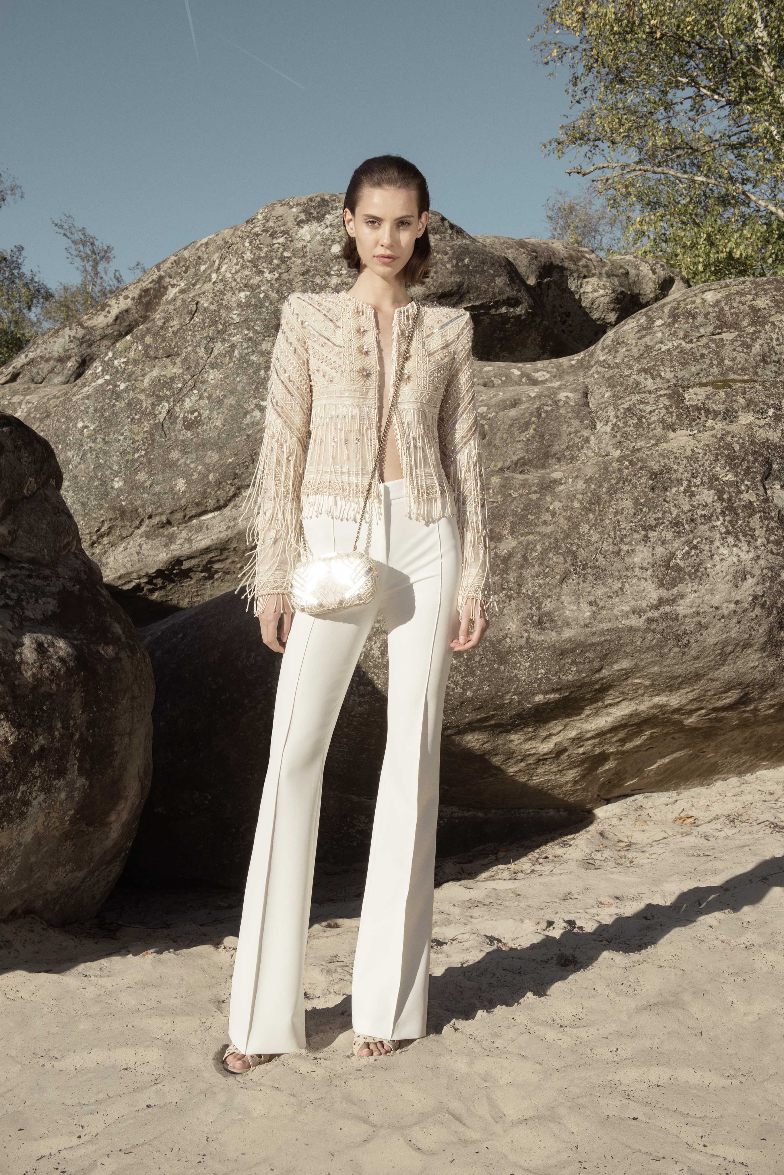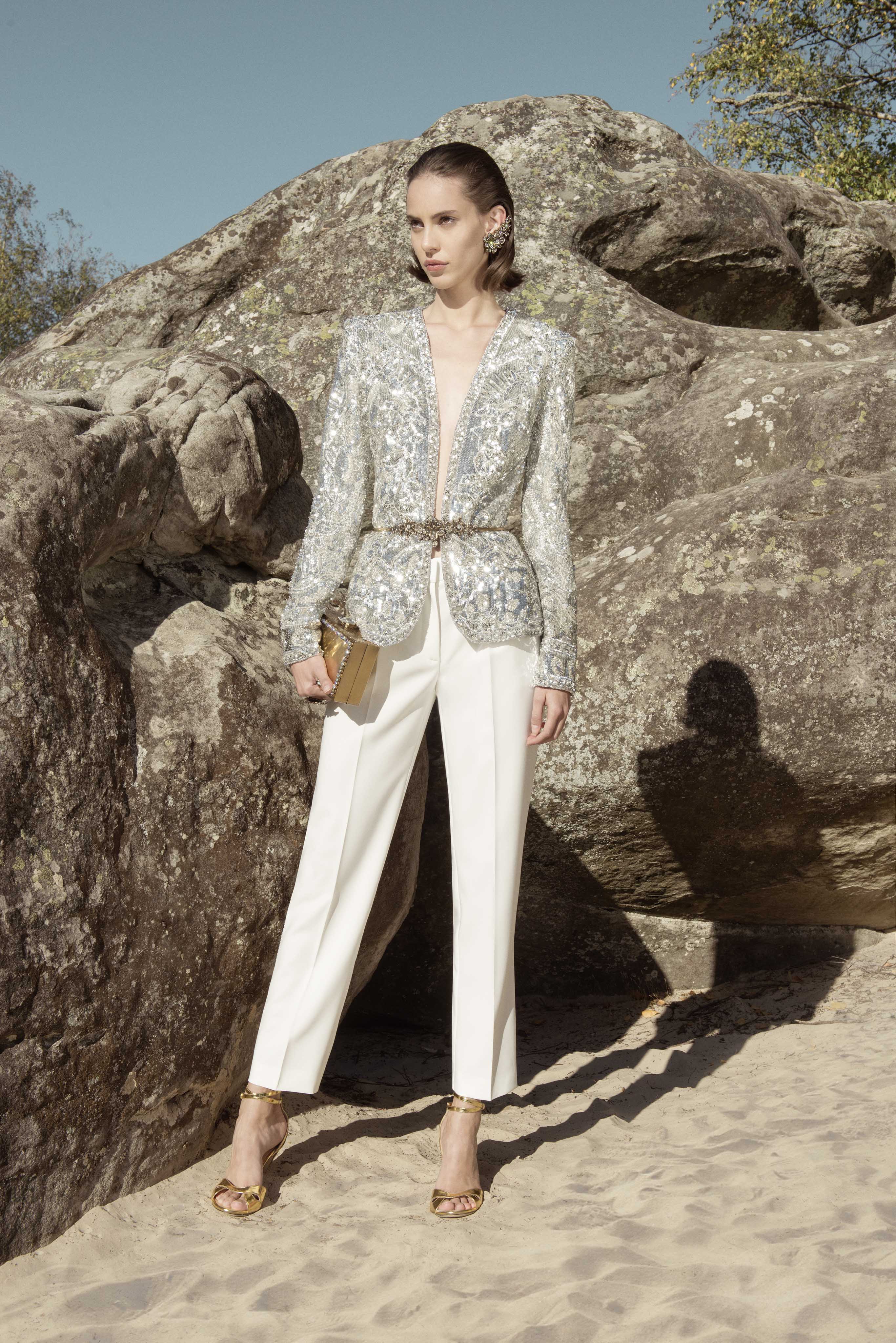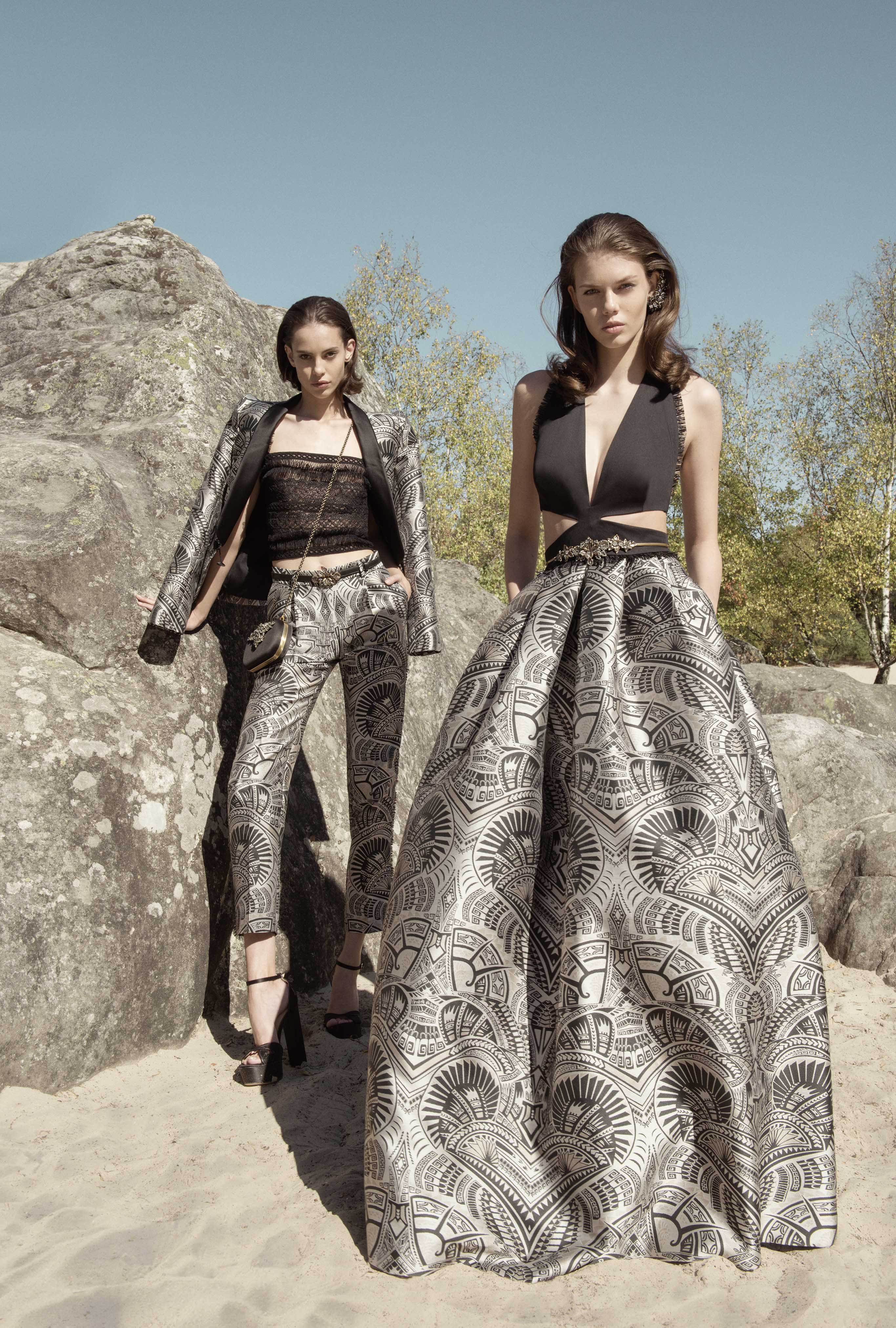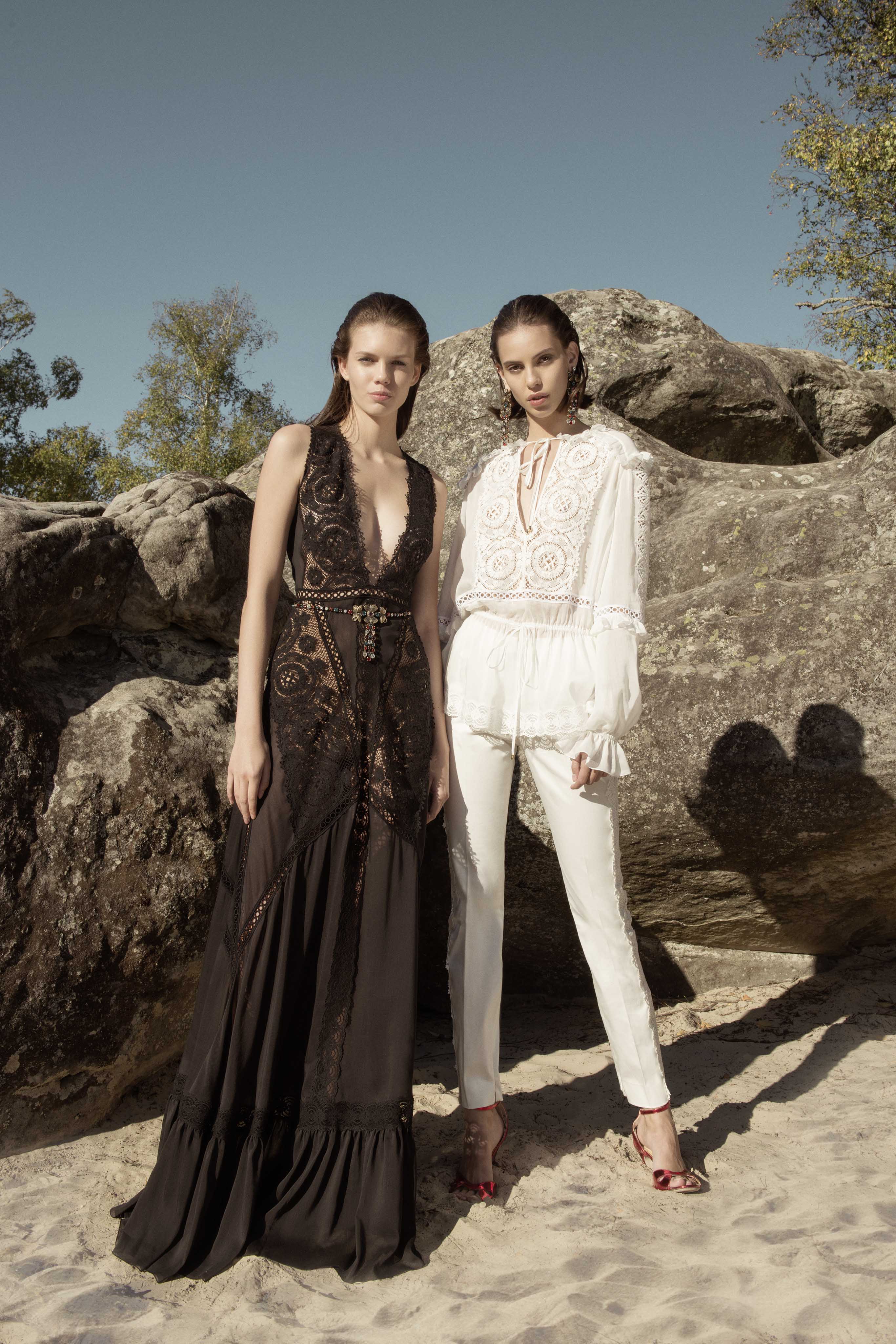 Cette palette de textures se déploie sur des jupes plissées et moirées ; des tuniques ceinturées et légères comme un souffle ; des blazers déstructurés et ornés de dentelles; des hauts à volants en mousseline ; ou encore des capes et robes vaporeuses, à nouer autour des épaules.