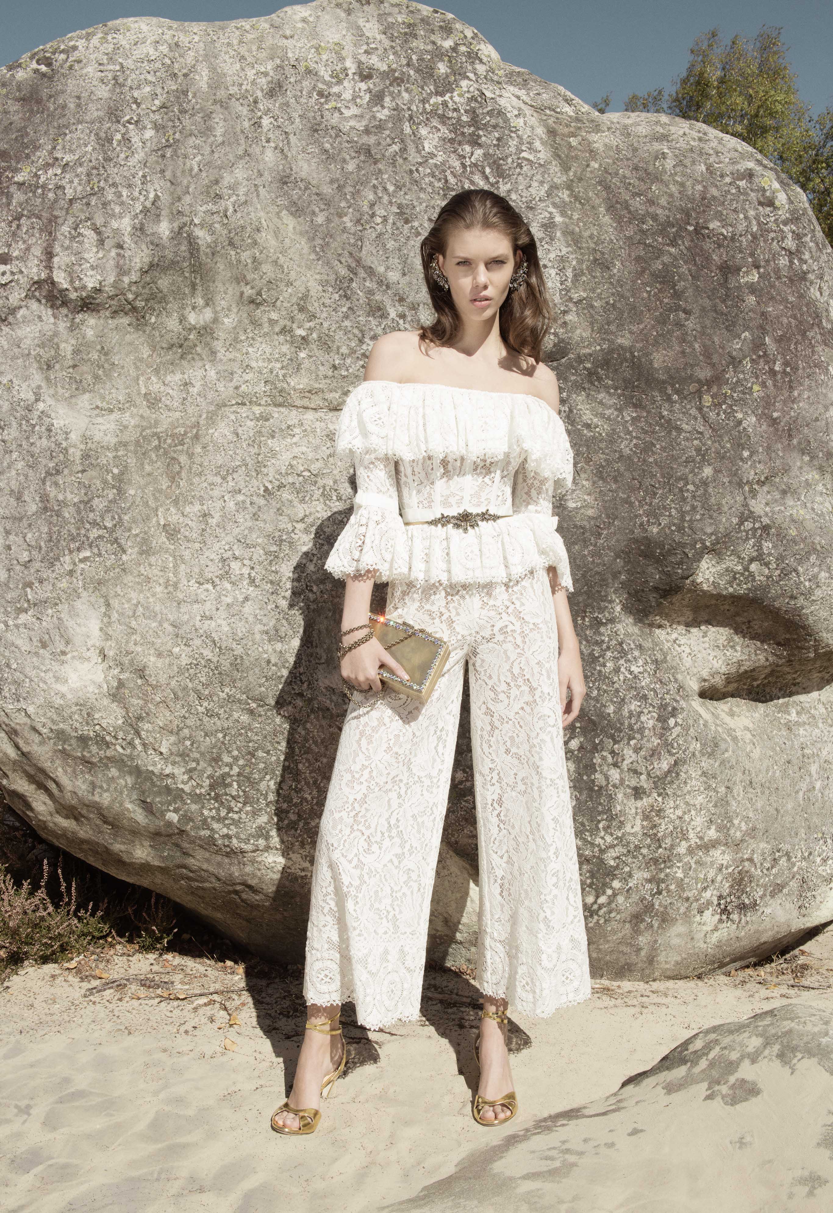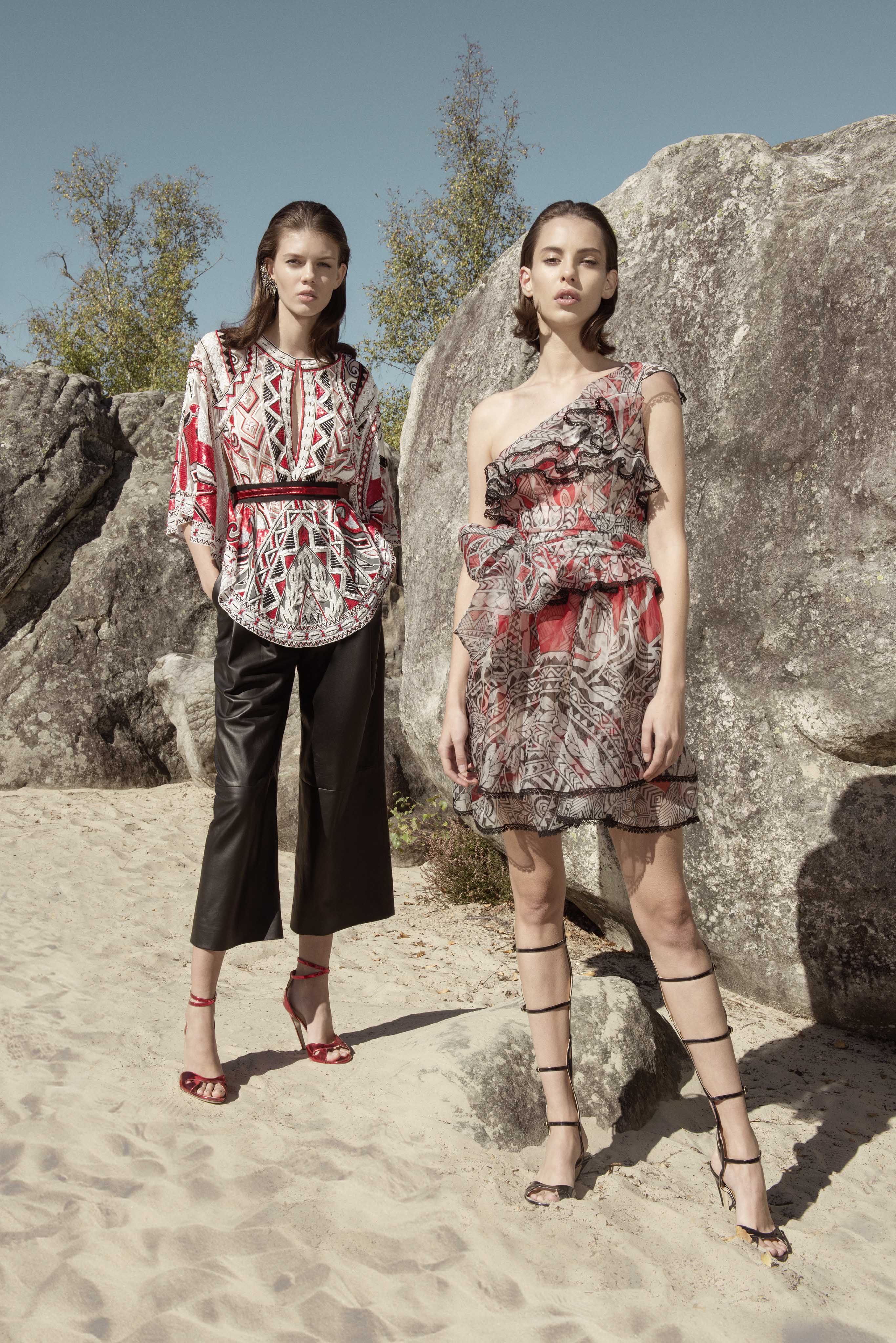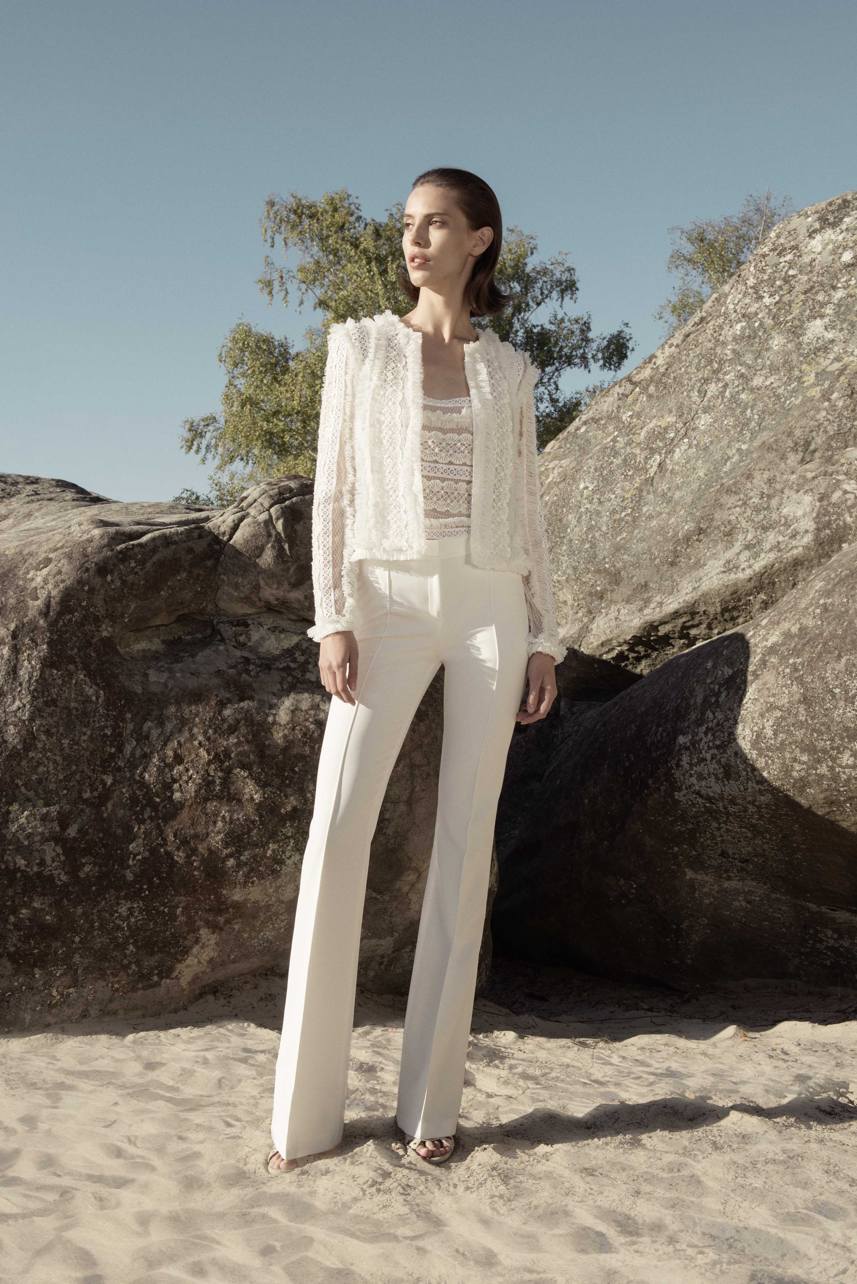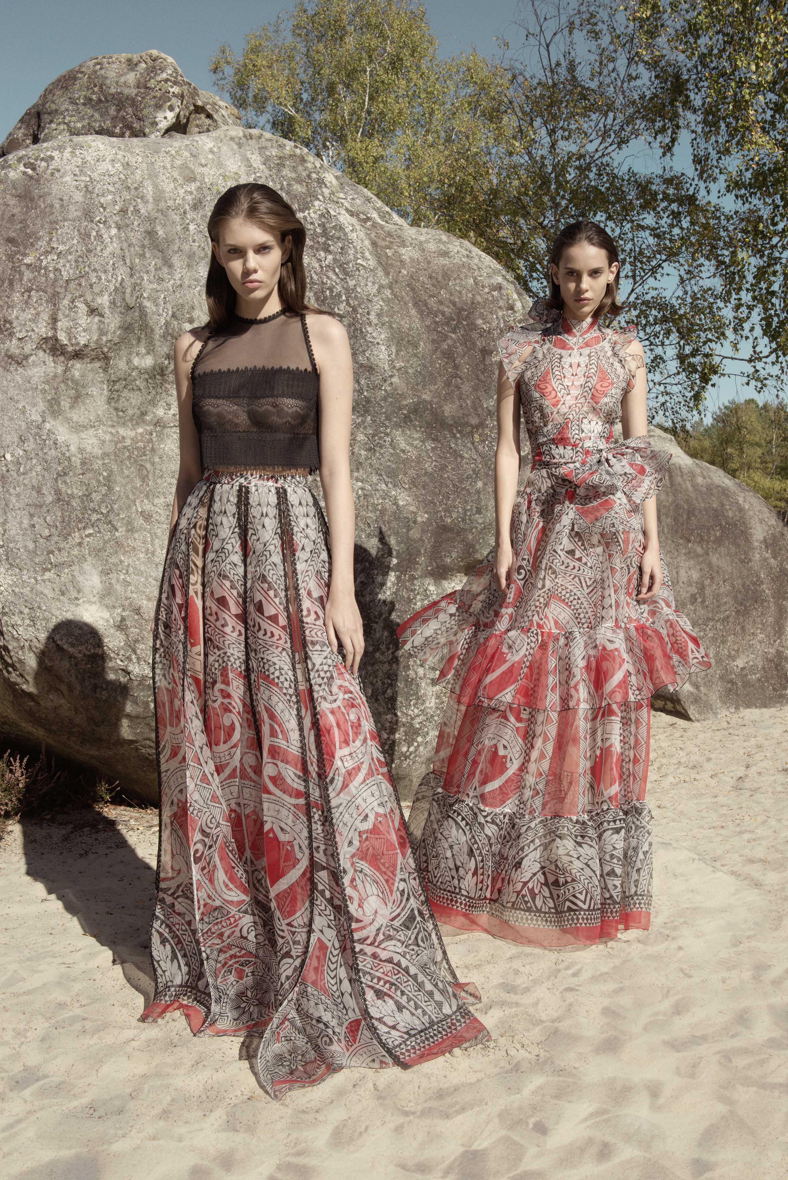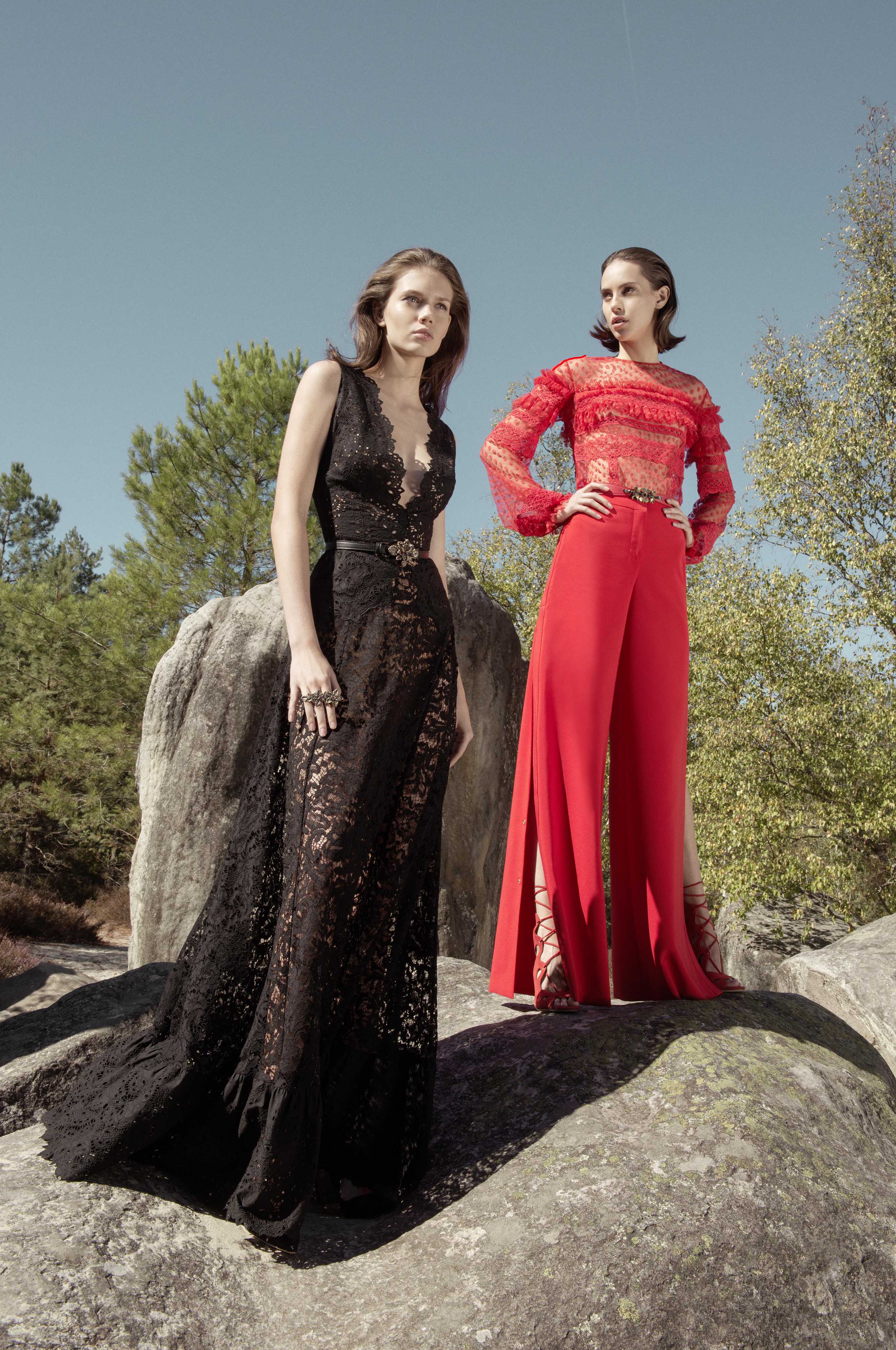 Cette palette de textures se déploie sur des jupes plissées et moirées ; des tuniques ceinturées et légères comme un souffle ; des blazers déstructurés et ornés de dentelles; des hauts à volants en mousseline ; ou encore des capes et robes vaporeuses, à nouer autour des épaules.