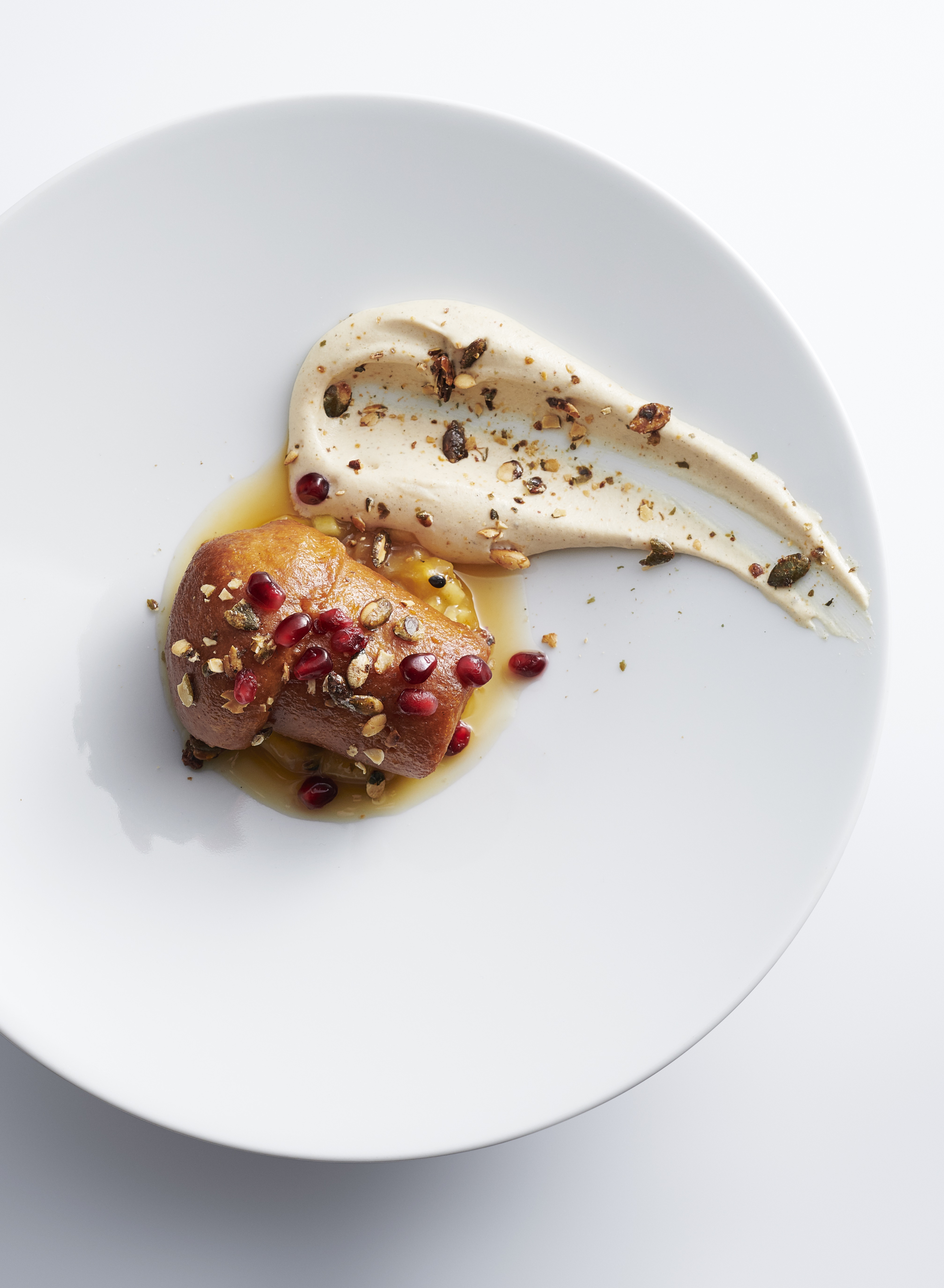 nappé d’un caramel d’ananas, graines de courge, marmelade de fruits