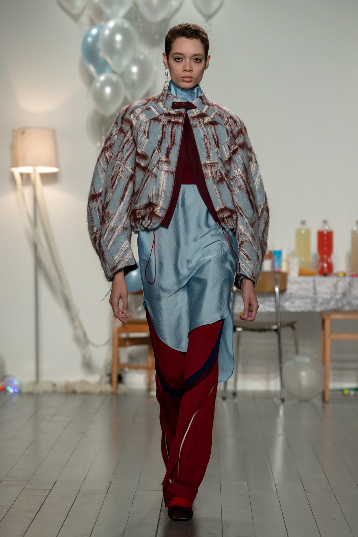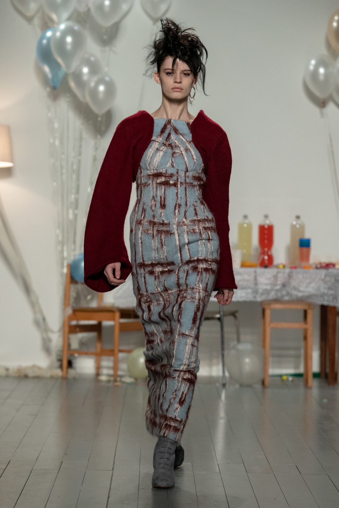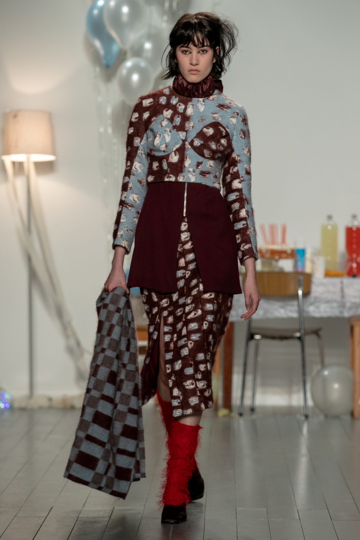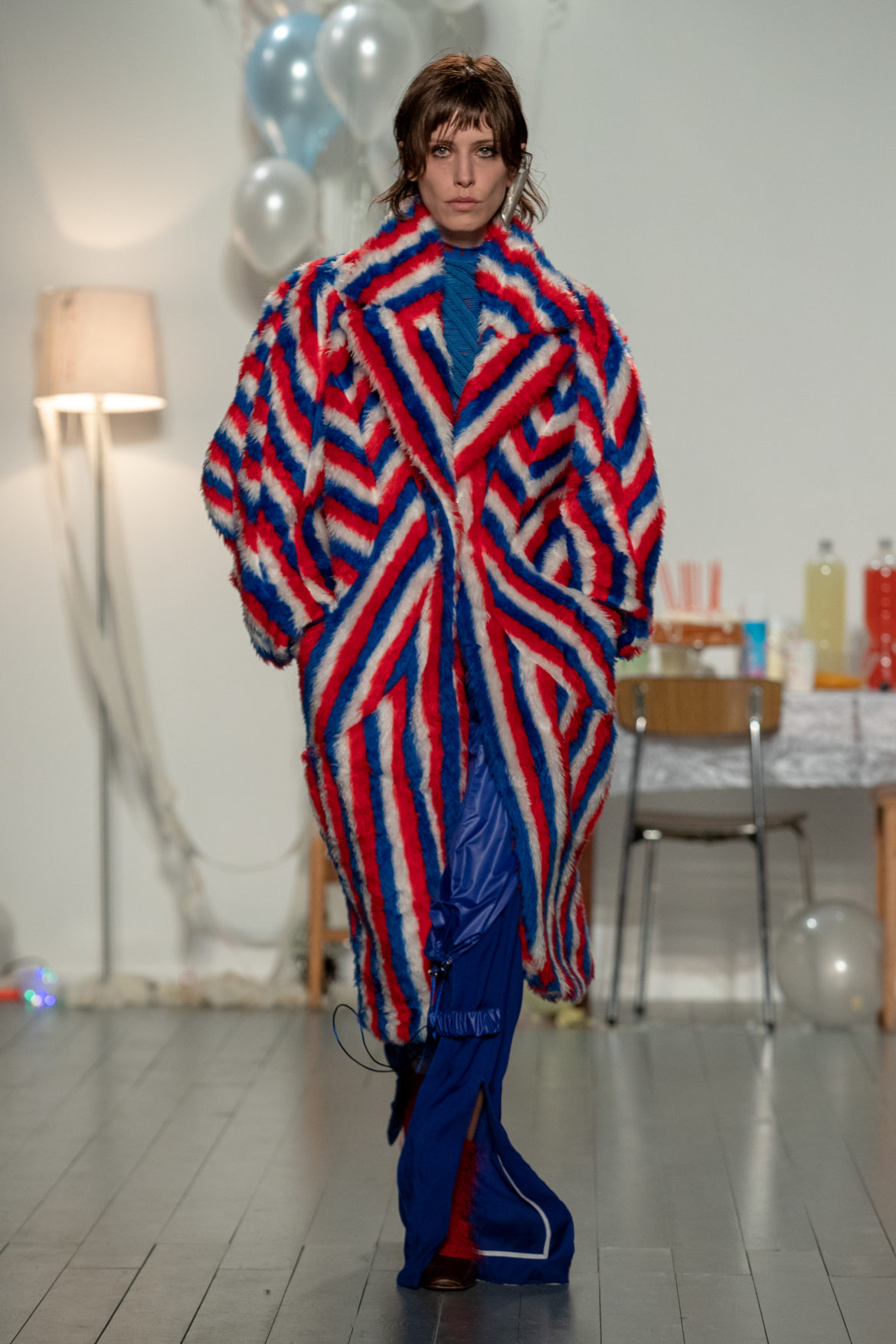 What is suitable for adults is considered. Malone speaks the language of bad taste, where words which would typically make the fashion-literate wince – ‘fuzzy’, ‘cuddly’ – are warmly embraced. Striped stoles rendered in ‘fun fur’ are made from repurposed dog beds, frock coats are fashioned from workwear twills typically found in school uniforms. Retro party plates inspired the prints seen across recycled, organic cotton jersey. Waste is limited – dresses are cut from precisely one metre of woven fabric and shaped through contouring by hand. Much of the colour palette takes cues from the tonal browns of ‘bad, mum lipstick’ and the optimistic brights of street party flags. Bra cups deliberately sit away from the body, artfully awkward.