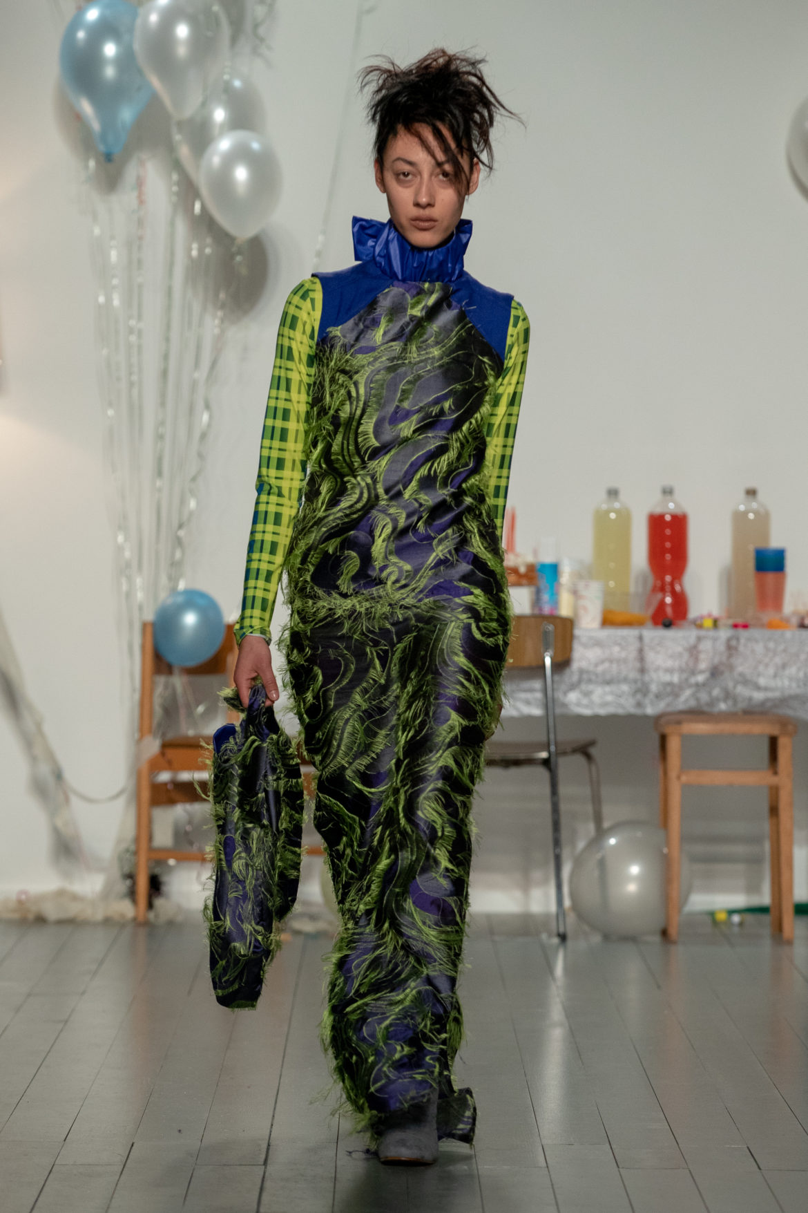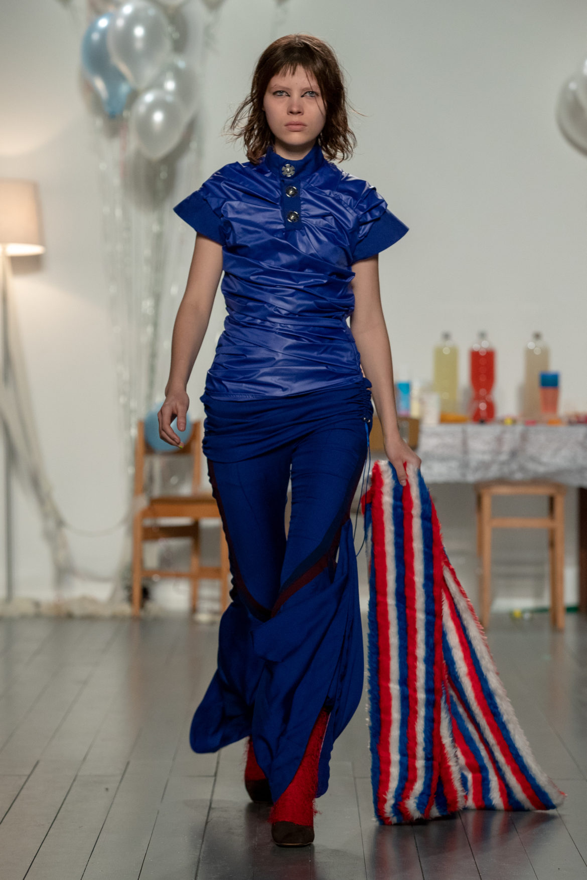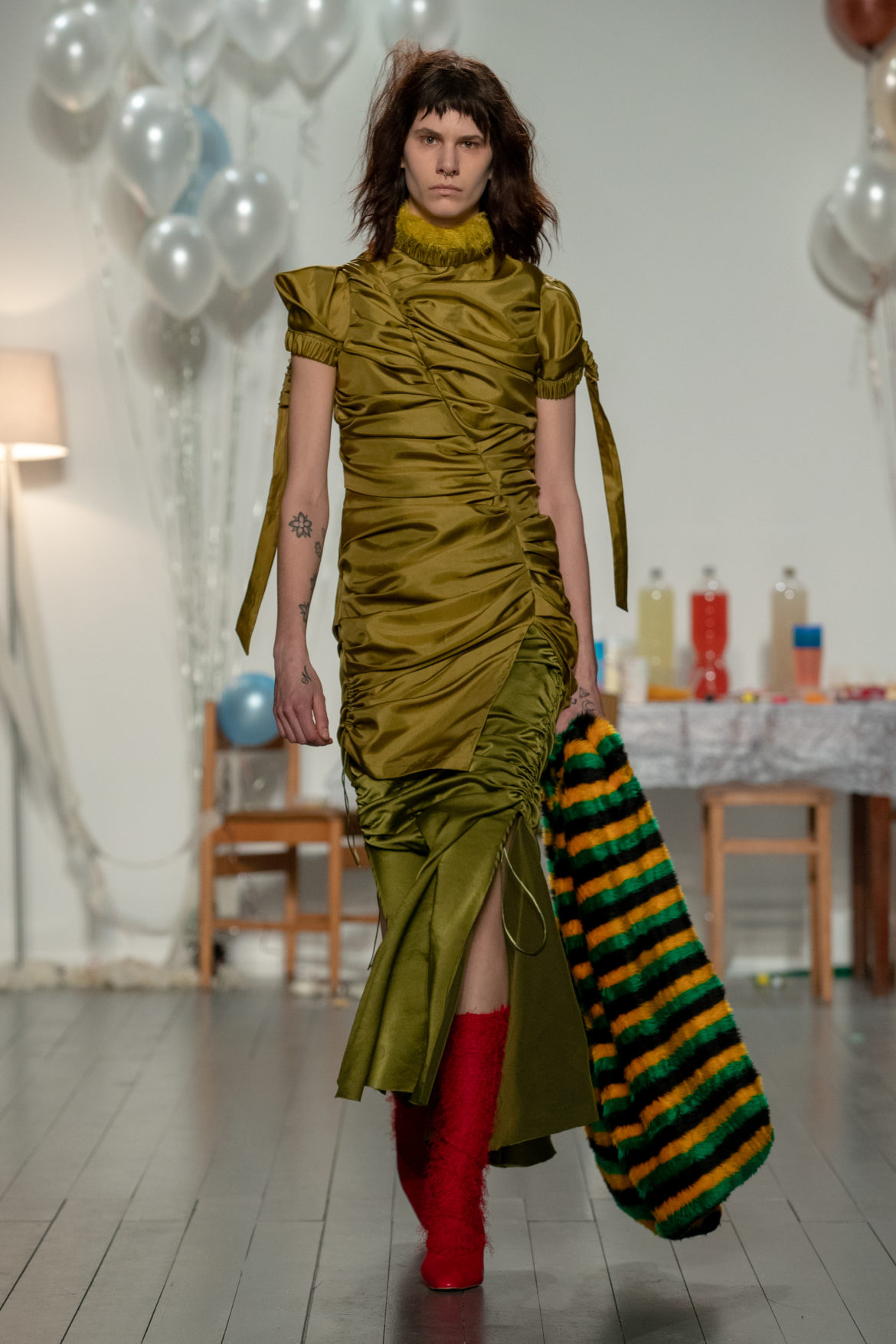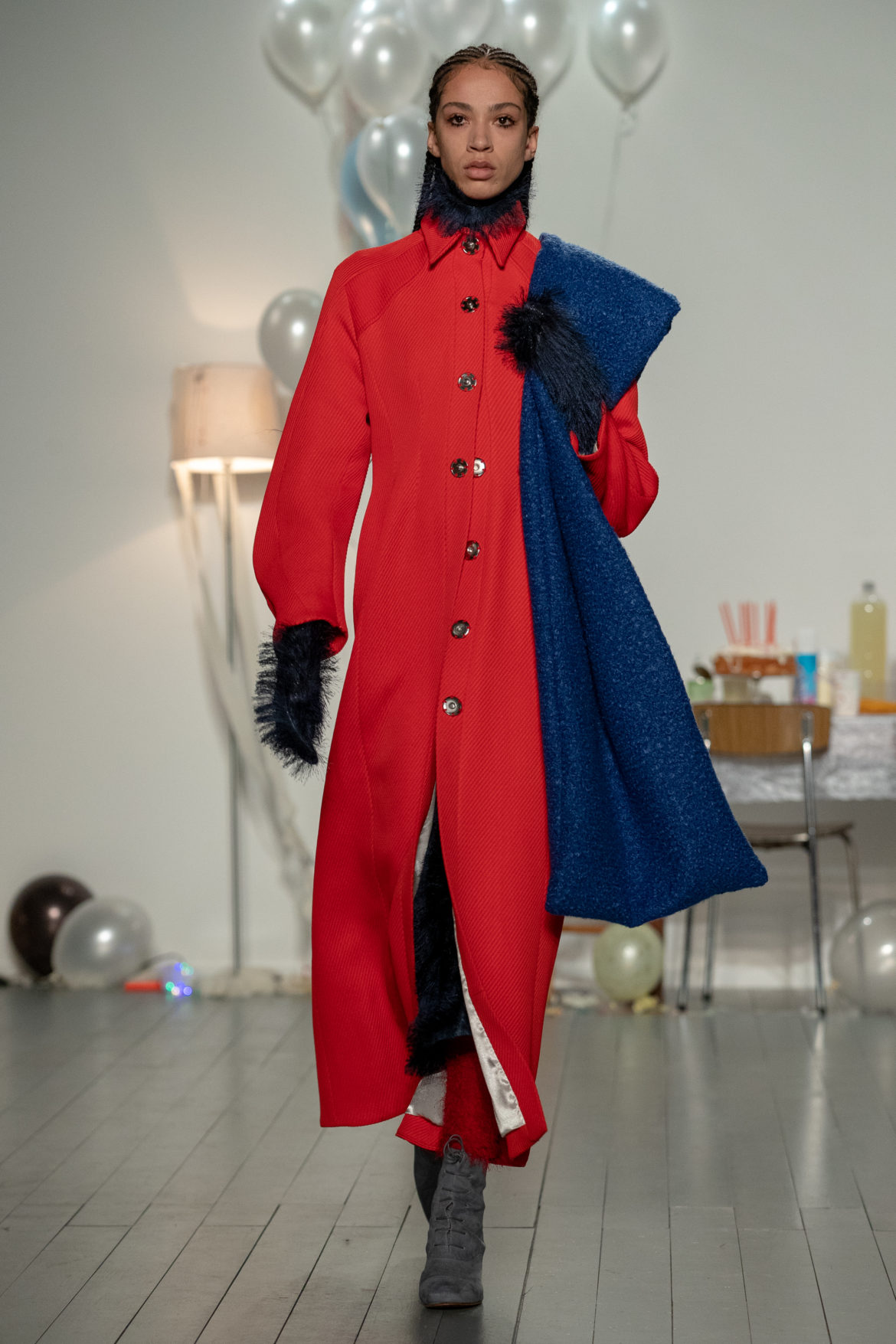 What is suitable for adults is considered. Malone speaks the language of bad taste, where words which would typically make the fashion-literate wince – ‘fuzzy’, ‘cuddly’ – are warmly embraced. Striped stoles rendered in ‘fun fur’ are made from repurposed dog beds, frock coats are fashioned from workwear twills typically found in school uniforms. Retro party plates inspired the prints seen across recycled, organic cotton jersey. Waste is limited – dresses are cut from precisely one metre of woven fabric and shaped through contouring by hand. Much of the colour palette takes cues from the tonal browns of ‘bad, mum lipstick’ and the optimistic brights of street party flags. Bra cups deliberately sit away from the body, artfully awkward.