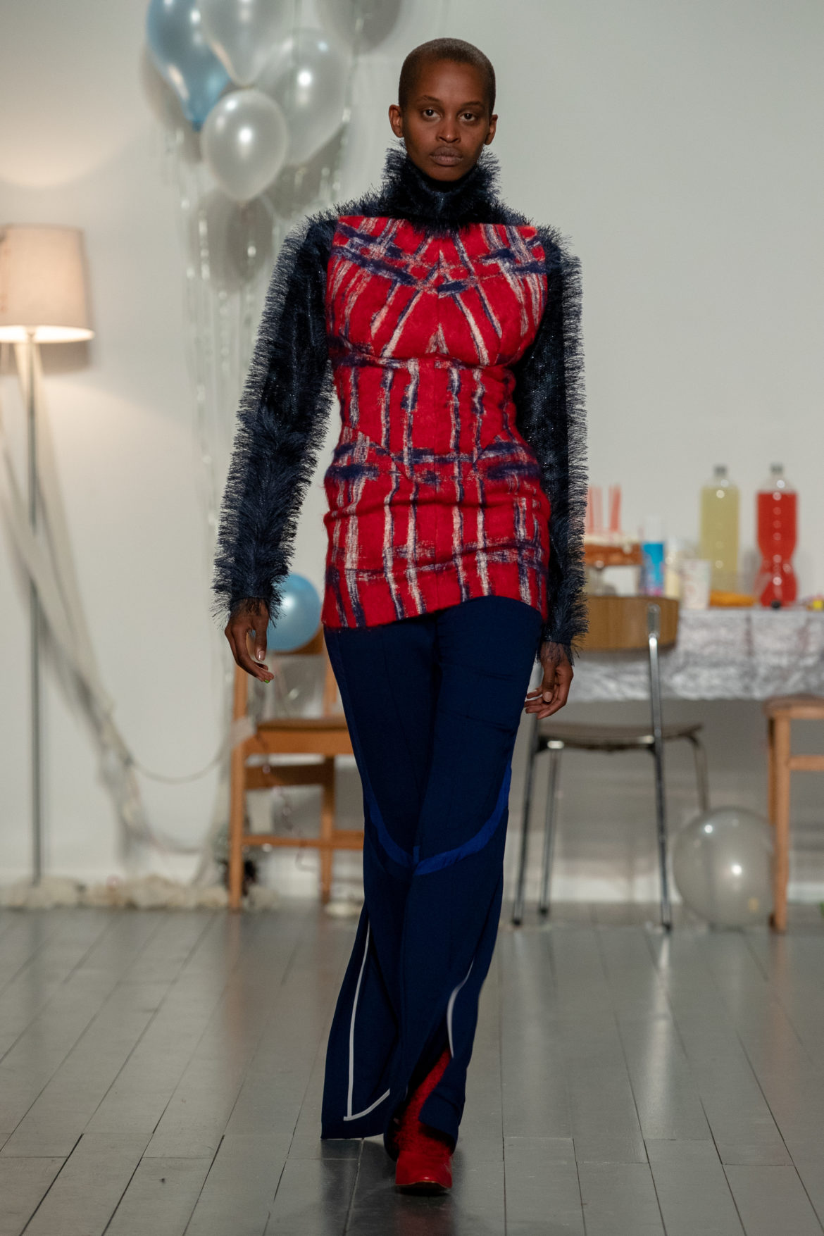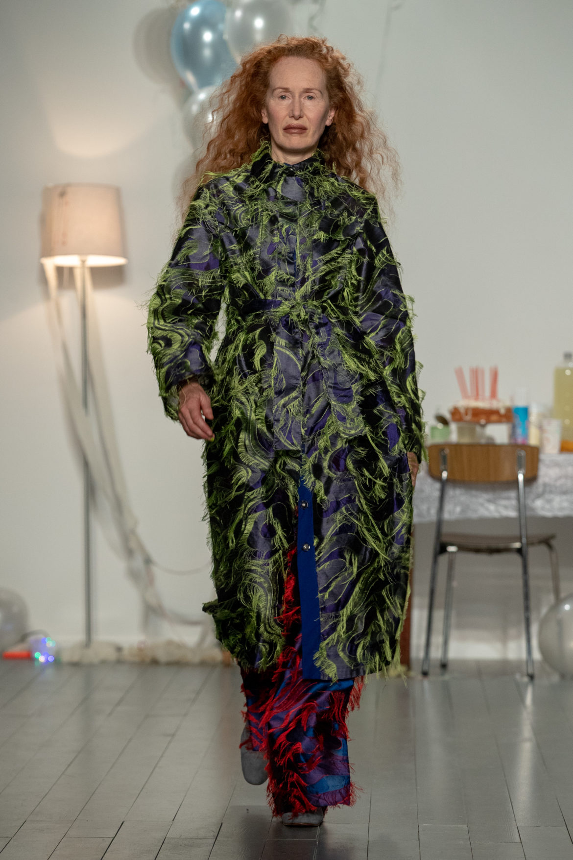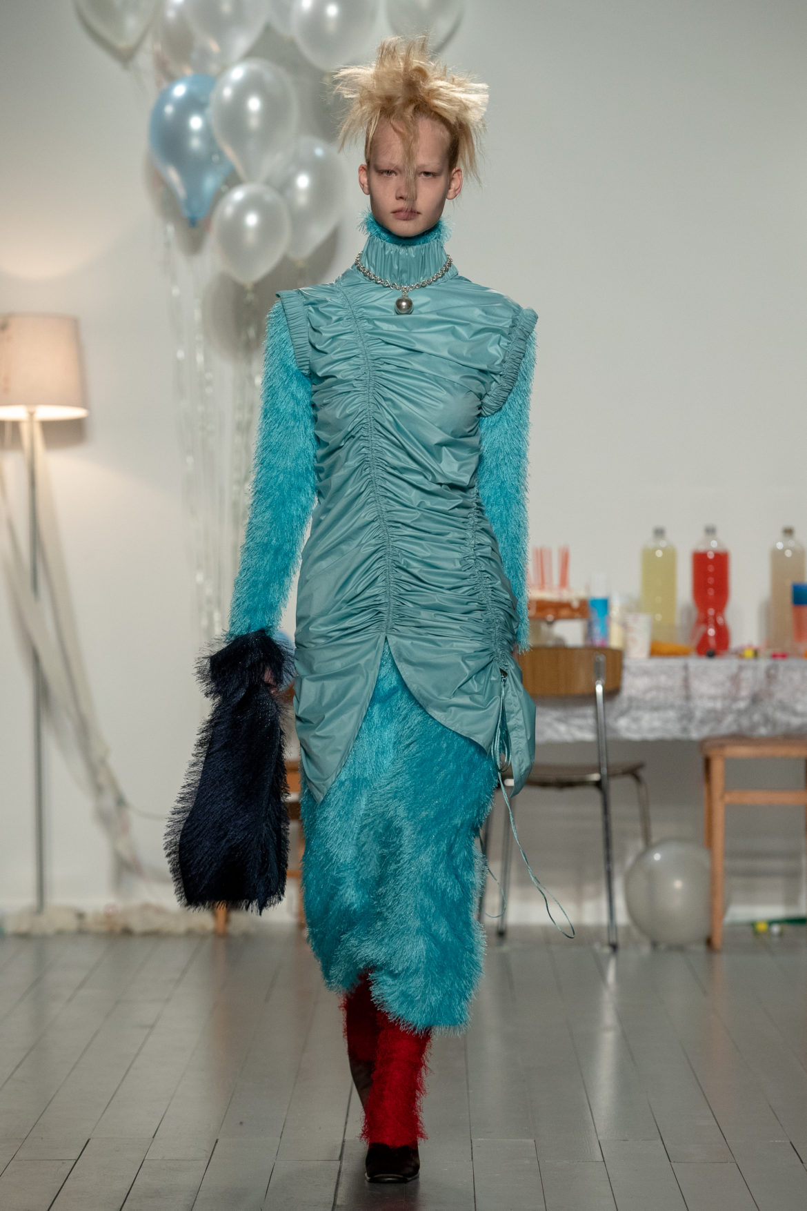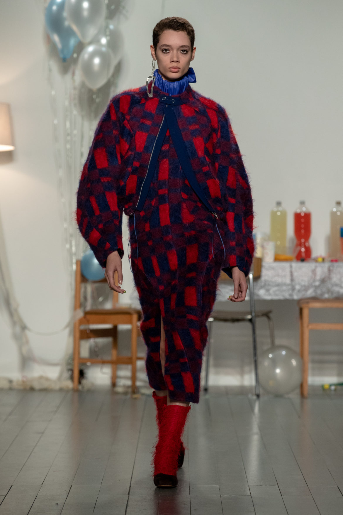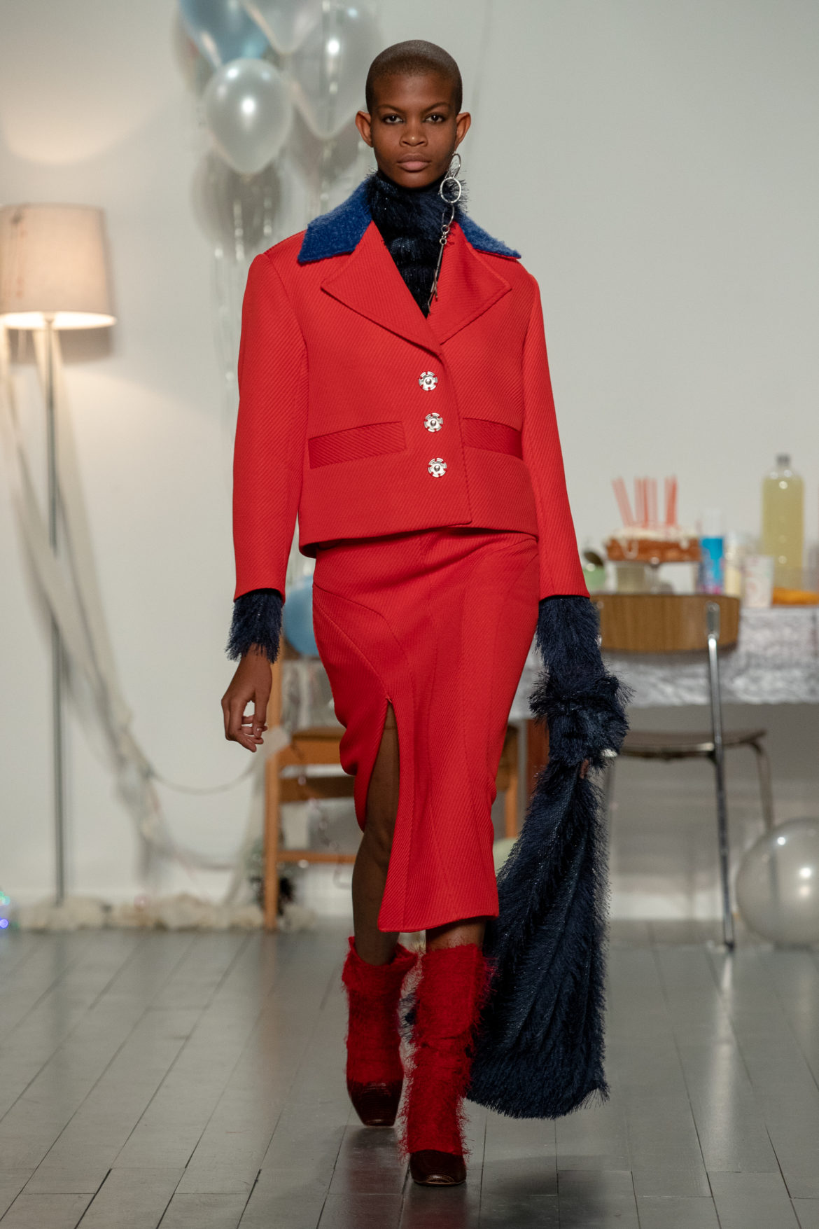 What is suitable for adults is considered. Malone speaks the language of bad taste, where words which would typically make the fashion-literate wince – ‘fuzzy’, ‘cuddly’ – are warmly embraced. Striped stoles rendered in ‘fun fur’ are made from repurposed dog beds, frock coats are fashioned from workwear twills typically found in school uniforms. Retro party plates inspired the prints seen across recycled, organic cotton jersey. Waste is limited – dresses are cut from precisely one metre of woven fabric and shaped through contouring by hand. Much of the colour palette takes cues from the tonal browns of ‘bad, mum lipstick’ and the optimistic brights of street party flags. Bra cups deliberately sit away from the body, artfully awkward.