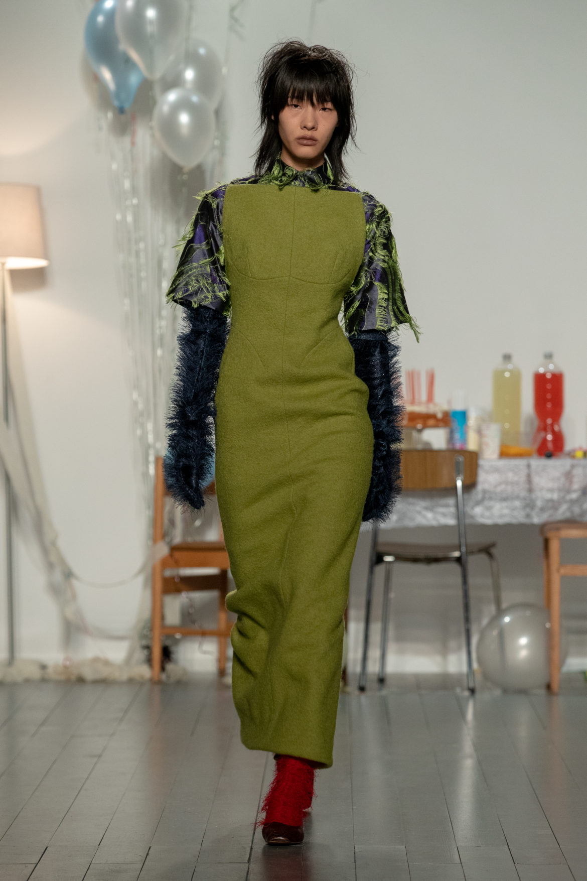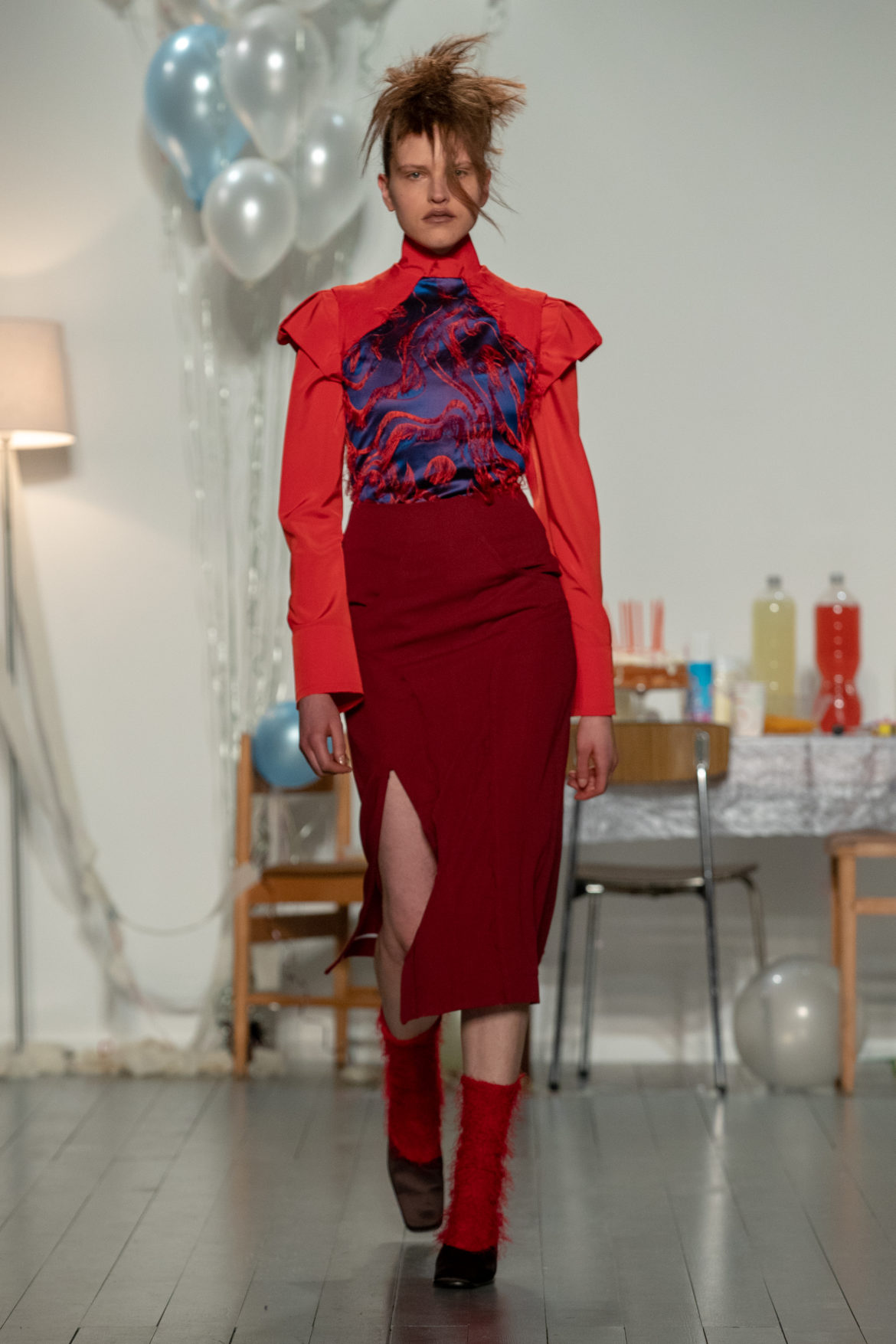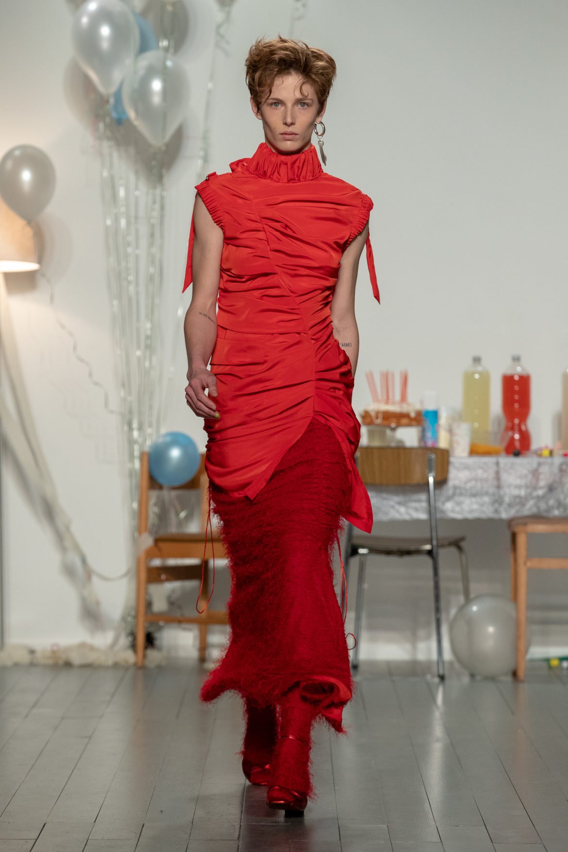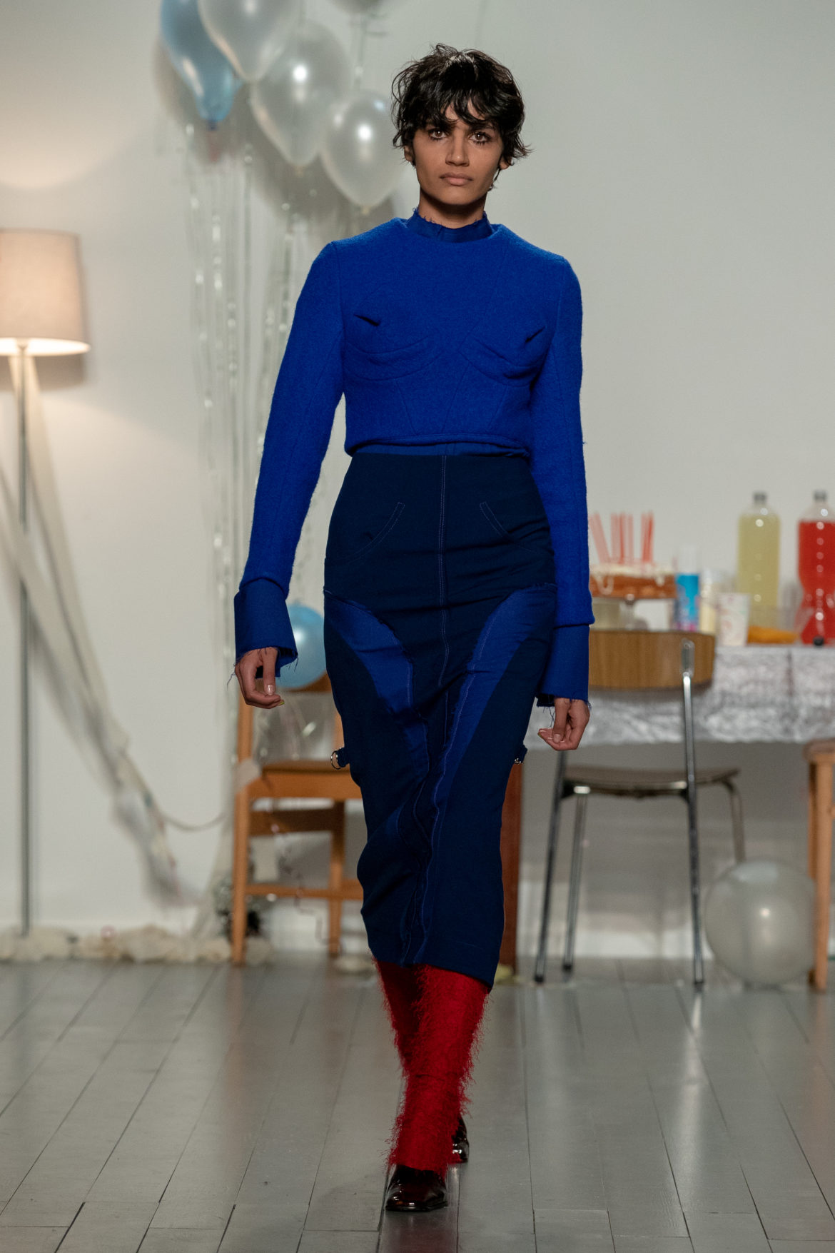 What is suitable for adults is considered. Malone speaks the language of bad taste, where words which would typically make the fashion-literate wince – ‘fuzzy’, ‘cuddly’ – are warmly embraced. Striped stoles rendered in ‘fun fur’ are made from repurposed dog beds, frock coats are fashioned from workwear twills typically found in school uniforms. Retro party plates inspired the prints seen across recycled, organic cotton jersey. Waste is limited – dresses are cut from precisely one metre of woven fabric and shaped through contouring by hand. Much of the colour palette takes cues from the tonal browns of ‘bad, mum lipstick’ and the optimistic brights of street party flags. Bra cups deliberately sit away from the body, artfully awkward.