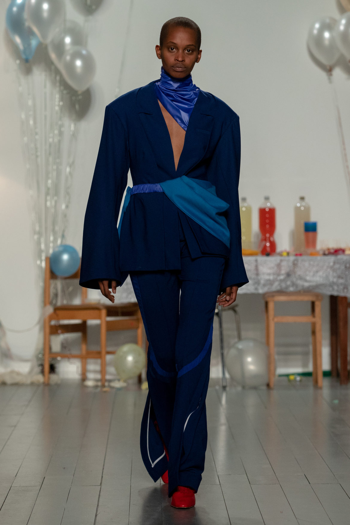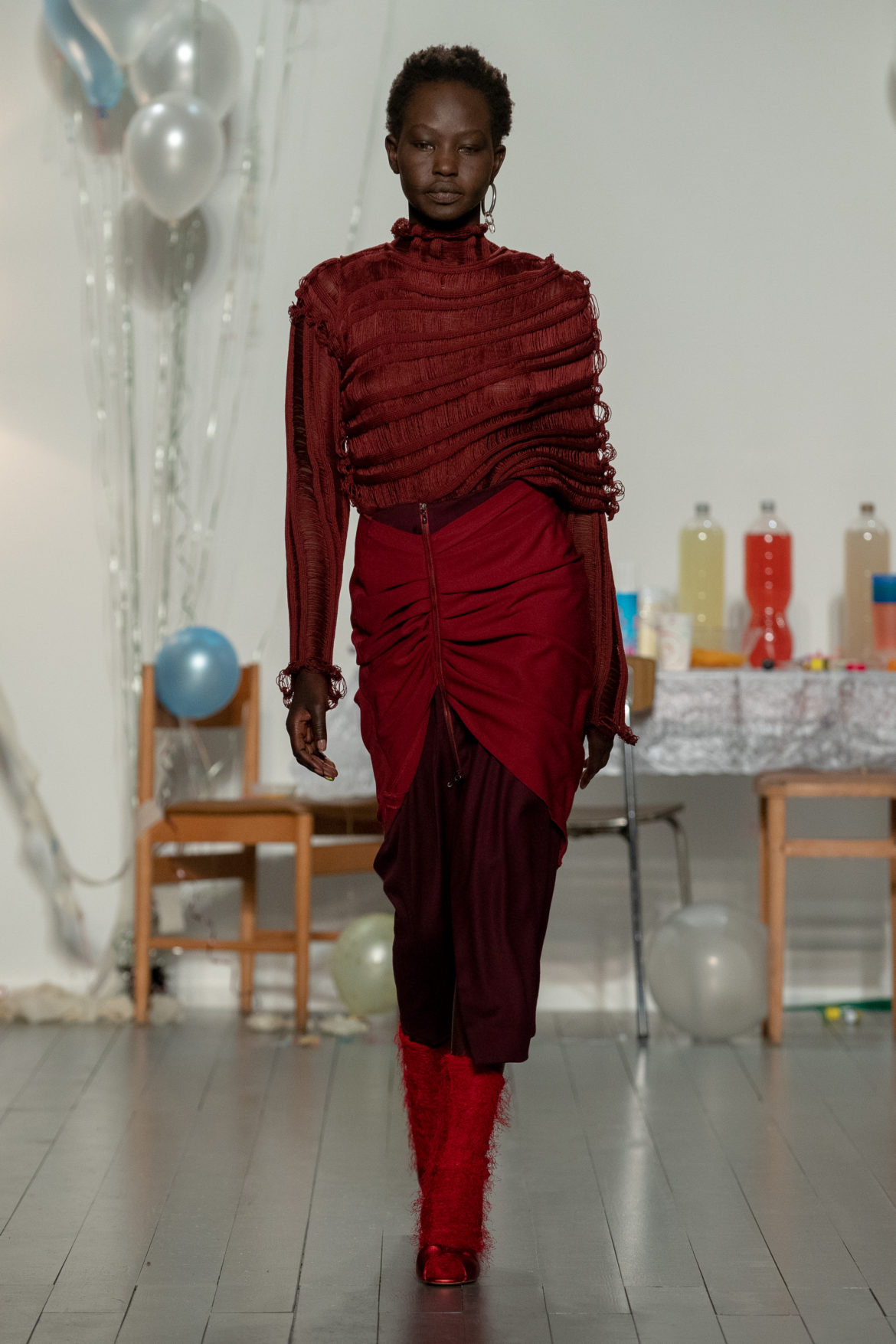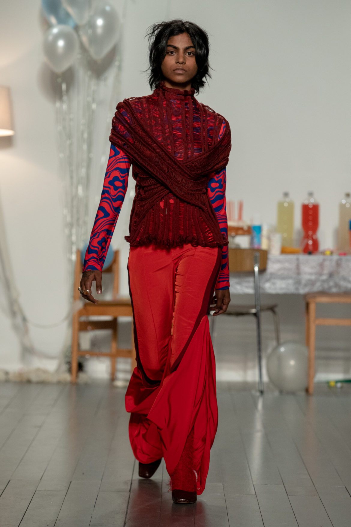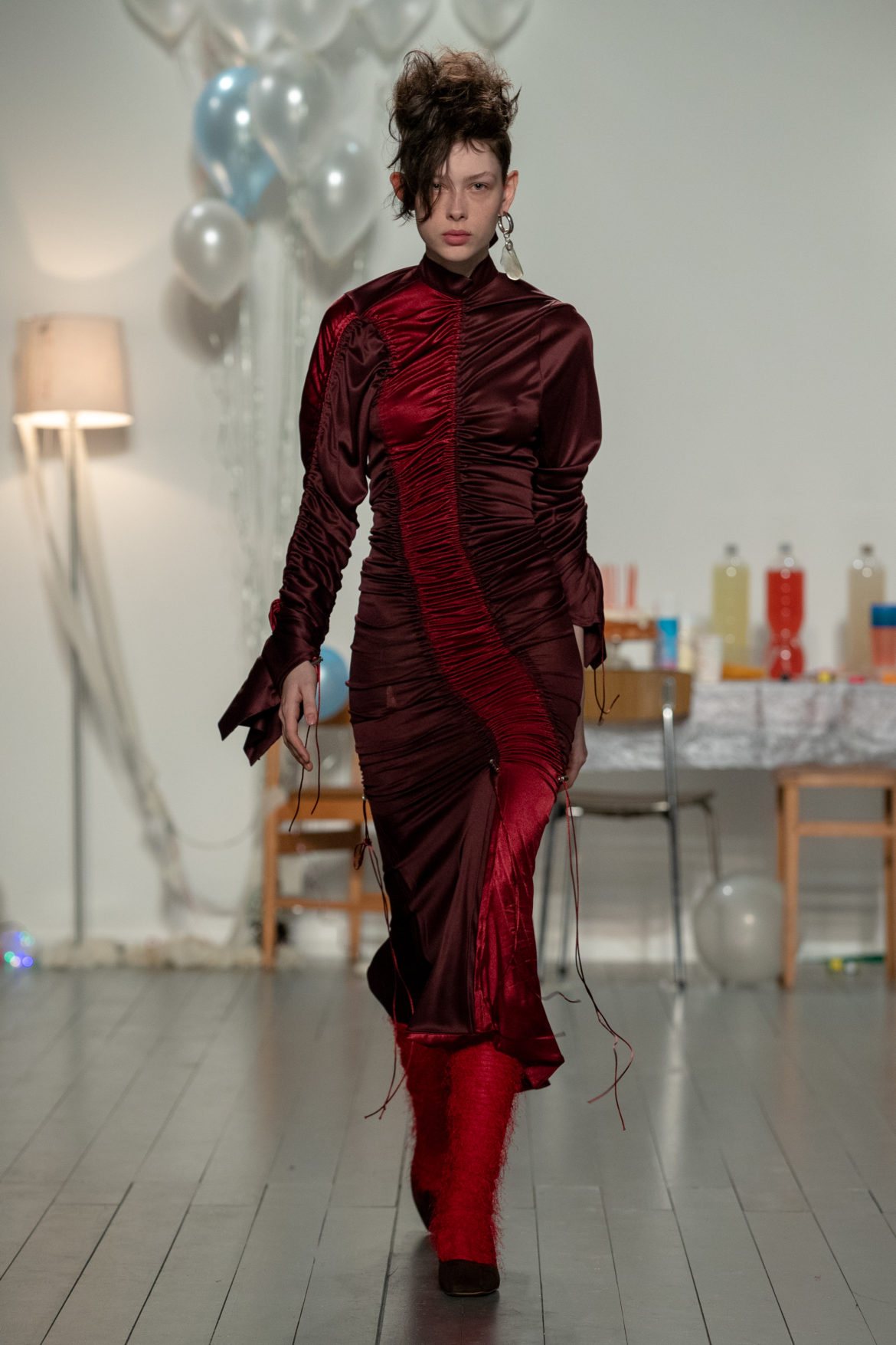 What is suitable for adults is considered. Malone speaks the language of bad taste, where words which would typically make the fashion-literate wince – ‘fuzzy’, ‘cuddly’ – are warmly embraced. Striped stoles rendered in ‘fun fur’ are made from repurposed dog beds, frock coats are fashioned from workwear twills typically found in school uniforms. Retro party plates inspired the prints seen across recycled, organic cotton jersey. Waste is limited – dresses are cut from precisely one metre of woven fabric and shaped through contouring by hand. Much of the colour palette takes cues from the tonal browns of ‘bad, mum lipstick’ and the optimistic brights of street party flags. Bra cups deliberately sit away from the body, artfully awkward.