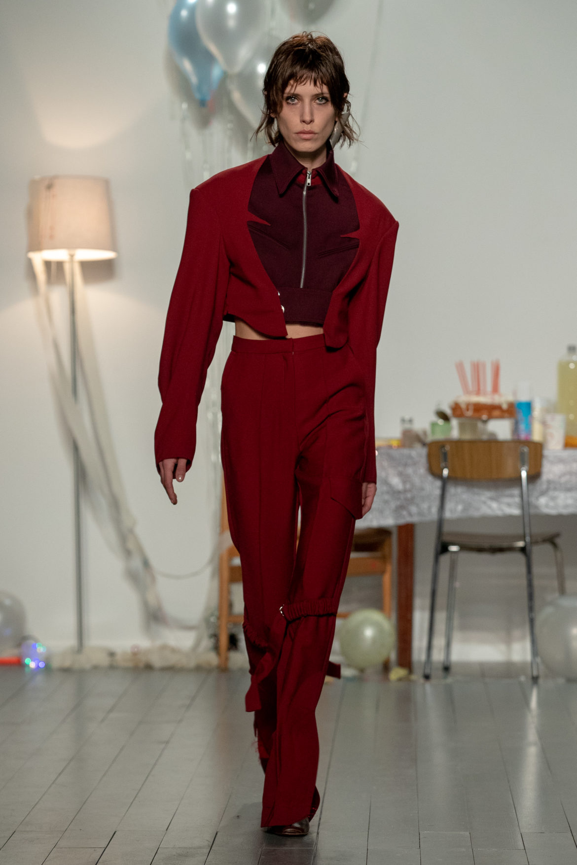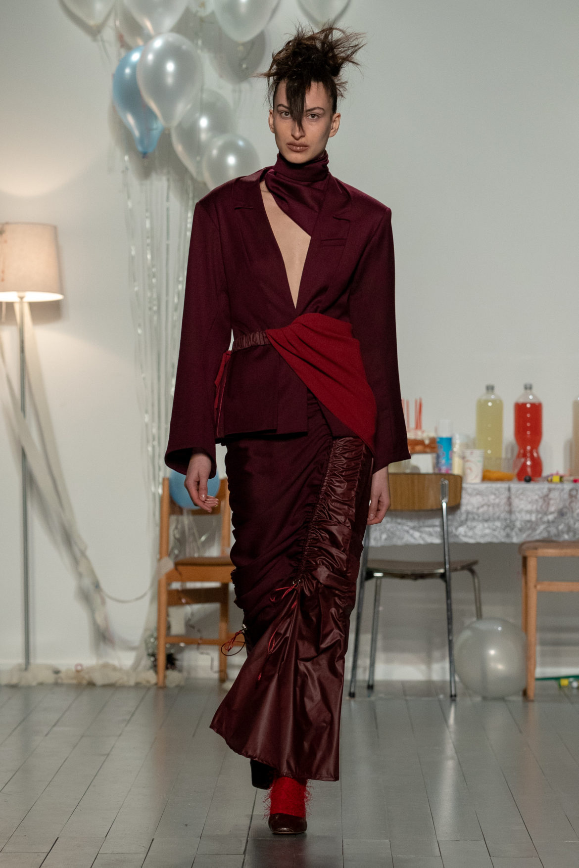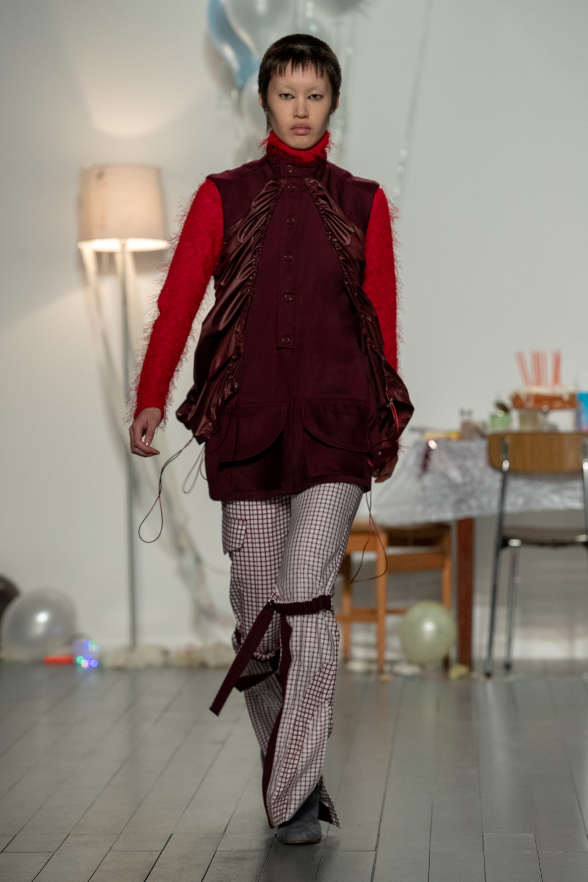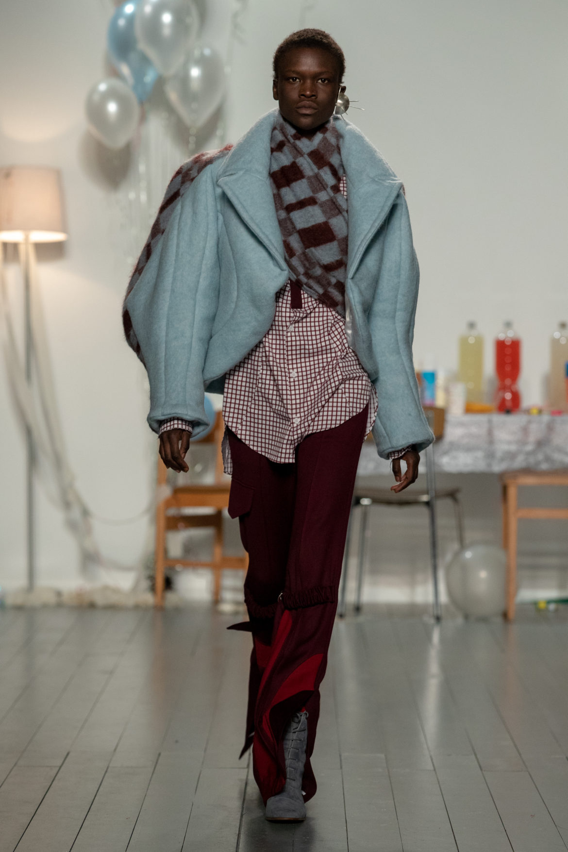 There is a duality and a forced politeness to this collection, wherein Malone takes on the role of both child and parent, each in turn quizzically considering the other. Central to the designer’s practise is the creation of a set within which to stage his cast. This morning’s show takes us to an almost-uncomfortable, nearly-bleak living room in which a family birthday party sees ‘dressing up’ interpreted across generations.