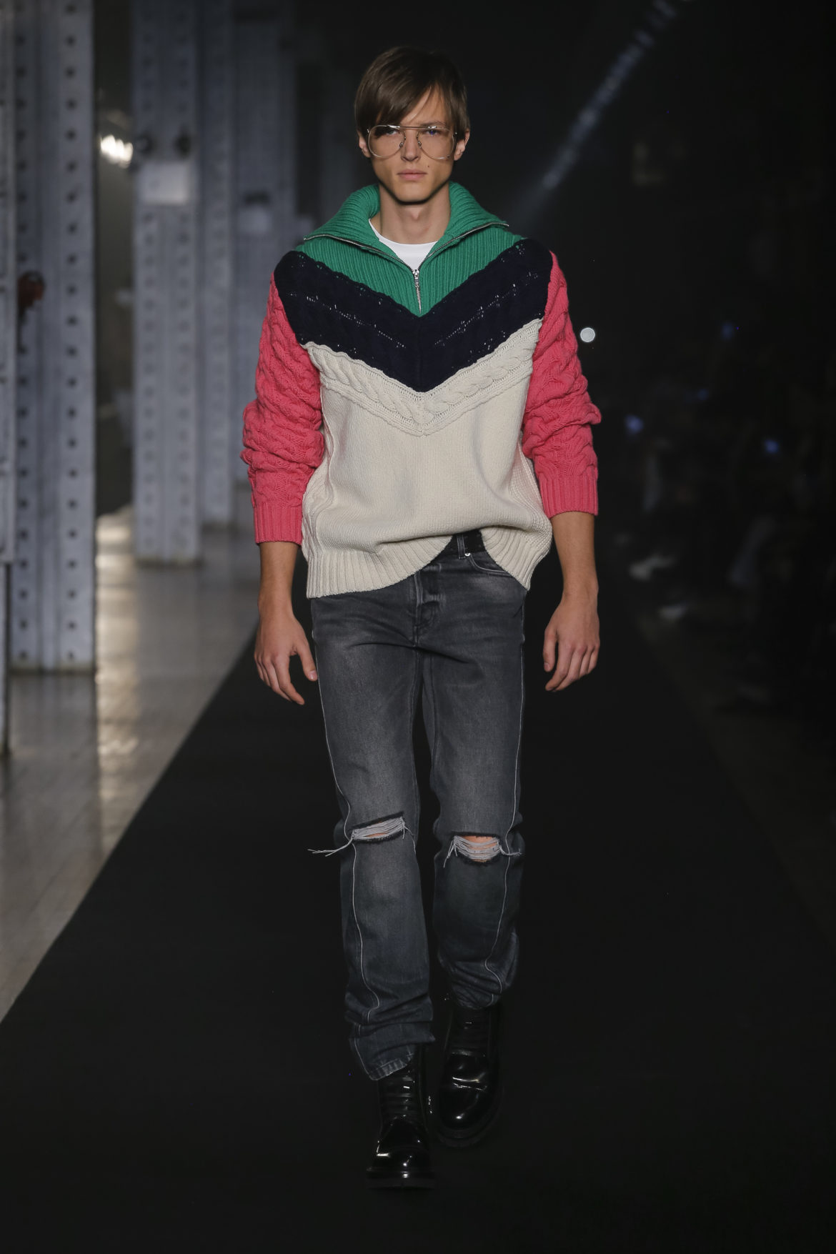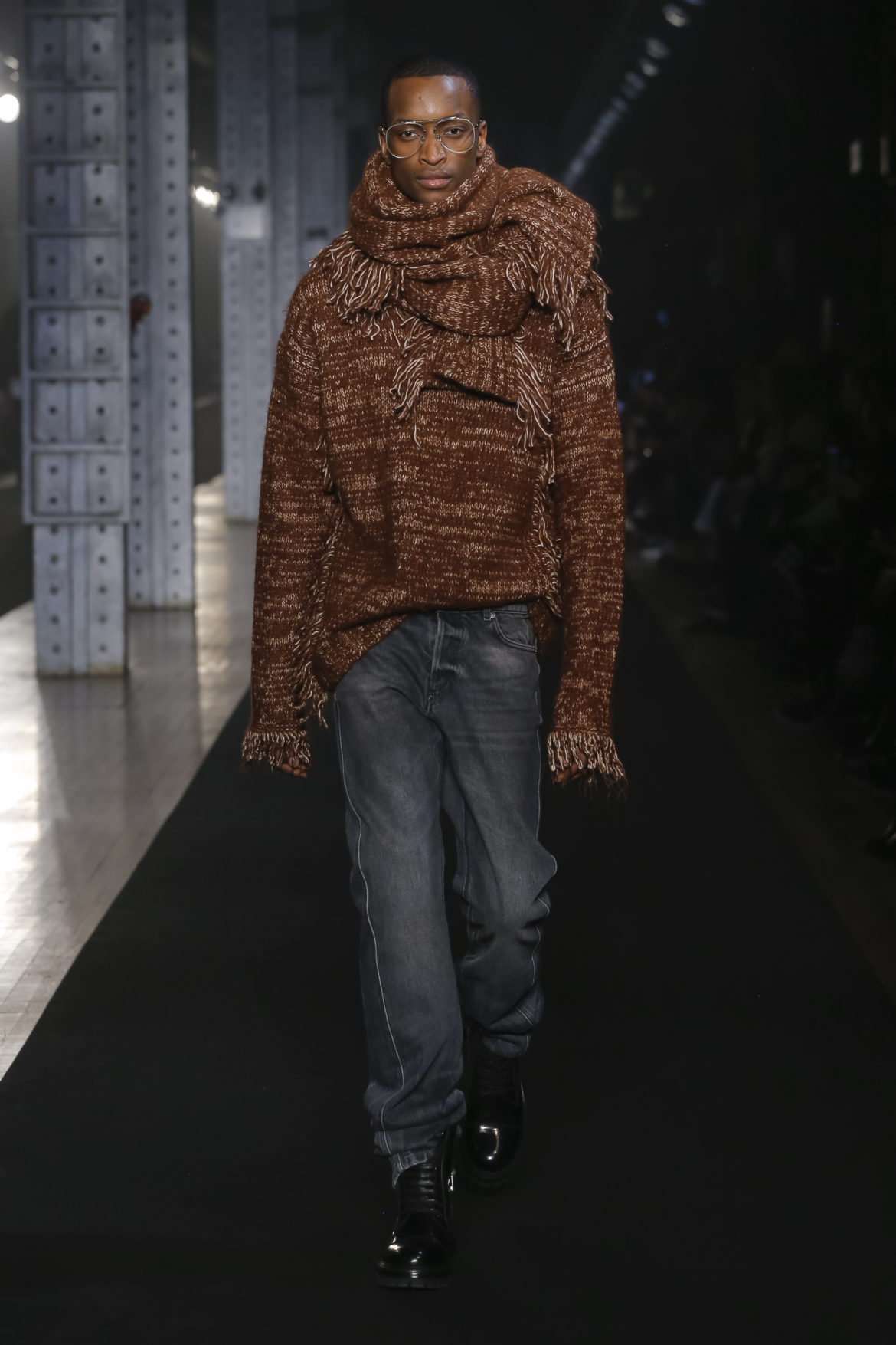 “A chic-destroyed sweater reveals meticulous ripped parts unveiling lurex details underneath.”