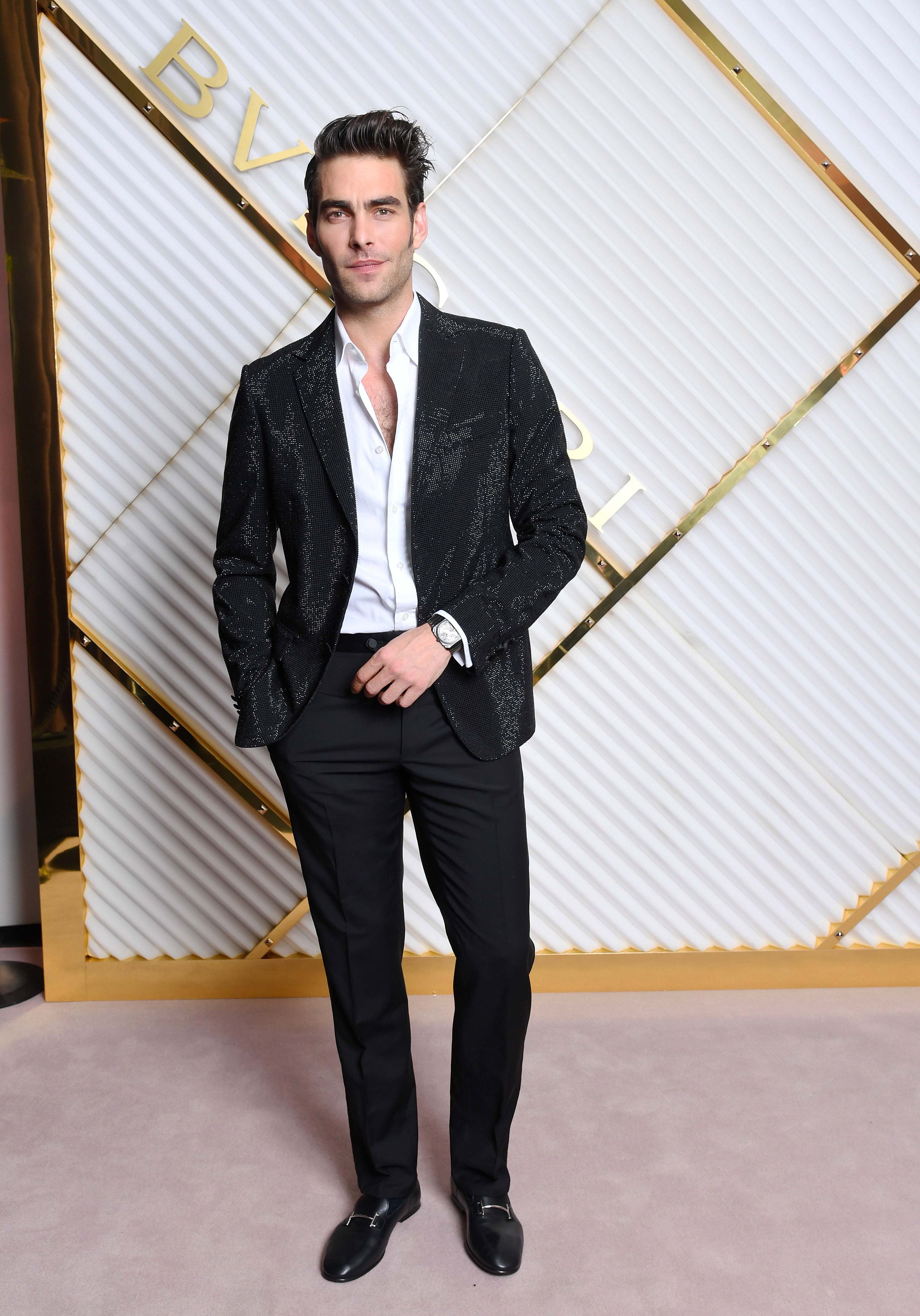 Jon Kortajarena wears a black crystallized evening jacket with a white shirt and black pants from the Roberto Cavalli Fall/Winter 2018-19 men’s collection, while attending the BVLGARI dinner party during Milan Fashion Week.