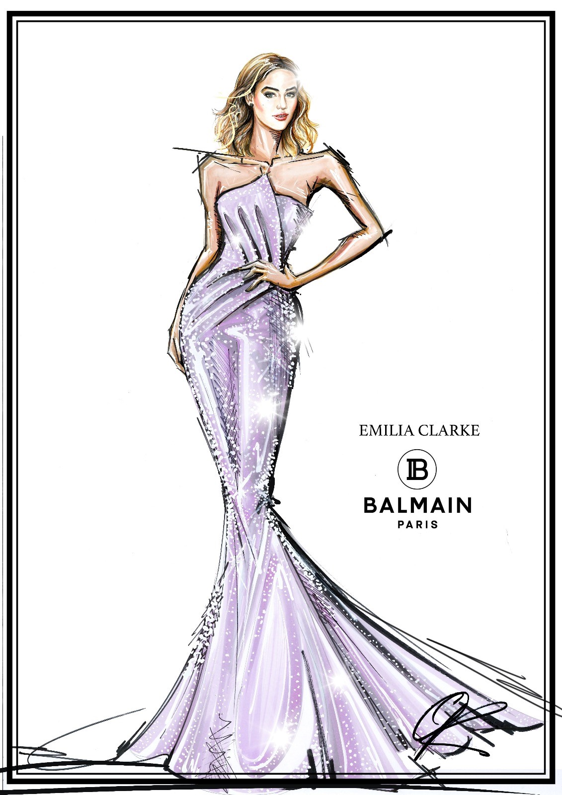 (photo credit Marion Leflour) Emmy-nominated actress Emilia Clarke wore a bespoke Balmain dress embellished with Swarovski crystals on the Oscars red carpet this evening. The glamorous gown featured 300,000 Swarovski stones in Light Amethyst. Clarke is best known for playing lead character Daenerys Targaryen in the critically-acclaimed television phenomenon Game of Thrones, and for her work in the romantic-drama film Me Before You.