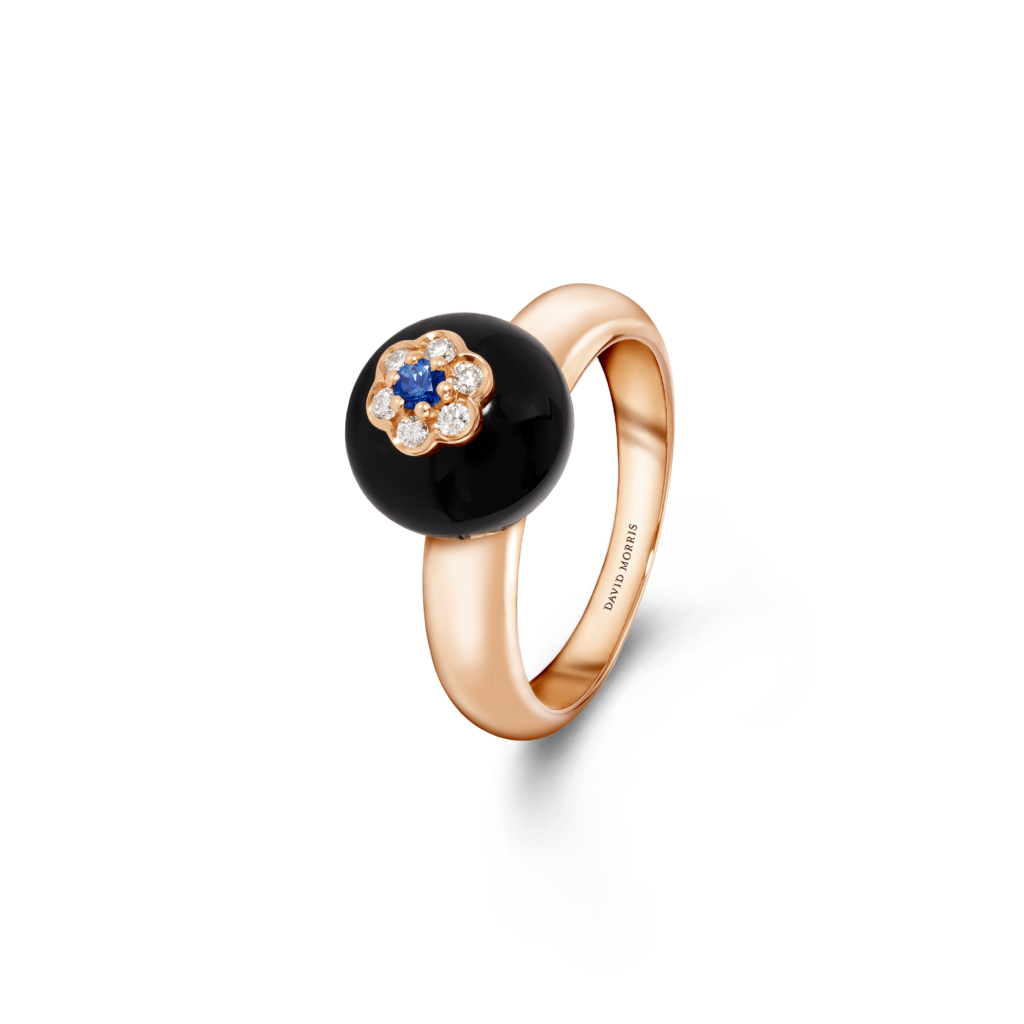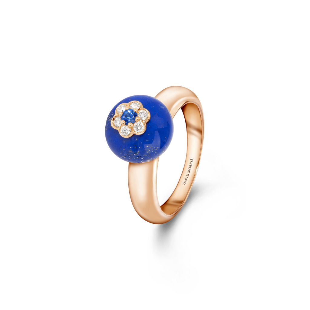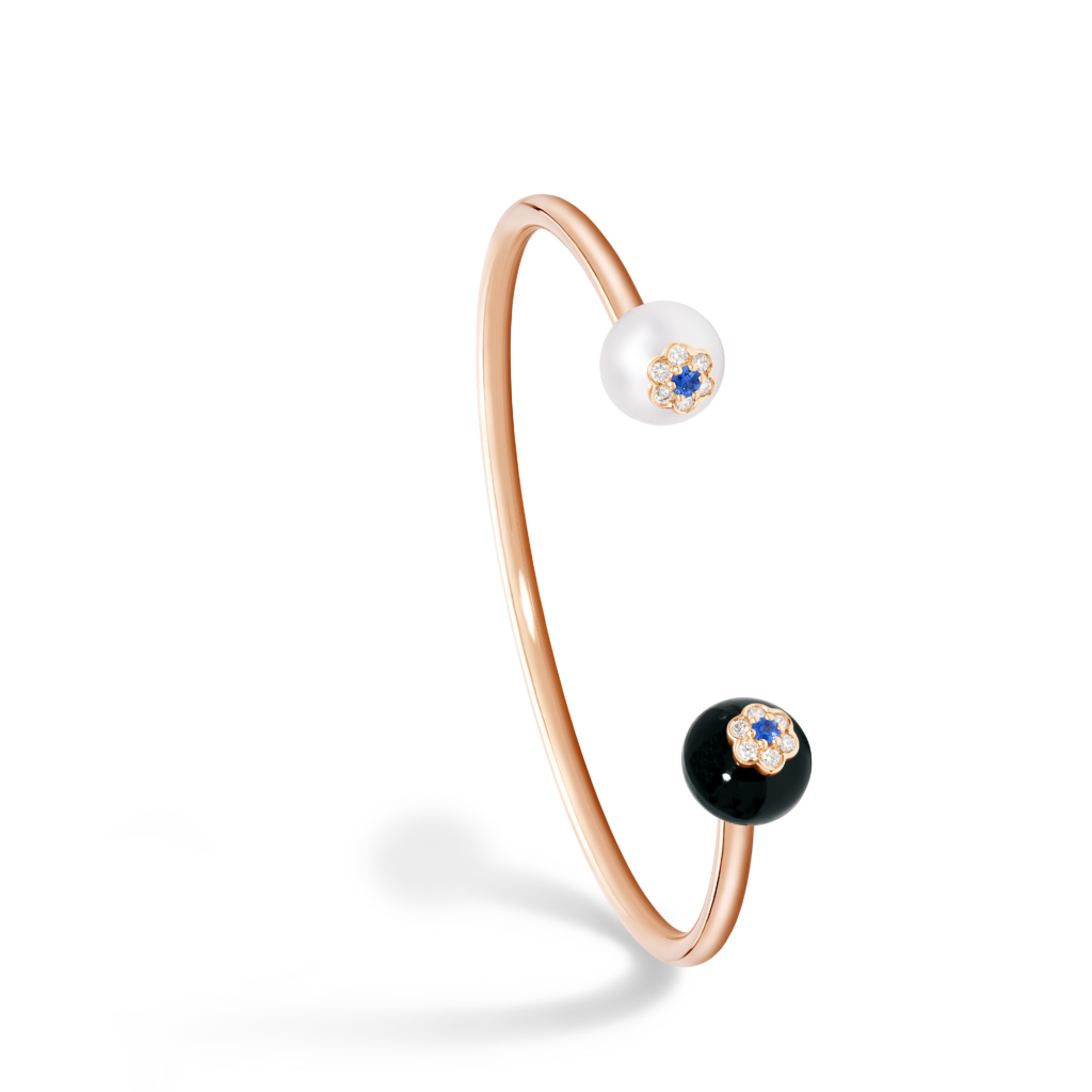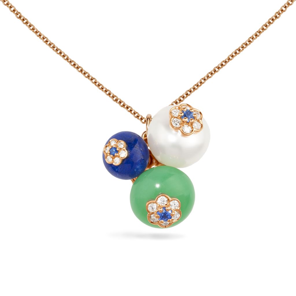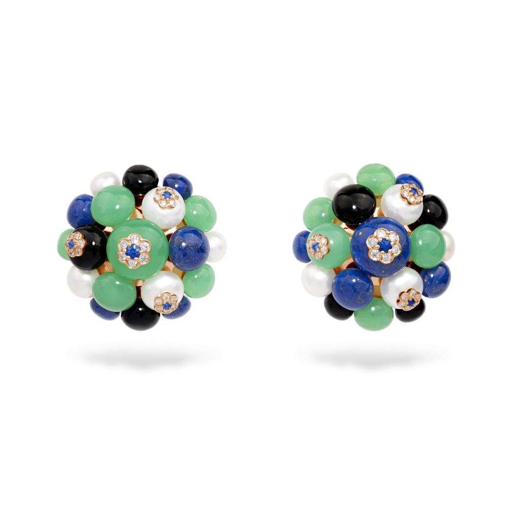 Cette collection Berry se compose de bagues, de boucles d’oreilles, de pendentifs et de bracelets montés sur or rose et déclinés en chrysoprase, lapis lazuli, onyx, diamants, perle akoya et saphirs bleus