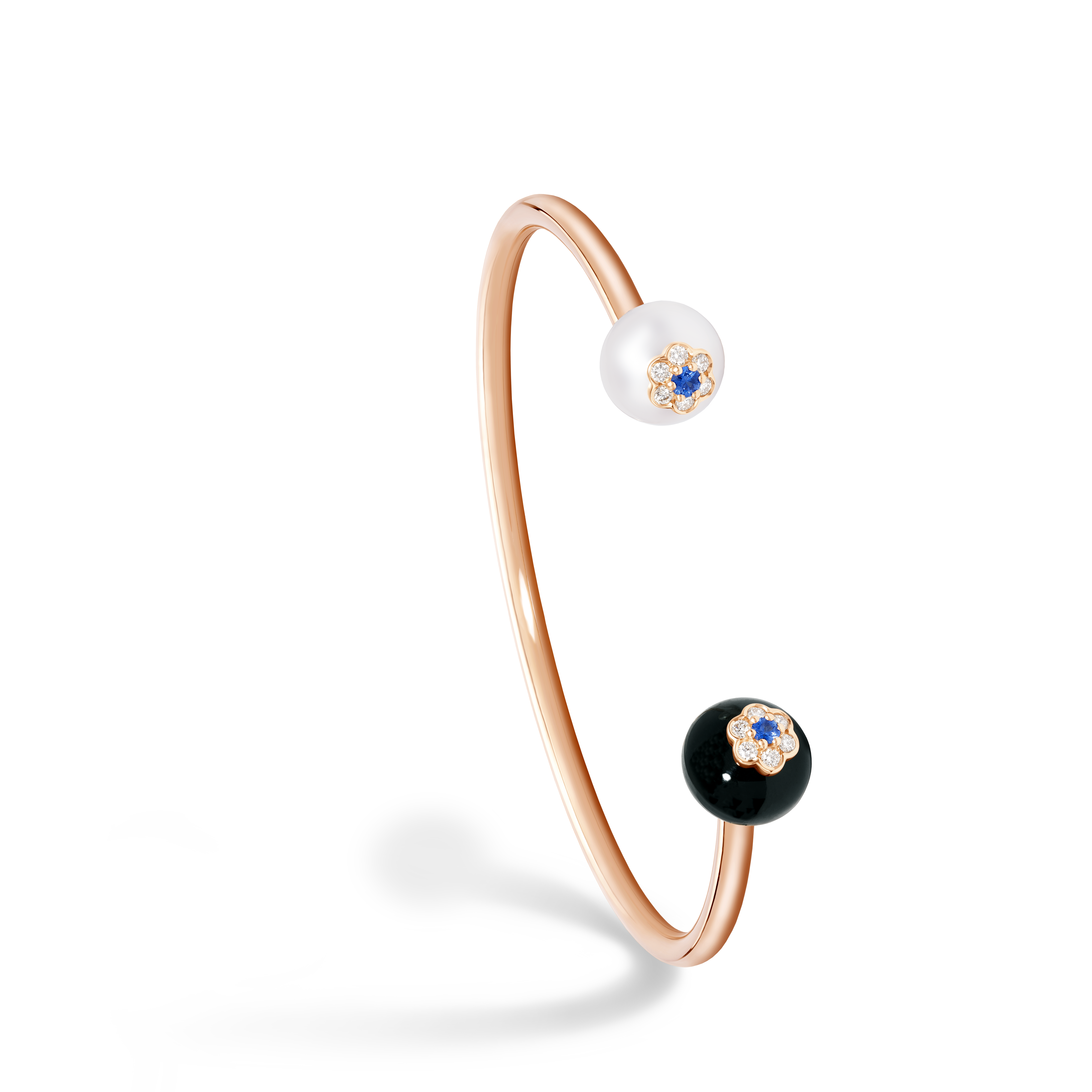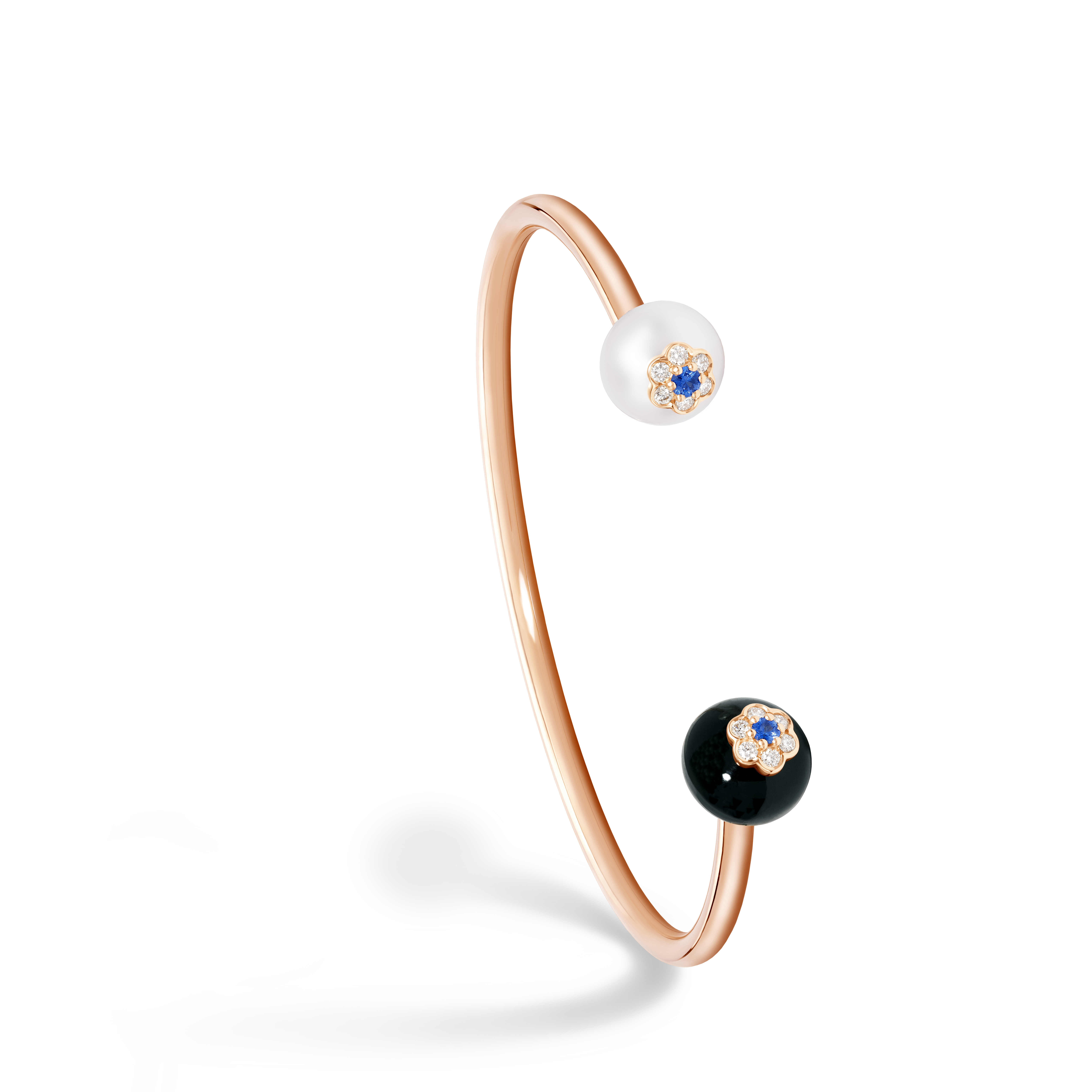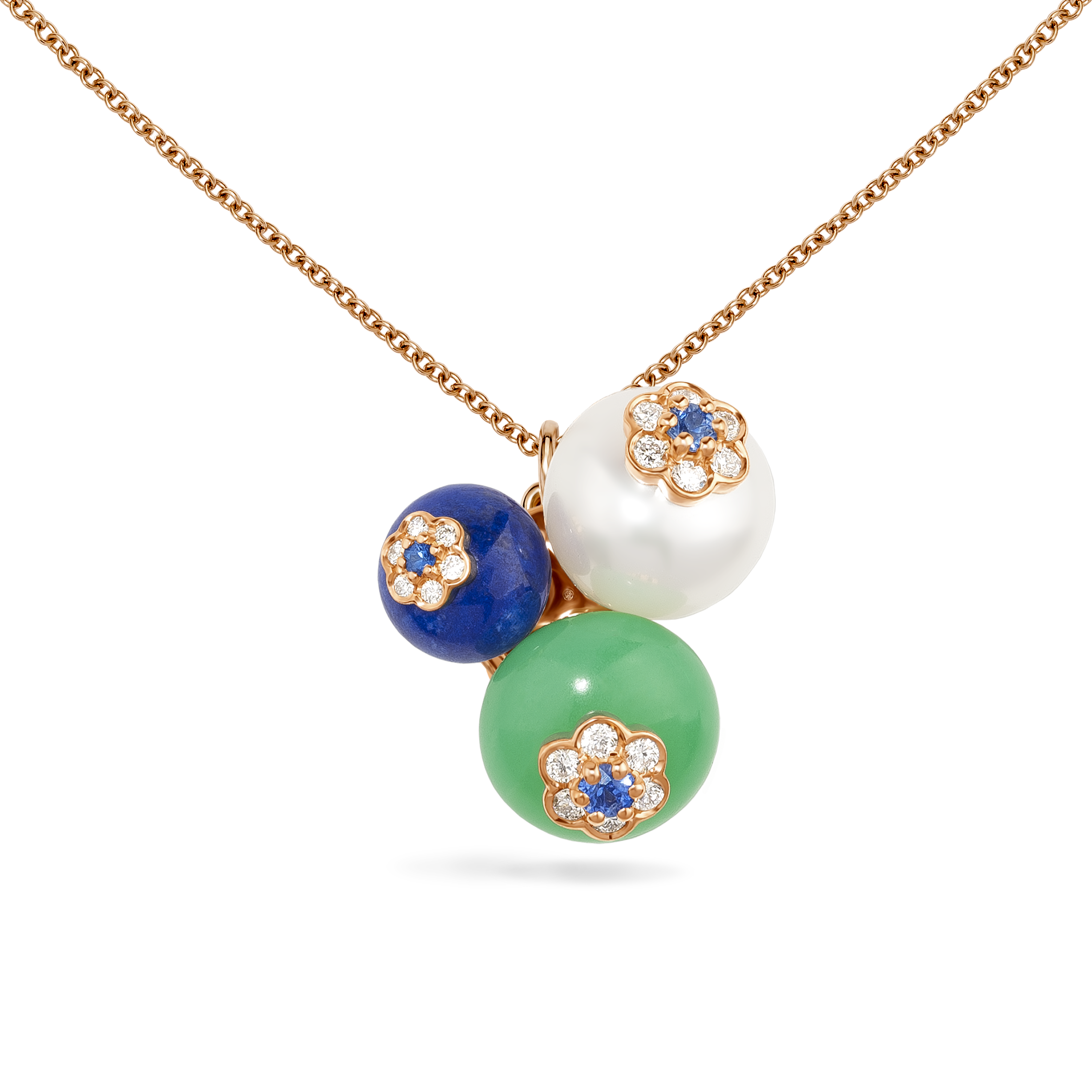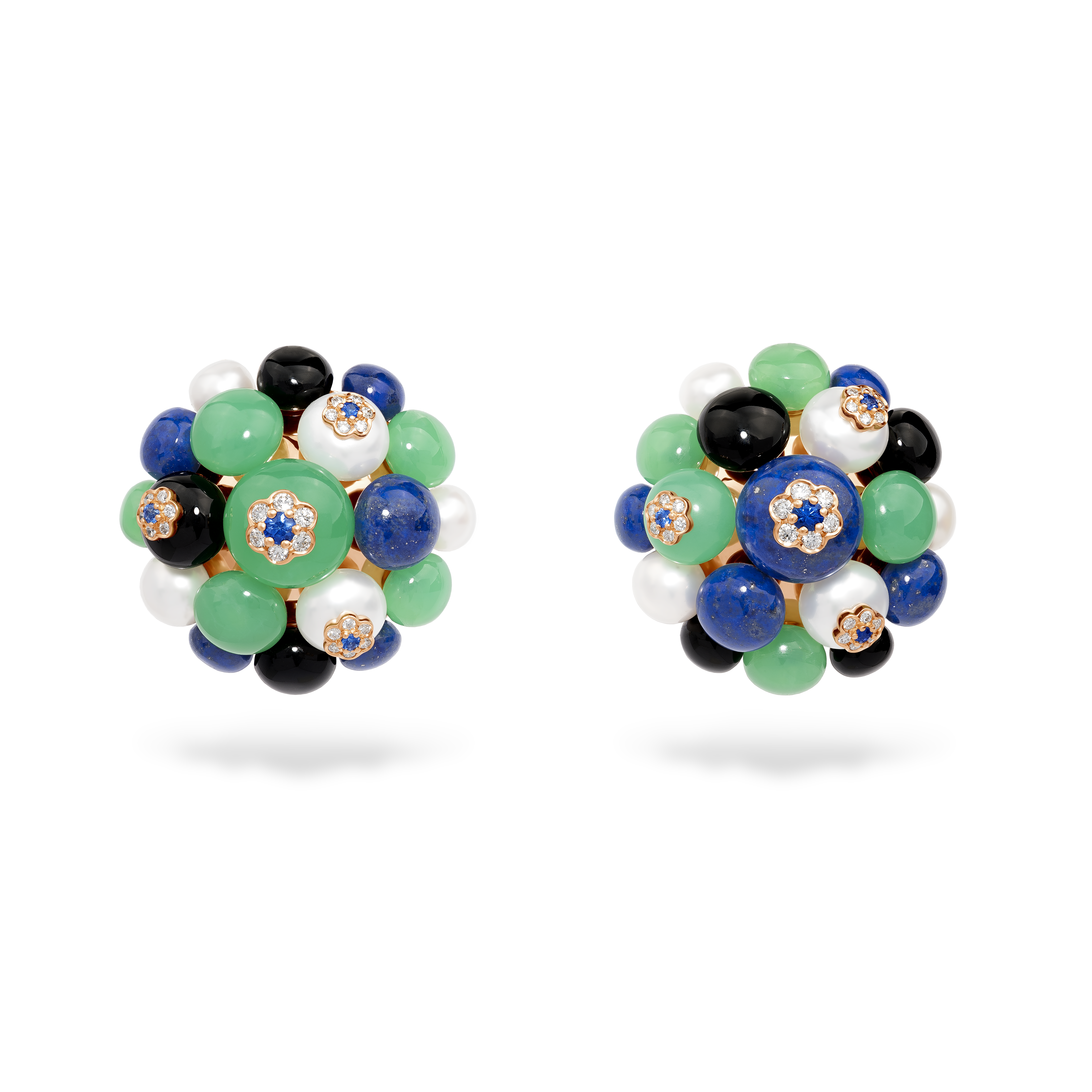 Cette collection Berry se compose de bagues, de boucles d’oreilles, de pendentifs et de bracelets montés sur or rose et déclinés en chrysoprase, lapis lazuli, onyx, diamants, perle akoya et saphirs bleus