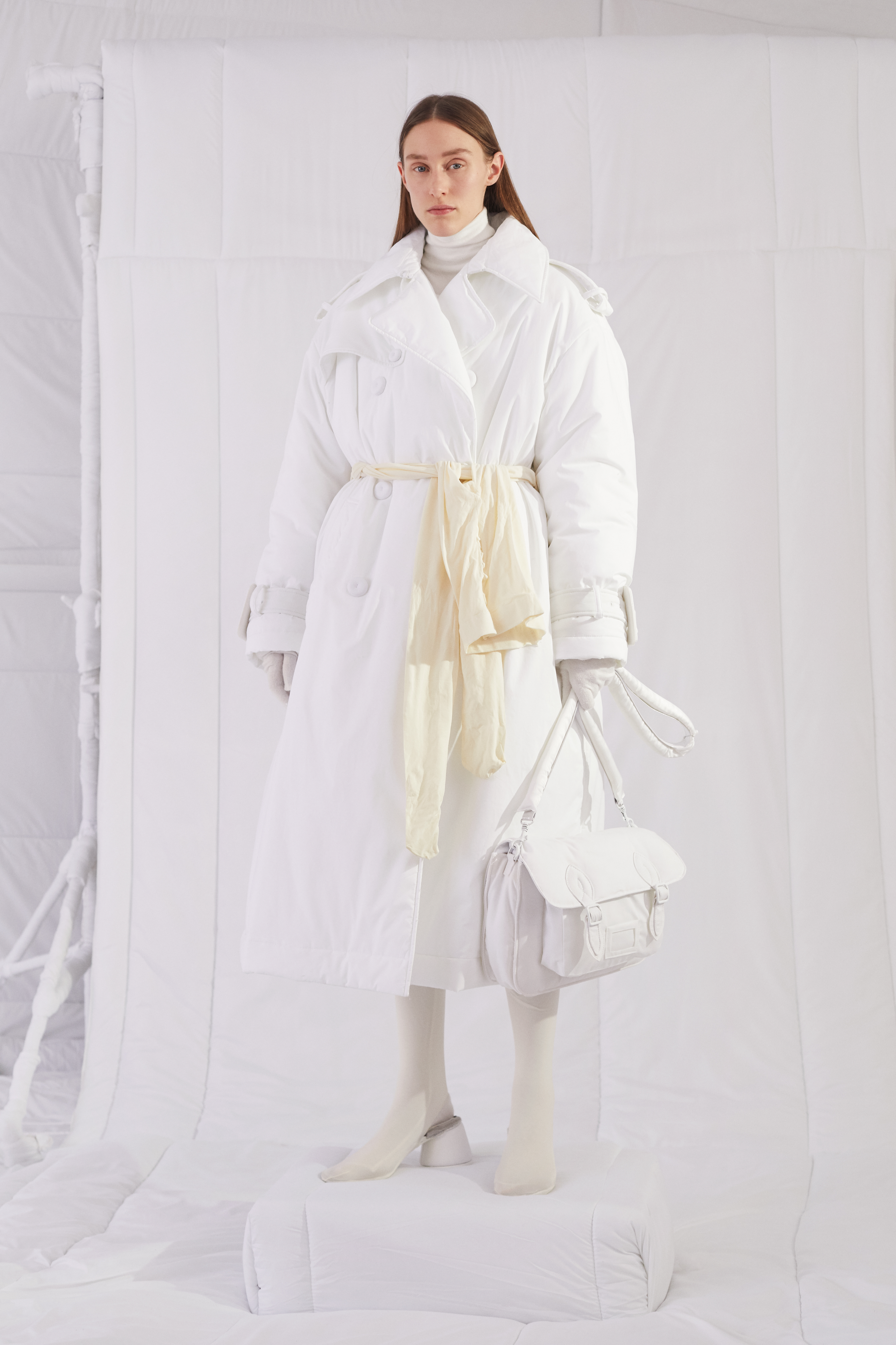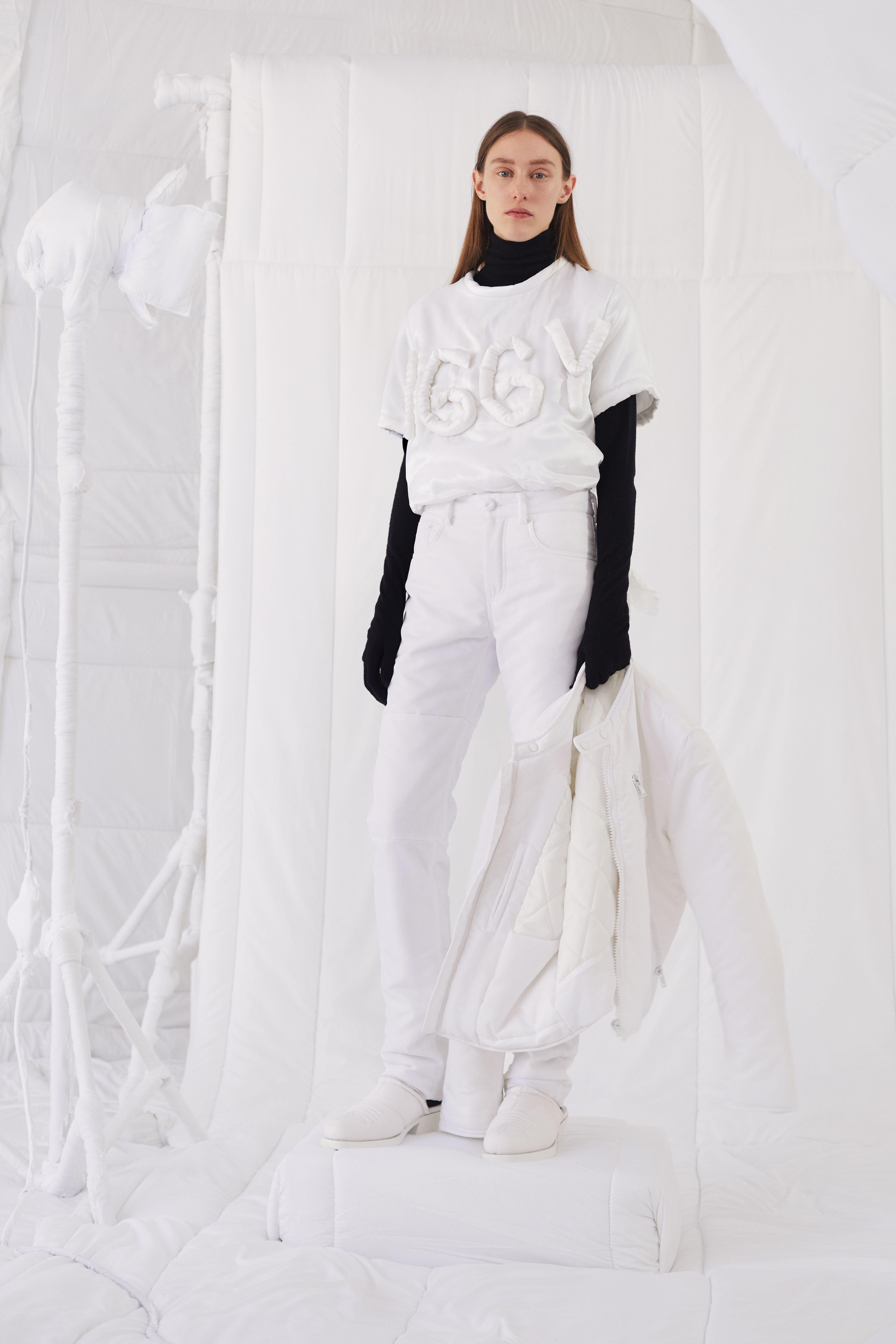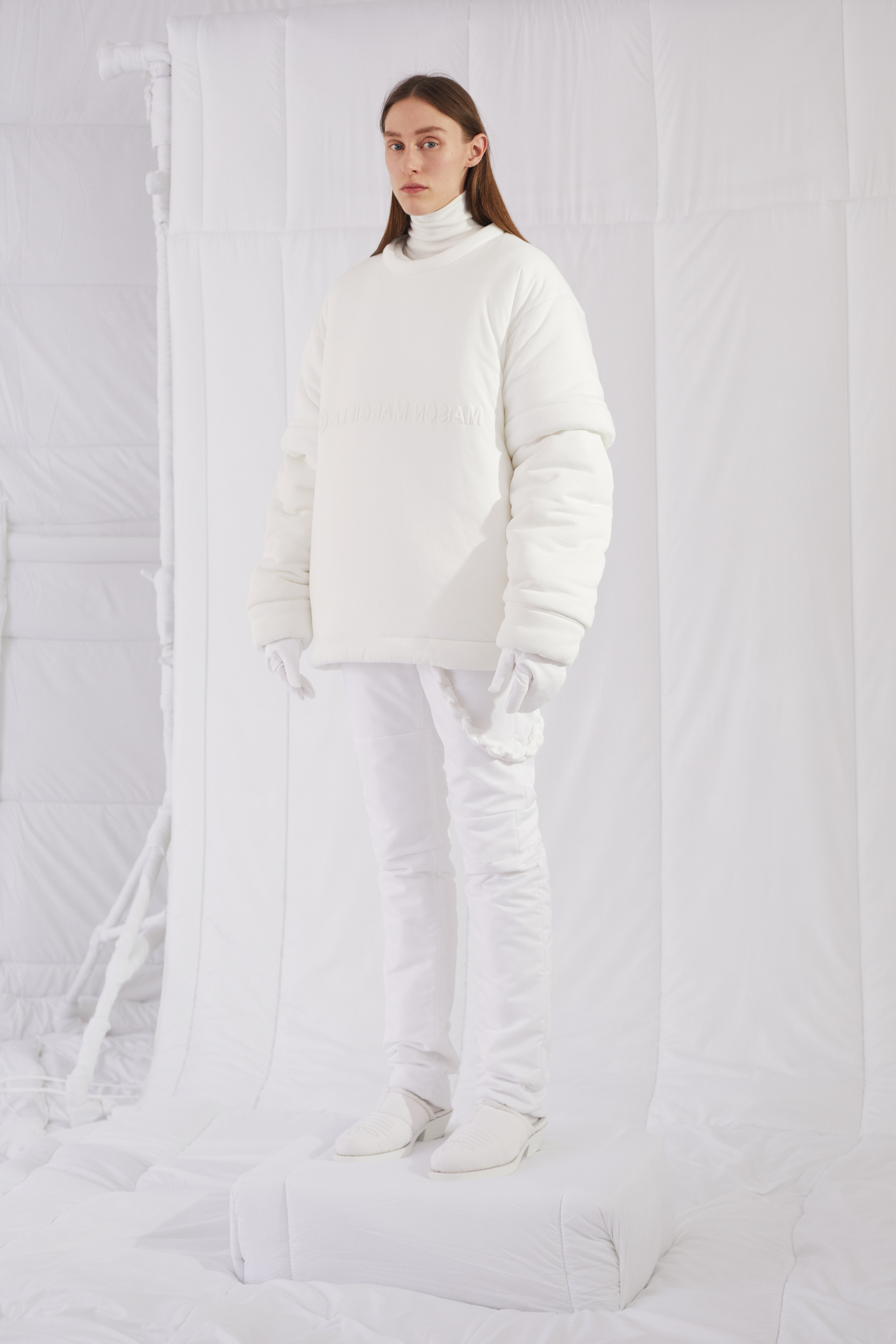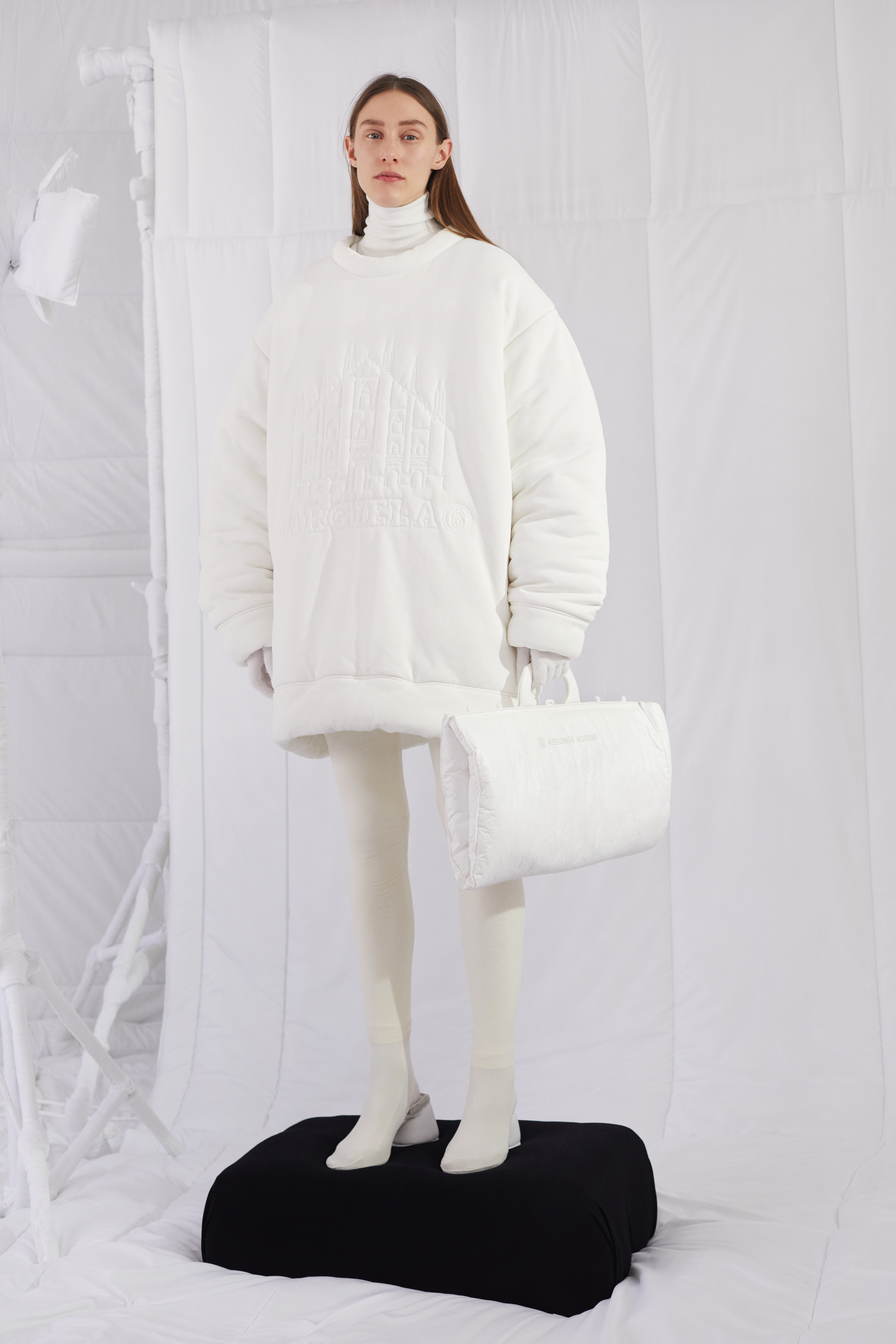 An entire wardrobe of MM6 classics reimagined in puffed-up, padded forms. Representative of the collective identity of the house, the Autumn-Winter 2019 collection is unified and mysterious; democratic and inclusive. Individual garments remain humble – never overridden by concept. Instead, the MM6 wardrobe, which encompases ready-to-wear, accessories, footwear and jewellery for women, continues to evolve and build upon its own modern wearability. Presented in an immersive, padded world inside the Maison Margiela store in Milan – where even skirting boards and chandeliers are transformed – the brand finds a temporary home in Italy for the season. Alongside a soundtrack of distorted, sleepy techno by Frédéric Sanchez, the environment brings a new conceptuality to the collection. Behaving in a truly inclusive way (echoing the democratic nature of garments) the presentation is open to members of the public – true fans of MM6 – and five limited-edition pieces are available to purchase immediately after. SILHOUETTE Clothing made for individuals. Recognisable pieces – pleated skirts, dresses, cardigans, parkas – are puffed-up and transformed, but always remain wearable and familiar. Magic is hidden in the details, where even buttons and pockets are rendered in padded forms. Many items are borrowed from a masculine wardrobe – oversized trench coats, cropped trucker jackets, and, for the first time the classic 5-zip biker, which is carefully reinterpreted from the archives in nylon. Feminine accents can be found too, particularly in the delicate circle dress, front-slit skirts and slip dresses. The anagram ‘THAT IRIS SUITS YOU’ is referencing an historical print of the Maison “THAT SUIT IS YOU SIR“, cut out and placed on suiting.