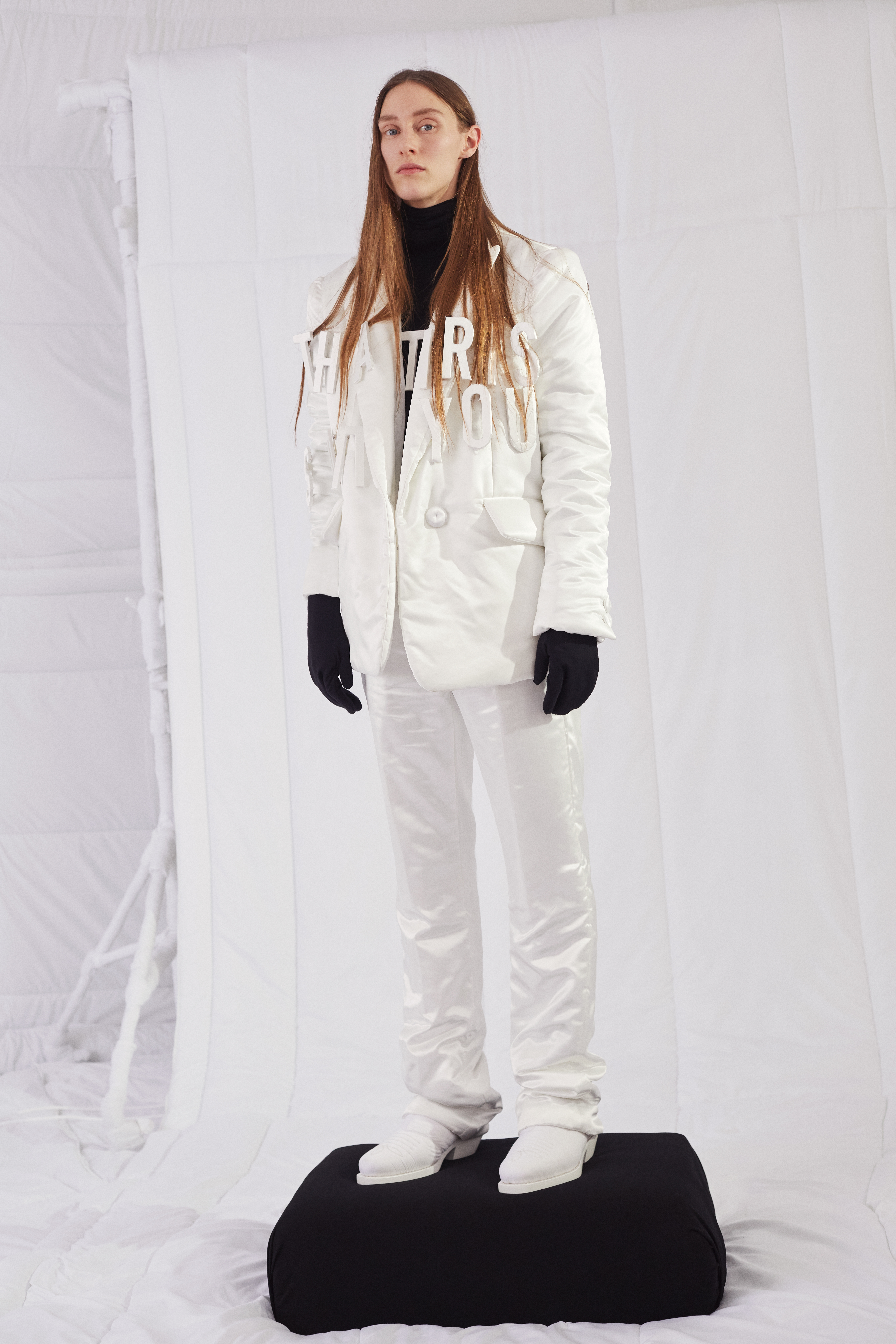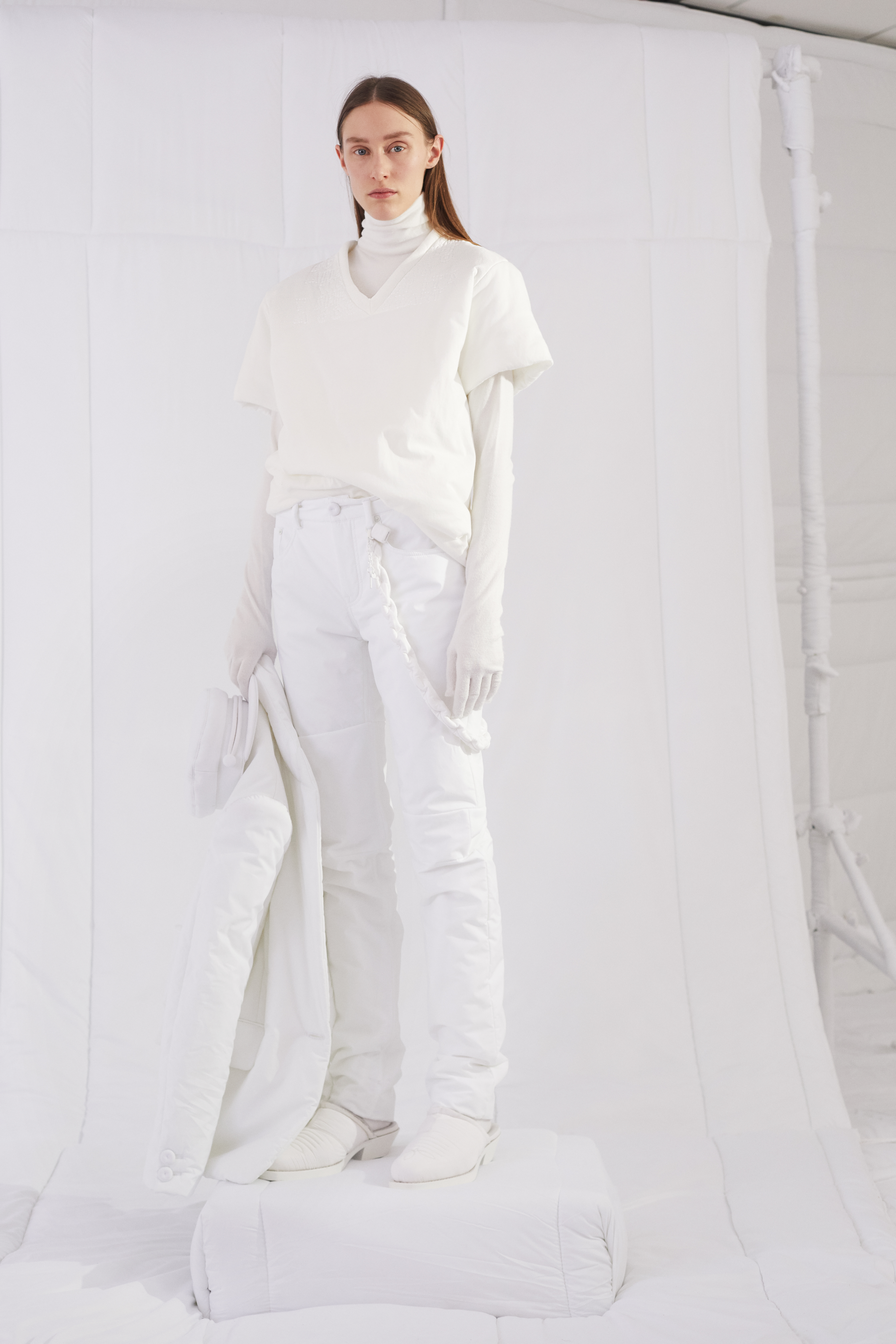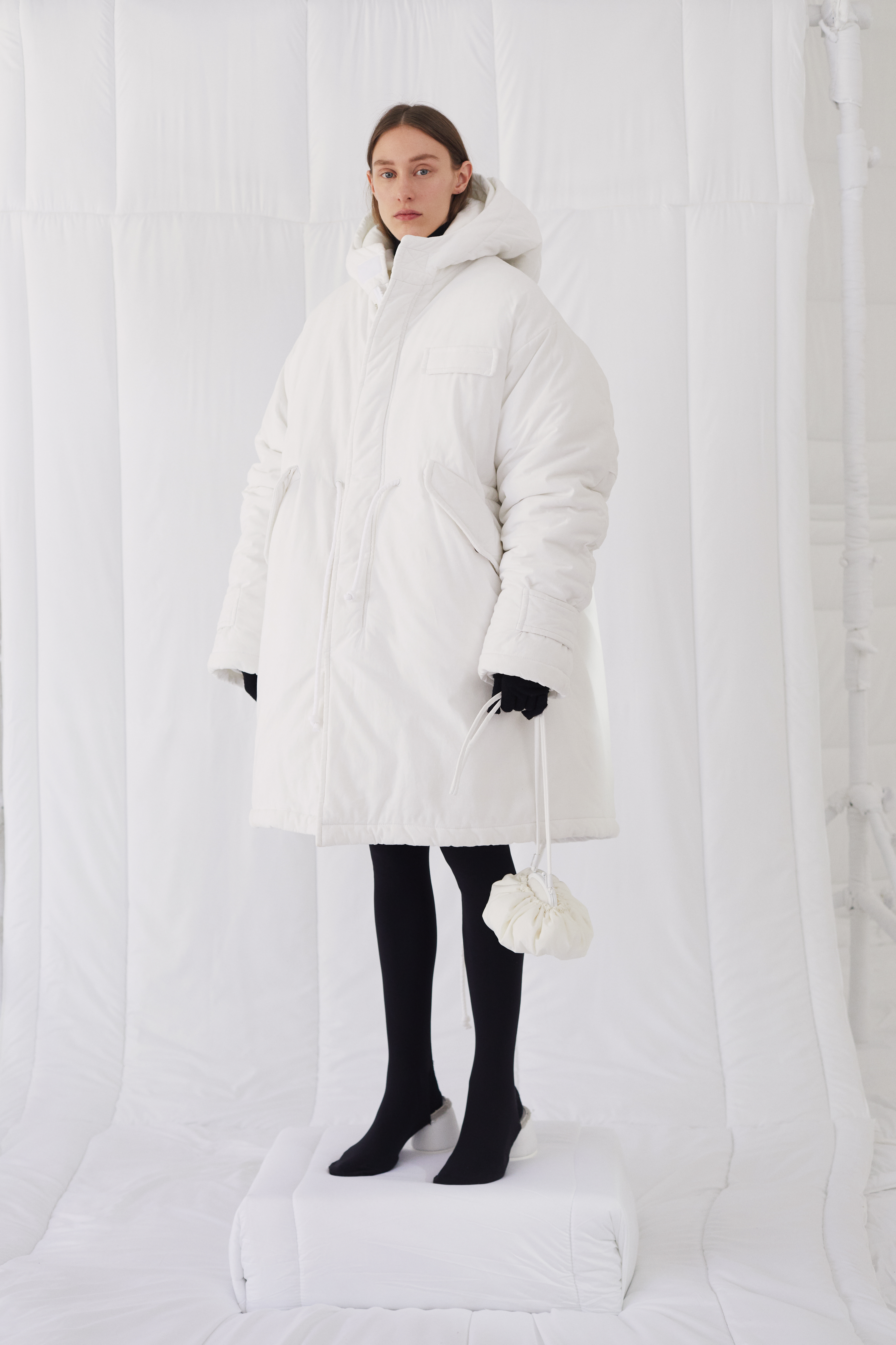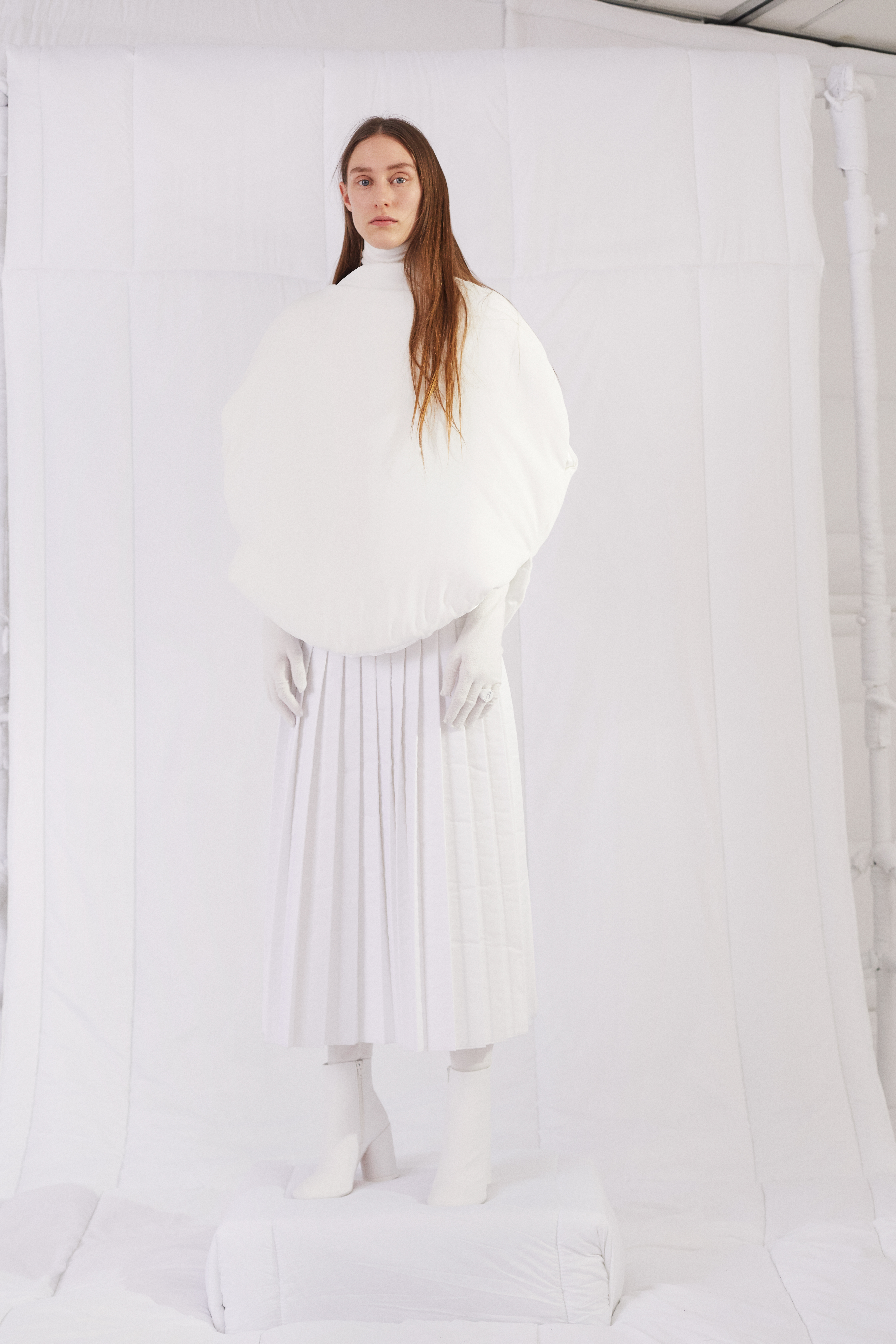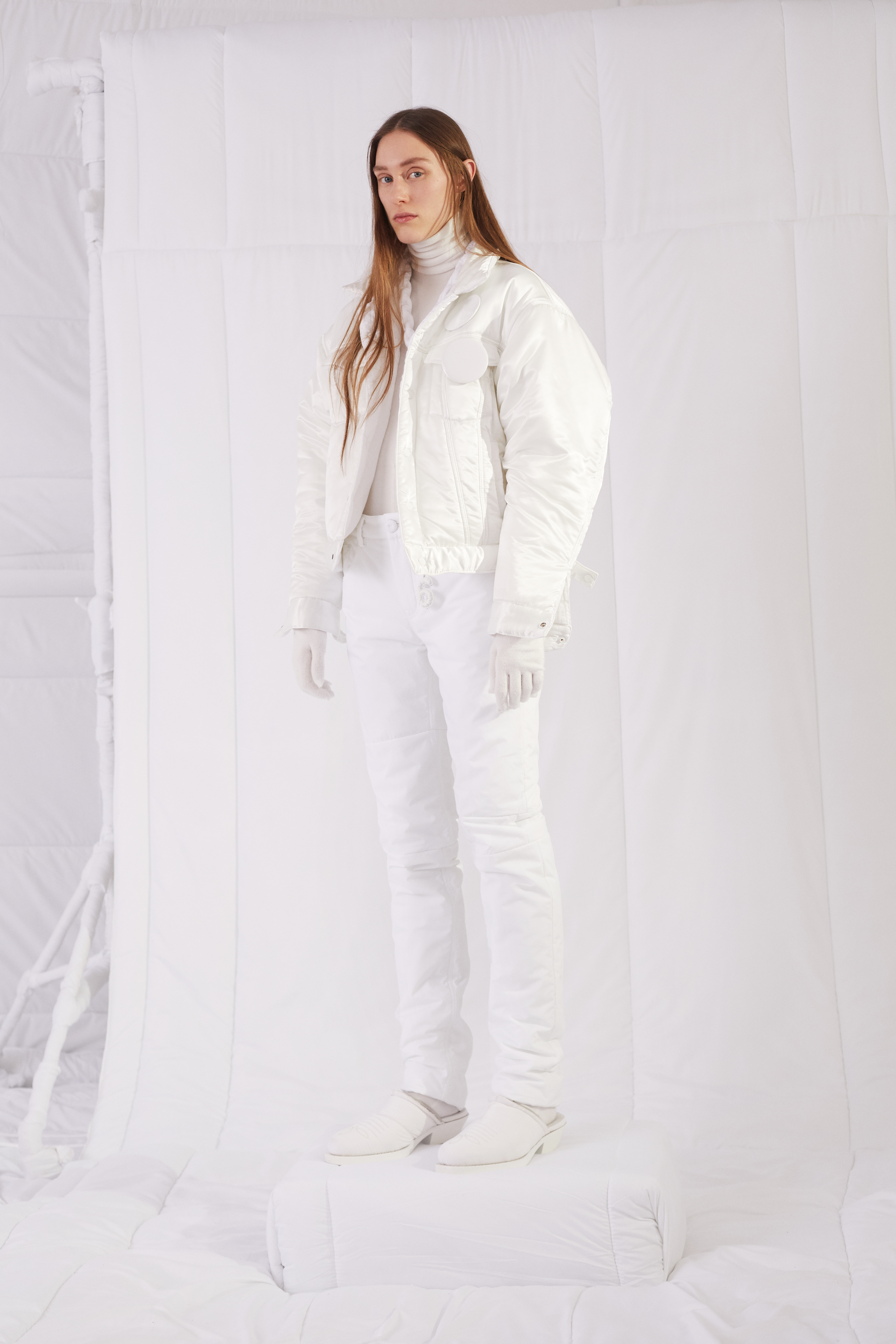 An entire wardrobe of MM6 classics reimagined in puffed-up, padded forms. Representative of the collective identity of the house, the Autumn-Winter 2019 collection is unified and mysterious; democratic and inclusive. Individual garments remain humble – never overridden by concept. Instead, the MM6 wardrobe, which encompases ready-to-wear, accessories, footwear and jewellery for women, continues to evolve and build upon its own modern wearability. Presented in an immersive, padded world inside the Maison Margiela store in Milan – where even skirting boards and chandeliers are transformed – the brand finds a temporary home in Italy for the season. Alongside a soundtrack of distorted, sleepy techno by Frédéric Sanchez, the environment brings a new conceptuality to the collection. Behaving in a truly inclusive way (echoing the democratic nature of garments) the presentation is open to members of the public – true fans of MM6 – and five limited-edition pieces are available to purchase immediately after. SILHOUETTE Clothing made for individuals. Recognisable pieces – pleated skirts, dresses, cardigans, parkas – are puffed-up and transformed, but always remain wearable and familiar. Magic is hidden in the details, where even buttons and pockets are rendered in padded forms. Many items are borrowed from a masculine wardrobe – oversized trench coats, cropped trucker jackets, and, for the first time the classic 5-zip biker, which is carefully reinterpreted from the archives in nylon. Feminine accents can be found too, particularly in the delicate circle dress, front-slit skirts and slip dresses. The anagram ‘THAT IRIS SUITS YOU’ is referencing an historical print of the Maison “THAT SUIT IS YOU SIR“, cut out and placed on suiting.