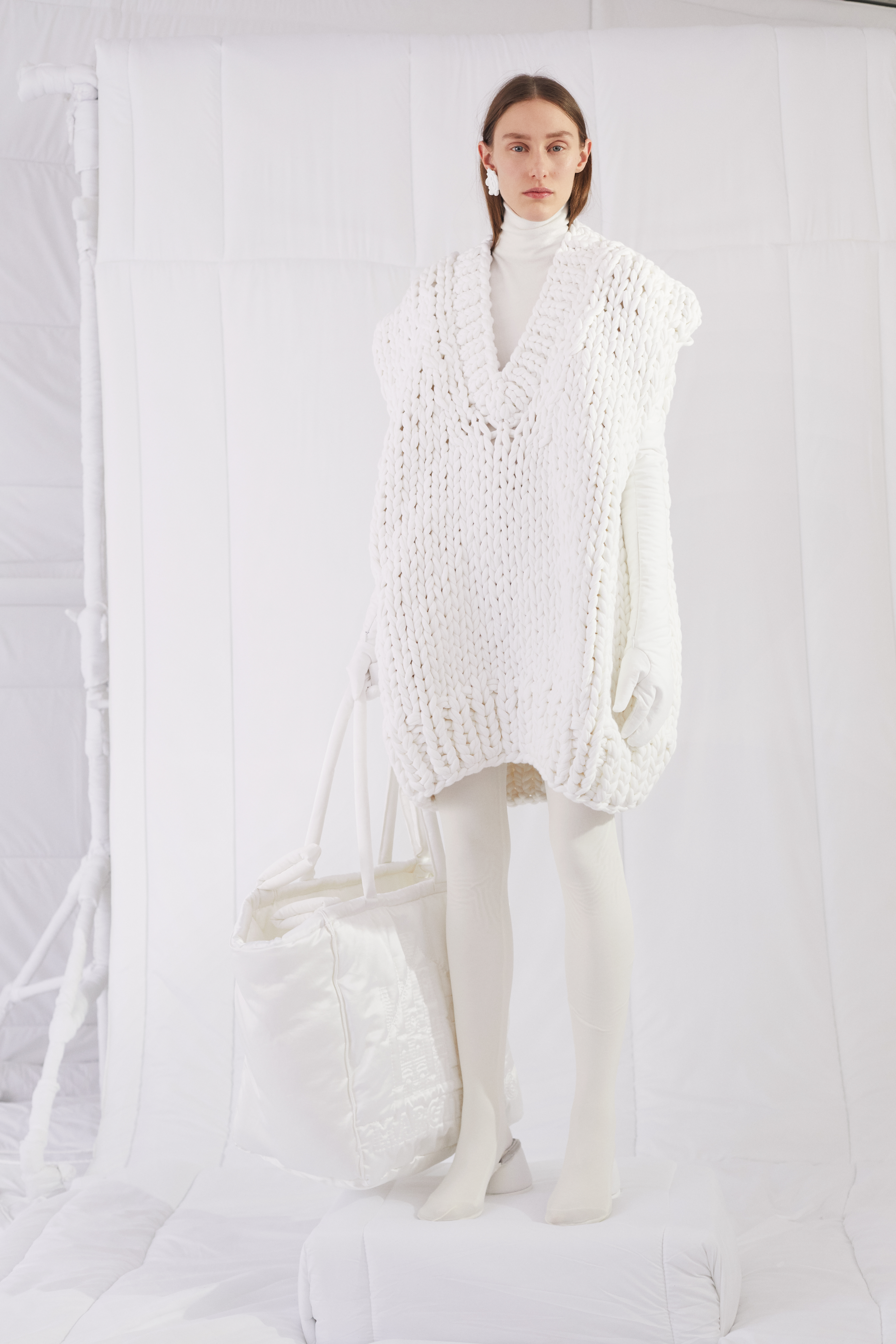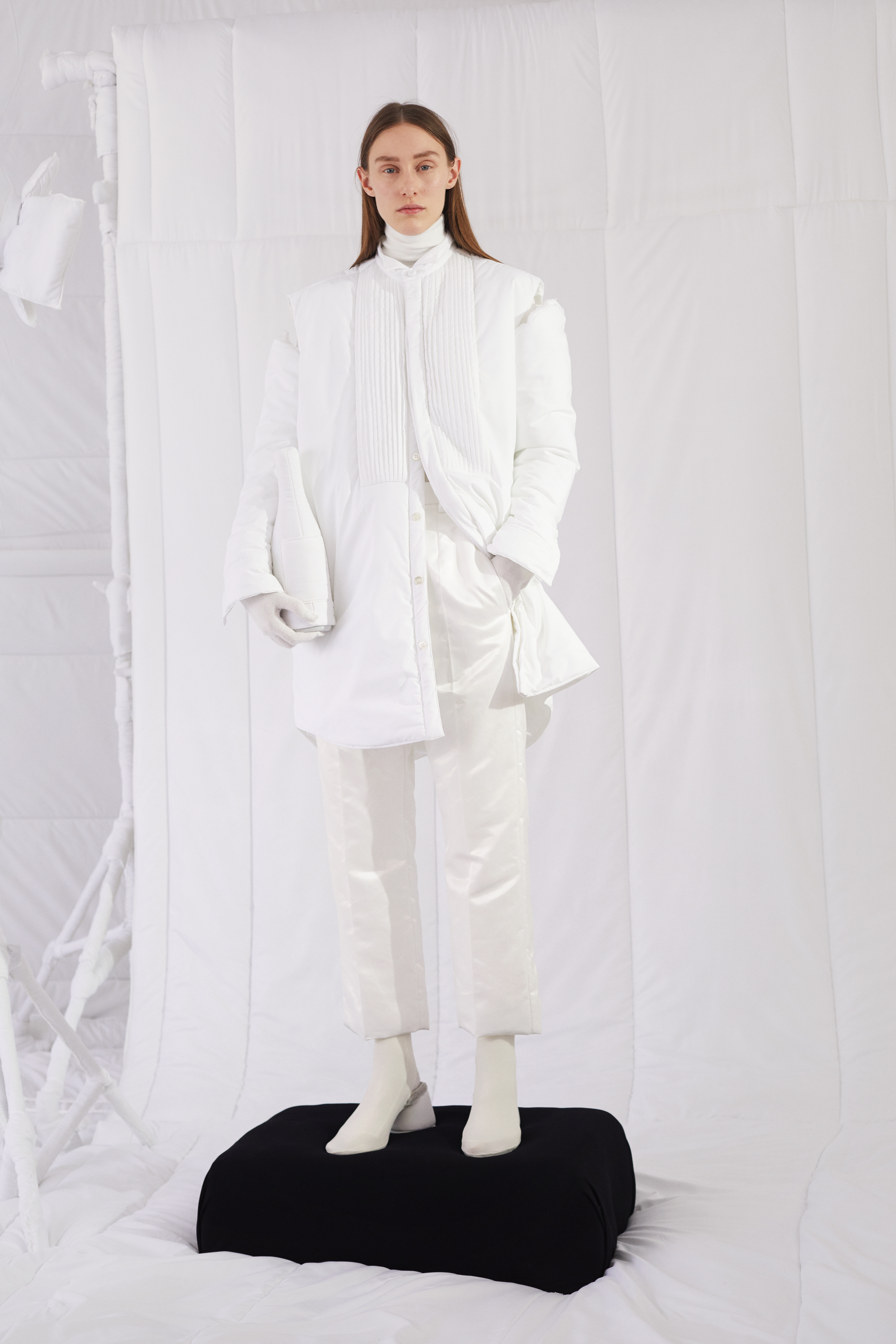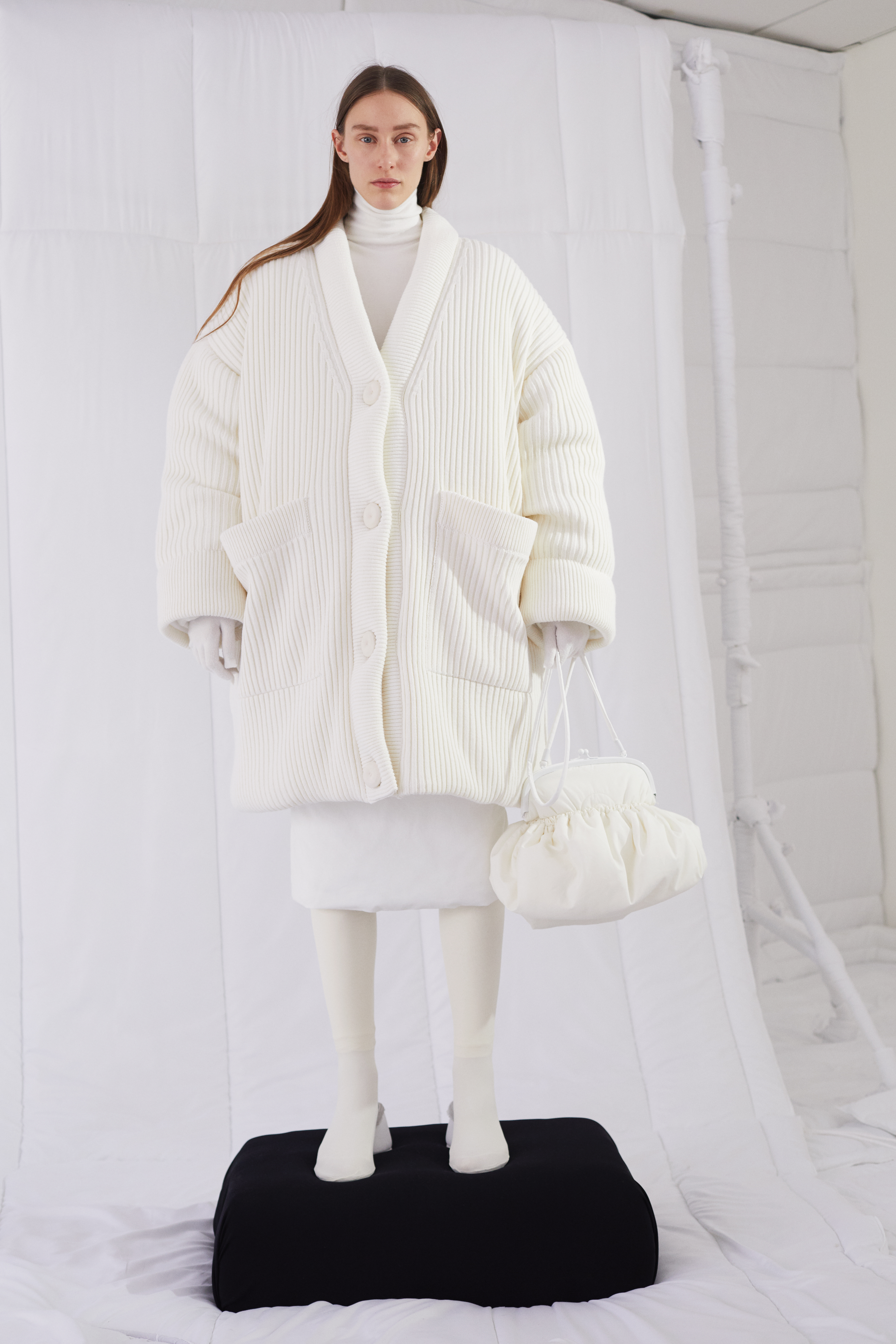Tactile desire. Humble fabrications. Soft, cloudy, light. The cotton of the maison’s iconic ‘blouses blanches’ staff uniform, nylon taken from inside jacket lining, elegant satin and chunky cable knit. Everyday materials are repurposed, given added dimension through padding.