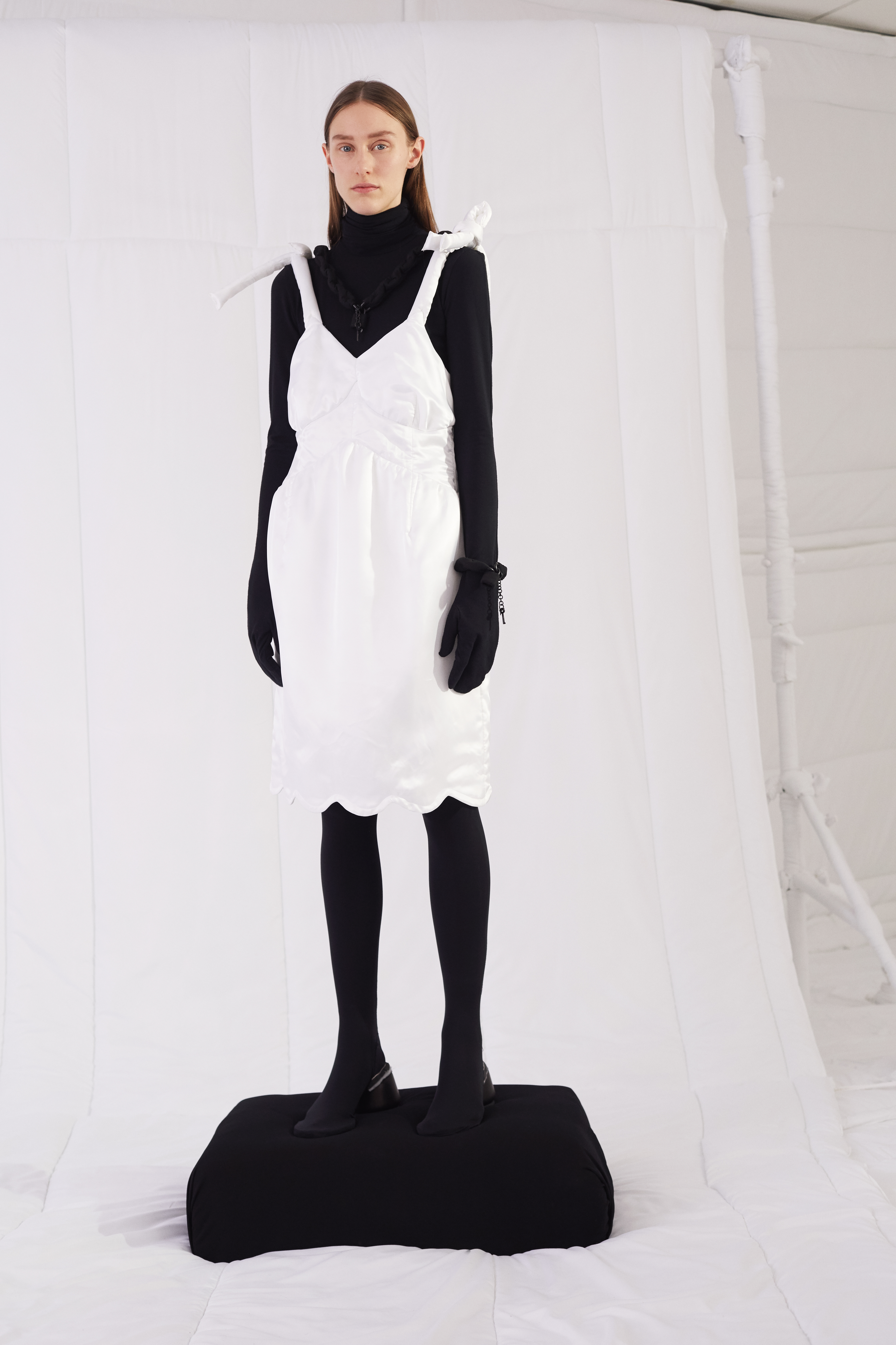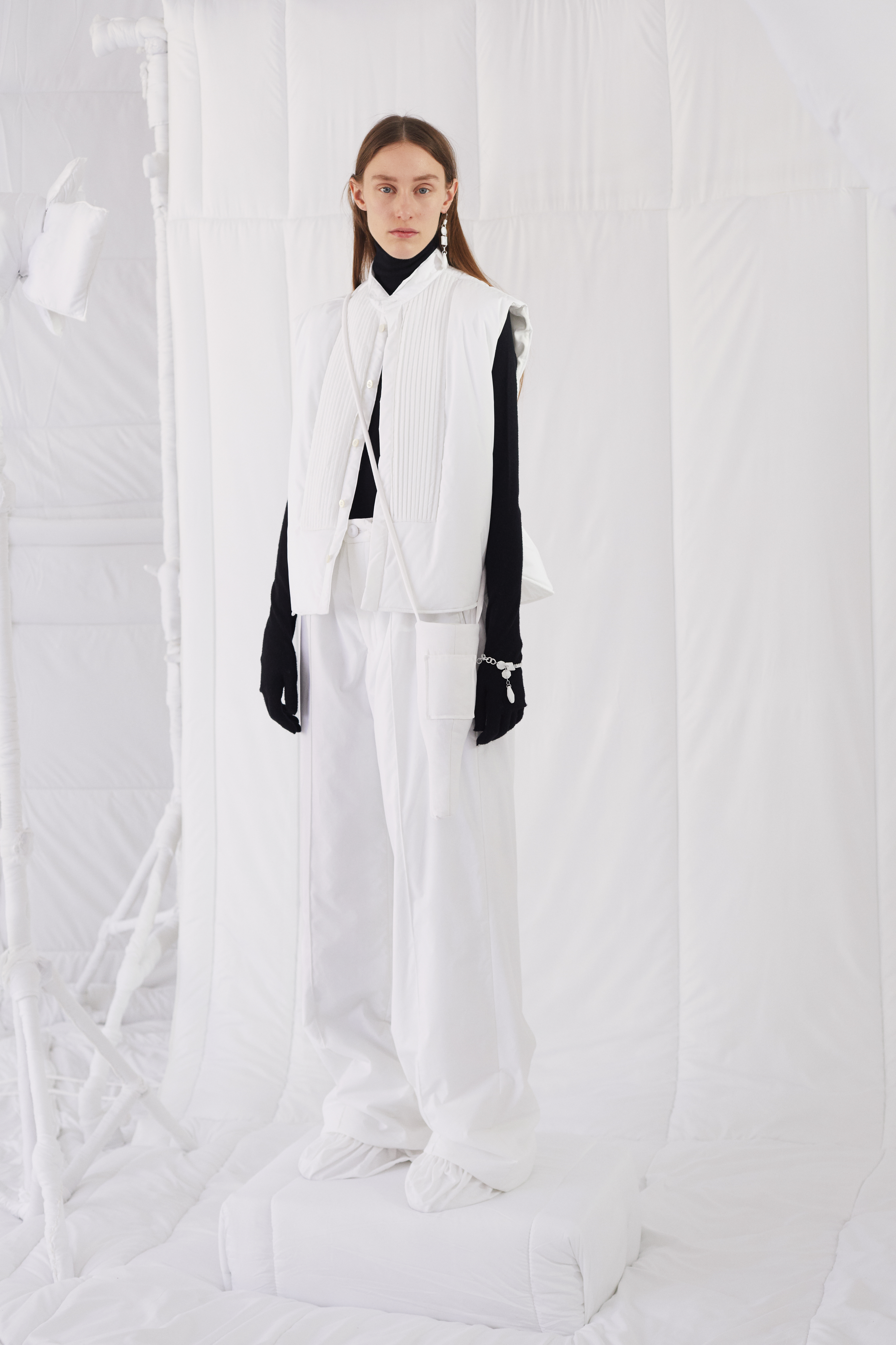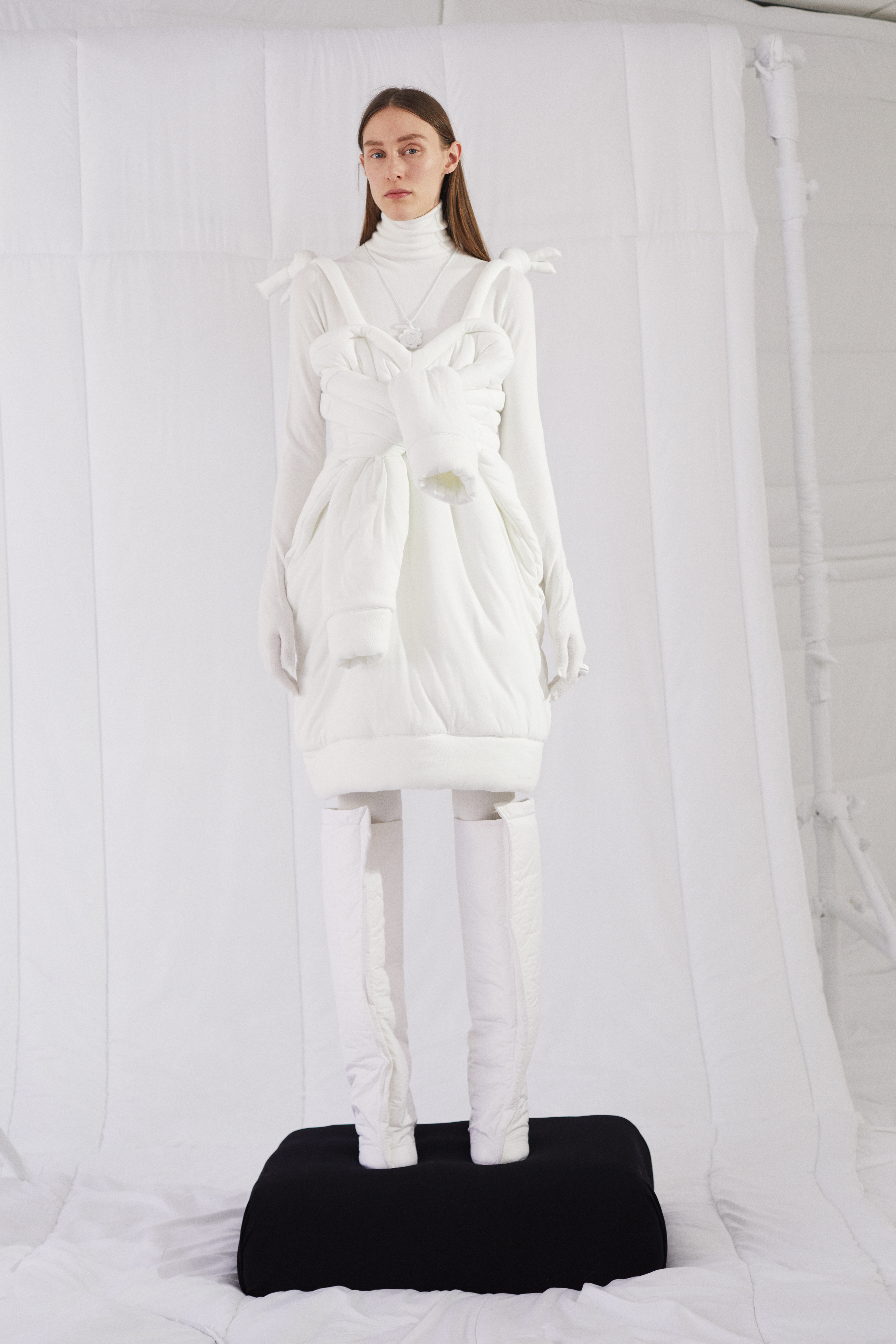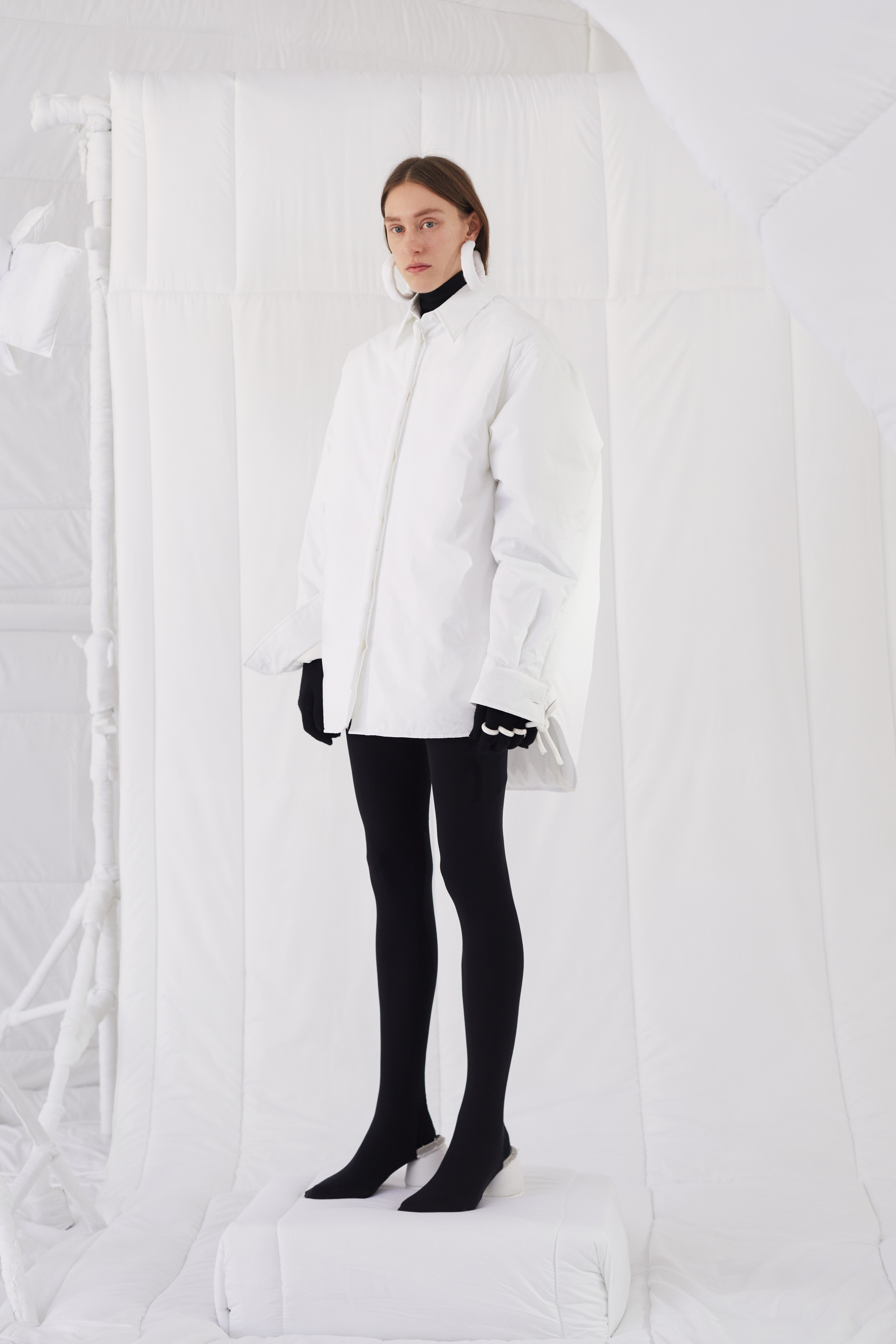 Tactile desire. Humble fabrications. Soft, cloudy, light. The cotton of the maison’s iconic ‘blouses blanches’ staff uniform, nylon taken from inside jacket lining, elegant satin and chunky cable knit. Everyday materials are repurposed, given added dimension through padding.