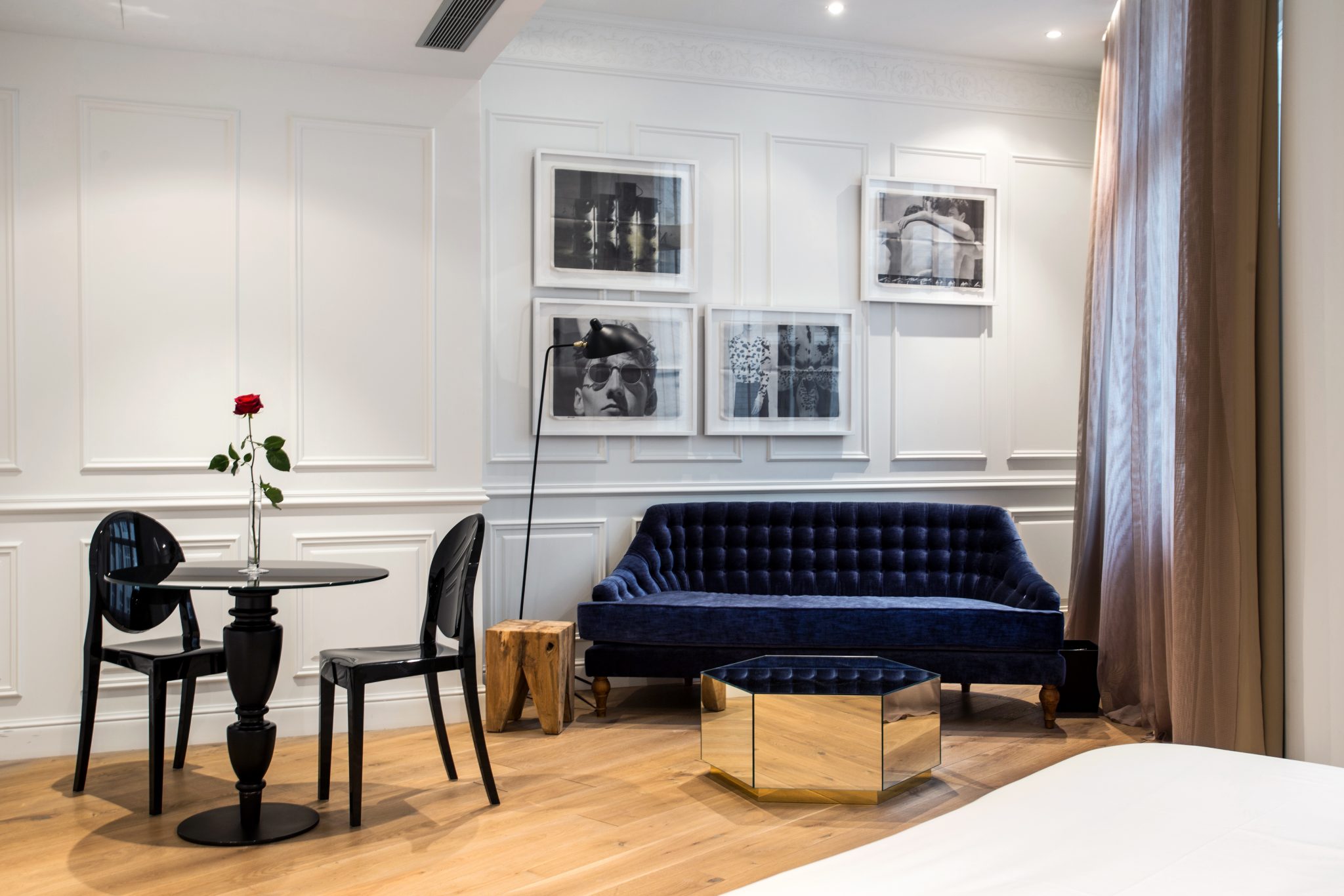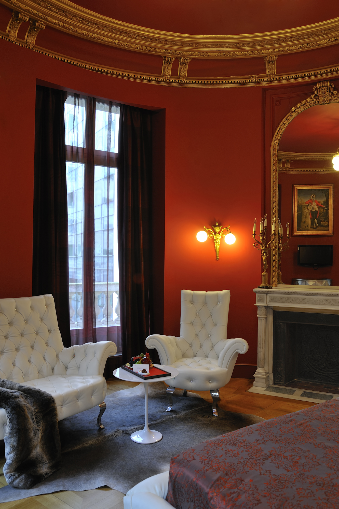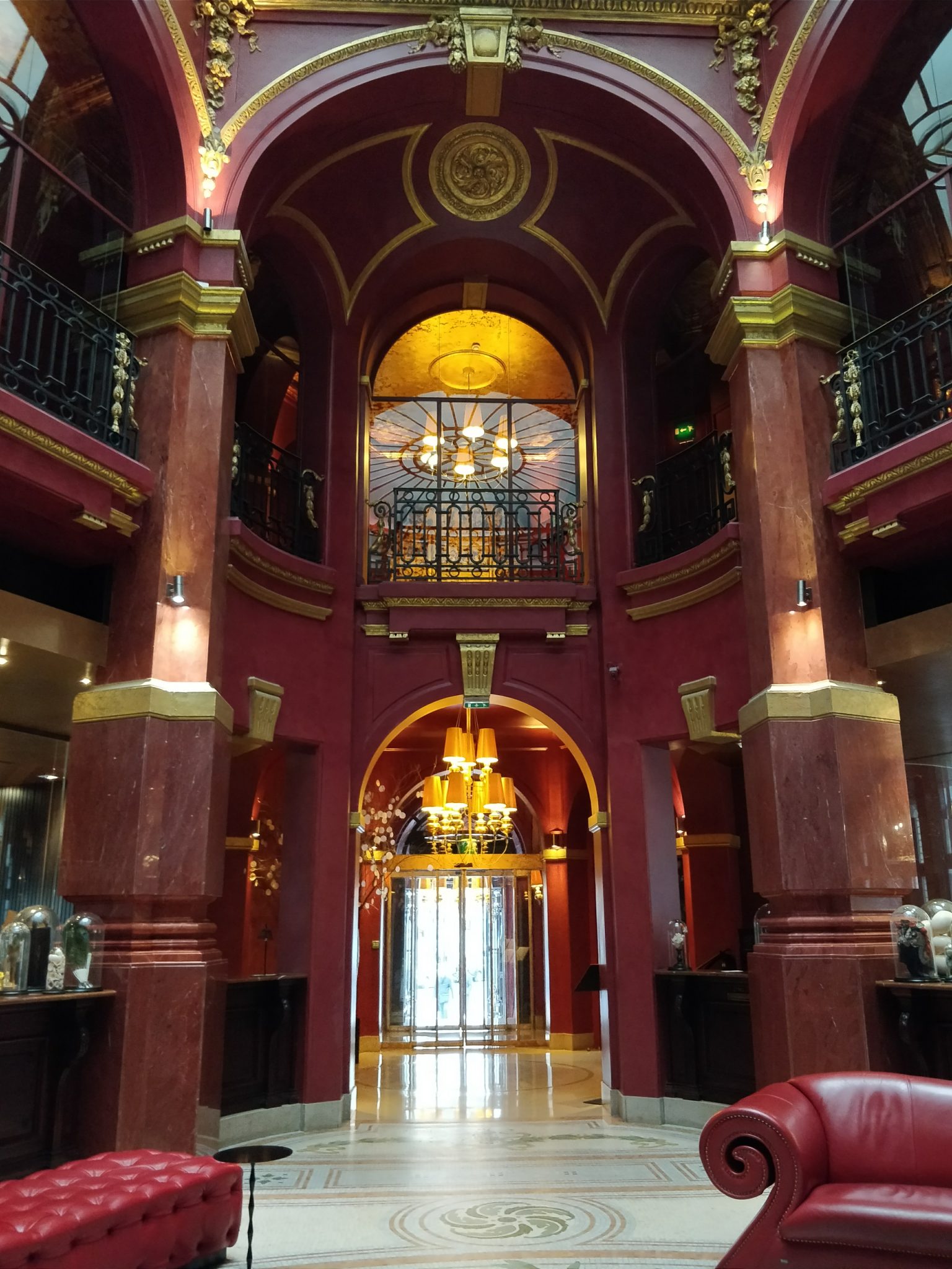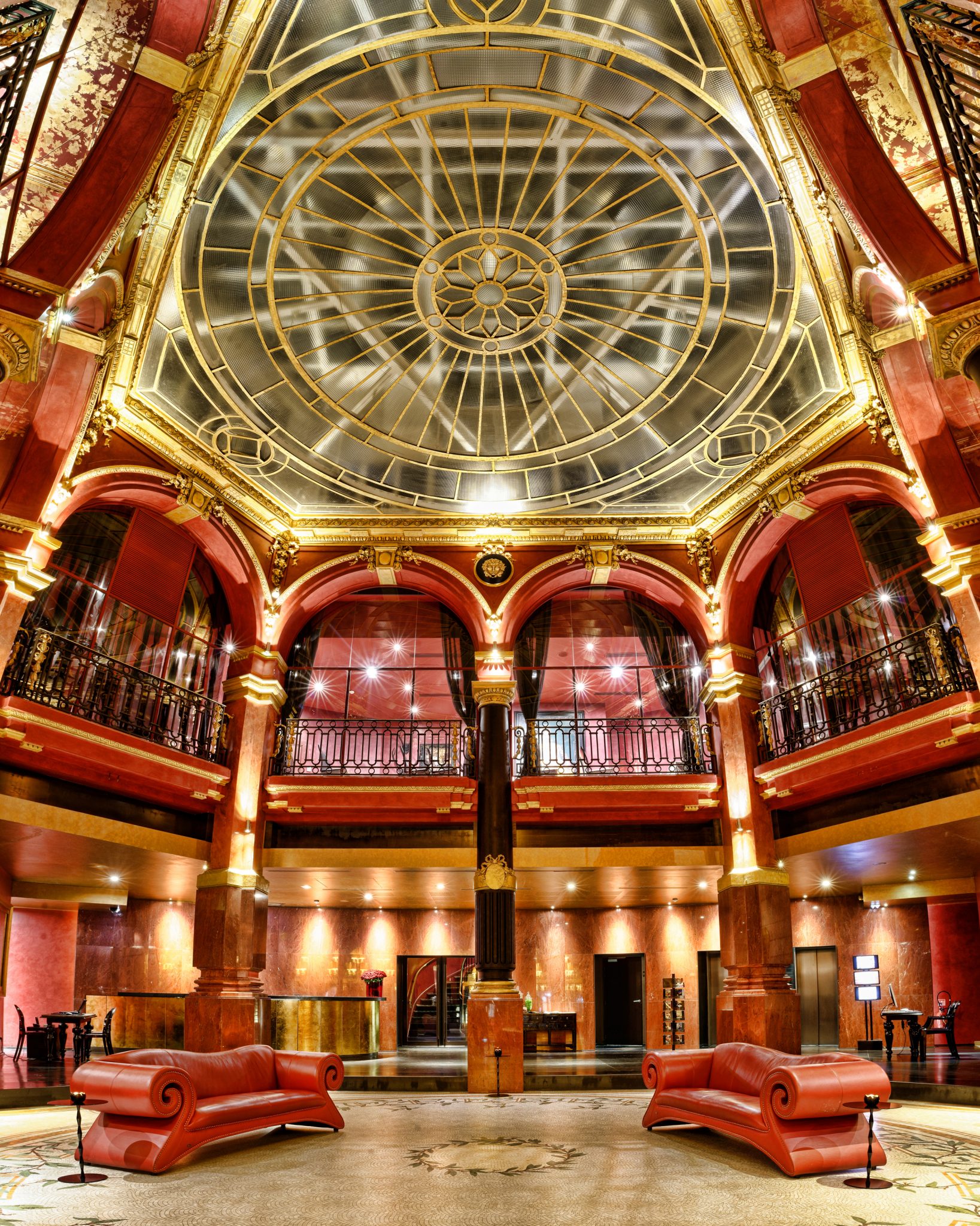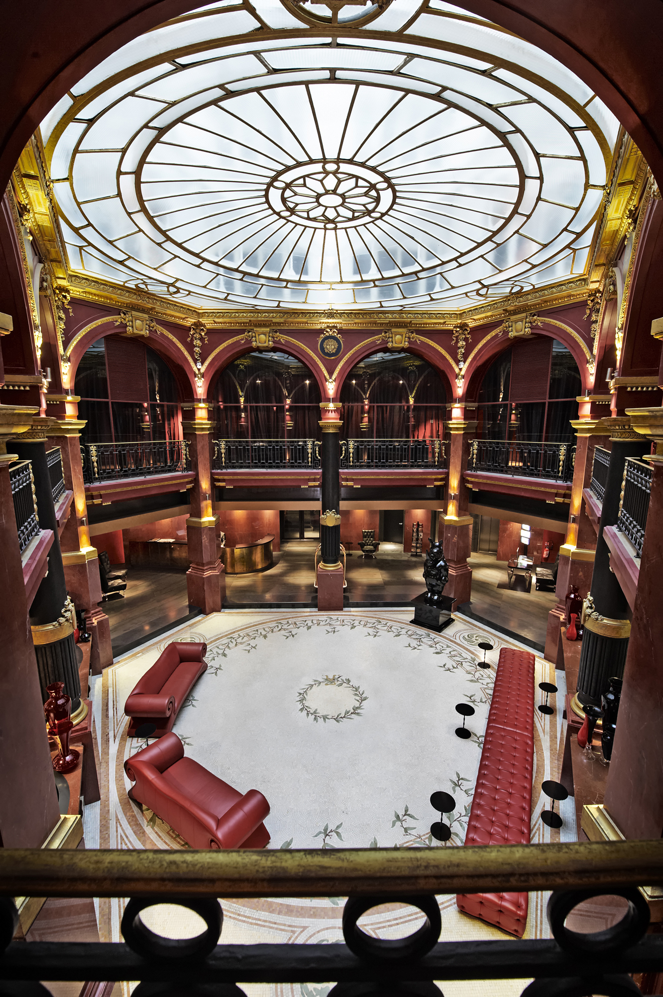 Dès l’entrée, les visiteurs sont accueillis par d’immenses rideaux carmin inspirés de ceux de la grande scène principale, qui réchauffent le hall de cet hôtel spectaculaire. Au centre du lobby, en levant les yeux au ciel, on aperçoit les balcons dupremier étage qui rappellent les loges de l’opéra. L’Histoire s’y vit également à travers le carrelage en mosaïque restauré, ainsi que les arches, les moulures et les portes de certaines chambres à coucher. Tout le décor original a été restauré et les éléments les plus importants ont été mis en évidence à la feuille d’or.