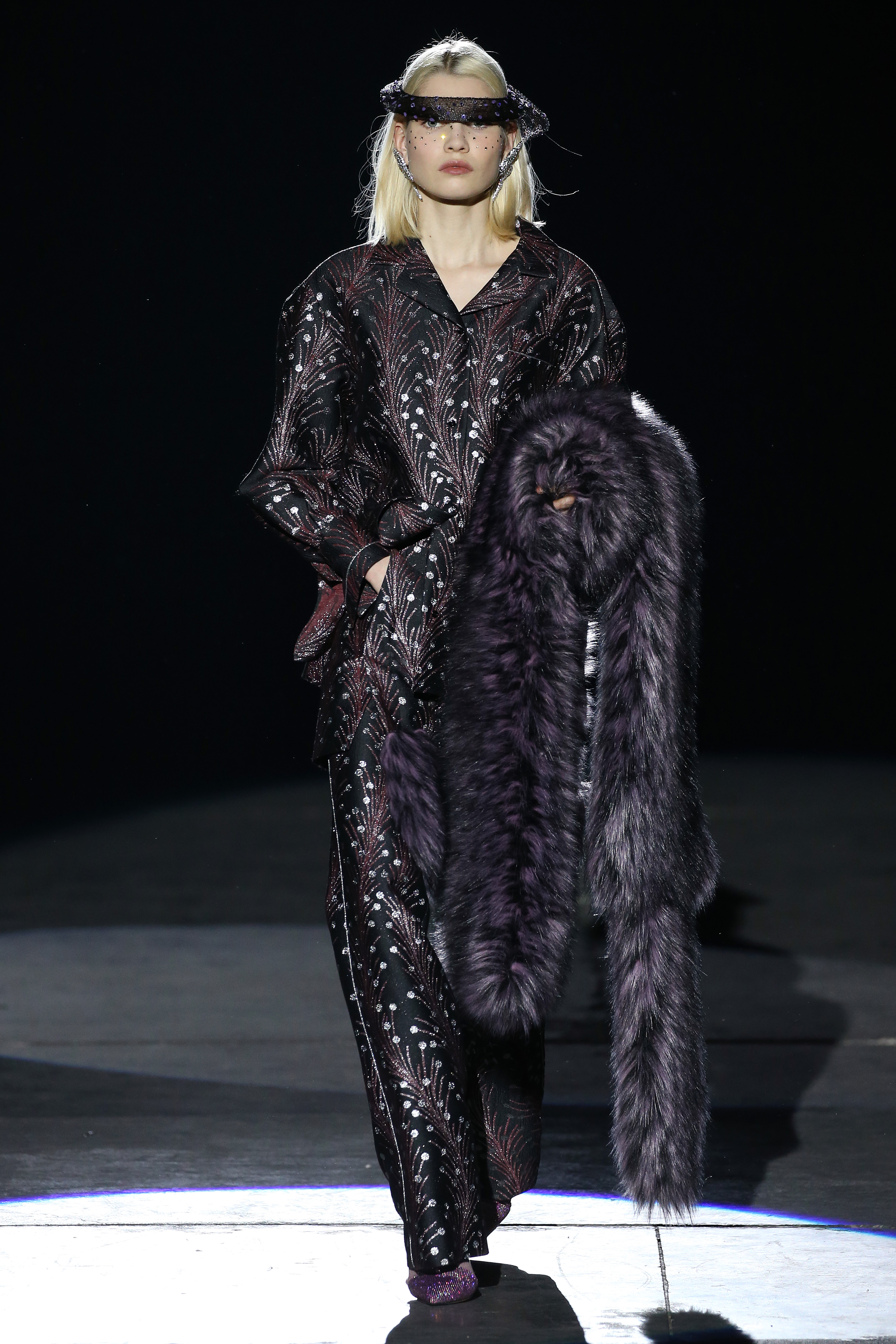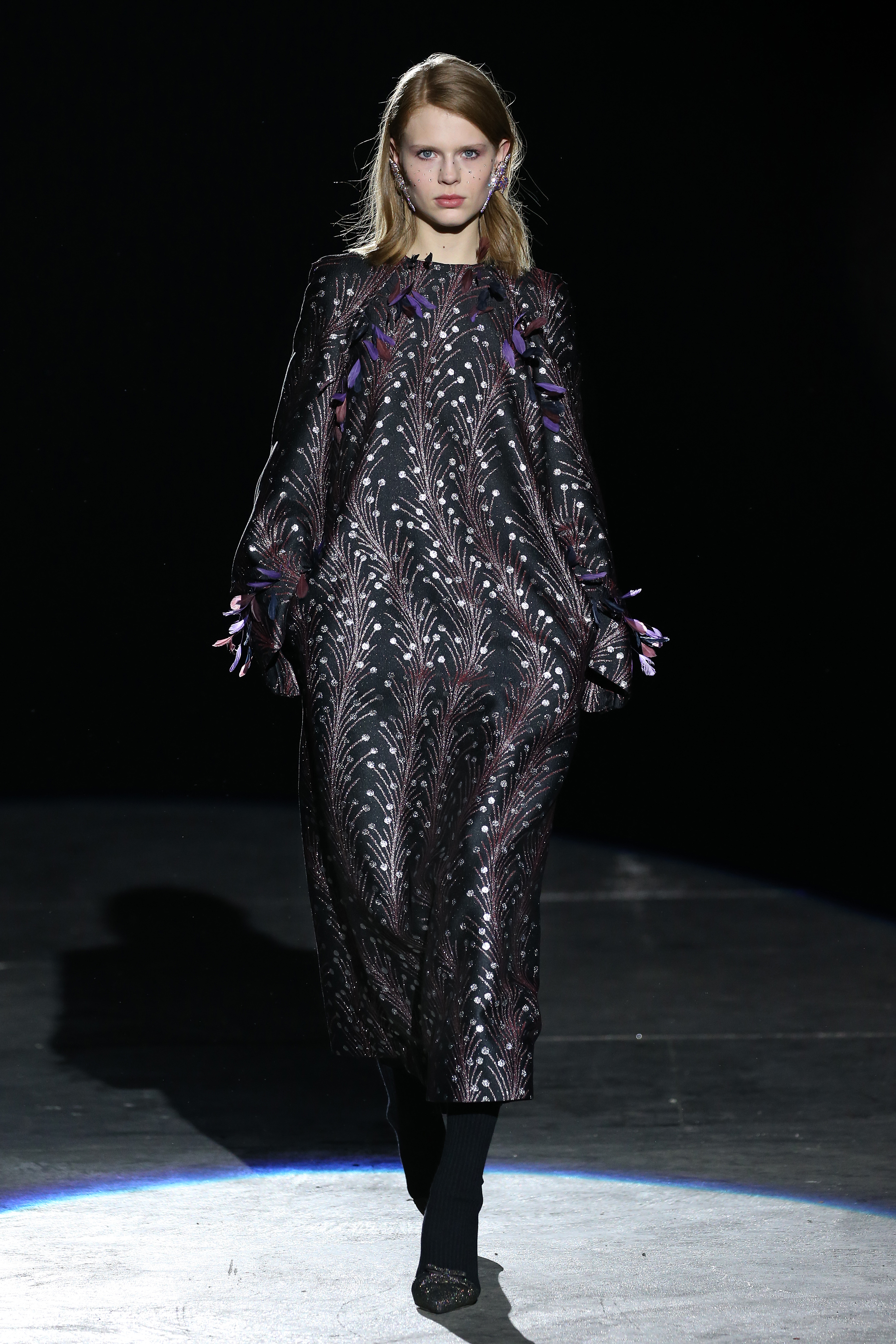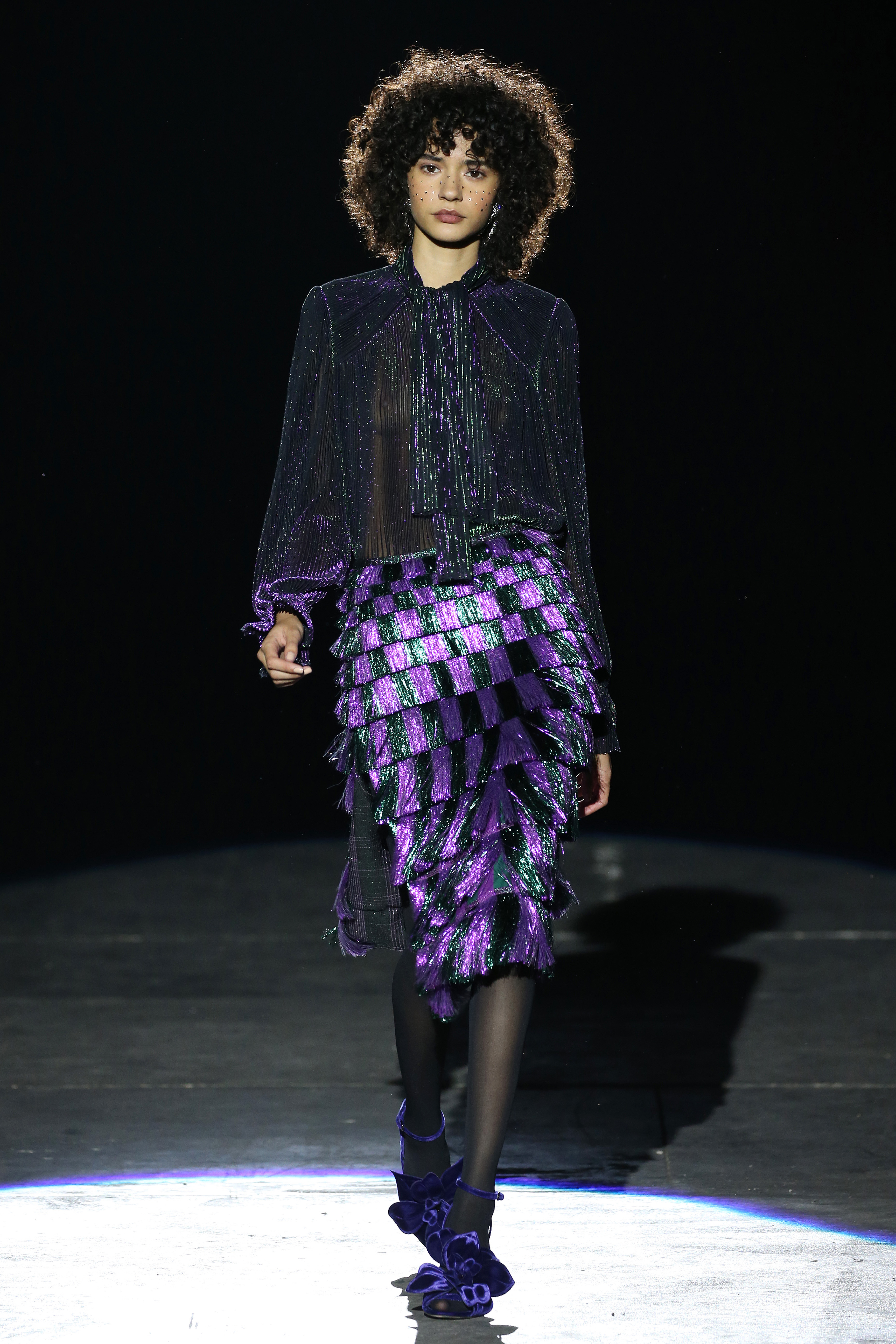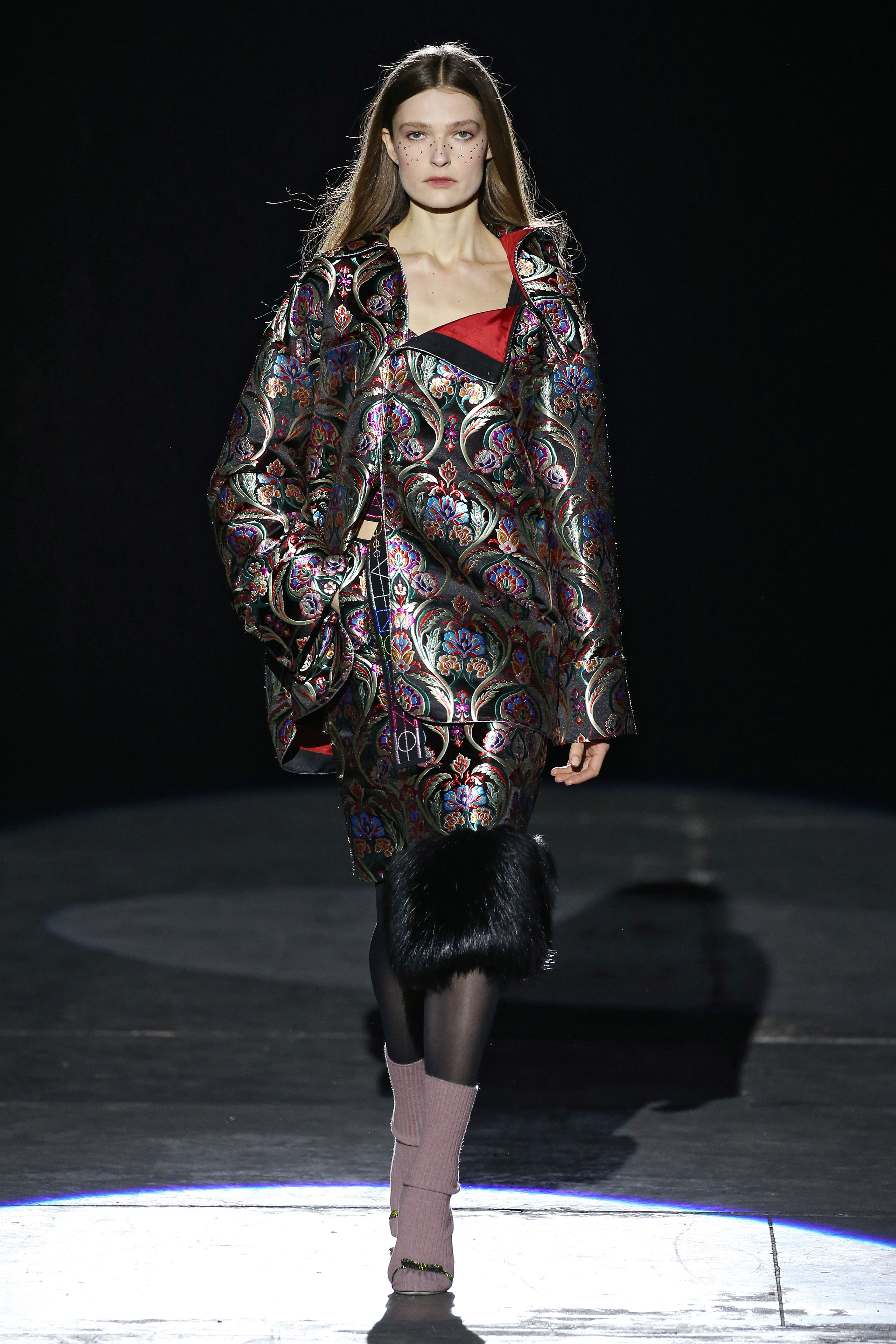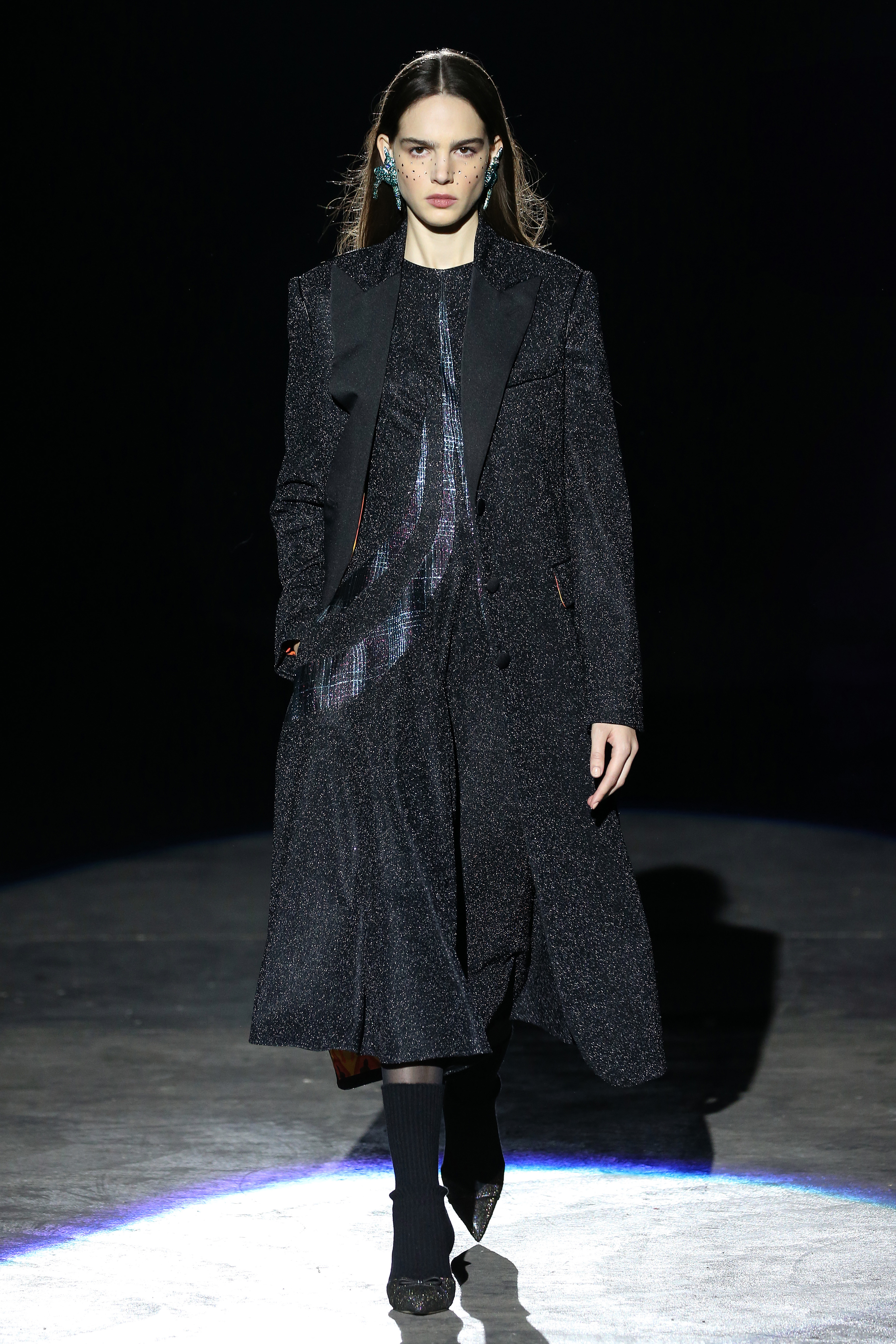 “One of my favorite things in the world is a little ceramic deer from the Forties that I found a few years ago in a small shop. I like it so much, I keep it in a glass case at home: even though it is not precious, it is very precious to me. It’s the same Bambi that I shaped into an invitation to this show. This collection feels very personal: it is filled it with my favorite things. I wanted to celebrate what I like as a designer, what triggers my creativity and makes me love my job. The idea that everything comes together, for instance, even when things are put one next to another for no particular reason but a creative urge. This fateful randomness, which in fact is not randomness, is completely my own, just like the love for lurex, waves, optical motifs; just like the proclivity for macramè, glitter, intensely psychedelic surfaces. I like riffs of the metallic and distorted ladylike. I like velvet and I like a womanly dress, or a very bourgeois ensemble that I twist and turn by way of color, texture or pattern. A touch of kitsch is something I am not afraid of at all. This collection is one hundred percent me, a recollection of the weird and wonderful alphabet of my label, which I launched exactly ten years ago. What is specific and exclusive of this moment is the ease of it all, the pervasive sense of spontaneity. I am feeling light right now. So does my work”.