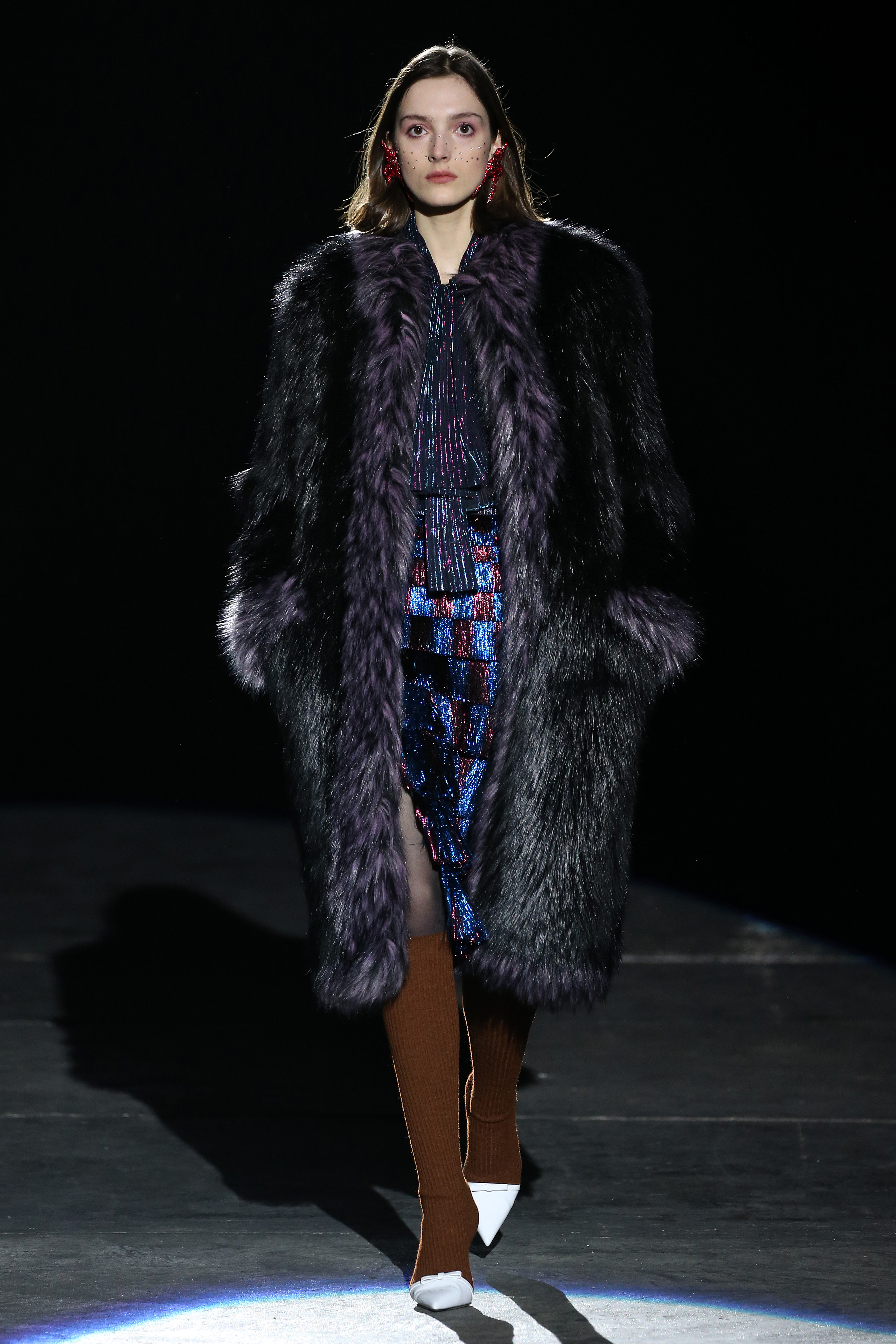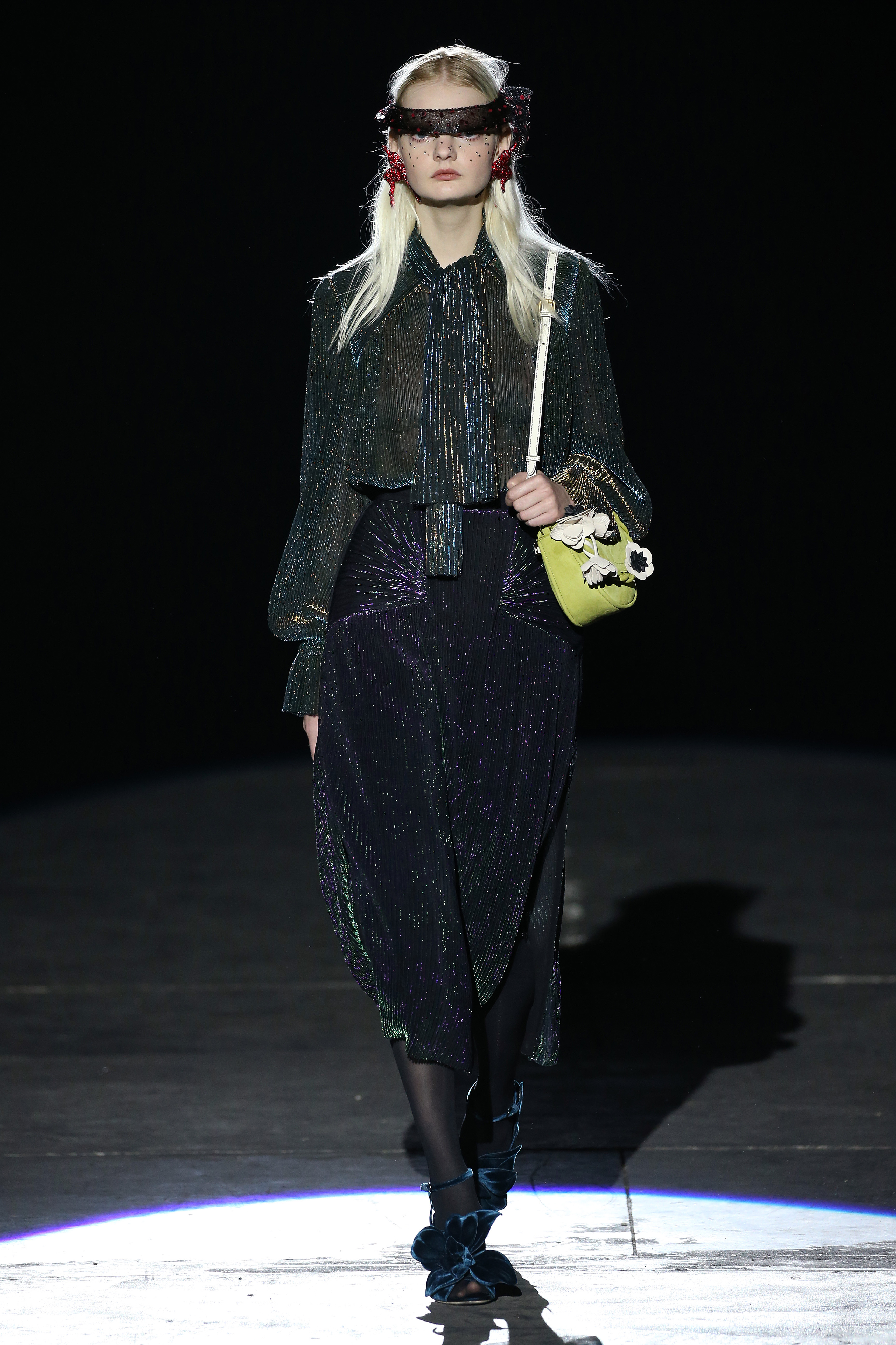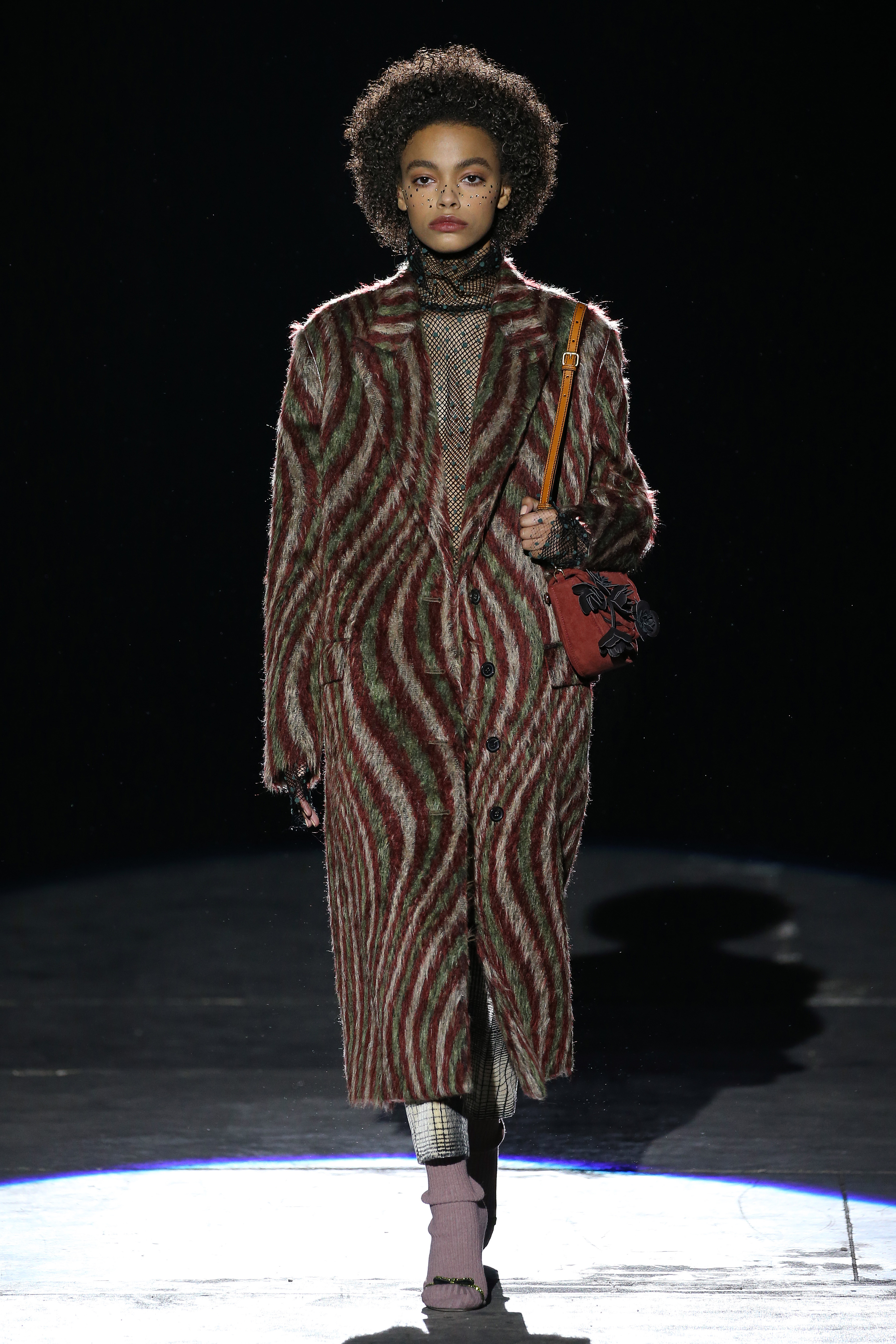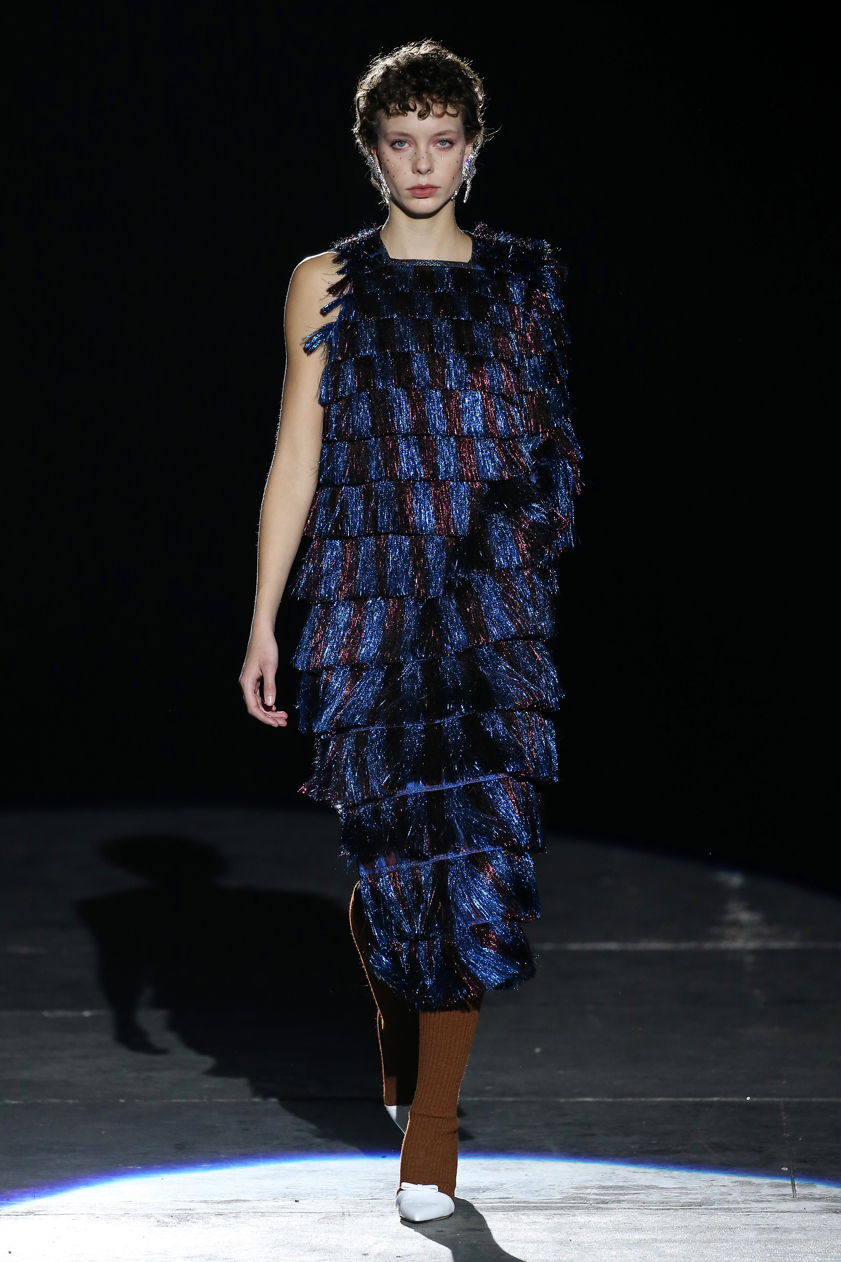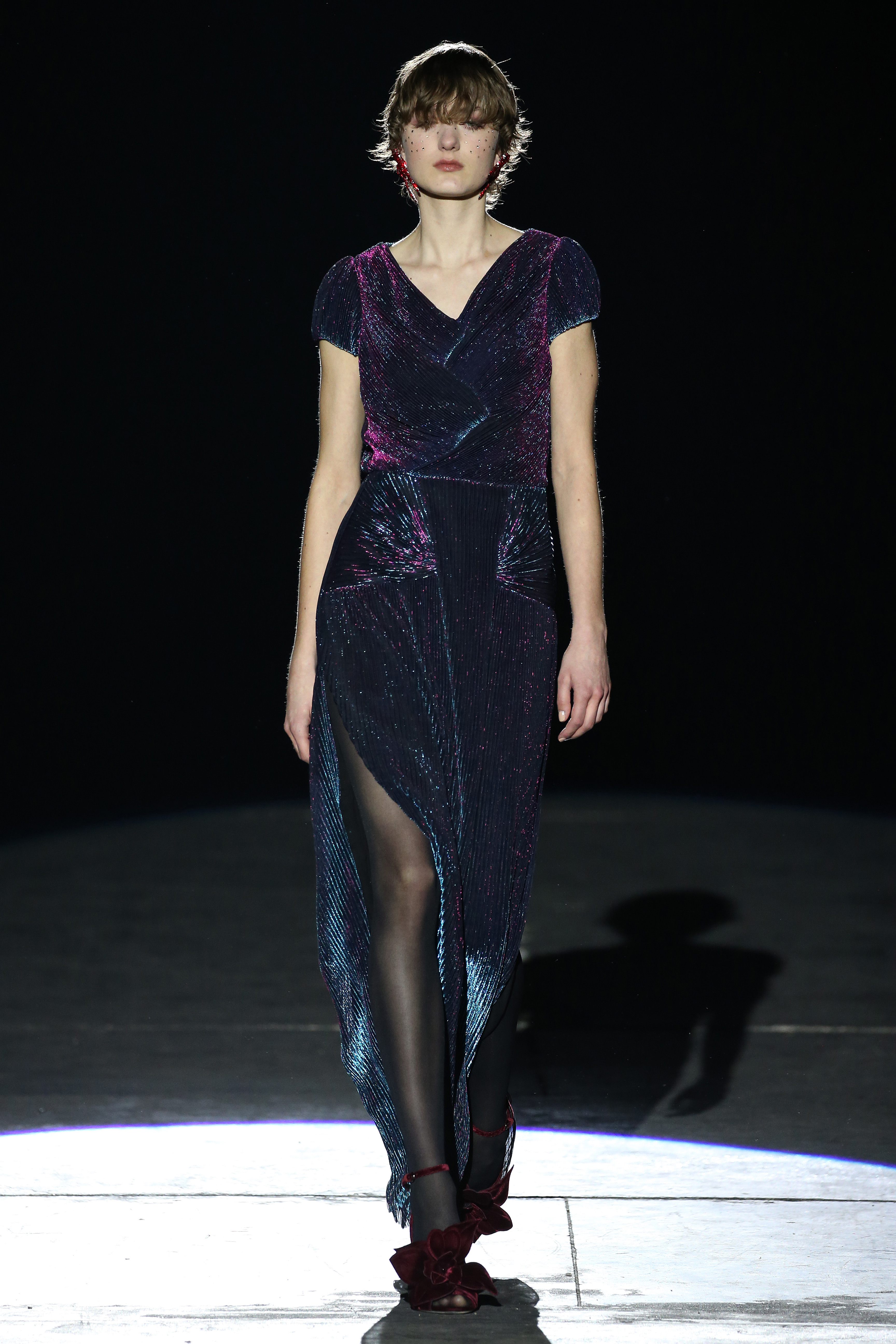 “One of my favorite things in the world is a little ceramic deer from the Forties that I found a few years ago in a small shop. I like it so much, I keep it in a glass case at home: even though it is not precious, it is very precious to me. It’s the same Bambi that I shaped into an invitation to this show. This collection feels very personal: it is filled it with my favorite things. I wanted to celebrate what I like as a designer, what triggers my creativity and makes me love my job. The idea that everything comes together, for instance, even when things are put one next to another for no particular reason but a creative urge. This fateful randomness, which in fact is not randomness, is completely my own, just like the love for lurex, waves, optical motifs; just like the proclivity for macramè, glitter, intensely psychedelic surfaces. I like riffs of the metallic and distorted ladylike. I like velvet and I like a womanly dress, or a very bourgeois ensemble that I twist and turn by way of color, texture or pattern. A touch of kitsch is something I am not afraid of at all. This collection is one hundred percent me, a recollection of the weird and wonderful alphabet of my label, which I launched exactly ten years ago. What is specific and exclusive of this moment is the ease of it all, the pervasive sense of spontaneity. I am feeling light right now. So does my work”.