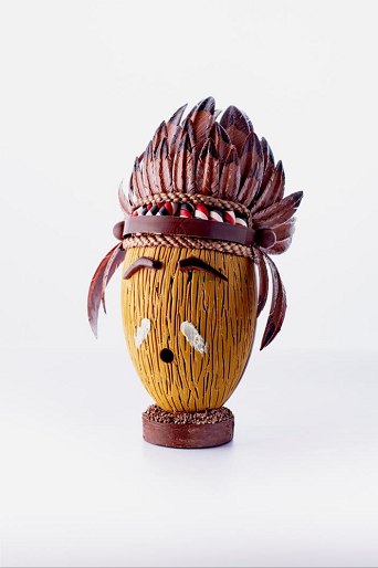 Cette reproduction de chef autochtone, plus précisément de la tribu amérindienne des Hualapai se compose de: chocolat noir Manjari 64 % et de chocolat Dulcey 32 %.