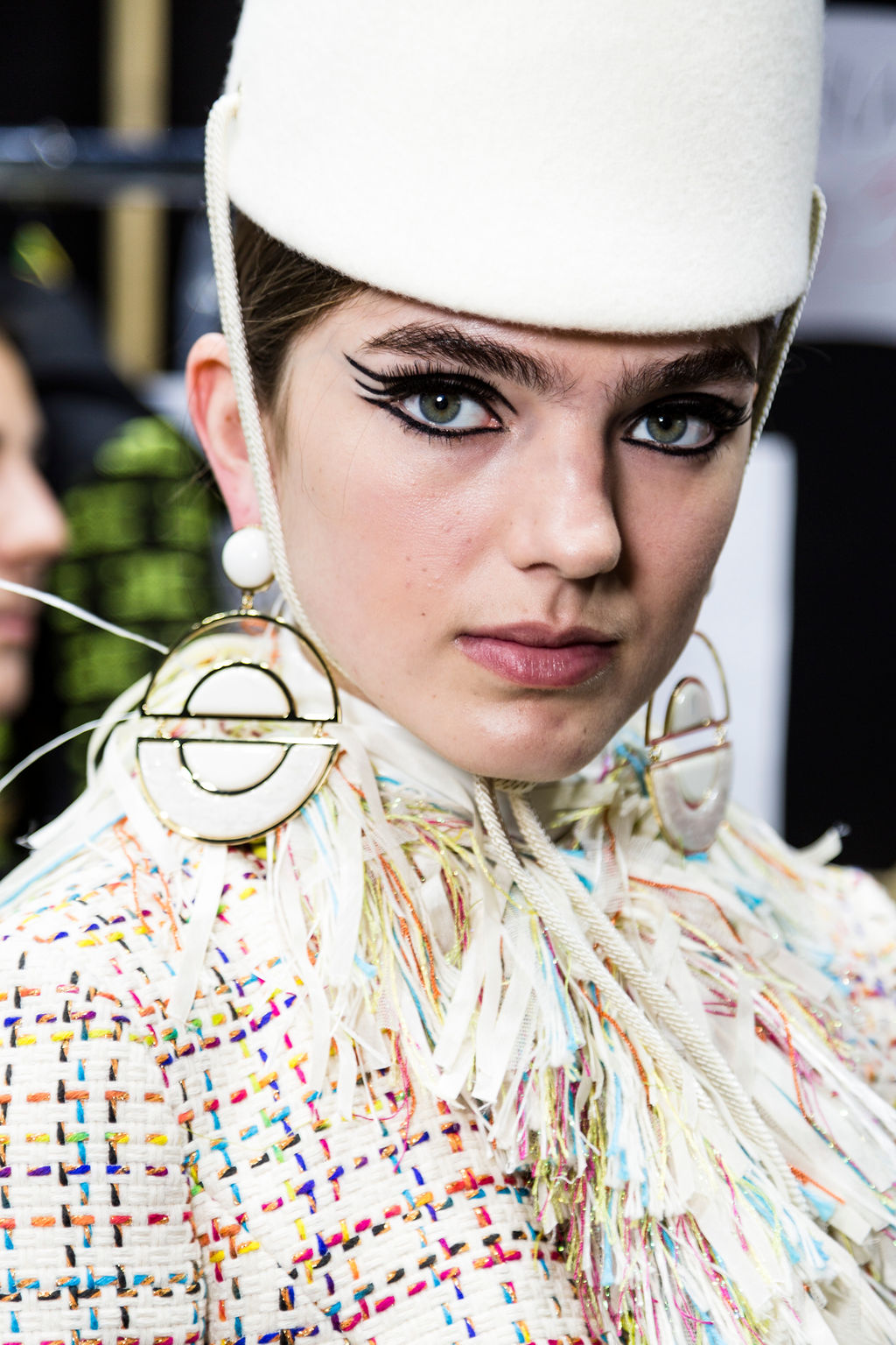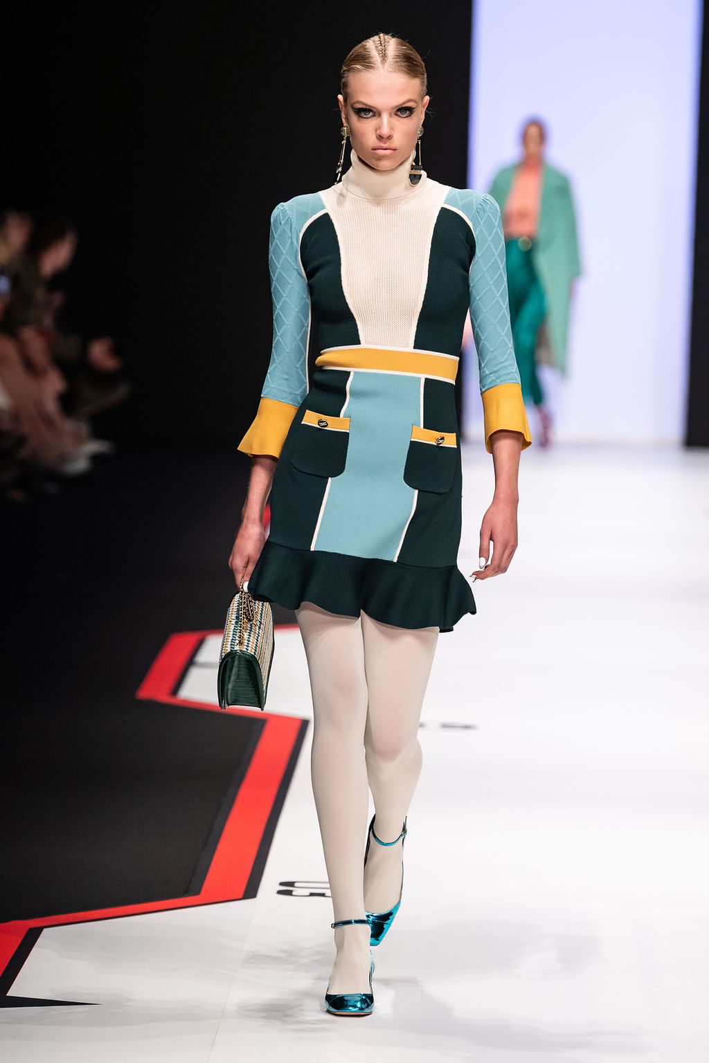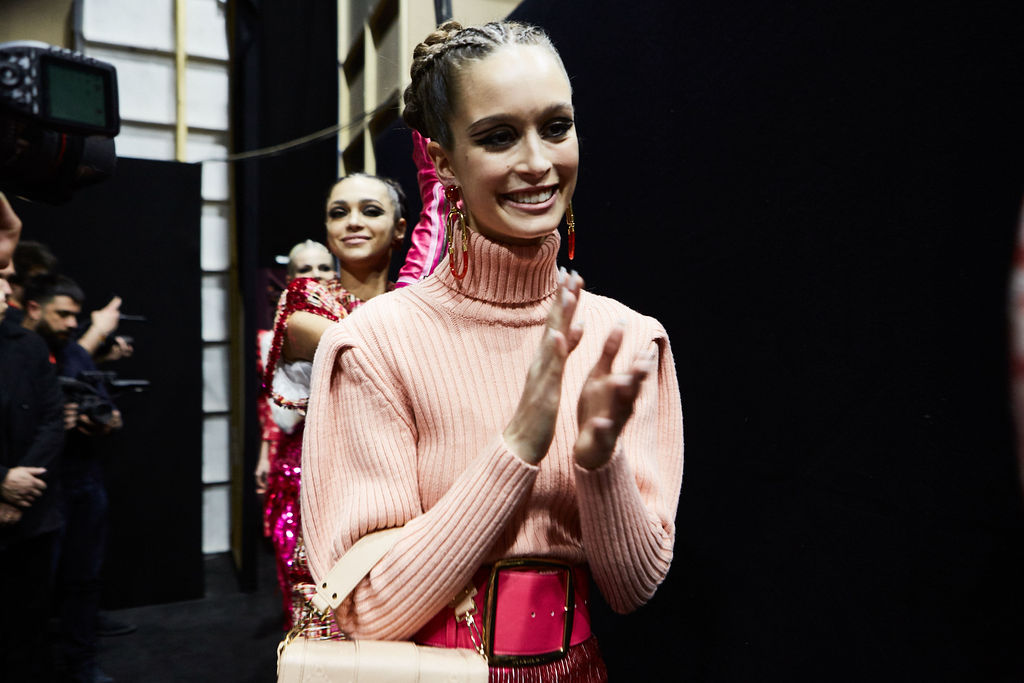 The retrò elegance of the ‘60s Lady recounting the new Elisabetta Franchi FW19-20 collection is expressed through a travel into the future of the past. In a scenario depicting the future as inspiration and as a journey, our First Lady walks down the catwalk wearing outfits expressing the woman empowerment and, simultaneously, the retrò sophistication through tweed pieces with innovative volumes and woven multicoloured fabrics evoking the galaxy colours. The vinyl, proposed exclusively in ivory, is a tribute to the space uniforms that, together with the embroidered looks made of precious materials, take us on the unexplored lunar surface. The logo takes form evoking geometric patterns reminding that the ‘60s have invented the future. The predominant palette of butter and ivory, comes alongside bold colours like fuchsia and kermit, that alternating with bottle green, blue and jade stand out on mini skirts, squared dresses and jumpsuits. Earrings shaped like a sphere and hats like helmets serve as a frame, forming a unit with the body. Pretending to live in a world of sixty years ago, this collection unveils that the future has always existed.