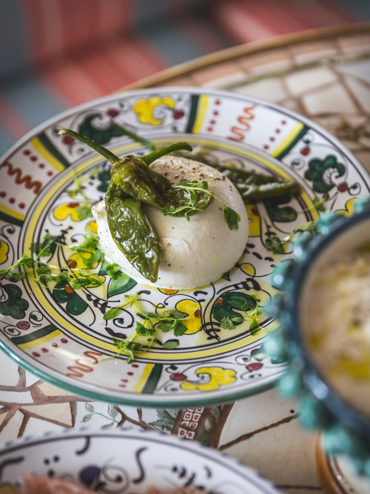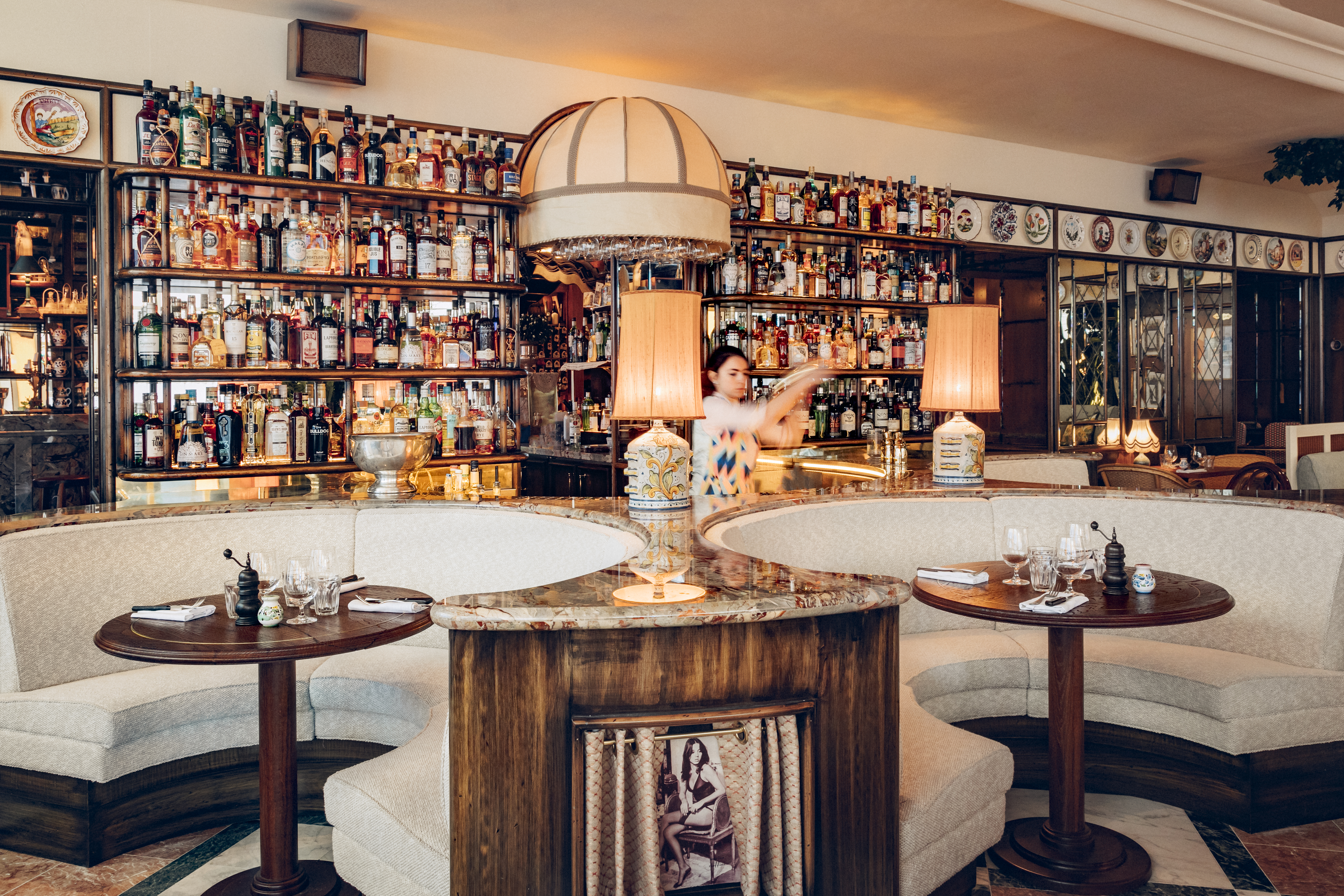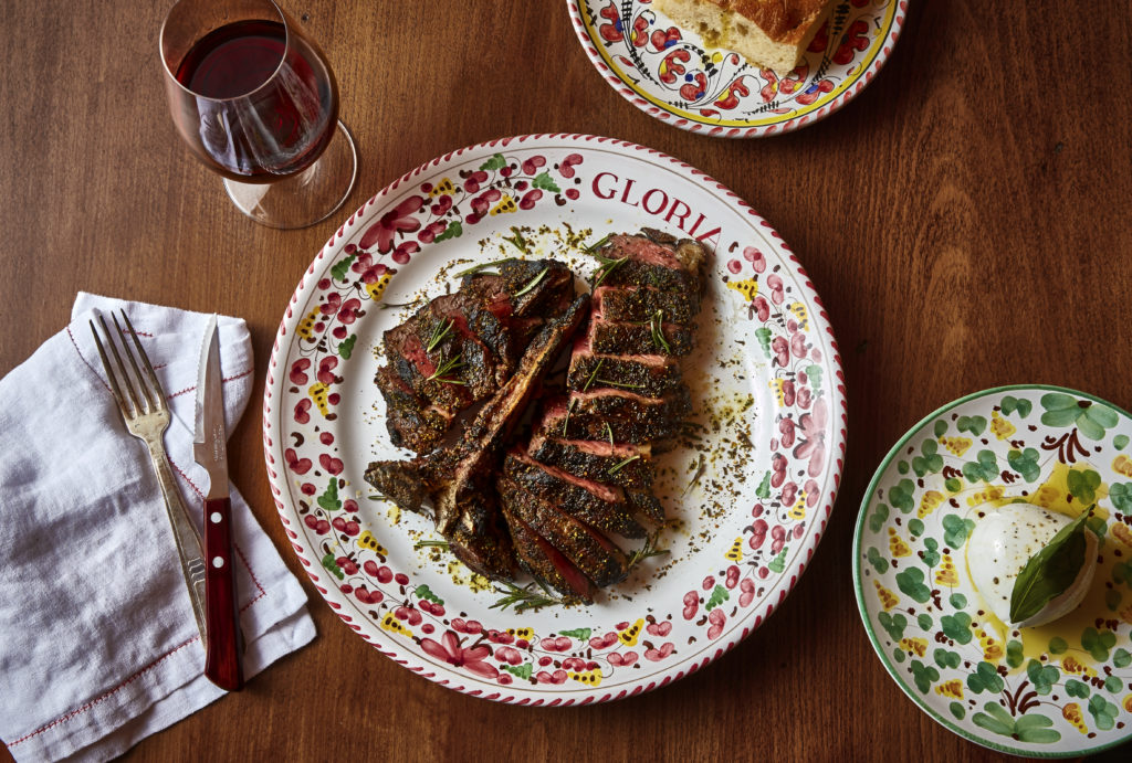 Gloria c’est un coin d’Italie, recouvert de vigne, romarin et jasmin d’été. Bar à l’entrée, un grand classique du Piémont, avec long comptoir de marbre rose et gris de Carrare. Suivi par la grande et ultra lumineuse salle à manger et ses allures de côte amalfitaine en plein soleil. Au sous- sol, ambiance seventies, miroirs au plafond et moquette loufoque-fleurie face à la grande cuisine ouverte.