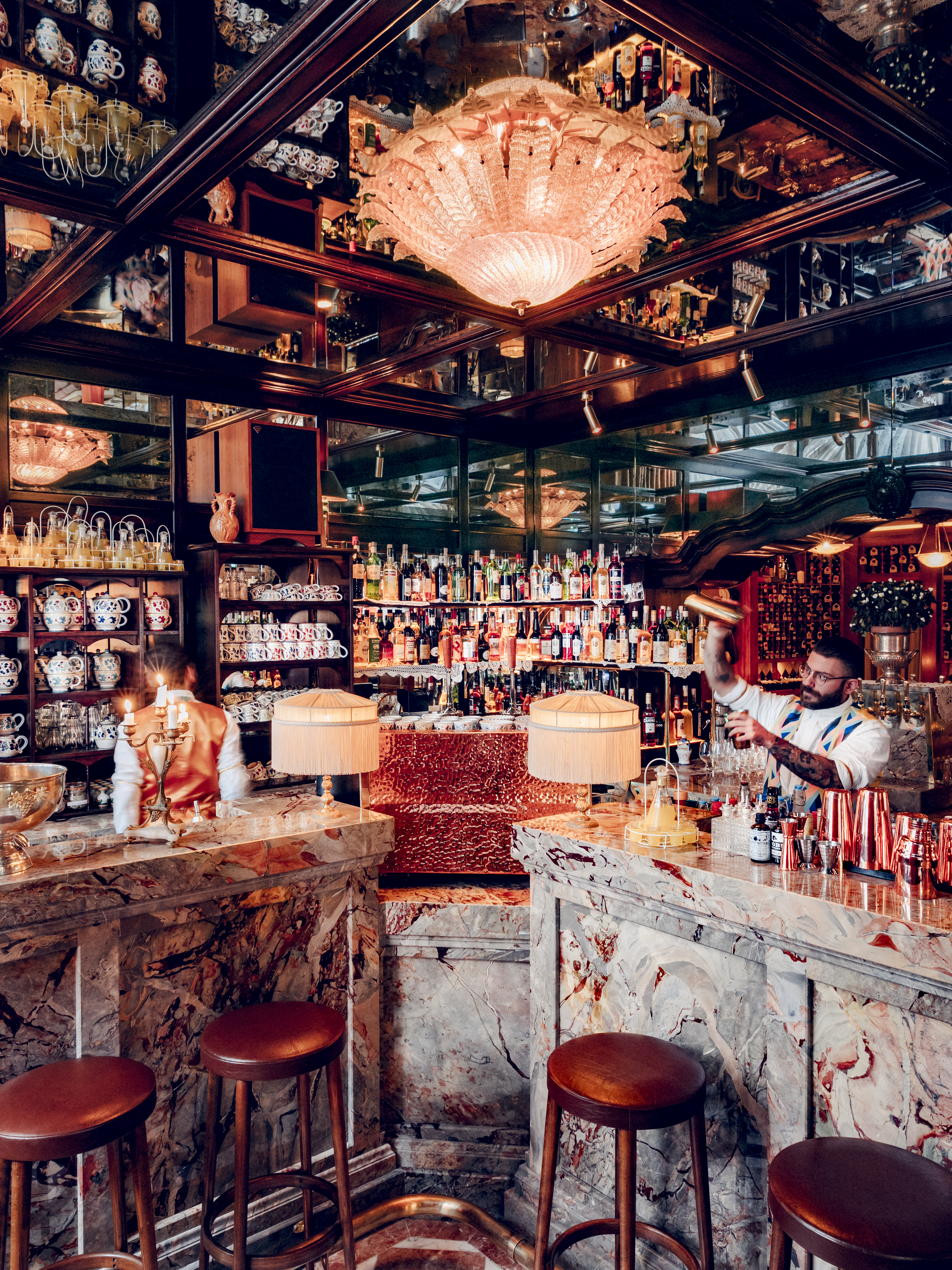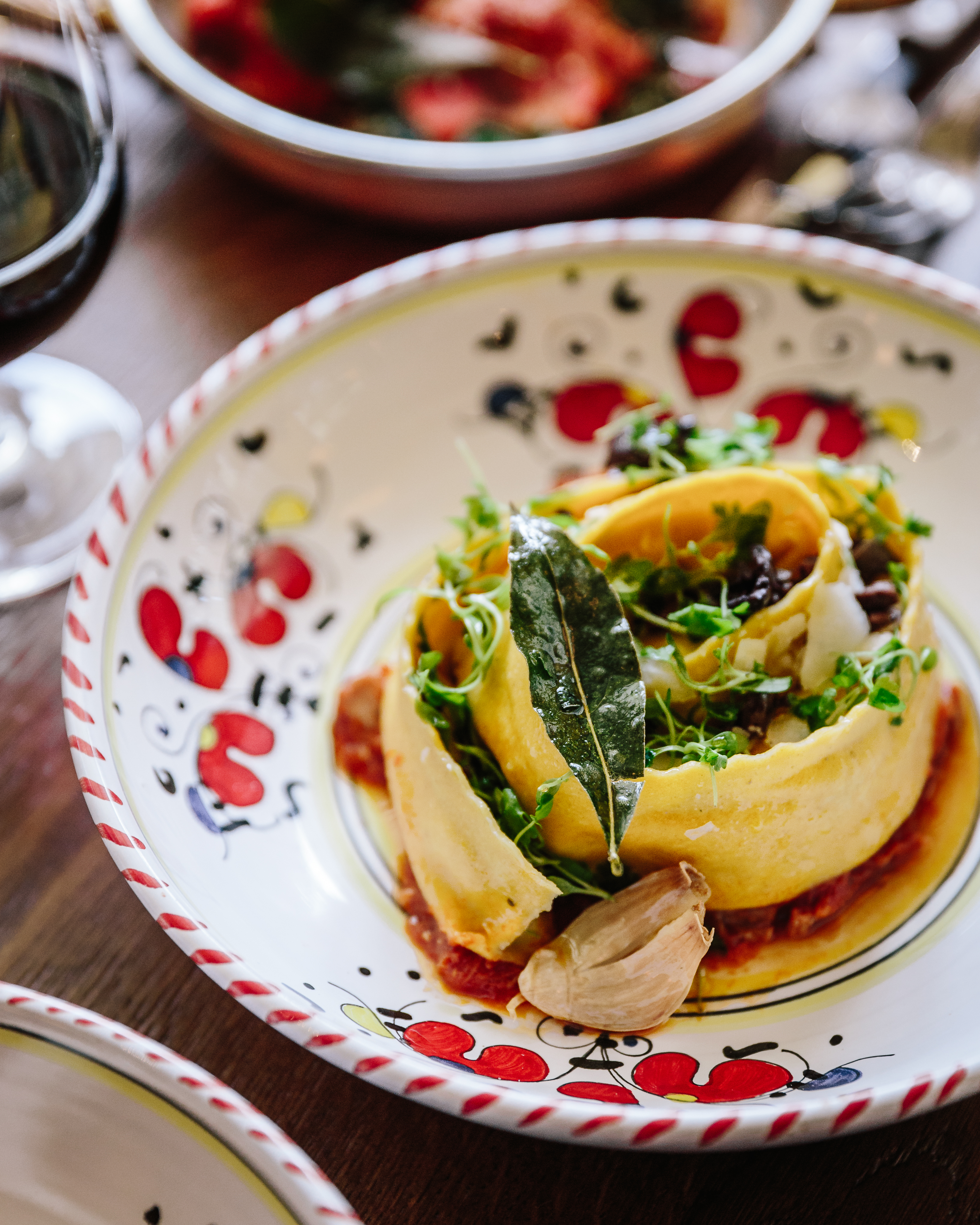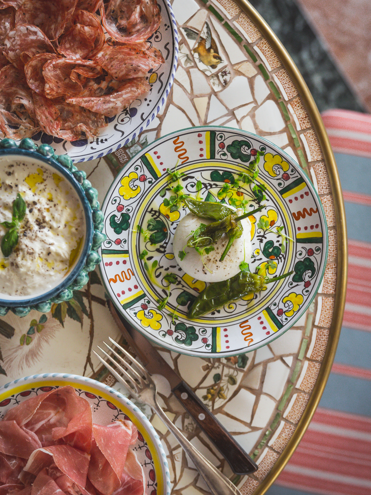 Gloria c’est un coin d’Italie, recouvert de vigne, romarin et jasmin d’été. Bar à l’entrée, un grand classique du Piémont, avec long comptoir de marbre rose et gris de Carrare. Suivi par la grande et ultra lumineuse salle à manger et ses allures de côte amalfitaine en plein soleil. Au sous- sol, ambiance seventies, miroirs au plafond et moquette loufoque-fleurie face à la grande cuisine ouverte.