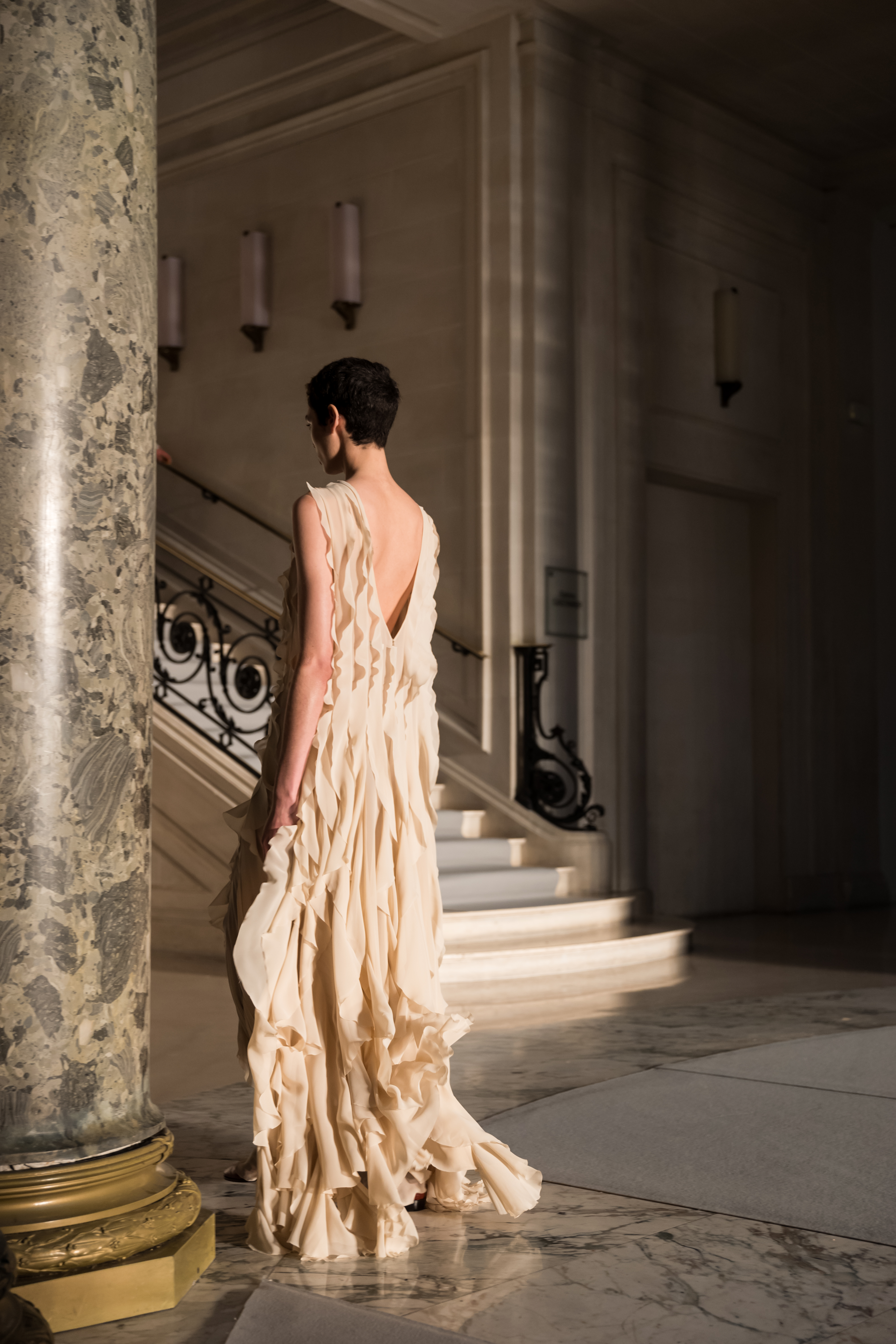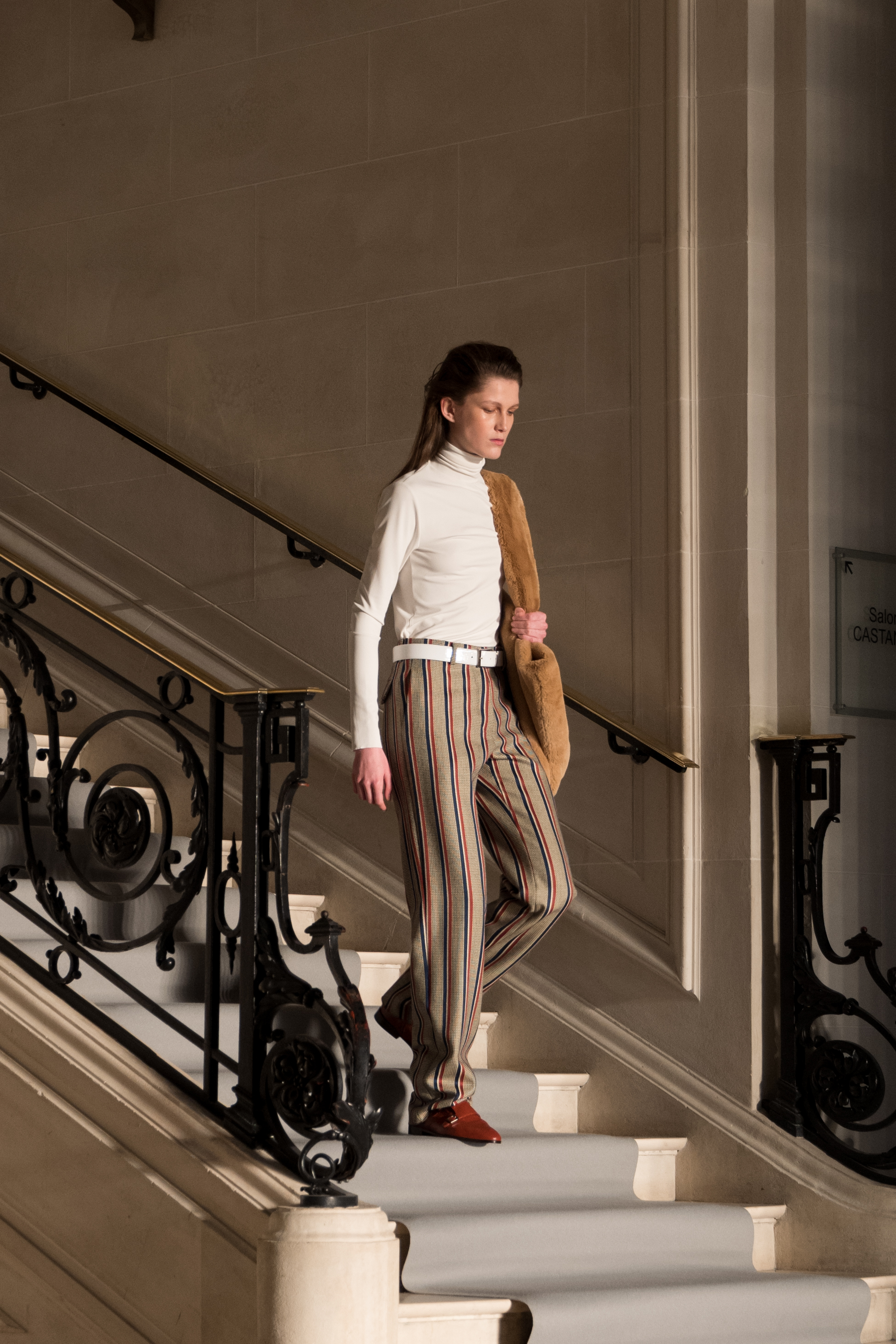 La collection Automne/Hiver 2019 de Kristina Fidelskaya est conçue autour d’un mélange de textures : de la laine peignée et du sergé de viscose lavé, des matières qui dégagent une sensation de confort et de douceur. Chaque pièce a été développée afin d’évoquer une émotion par les sens : des chemises en soie fluides et des trenchs en cuir d’agneau à imprimé alligator, des robes structurées et des manteaux en flanelle de laine. La palette de couleurs se décline en un mélange de tons noir, rouge, jaune, camel et rose.