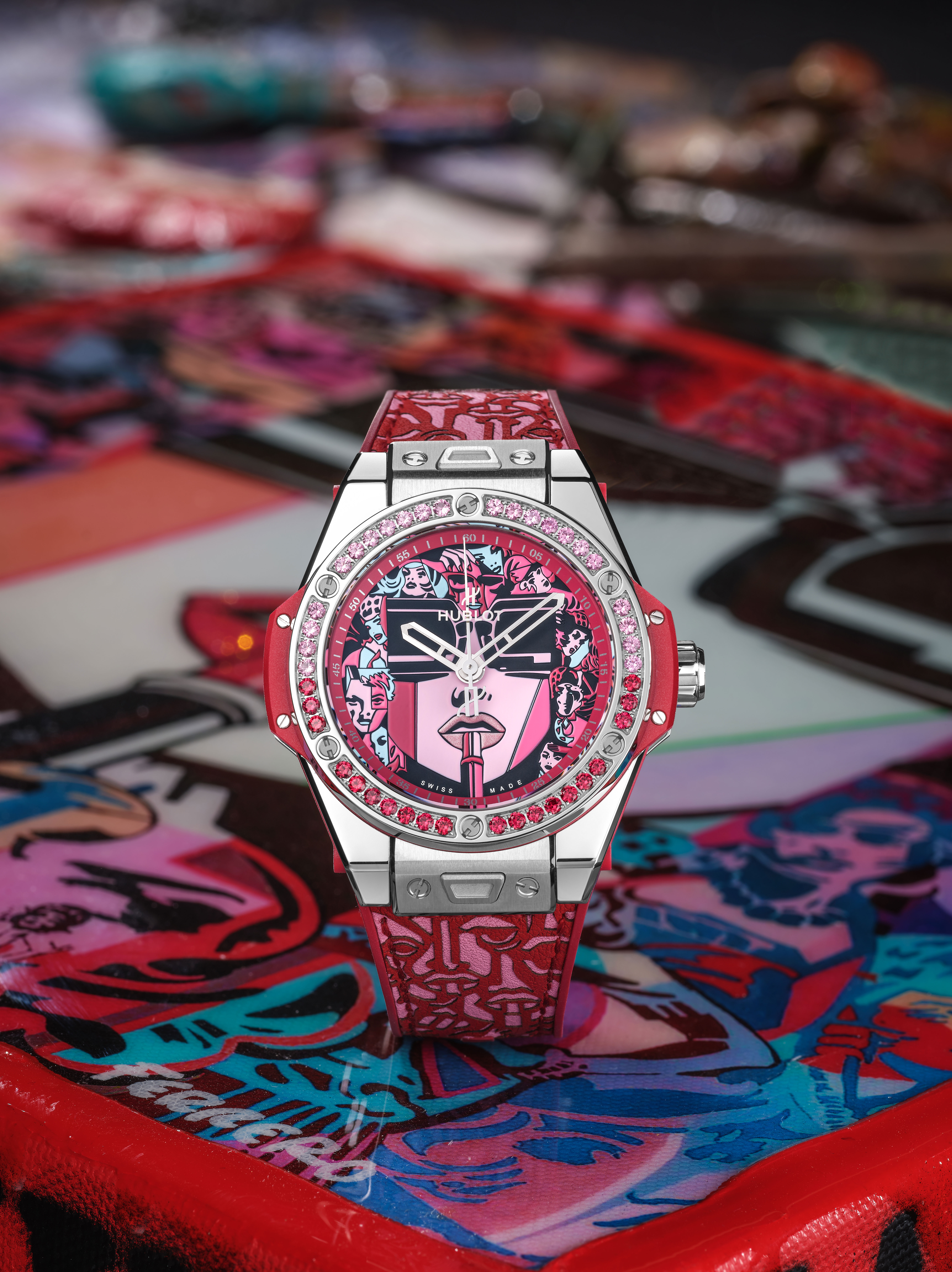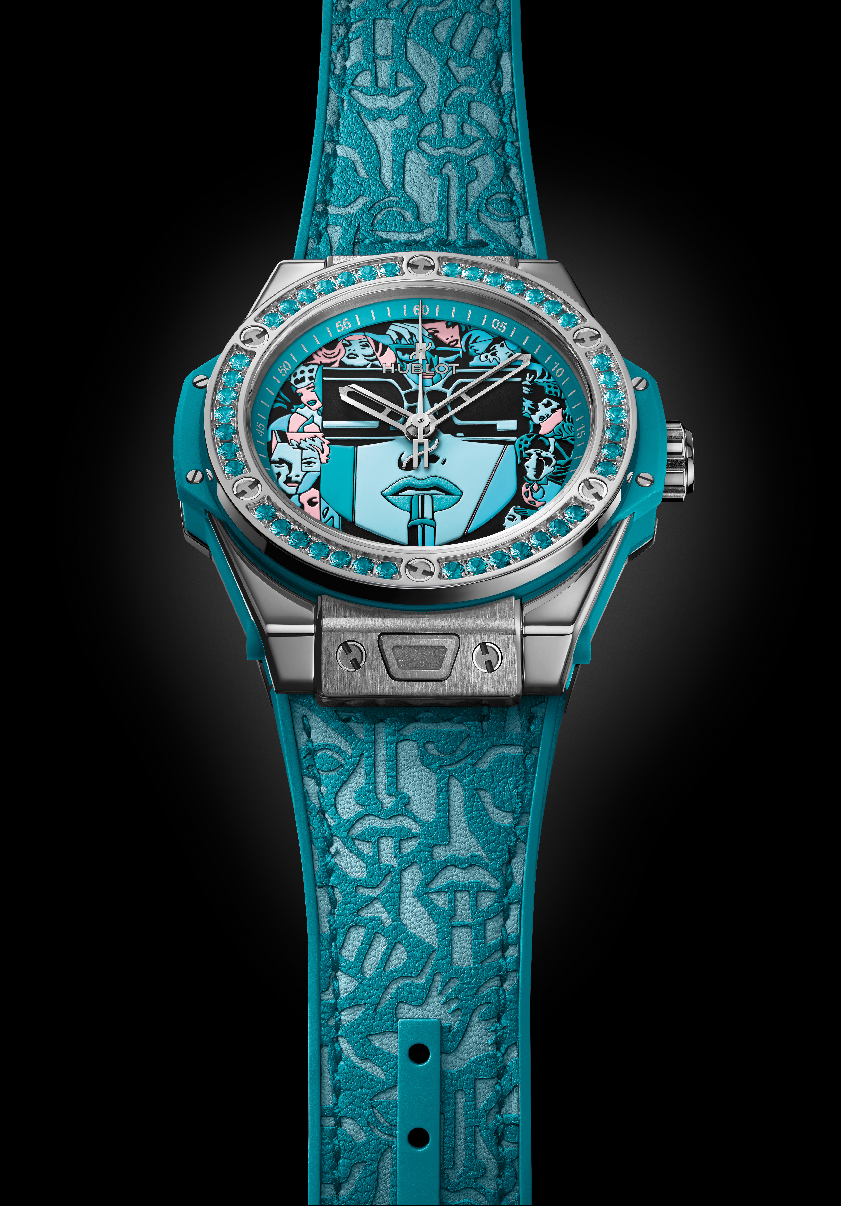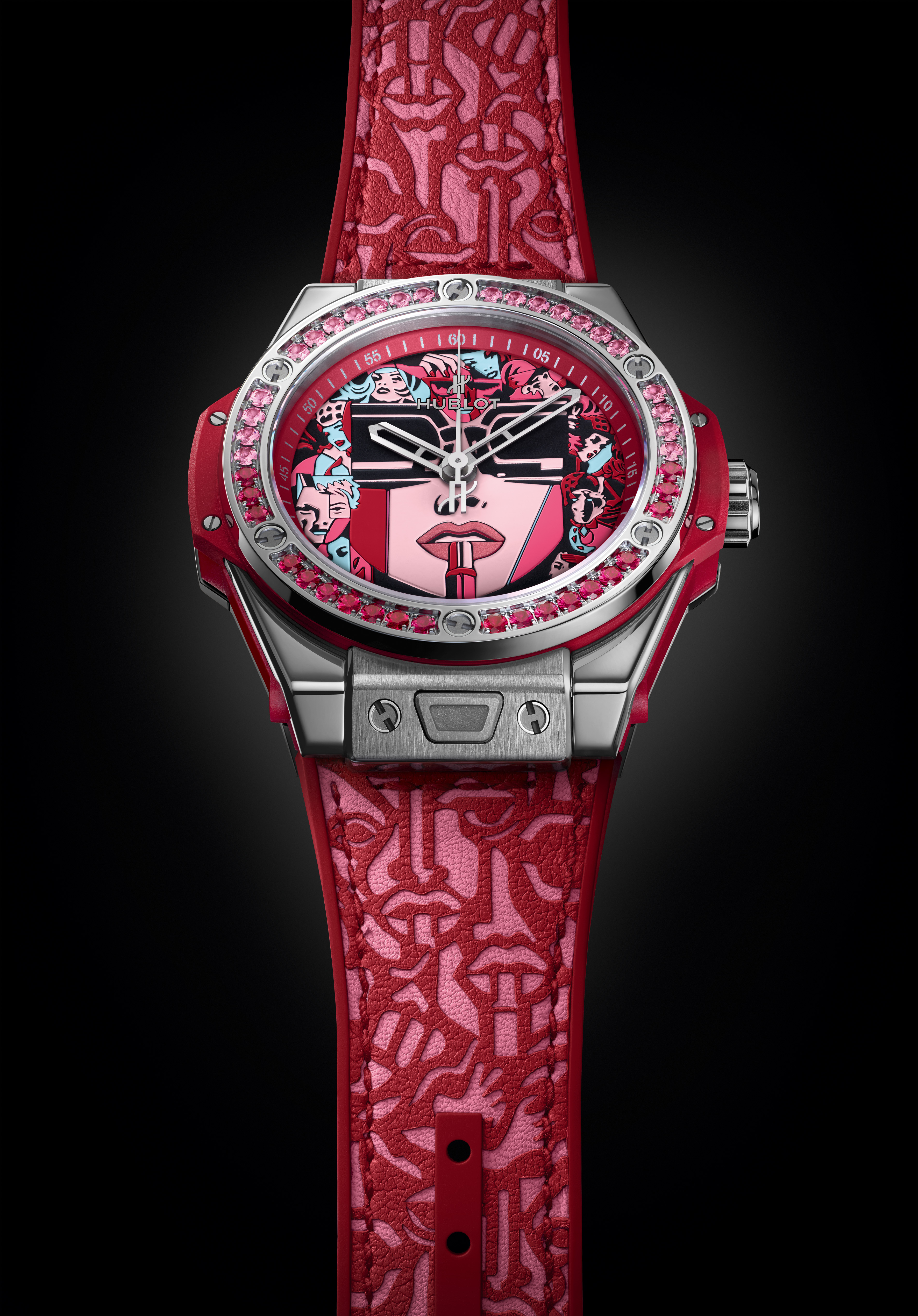 Le cadran raconte l’histoire de cette héroïne des temps modernes, Lipstick, oeuvre iconique de l’artiste. Énigmatique, derrière ses lunettes noires, elle demeure souveraine face aux imprévus, affirme sa féminité, armée de son rouge à lèvres. Spinelles en camaïeu de rouge, topazes pour la déclinaison en turquoise, quarante-deux pierres fines ornent la lunette du nouveau boîtier de 39 mm, ajusté à ses poignets féminins. En une pression, le bracelet cuir fait place à la version alligator et caoutchouc, une touche de sophistication appropriée à l’instant. Déclinée en rouge et turquoise, la série spéciale se dote du système d’attache breveté « One click » et sera éditée en 50 exemplaires dans chacun des tons.