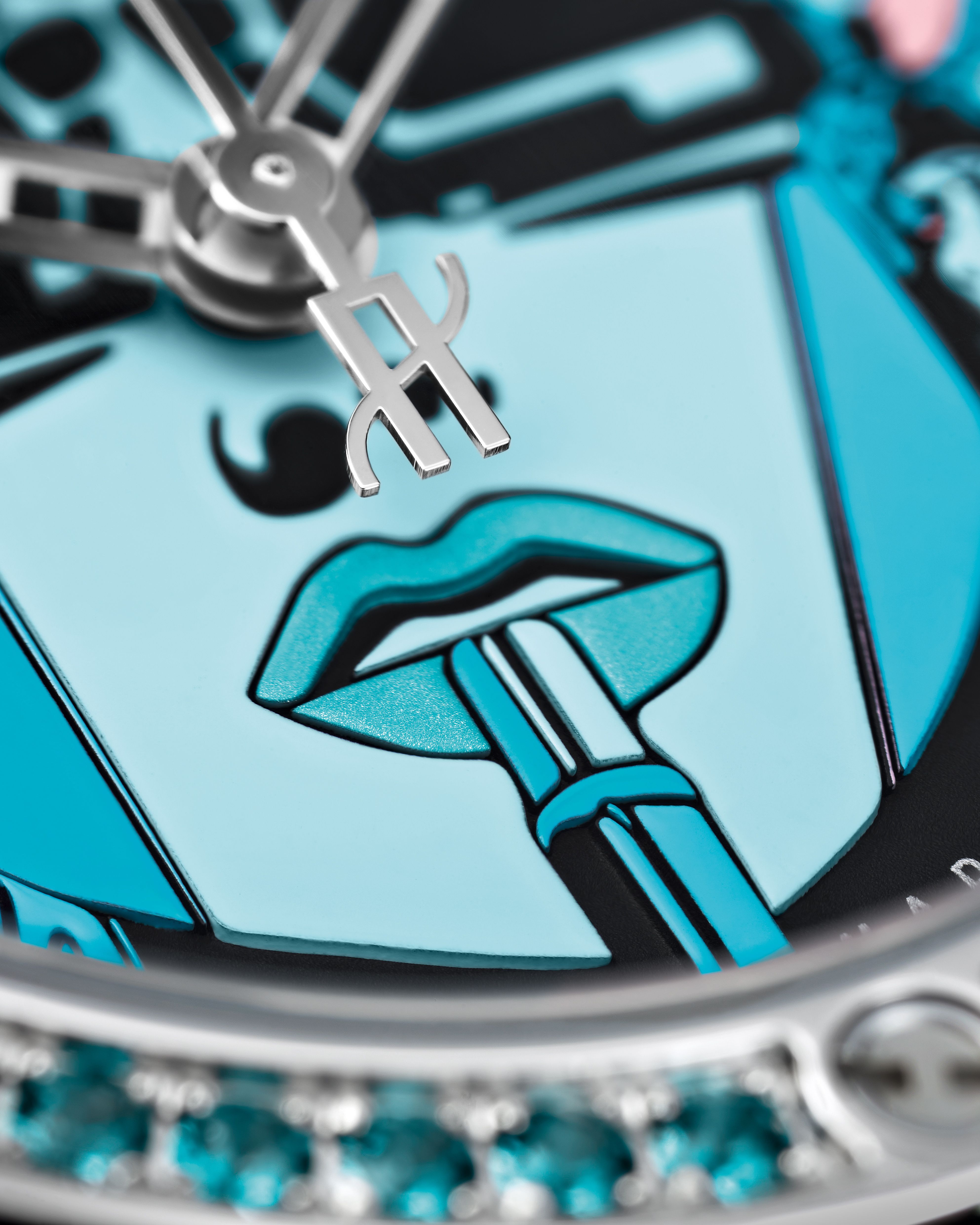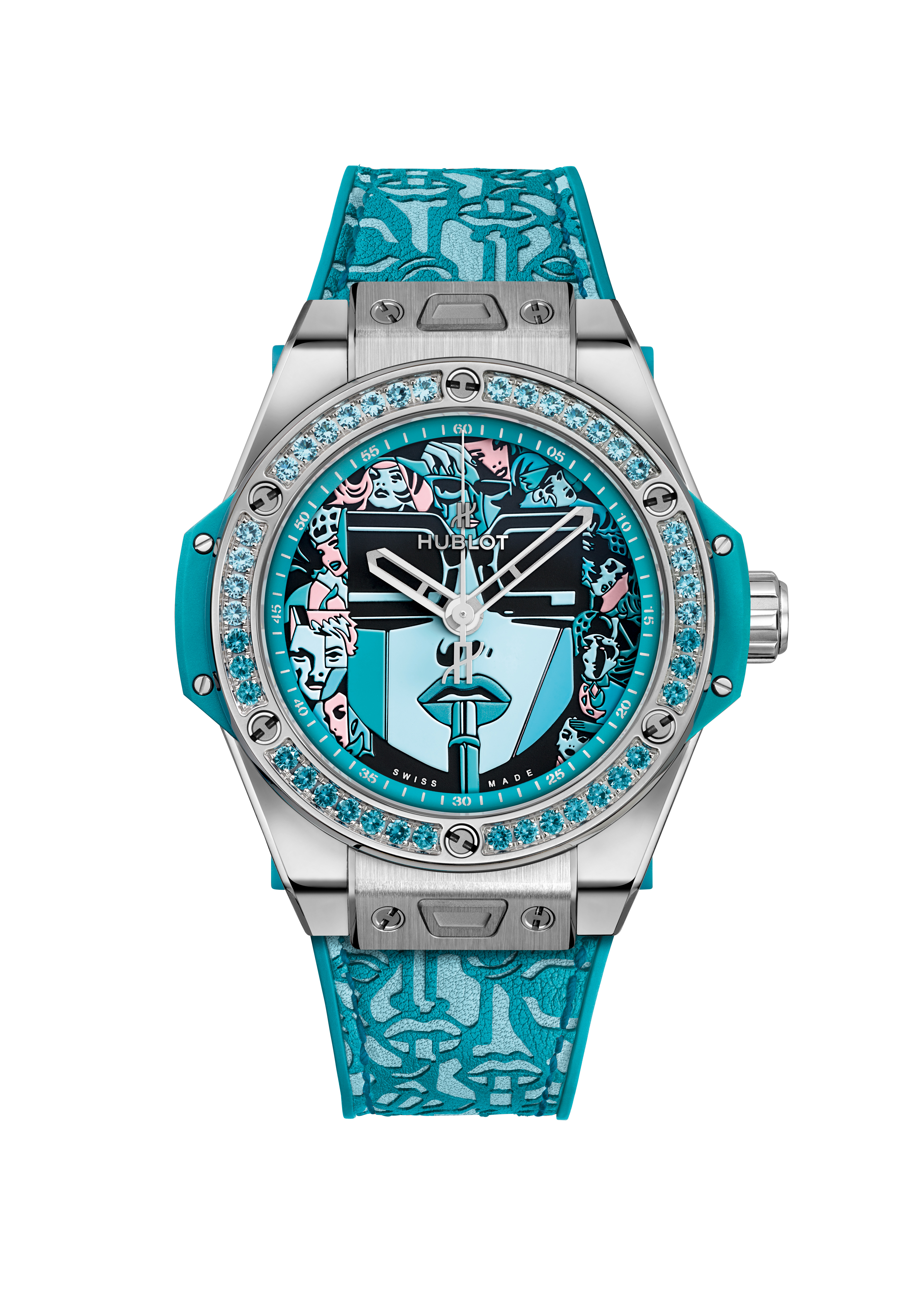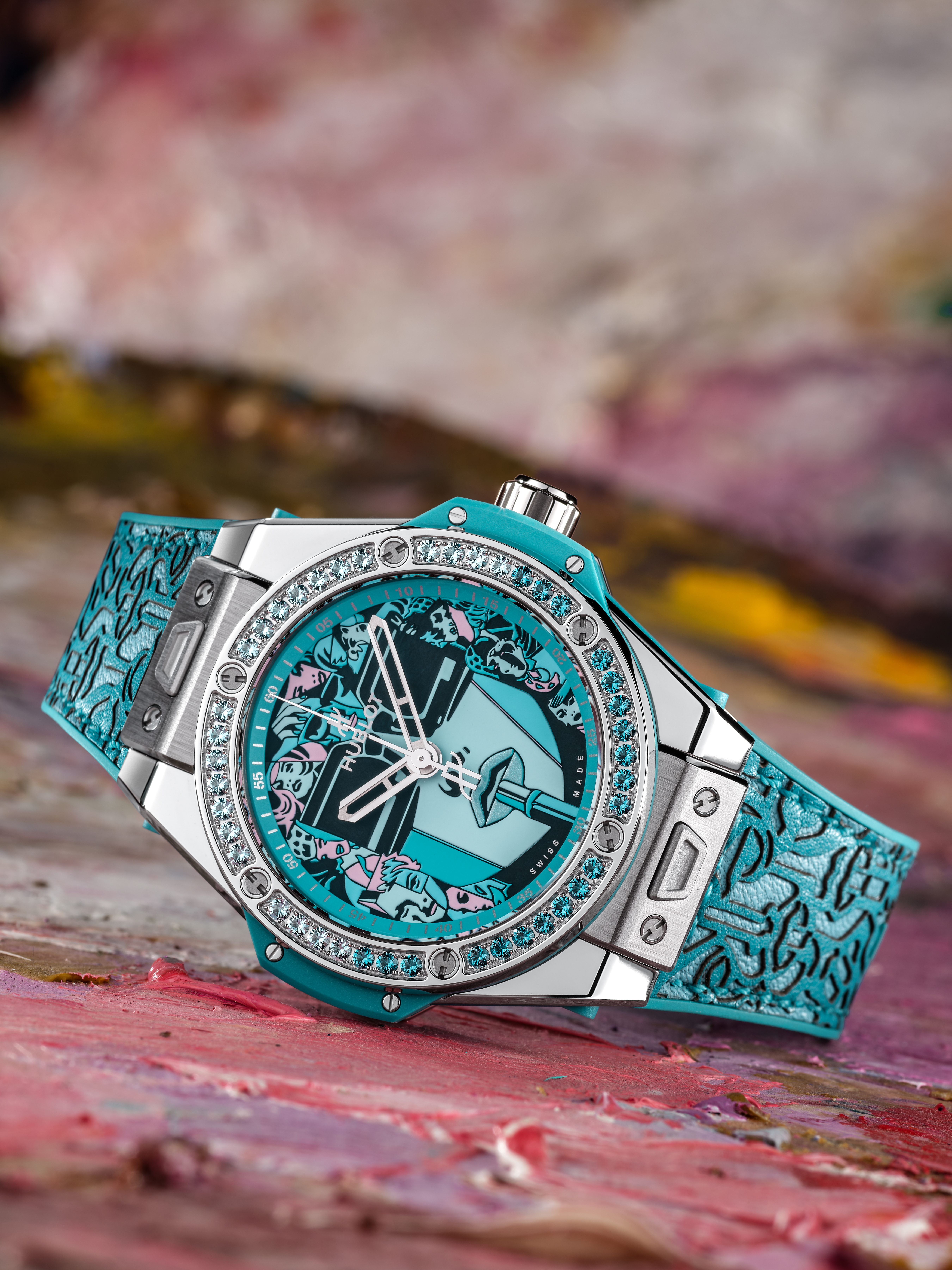 Le cadran raconte l’histoire de cette héroïne des temps modernes, Lipstick, oeuvre iconique de l’artiste. Énigmatique, derrière ses lunettes noires, elle demeure souveraine face aux imprévus, affirme sa féminité, armée de son rouge à lèvres. Spinelles en camaïeu de rouge, topazes pour la déclinaison en turquoise, quarante-deux pierres fines ornent la lunette du nouveau boîtier de 39 mm, ajusté à ses poignets féminins. En une pression, le bracelet cuir fait place à la version alligator et caoutchouc, une touche de sophistication appropriée à l’instant. Déclinée en rouge et turquoise, la série spéciale se dote du système d’attache breveté « One click » et sera éditée en 50 exemplaires dans chacun des tons.