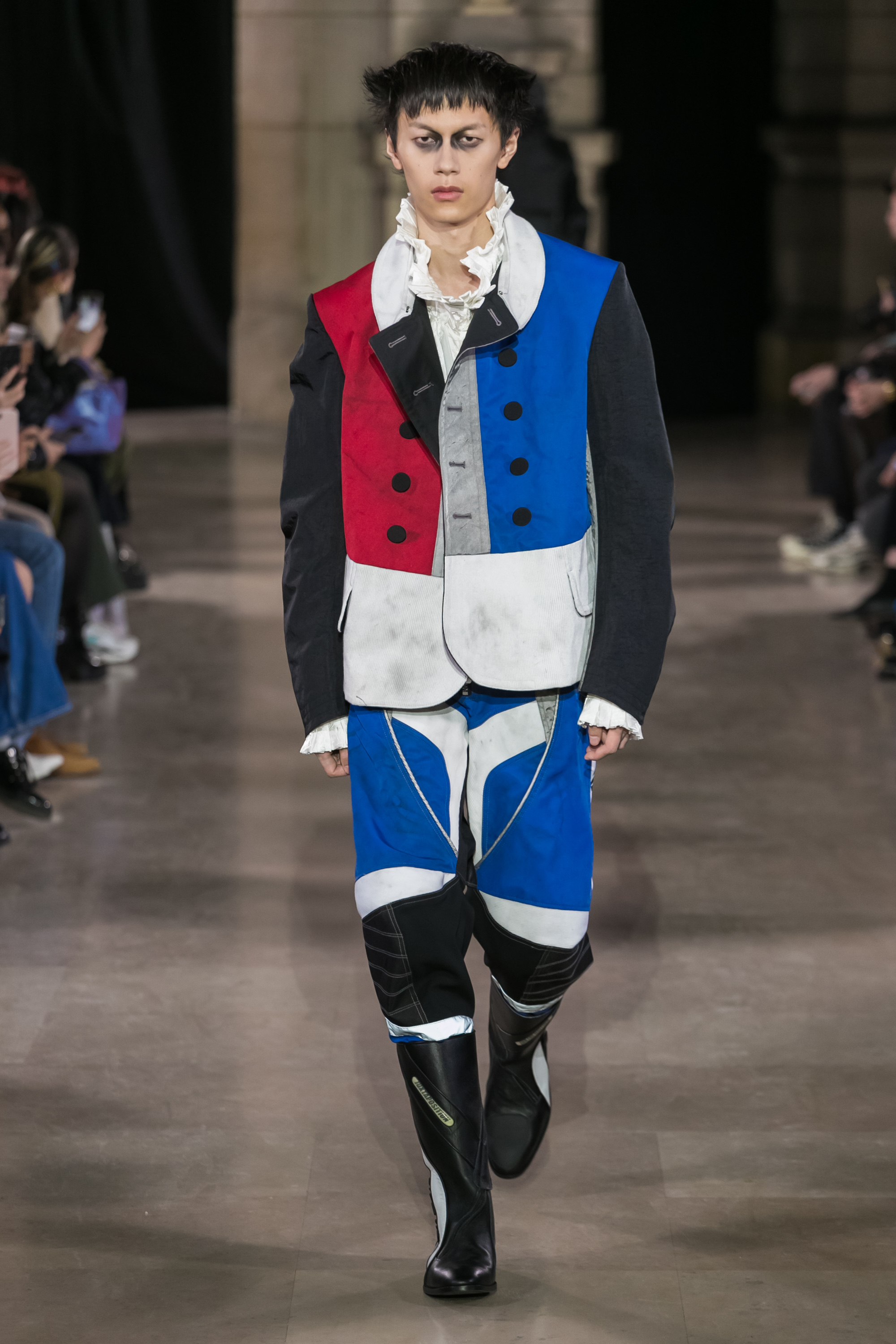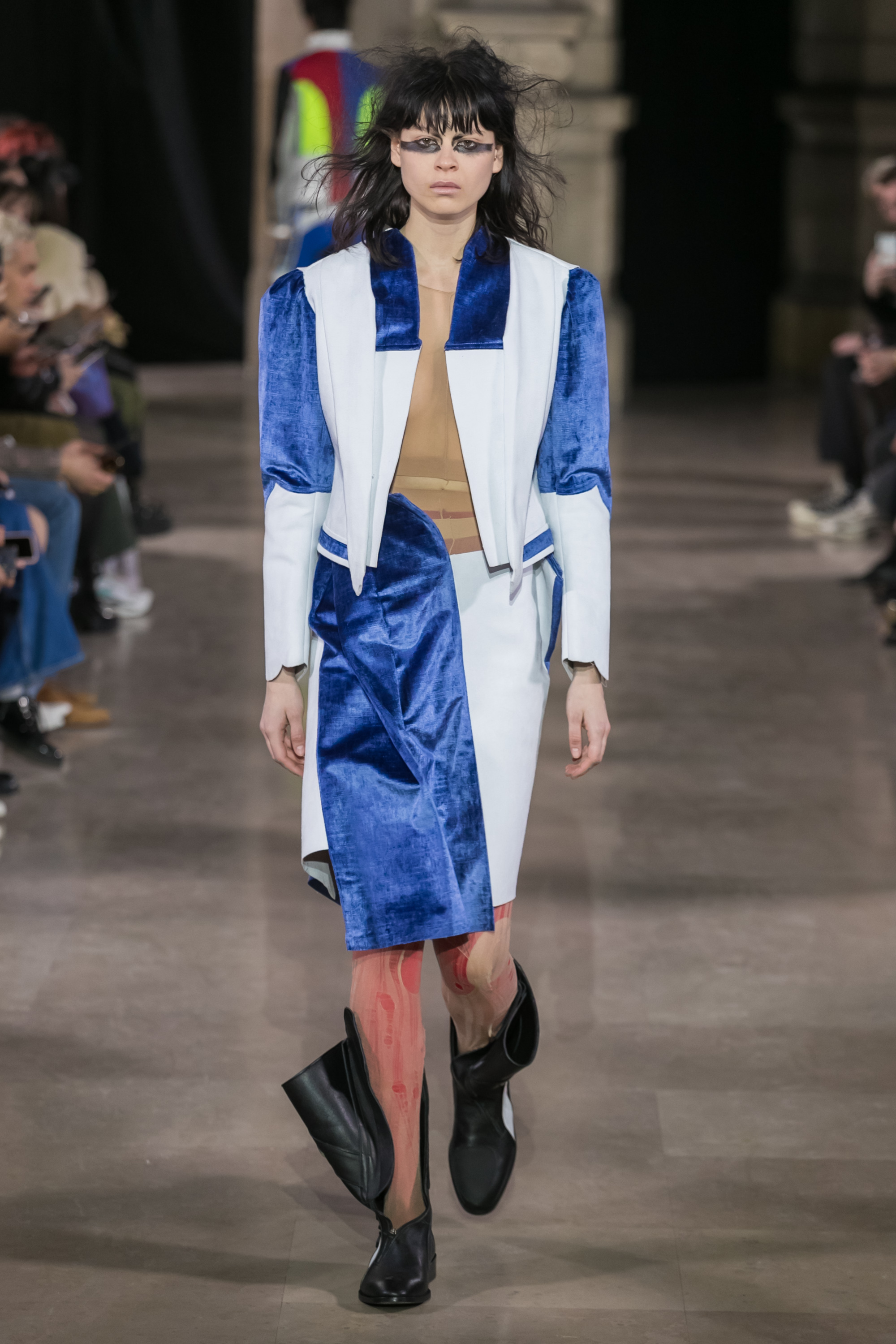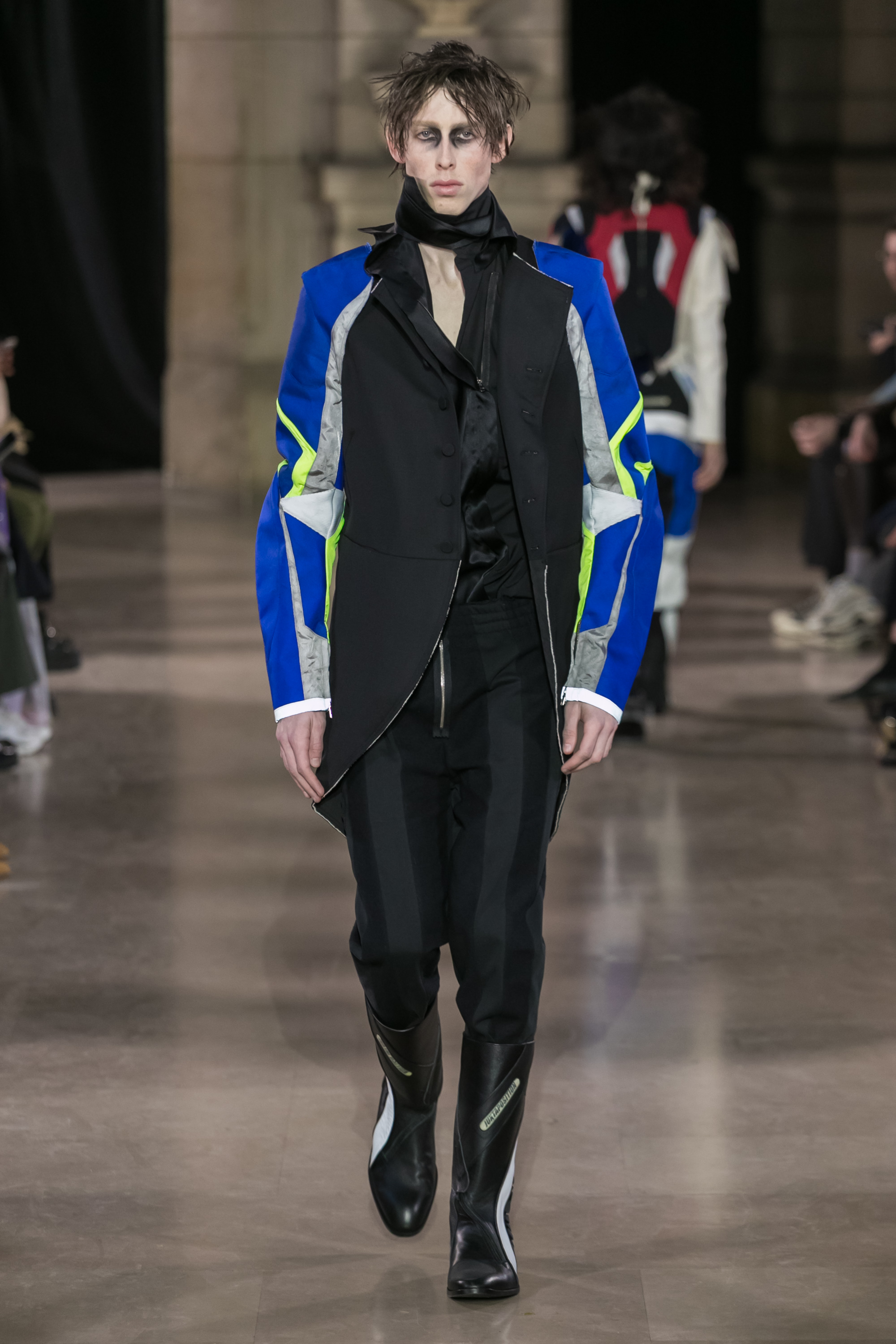 MOOHONG’s Fall-Winter 2019 collection travels across time and space, aptly fusing 18th century-inspired garments with motorcycle and sportswear aesthetics. The fabrics were transformed to reflect the passing of time and subtly tinged with ink. Boiled wool combines with velvet and synthetic fabrics in a playfully anachronistic patchwork. Vintage pieces were dissected to reproduce the traditional stitching of 18th century suits with a deliberate contemporary twist. Dark romanticism is revived through contrasts and juxtaposition.