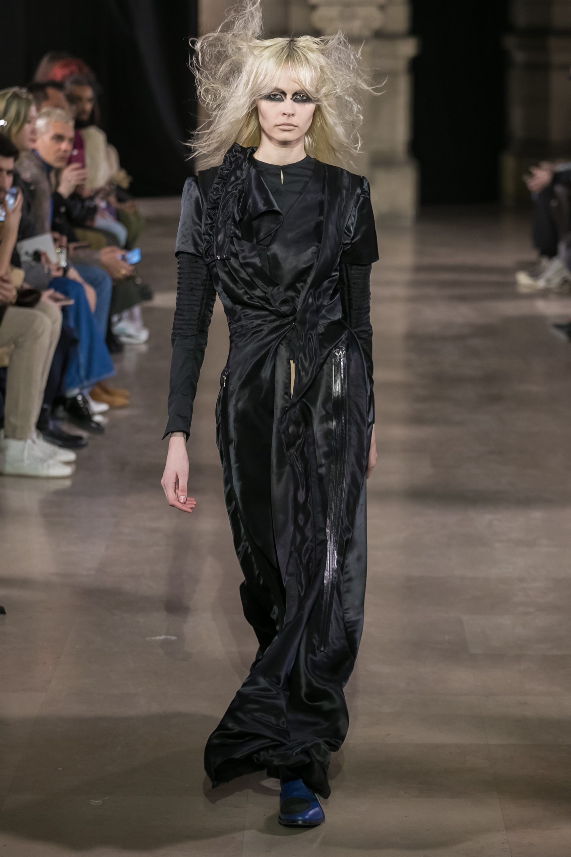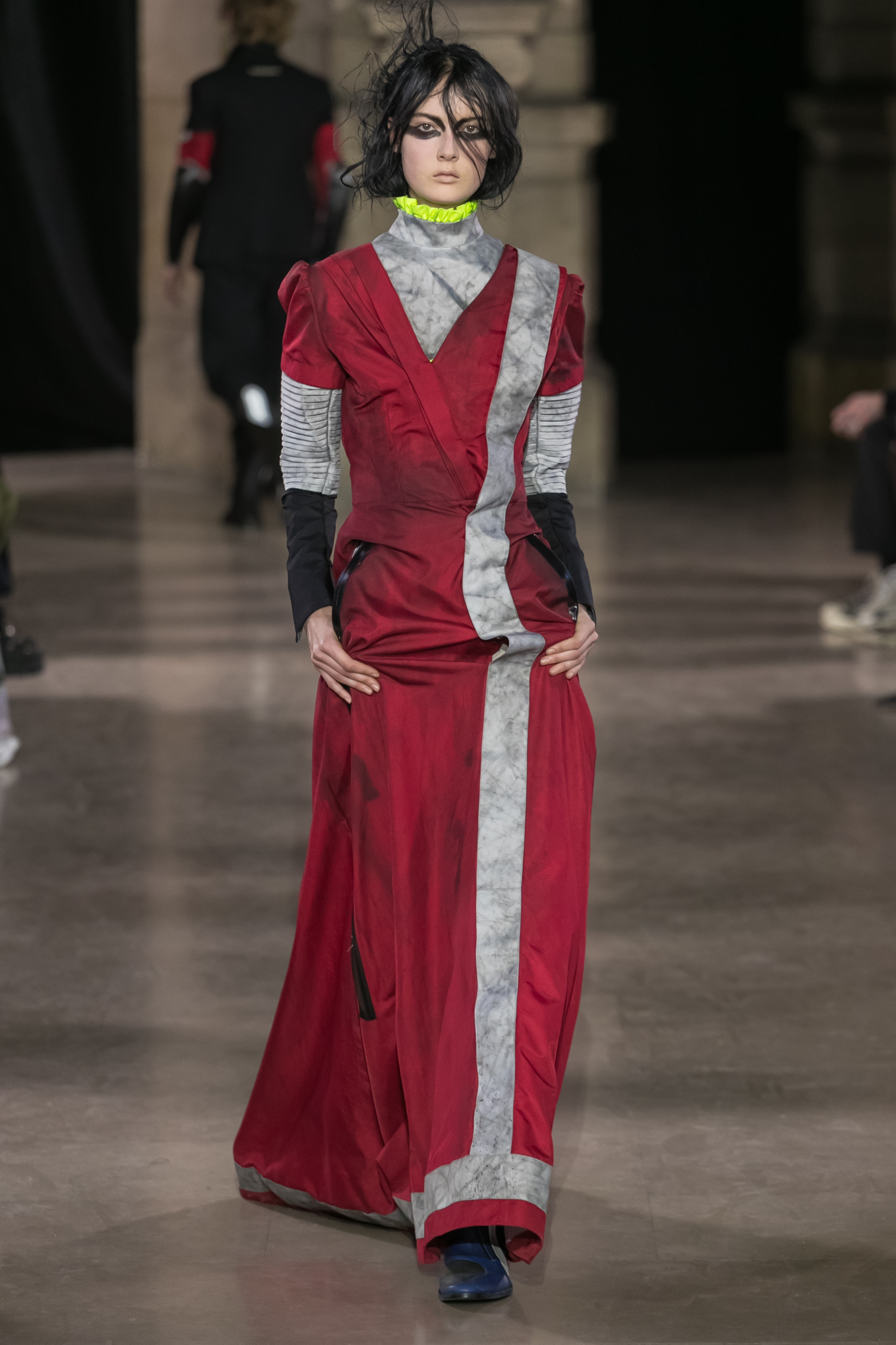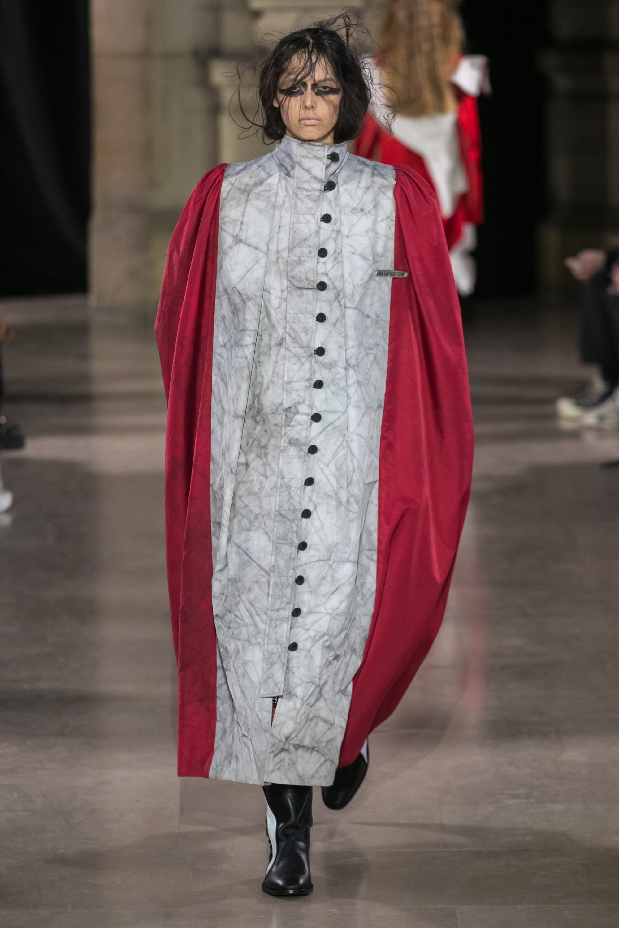 MOOHONG’s Fall-Winter 2019 collection travels across time and space, aptly fusing 18th century-inspired garments with motorcycle and sportswear aesthetics. The fabrics were transformed to reflect the passing of time and subtly tinged with ink. Boiled wool combines with velvet and synthetic fabrics in a playfully anachronistic patchwork. Vintage pieces were dissected to reproduce the traditional stitching of 18th century suits with a deliberate contemporary twist. Dark romanticism is revived through contrasts and juxtaposition.