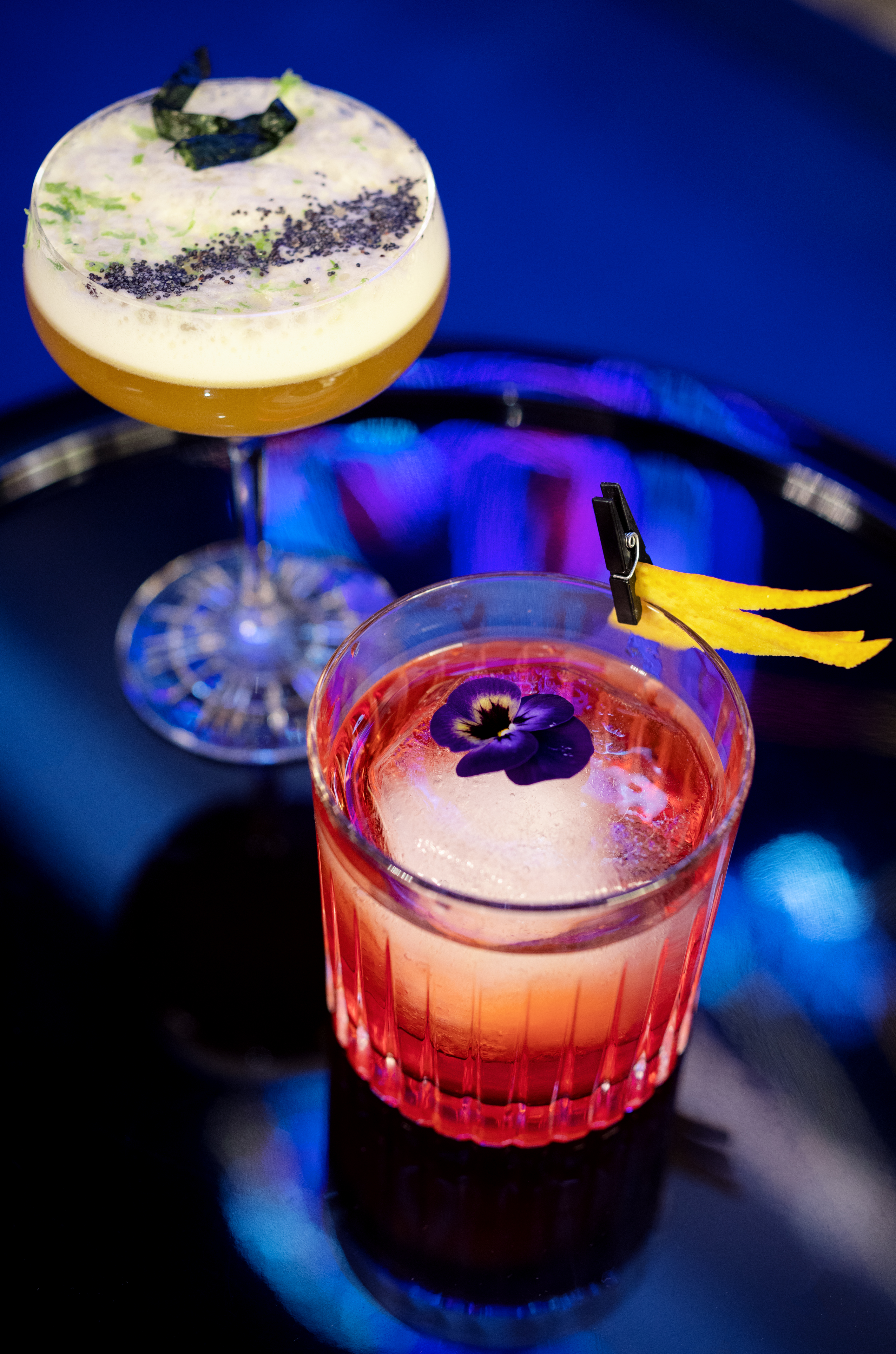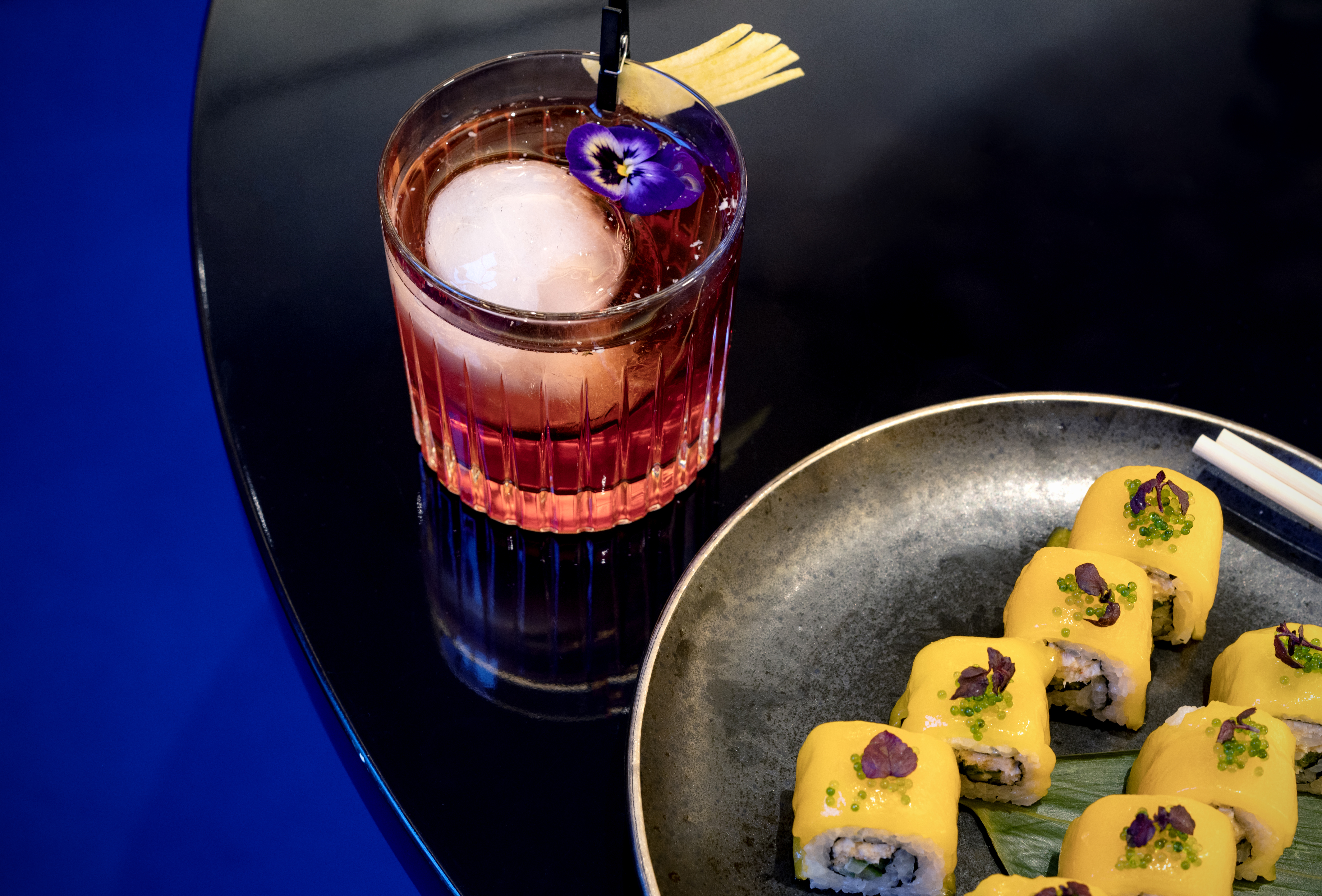 On y fait escale – avant de rejoindre le restaurant ou au moment de le quitter – pour déguster des cocktails aux notes japonisantes dans une ambiance plus festive et voguer dans les halos de l’installation de néons «En suspens», signée de l’artiste Julie Gauthron.