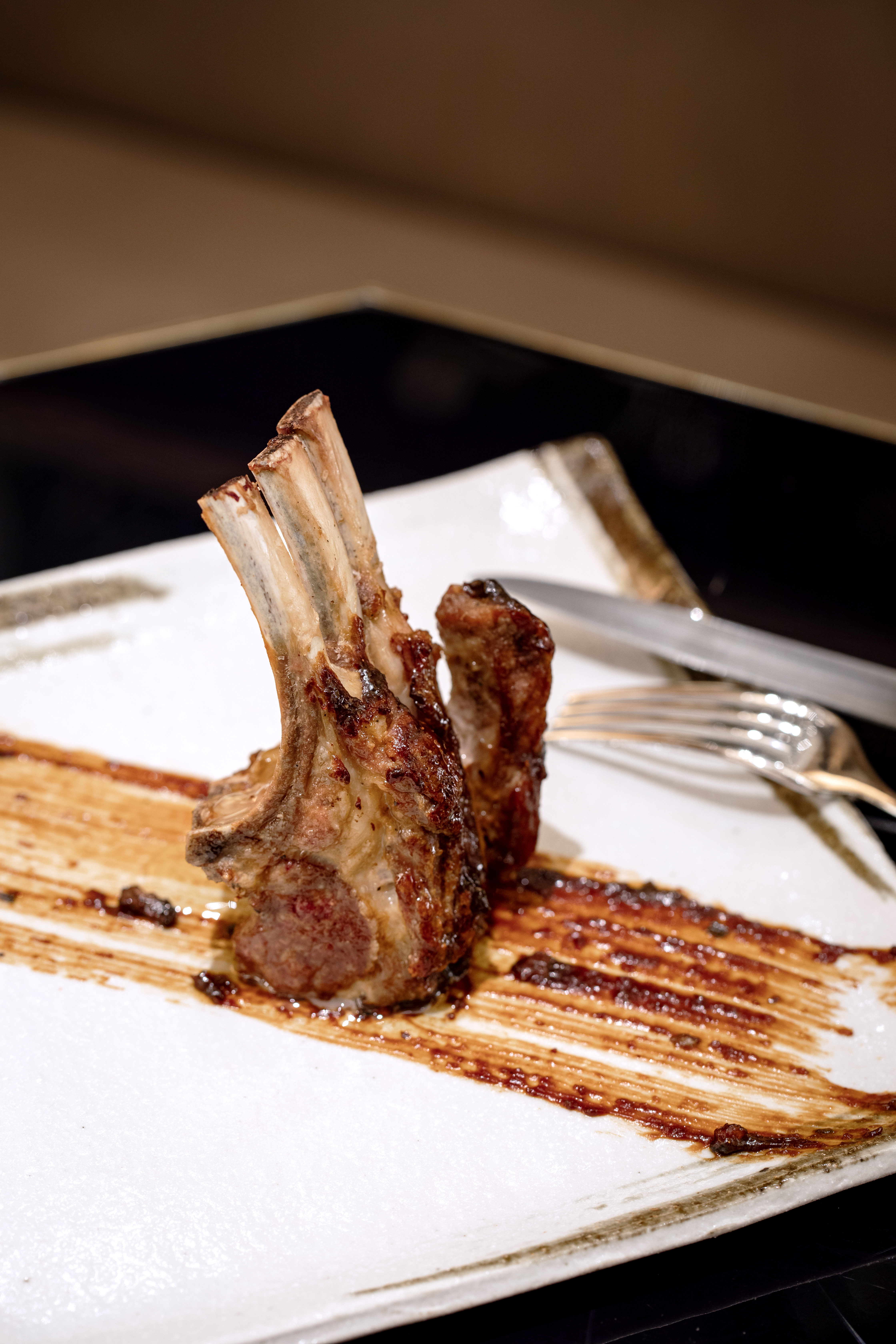 Le carré d’agneau au miso rouge détonne par son originalité, la belle côte de bœuf offre des perspectives de partage qu’on retrouve tout au long de la carte.