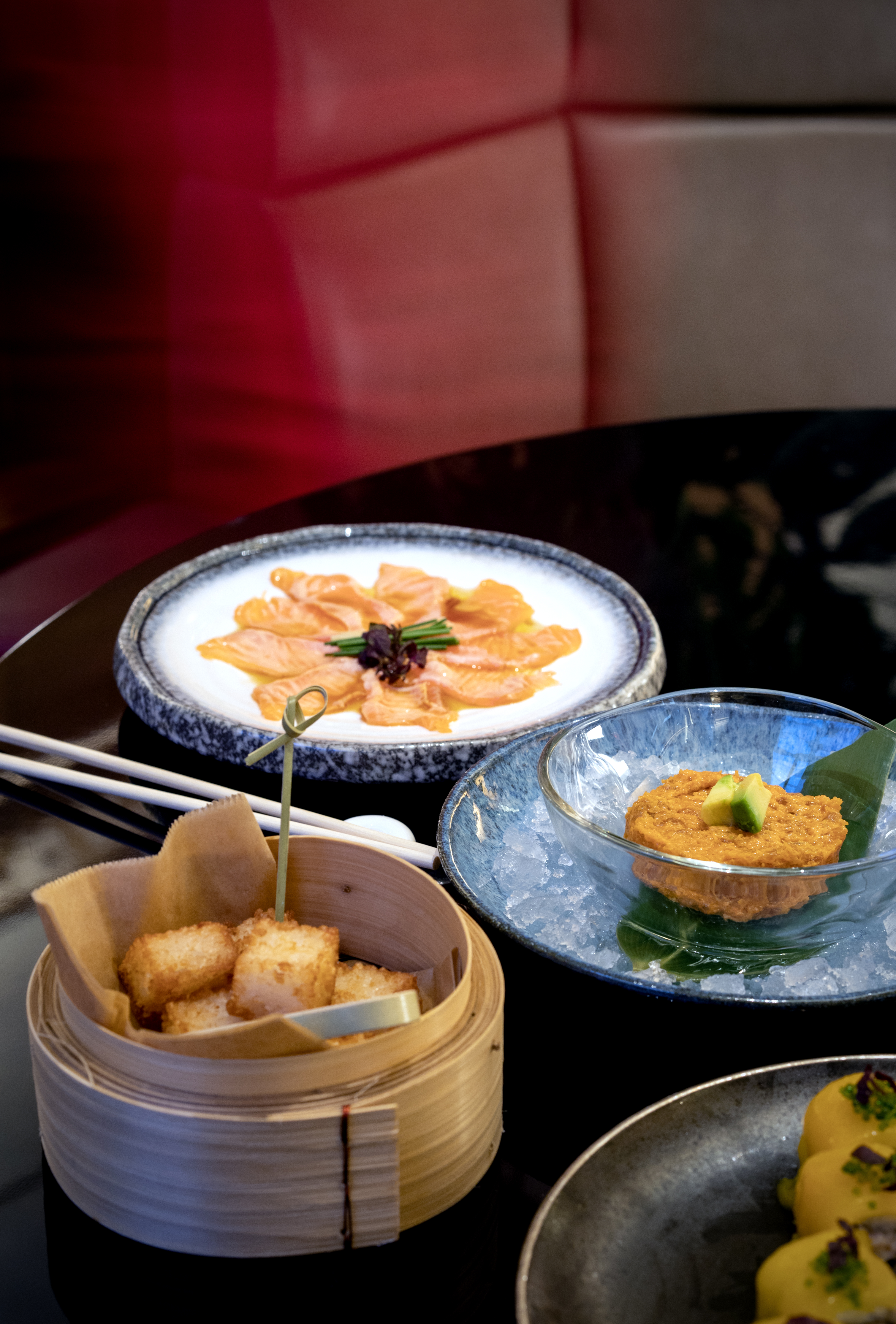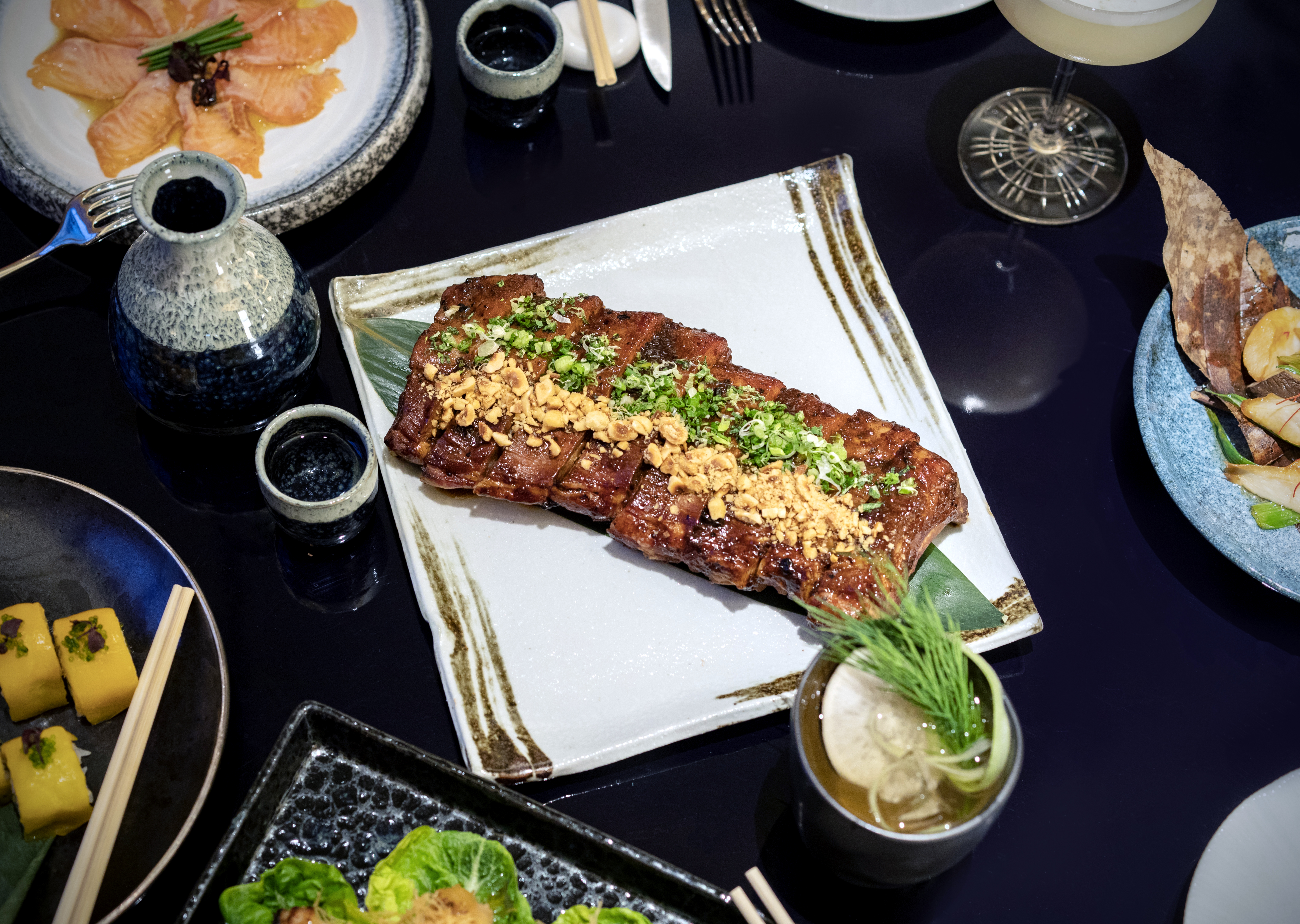 Le tataki de bœuf, subtilement parfumé à la truffe noire, la finesse d’un carpaccio de saumon aux arômes d’agrumes japonais, la délicatesse gourmande d’un maki en tempura mêlant foie gras et anguille grillée…