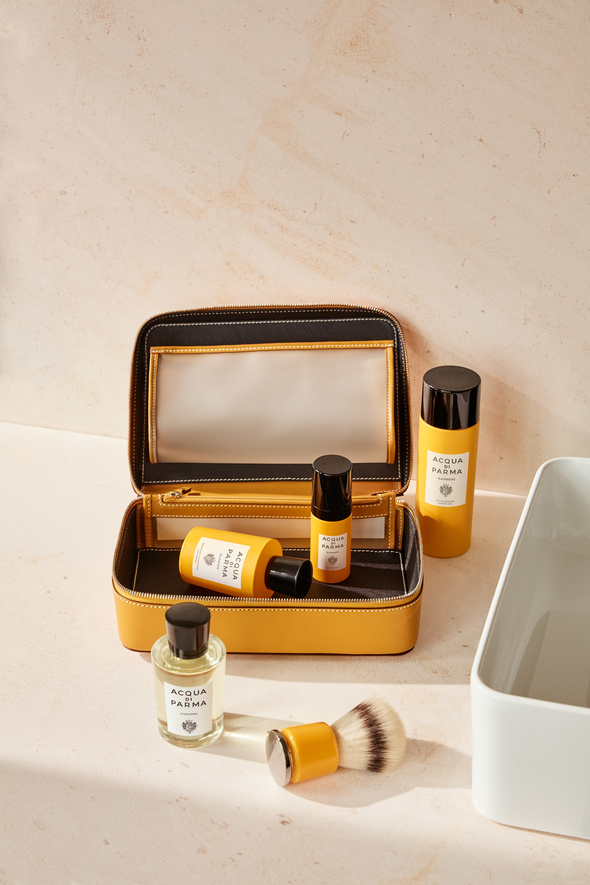 Deux variantes chromatiques : l’élégante version noire et celle lumineuse jaune Parme. La brosse est en matériau synthétique ultra doux ou en poils de blaireau. Le blaireau en poils synthétiques est également disponible dans sa variante sophistiquée de voyage.