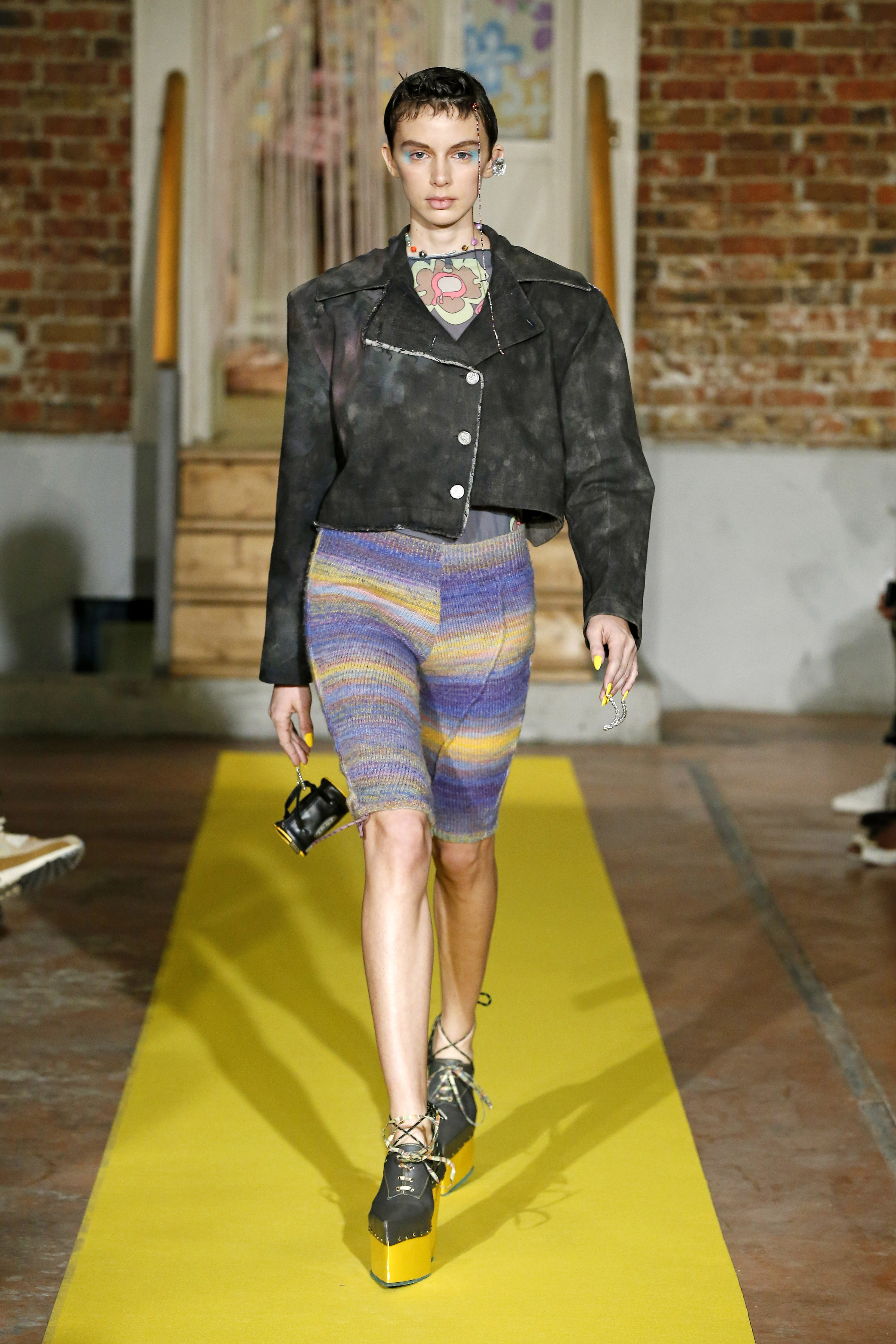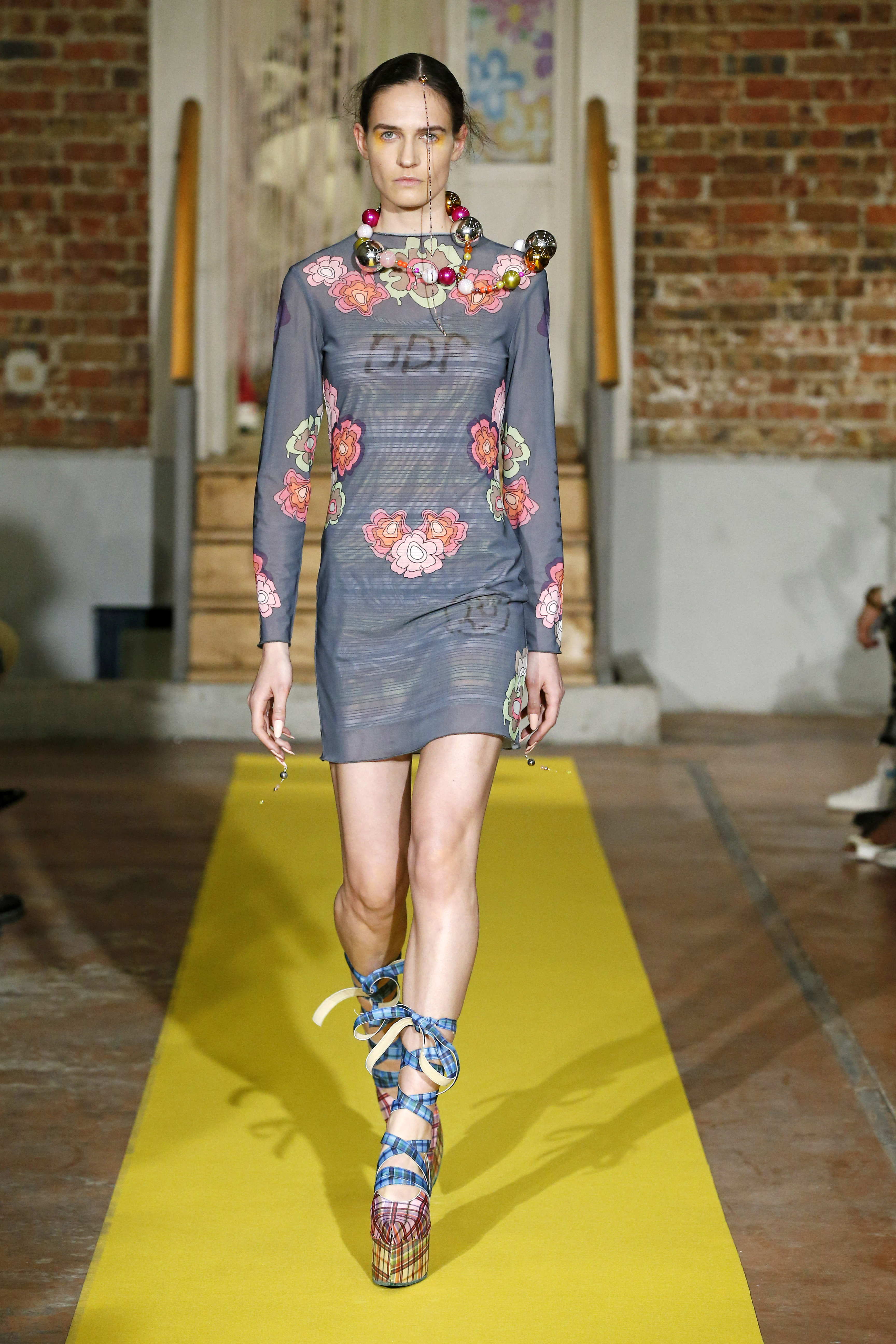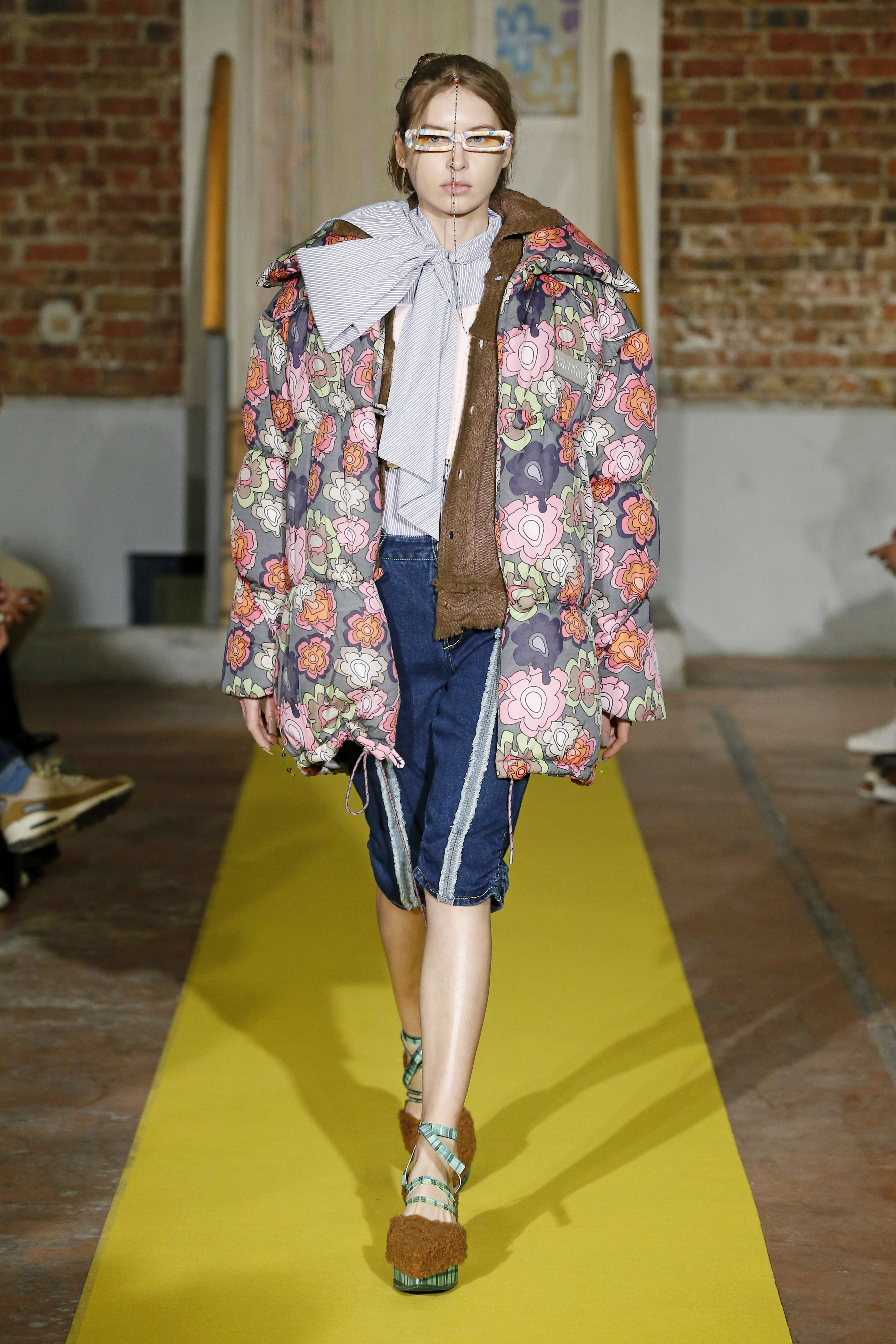 This season’s fabrics are used in an unconventional, almost perverted way. Fleece is treated to look moth-eaten, then employed to craft byzantine corsets and bizarre flowers. Padded nylon is the base of mini skirts while knitted jackets are spray painted. The cartoonesque shoes were done in collaboration with Naomi Hille, while Florence Tetier designed this seasons jewelry, a cosmic assembly of iridescent bubbles.